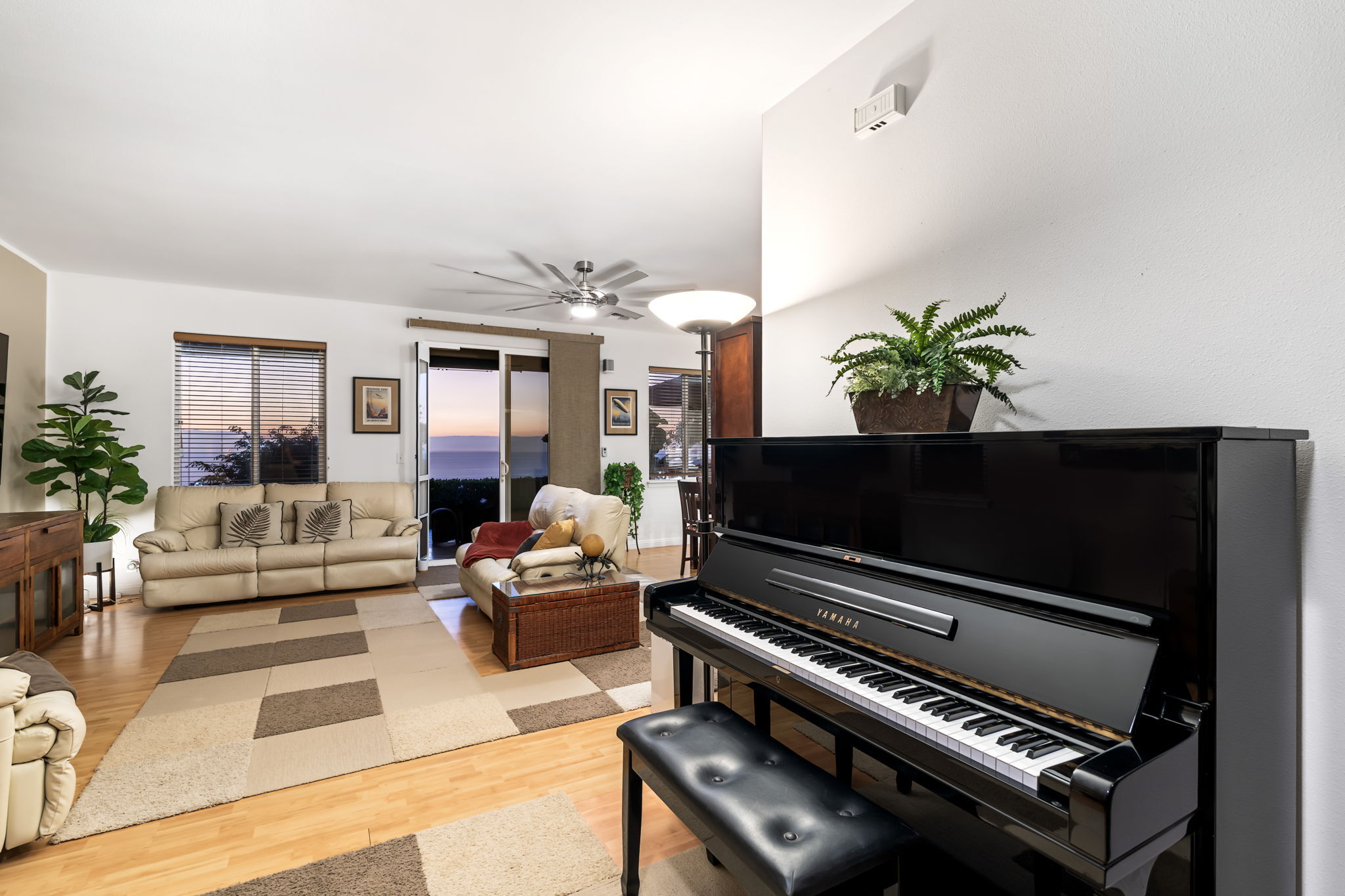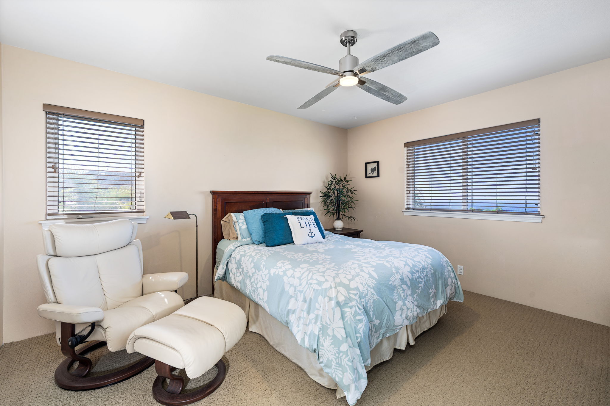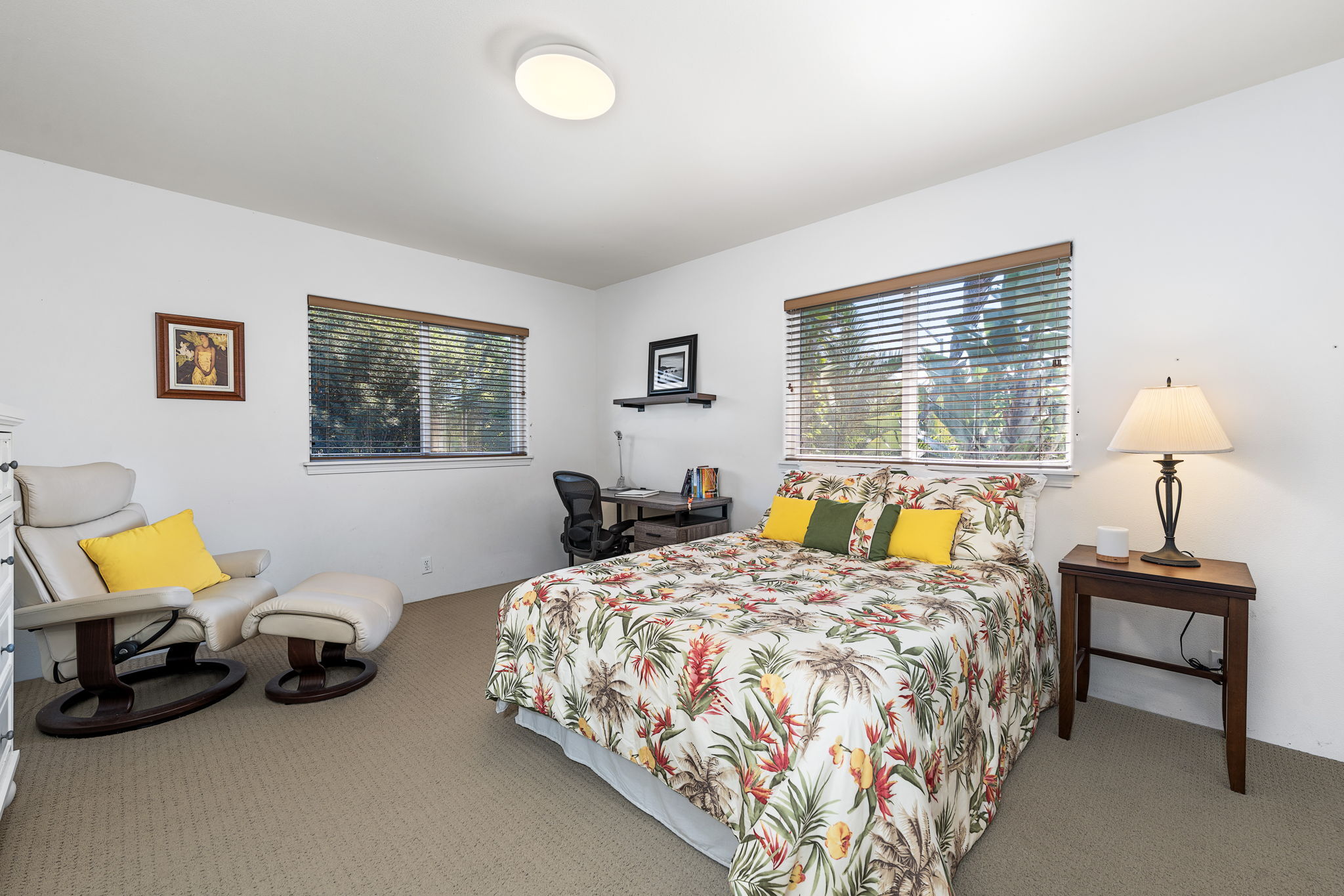 Upstairs you will enjoy four private sleeping quarters and 2 bathrooms. Two of the rooms have lovely island coastline and sunset views, while the other two rooms enjoy up-slope mountain vistas. The primary bedroom is ensuite, with a fully renovated bathroom, separate water closet, walk-in clothes closet and coastline ocean views. Two rooms are set up as guest rooms, one with ocean and the other mountain views, and the 4th is presently being used as a home office.