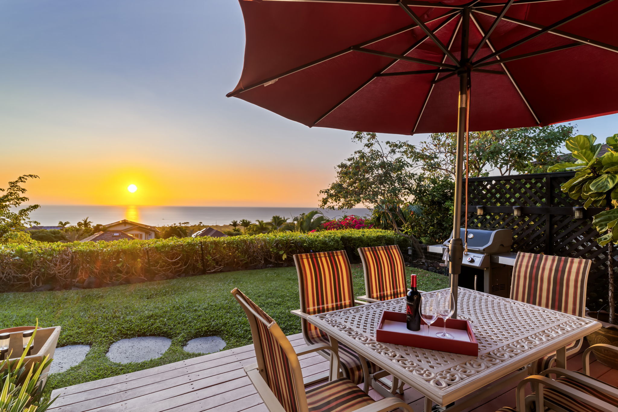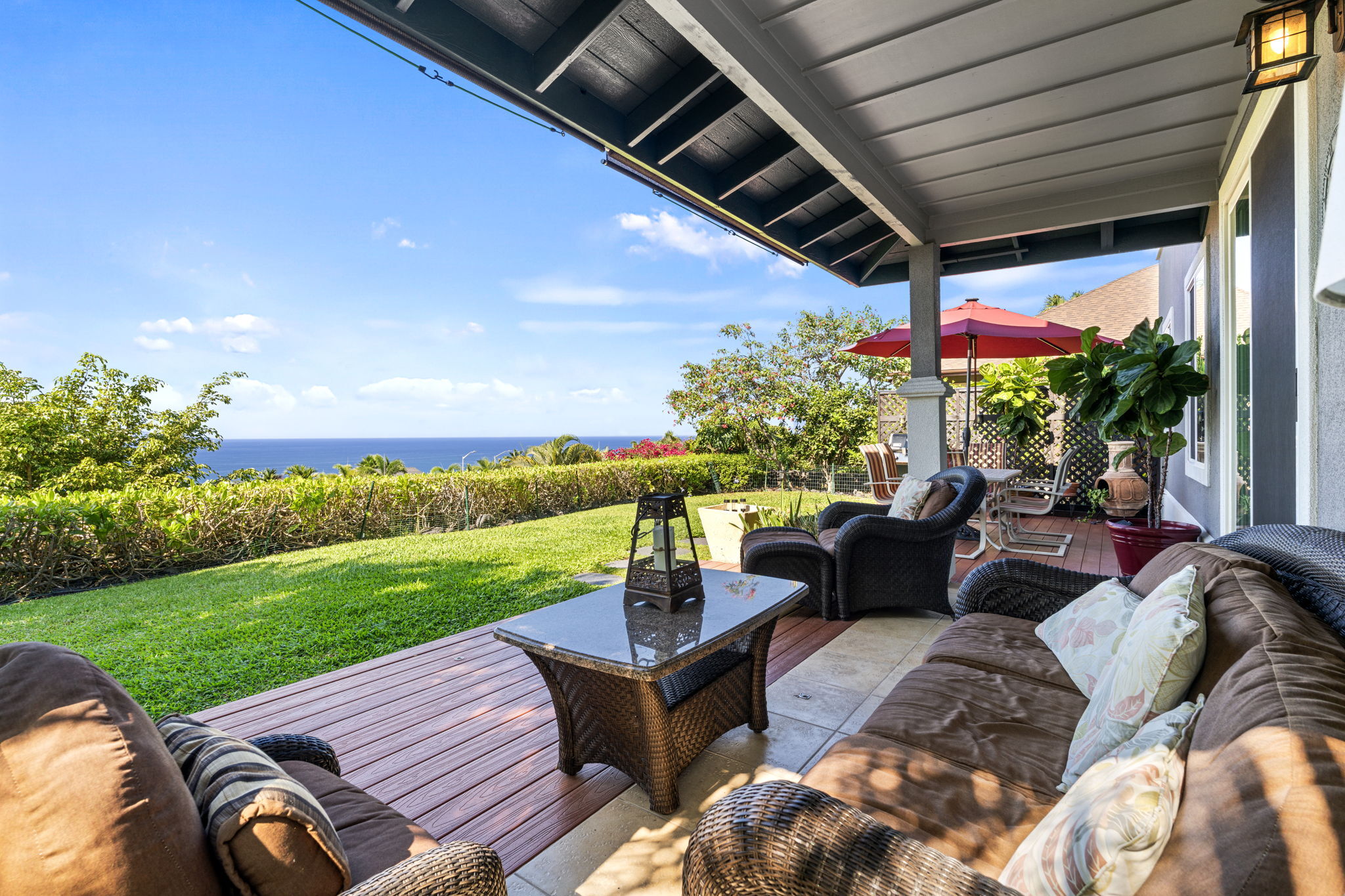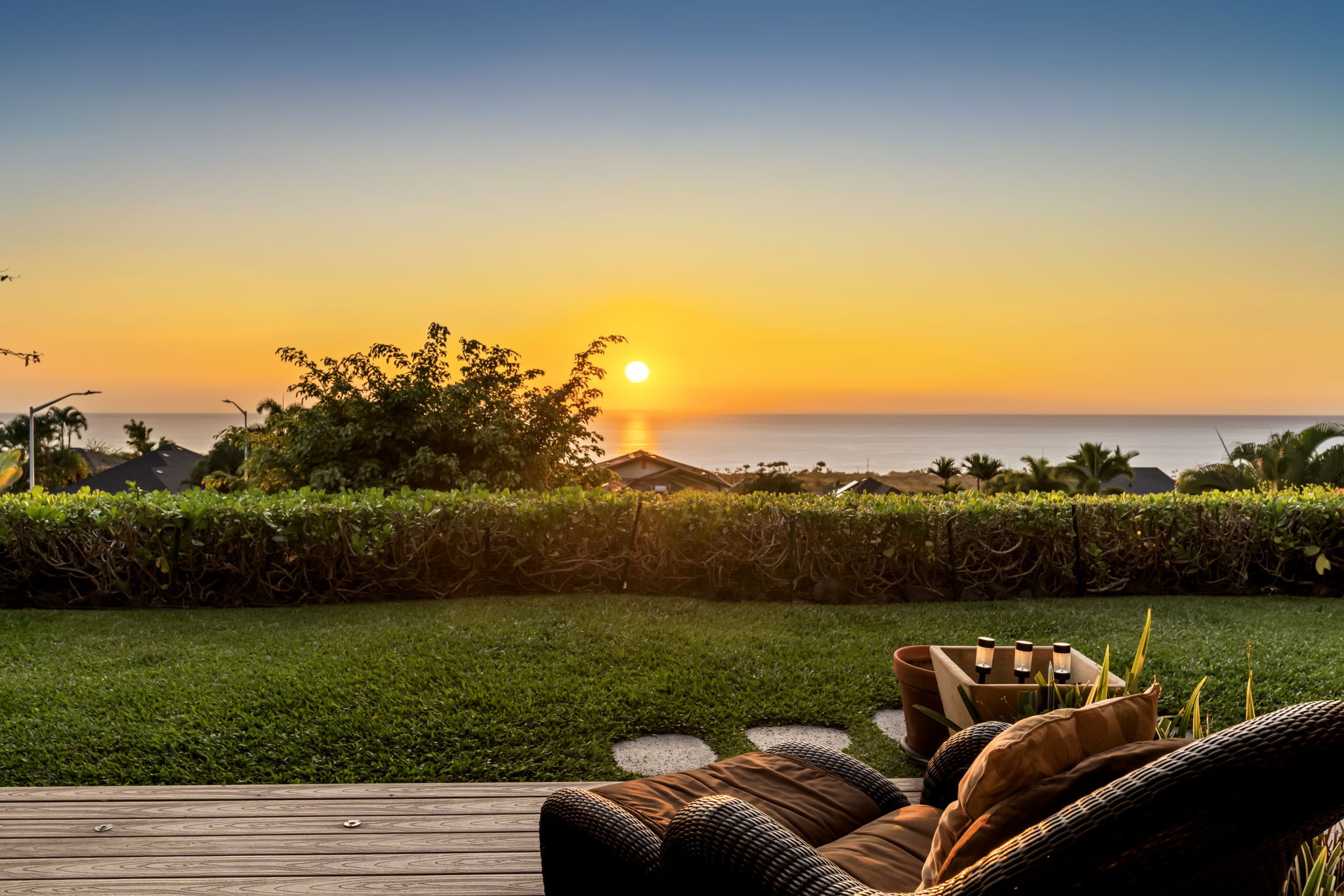 Home is where your heart is and this home will truly capture yours! This is the one of the best properties in Pualani Estates, on the upper quadrant of the subdivision, and one of only a chosen few Hibiscus models in the neighborhood! This home, positioned on the corner of a double cul-de-sac, was wrapped half in stucco and half with wood, giving it a very handsome exterior finish. Inside has a huge open living area that connects the kitchen and flows out to the covered and open lanais, which were extended by decking made of a durable man-made type of material, to resist the elements. Extensive rock walls were added to the west side of the property to create a larger more usable pet friendly back yard. And the panoramic ocean and sunset views from this property, perched high on the hill, are incredible!! Landscape lighting after dusk transforms the yard into enchanted gardens and sets the mood for peaceful evenings.