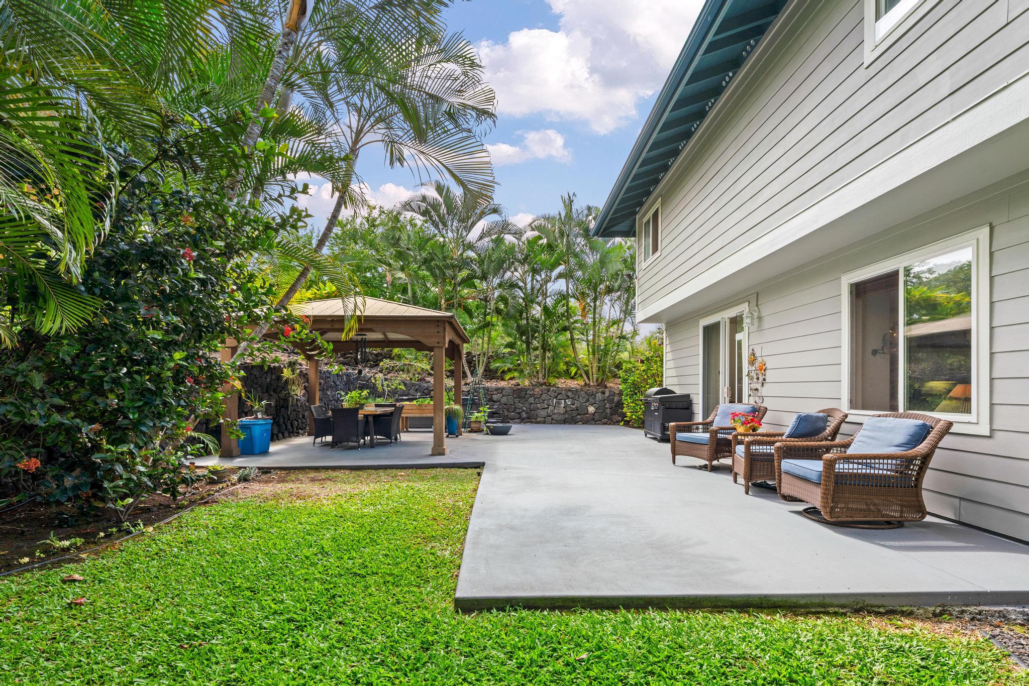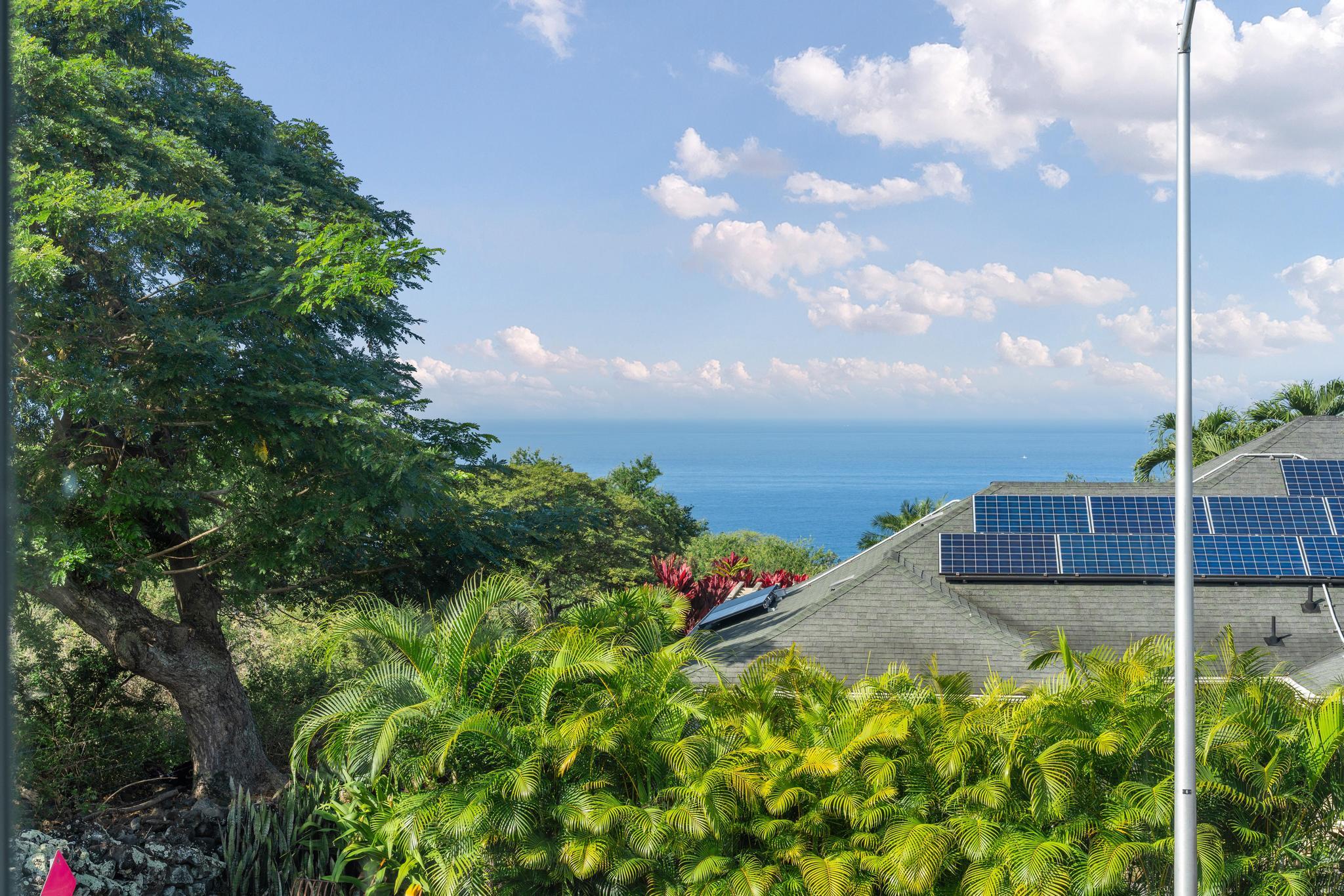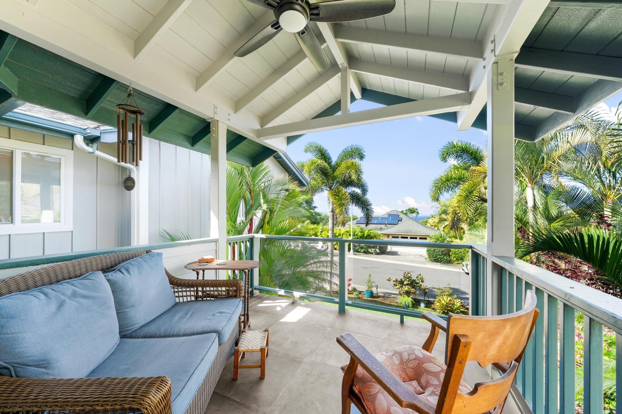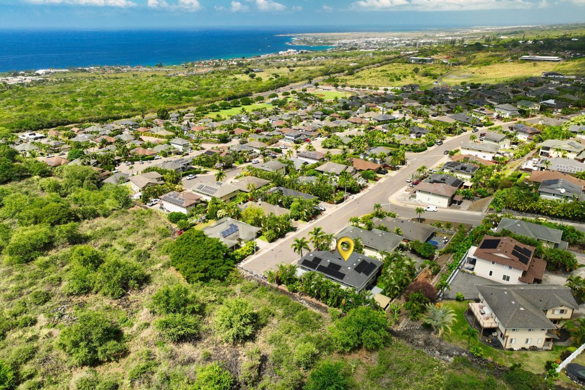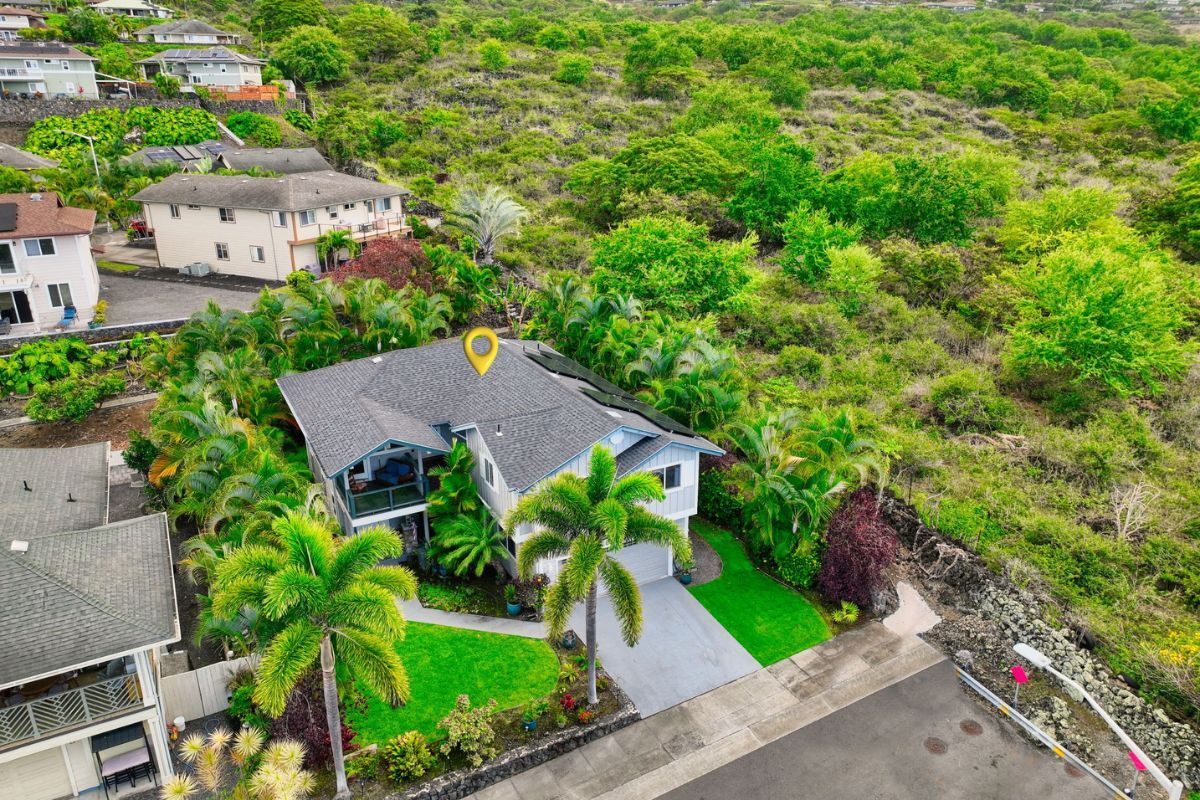 Tucked away at the end of street in the desirable Pualani Estates community, this spacious two-story home enjoys a peaceful setting beside a large vacant lot, creating a sense of privacy and a tranquil, tropical atmosphere. Situated on an 8,785-square-foot lot, the property offers 2,652 square feet of living space and is one of the largest floor plans in the neighborhood–an uncommon opportunity within Pualani Estates. The home welcomes abundant natural light and features a thoughtfully designed layout with generous living spaces. The main level includes a large living room, a bright and beautifully appointed kitchen, a half bath, and a laundry room, along with access to the two-car garage. The kitchen offers ample cabinetry and a large island. Adjacent to the kitchen is a spacious dining area that easily accommodates an oversized dining table–perfect for gatherings with family and friends. Upstairs, there are three bedrooms, each with its own bathroom, two of them are expansive suites. Luxury Vinyl Plank flooring extends throughout the stairs and entire upper level, adding durability and contemporary style. The main primary suite features a newly remodeled large bathroom with a walk-in shower and opens onto a newly built covered lanai, creating a private retreat to enjoy morning coffee or evening breezes. The west-facing bedroom captures an ocean view, another special touch to the home. Outdoor living continues in the spacious backyard, with a pergola and a shaded space for entertaining and relaxing amid a peaceful, tropical setting. Additional features include recent exterior paint, split central air conditioning, and a leased energy-efficient solar system with 26 panels, two LG backup batteries, and net metering. Combining generous square footage, rare floor plan, and modern upgrades, this bright and inviting home offers exceptional comfort and value in one of Kona’s most popular residential neighborhoods .