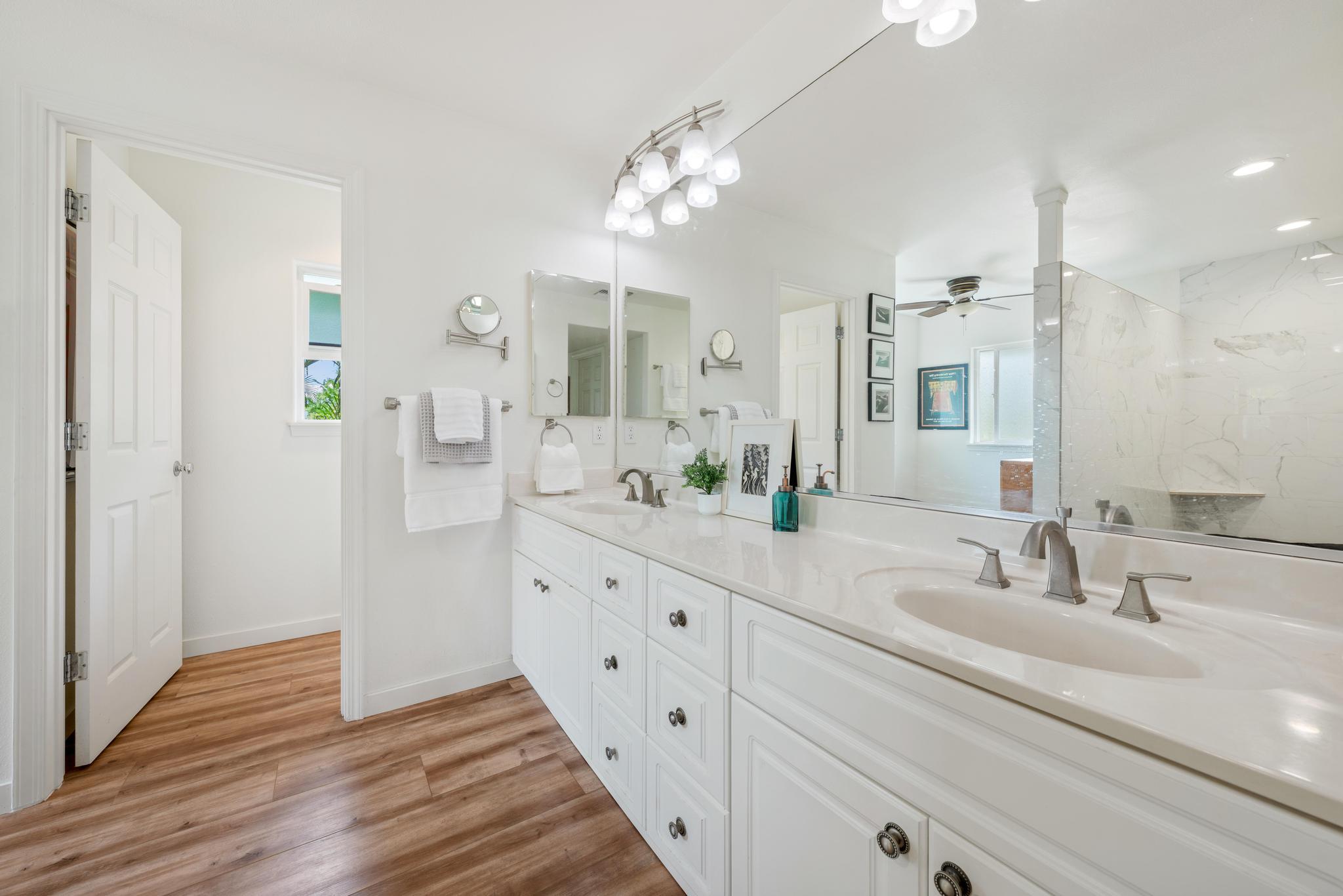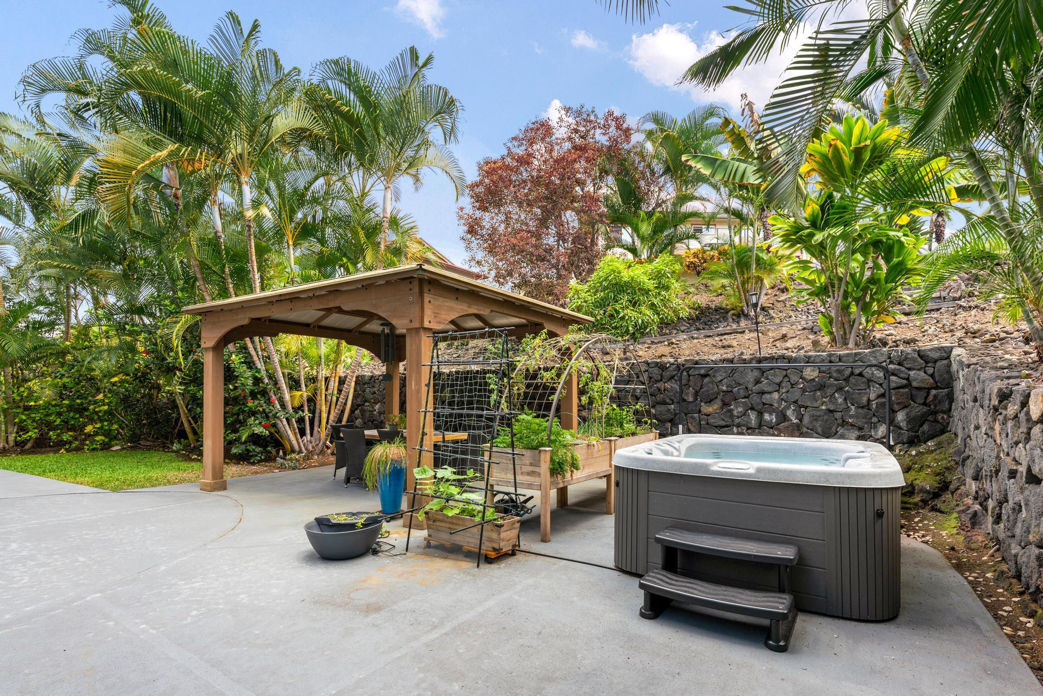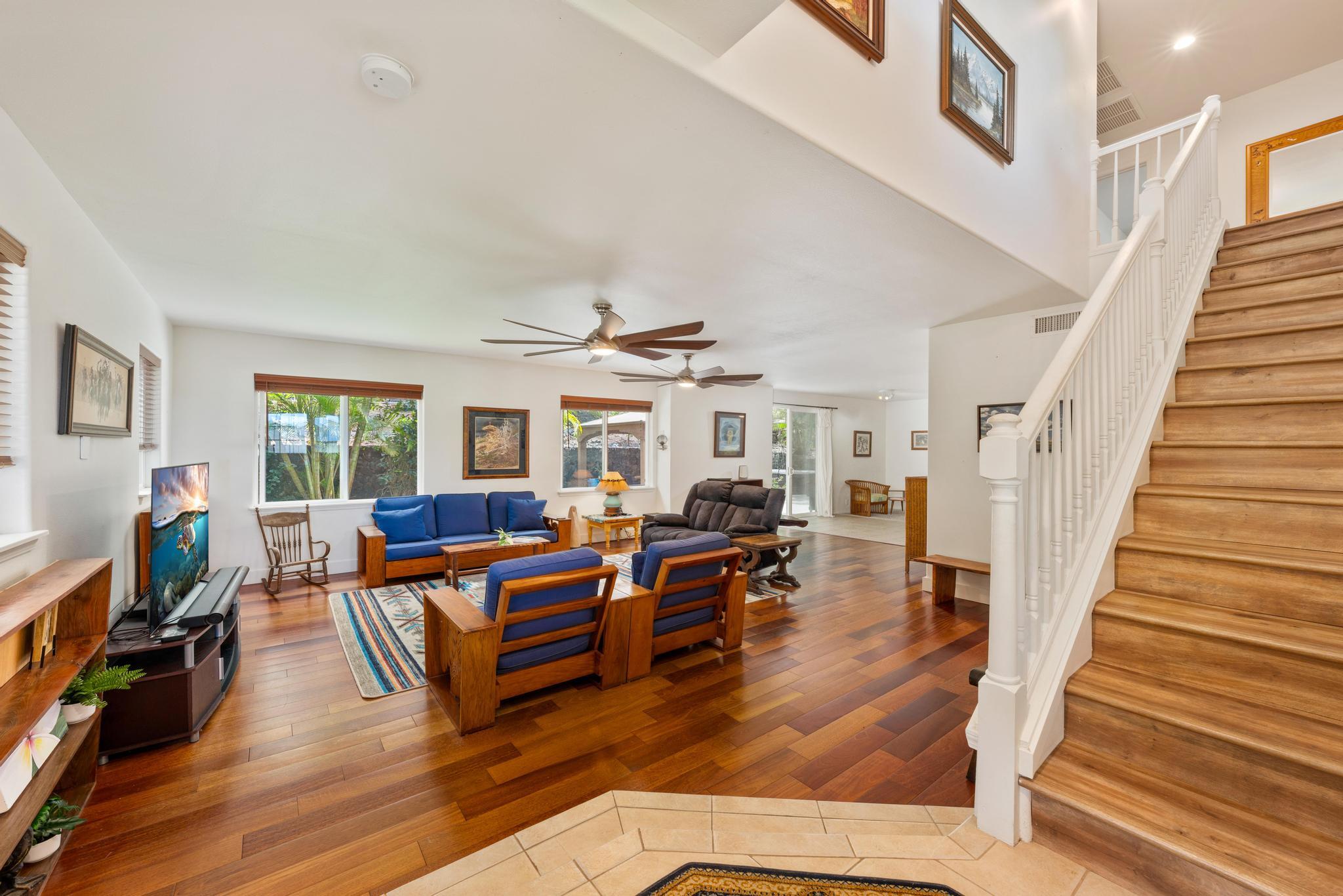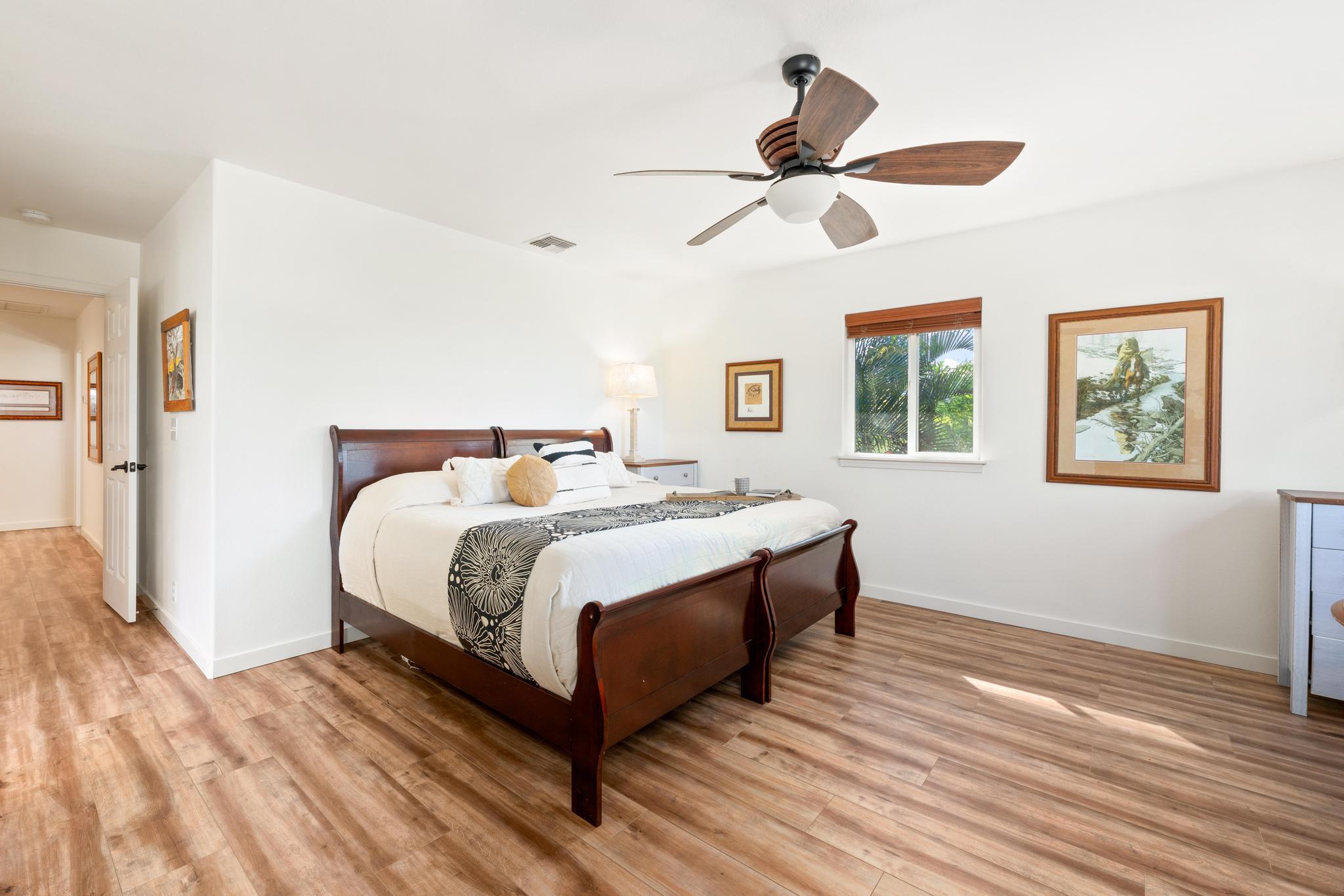 Tucked away at the end of street in the desirable Pualani Estates community, this spacious two-story home enjoys a peaceful setting beside a large vacant lot, creating a sense of privacy and a tranquil, tropical atmosphere. Situated on an 8,785-square-foot lot, the property offers 2,652 square feet of living space and is one of the largest floor plans in the neighborhood–an uncommon opportunity within Pualani Estates. The home welcomes abundant natural light and features a thoughtfully designed layout with generous living spaces. The main level includes a large living room, a bright and beautifully appointed kitchen, a half bath, and a laundry room, along with access to the two-car garage. The kitchen offers ample cabinetry and a large island. Adjacent to the kitchen is a spacious dining area that easily accommodates an oversized dining table–perfect for gatherings with family and friends. Upstairs, there are three bedrooms, each with its own bathroom, two of them are expansive suites. Luxury Vinyl Plank flooring extends throughout the stairs and entire upper level, adding durability and contemporary style. The main primary suite features a newly remodeled large bathroom with a walk-in shower and opens onto a newly built covered lanai, creating a private retreat to enjoy morning coffee or evening breezes. The west-facing bedroom captures an ocean view, another special touch to the home. Outdoor living continues in the spacious backyard, with a pergola and a shaded space for entertaining and relaxing amid a peaceful, tropical setting. Additional features include recent exterior paint, split central air conditioning, and a leased energy-efficient solar system with 26 panels, two LG backup batteries, and net metering. Combining generous square footage, rare floor plan, and modern upgrades, this bright and inviting home offers exceptional comfort and value in one of Kona’s most popular residential neighborhoods .