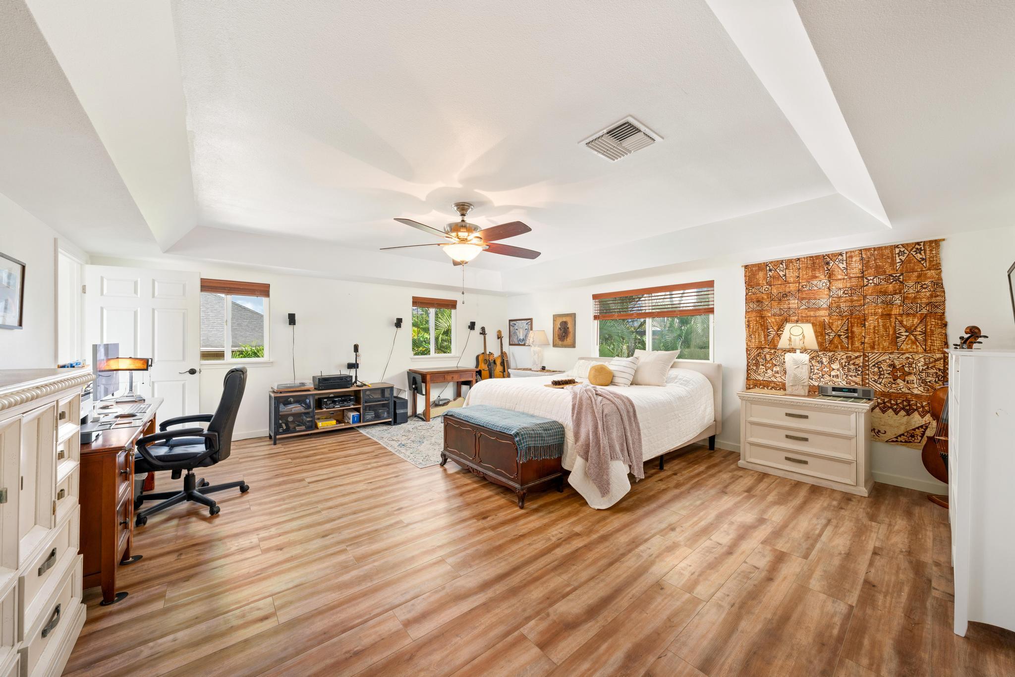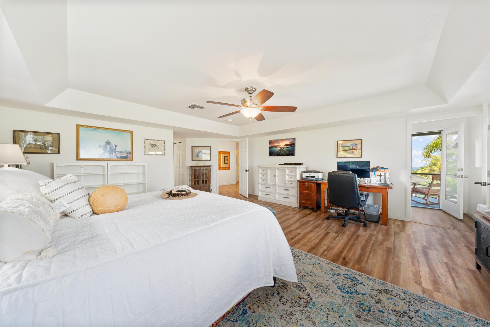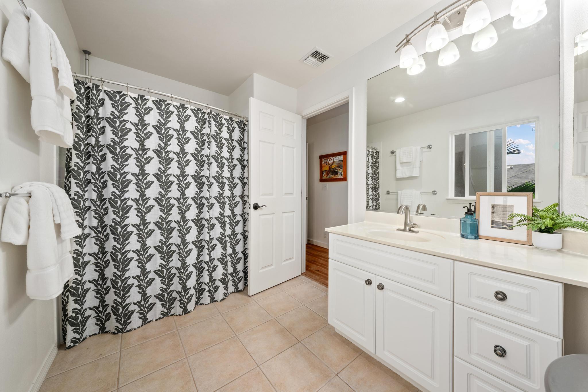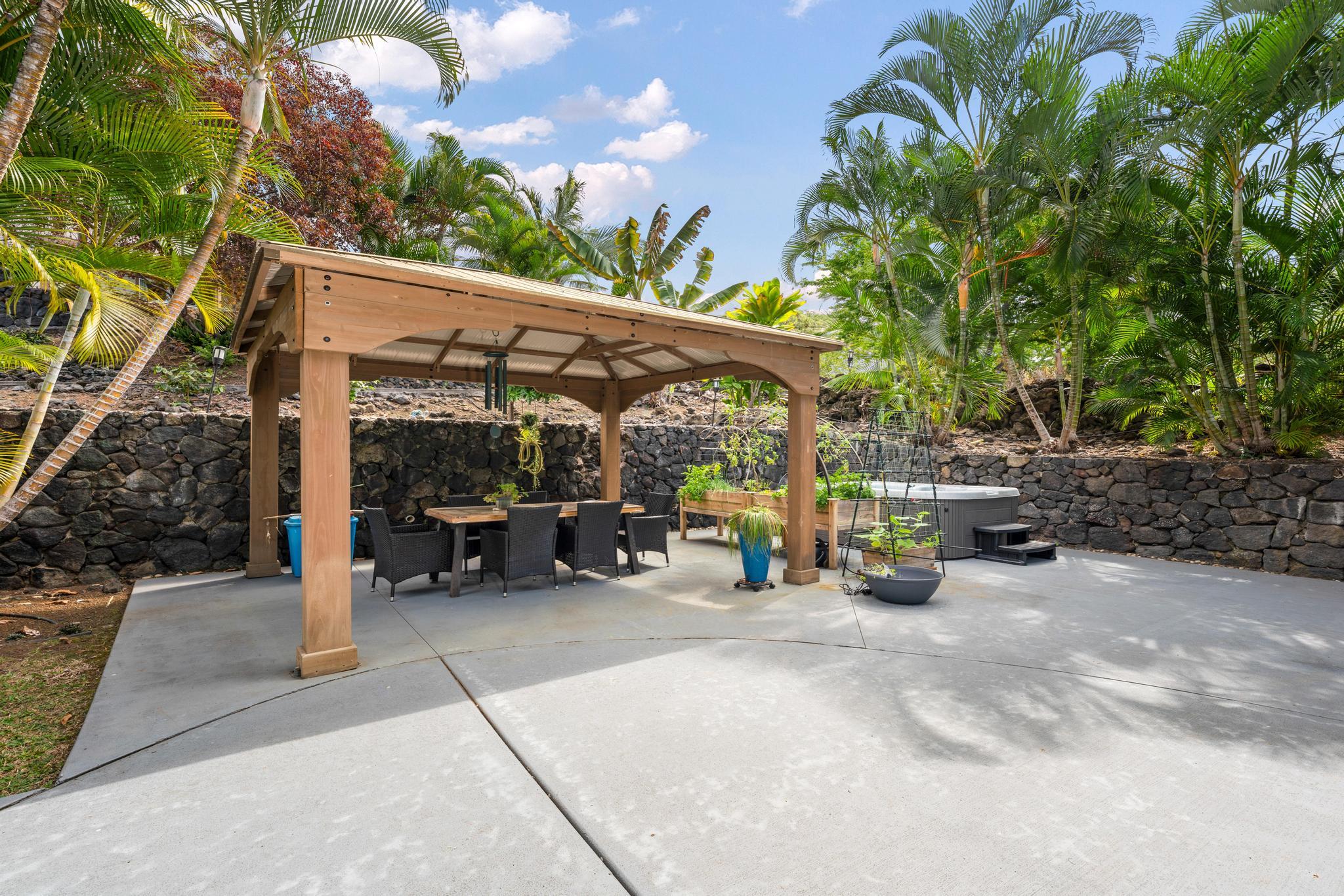 Tucked away at the end of street in the desirable Pualani Estates community, this spacious two-story home enjoys a peaceful setting beside a large vacant lot, creating a sense of privacy and a tranquil, tropical atmosphere. Situated on an 8,785-square-foot lot, the property offers 2,652 square feet of living space and is one of the largest floor plans in the neighborhood–an uncommon opportunity within Pualani Estates. The home welcomes abundant natural light and features a thoughtfully designed layout with generous living spaces. The main level includes a large living room, a bright and beautifully appointed kitchen, a half bath, and a laundry room, along with access to the two-car garage. The kitchen offers ample cabinetry and a large island. Adjacent to the kitchen is a spacious dining area that easily accommodates an oversized dining table–perfect for gatherings with family and friends. Upstairs, there are three bedrooms, each with its own bathroom, two of them are expansive suites. Luxury Vinyl Plank flooring extends throughout the stairs and entire upper level, adding durability and contemporary style. The main primary suite features a newly remodeled large bathroom with a walk-in shower and opens onto a newly built covered lanai, creating a private retreat to enjoy morning coffee or evening breezes. The west-facing bedroom captures an ocean view, another special touch to the home. Outdoor living continues in the spacious backyard, with a pergola and a shaded space for entertaining and relaxing amid a peaceful, tropical setting. Additional features include recent exterior paint, split central air conditioning, and a leased energy-efficient solar system with 26 panels, two LG backup batteries, and net metering. Combining generous square footage, rare floor plan, and modern upgrades, this bright and inviting home offers exceptional comfort and value in one of Kona’s most popular residential neighborhoods .