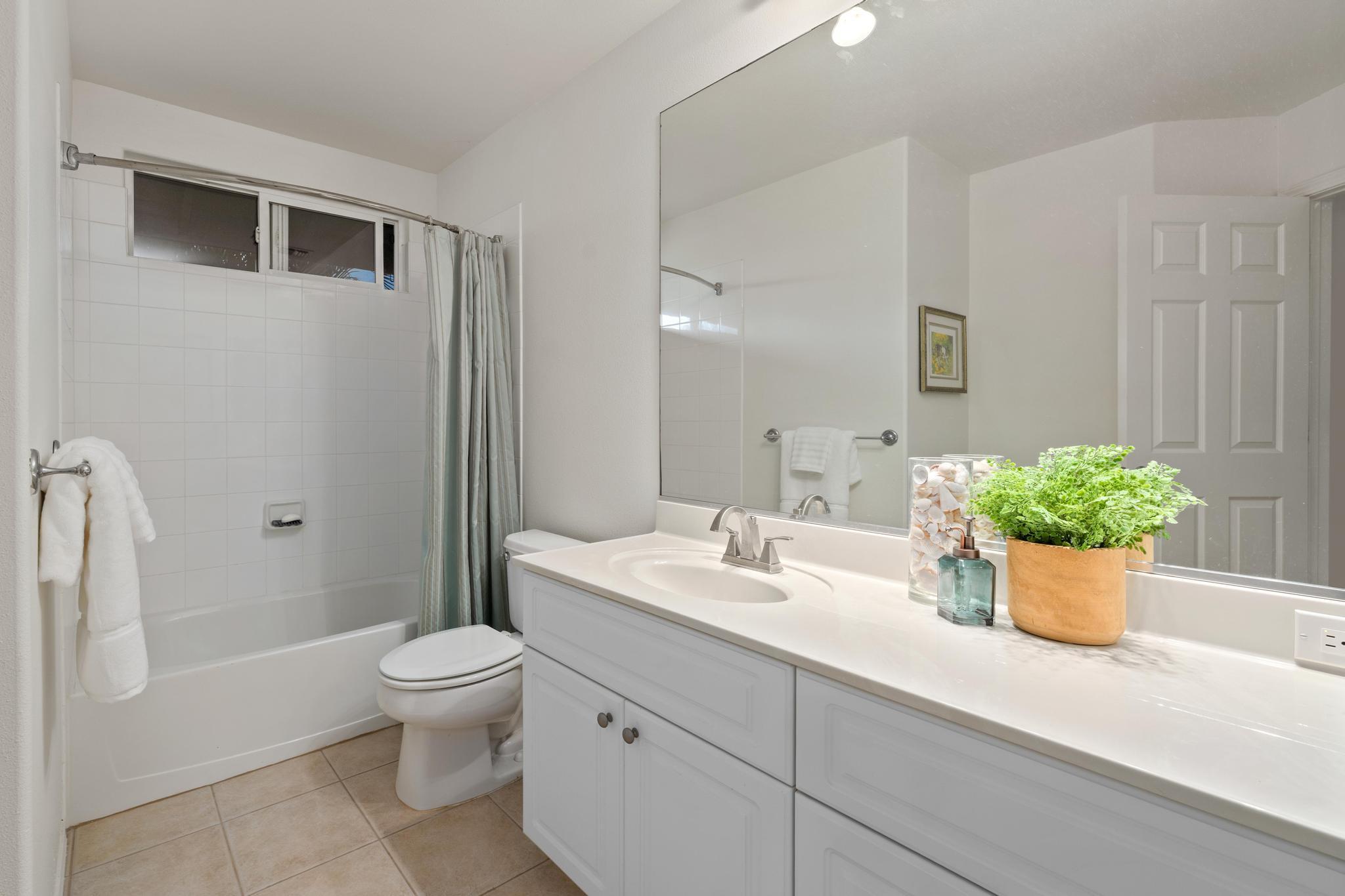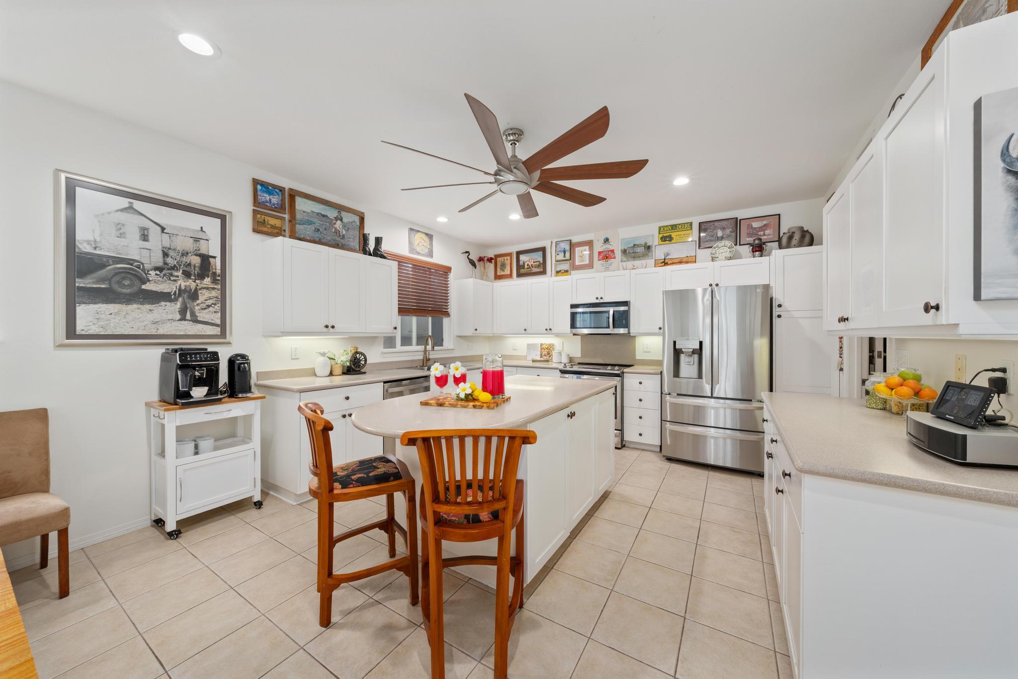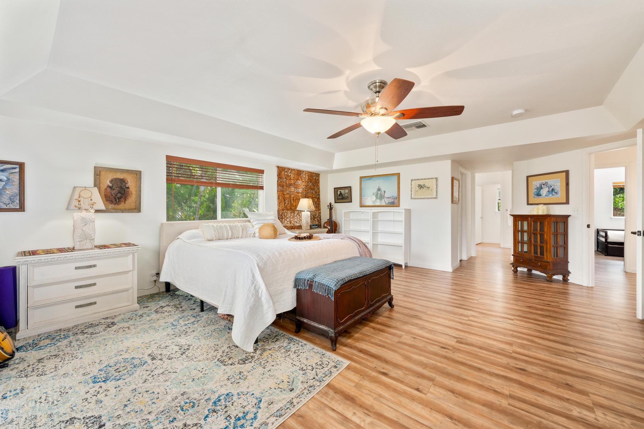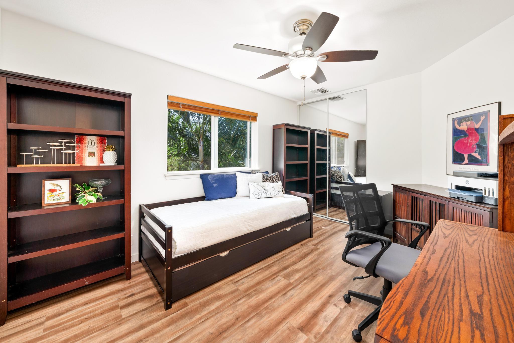 Tucked away at the end of street in the desirable Pualani Estates community, this spacious two-story home enjoys a peaceful setting beside a large vacant lot, creating a sense of privacy and a tranquil, tropical atmosphere. Situated on an 8,785-square-foot lot, the property offers 2,652 square feet of living space and is one of the largest floor plans in the neighborhood–an uncommon opportunity within Pualani Estates. The home welcomes abundant natural light and features a thoughtfully designed layout with generous living spaces. The main level includes a large living room, a bright and beautifully appointed kitchen, a half bath, and a laundry room, along with access to the two-car garage. The kitchen offers ample cabinetry and a large island. Adjacent to the kitchen is a spacious dining area that easily accommodates an oversized dining table–perfect for gatherings with family and friends. Upstairs, there are three bedrooms, each with its own bathroom, two of them are expansive suites. Luxury Vinyl Plank flooring extends throughout the stairs and entire upper level, adding durability and contemporary style. The main primary suite features a newly remodeled large bathroom with a walk-in shower and opens onto a newly built covered lanai, creating a private retreat to enjoy morning coffee or evening breezes. The west-facing bedroom captures an ocean view, another special touch to the home. Outdoor living continues in the spacious backyard, with a pergola and a shaded space for entertaining and relaxing amid a peaceful, tropical setting. Additional features include recent exterior paint, split central air conditioning, and a leased energy-efficient solar system with 26 panels, two LG backup batteries, and net metering. Combining generous square footage, rare floor plan, and modern upgrades, this bright and inviting home offers exceptional comfort and value in one of Kona’s most popular residential neighborhoods .
