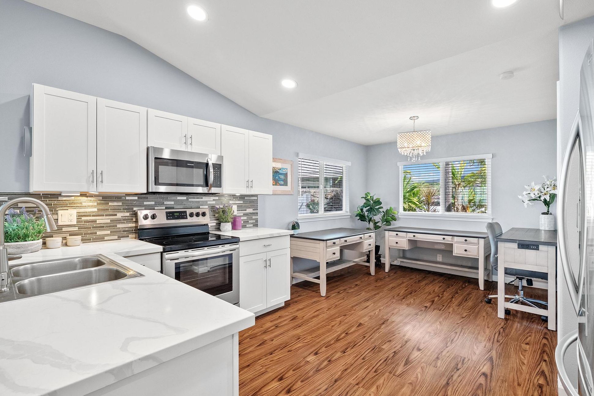 * Kitchen with Quartz Counters, Tile Backsplash, Stainless Appliances, and Windowed Dining Area.