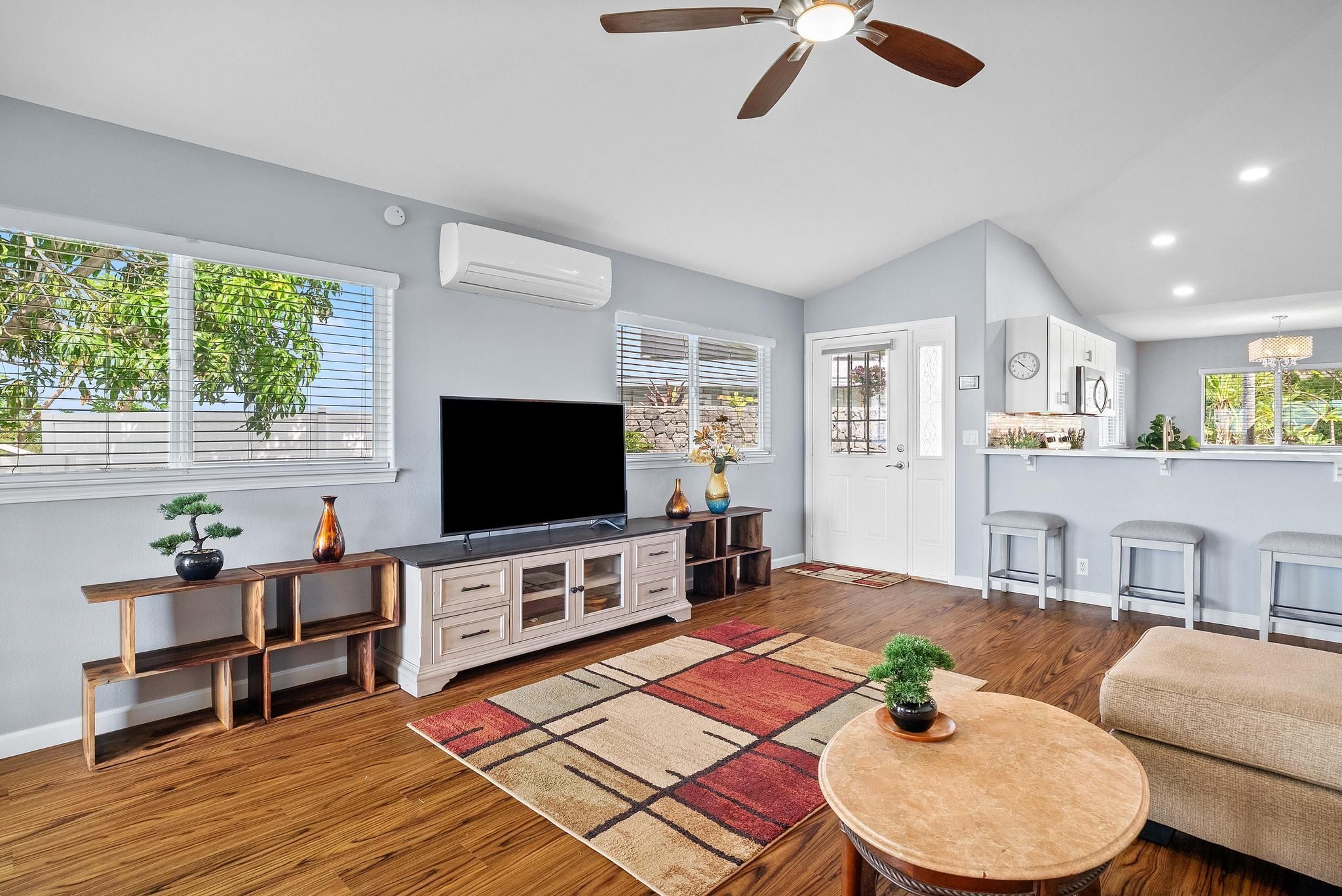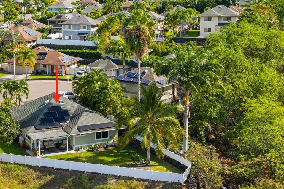 Modern Single-level home in Pualani Estates. Perched on a hillside roughly 2.5 miles south of Kailua-Kona. Panoramic Views of Kailua Bay from Cul-de-sac location. Recently Remodeled with Zone Air-conditioning, Owned Photo-voltaic System, and Large Fully-fenced Yard. Ocean Breezes cool it’s approximate 400-ft. elevation.