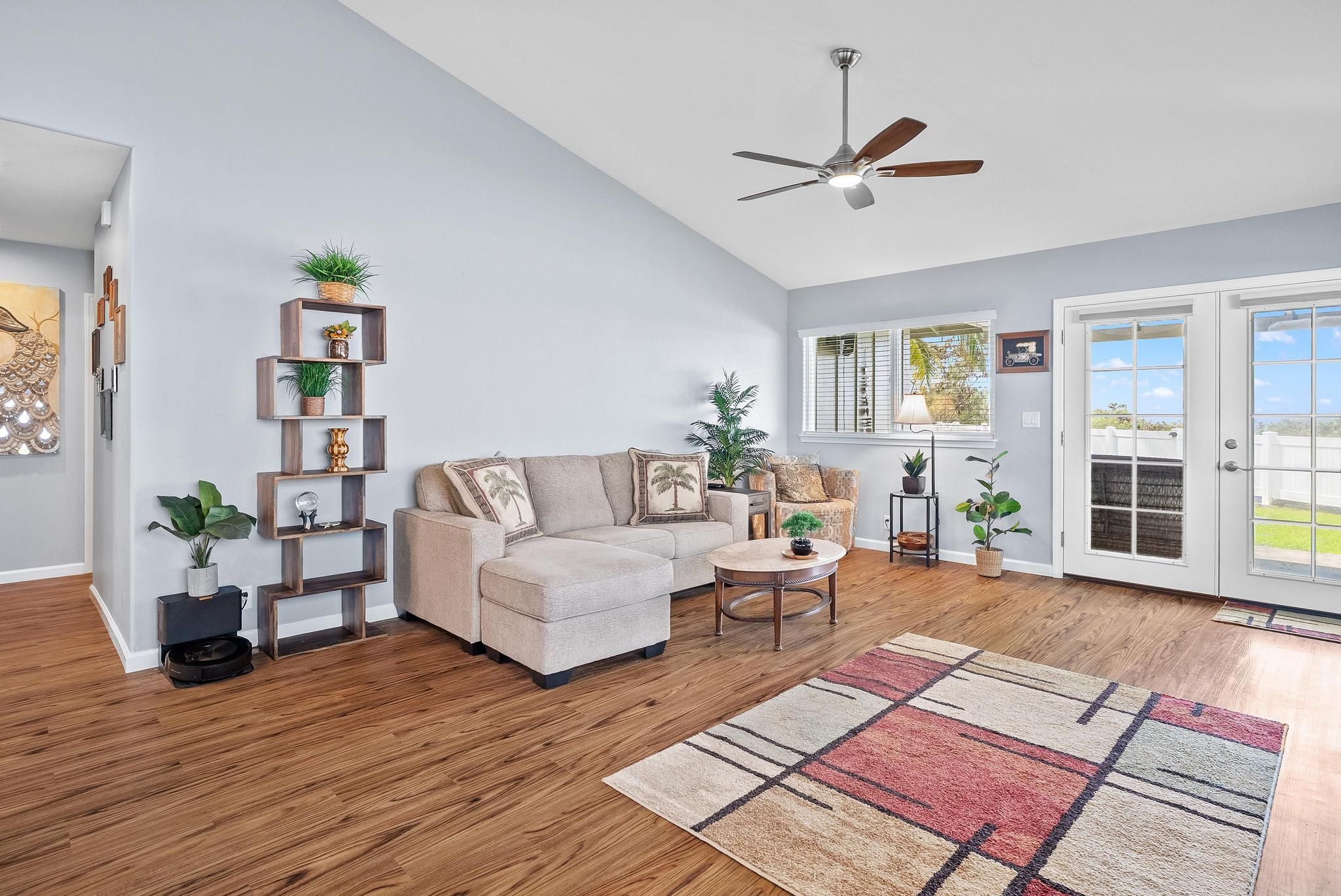 * French doors lead from the interior to a Covered Backyard Lanai with Panoramic Ocean View.