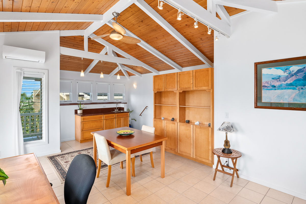 Also included on the property is a self-contained studio with its own bath and separate entrance located above the 2-car garage. This elevated studio is ideal for guests, extended family or dedicated workspace. A private lanai off the studio provides a peek-a-boo view of the ocean and horizon.