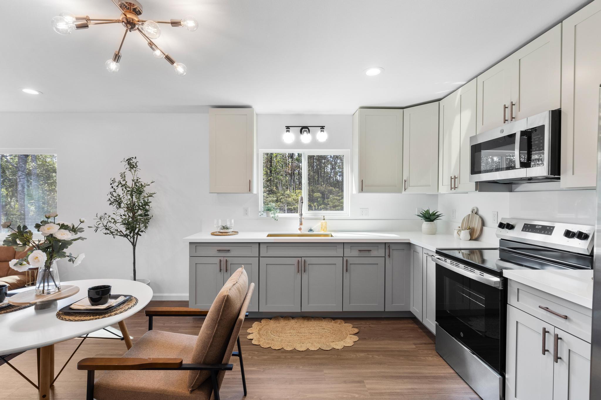 Price for this market! Two story eye catcher is where smart design meets big value! This brand new 3 bed, 2 bath home offers the perfect blend of affordability, thoughtful design, and modern functionality, all for an unbeatable price. Built Up, Not Out! Designed with purpose, this two story home maximizes space on a compact 12,000 sqft lot, offering privacy and efficiency without sacrificing comfort. All three bedrooms are tucked upstairs, creating separation from the main living area and optimizing your lifestyle flow. While there’s no traditional “primary suite,” the upstairs layout offers comfortable sleeping quarters for family or guests, with two full bathrooms for convenience making it ideal for potential first time home buyer or investors looking to build equity. Yes, the carport is small and cozy, but it's practical for a small vehicle and functional with potential to enclose or expand later. Want to get creative? There's room under the stairway for additional storage or to convert into more usable space. With over 1,200 sqft. of interior space, this home is the perfect low-maintenance base for enjoying the Big Island lifestyle. Ainaloa is fast growing with quick access to shopping, dining, and schools; this property is the best value in its price point offering new construction. The kitchen showcases charming hinted gray cabinets, complemented by durable quartz countertops, blending modern appeal with island charm. The living and dining area offers a suitable and flexible layout for everyday living, while the second-floor design allows for natural light and airflow throughout the home. With a master plan to pave all streets is the subdivision, Azure Drive is coming up soon.