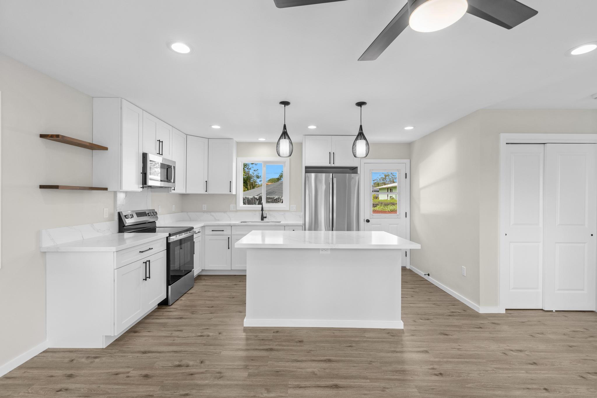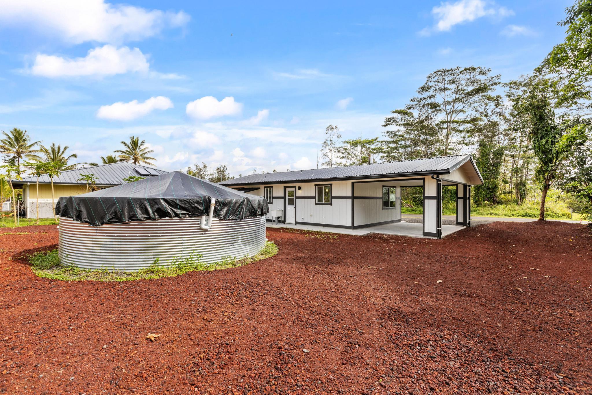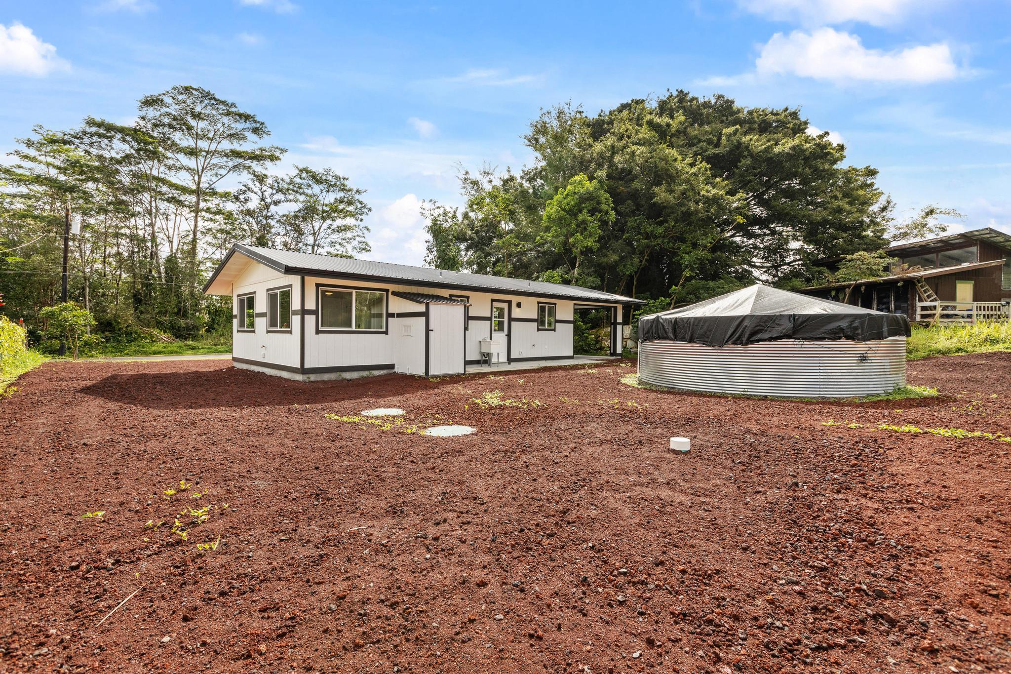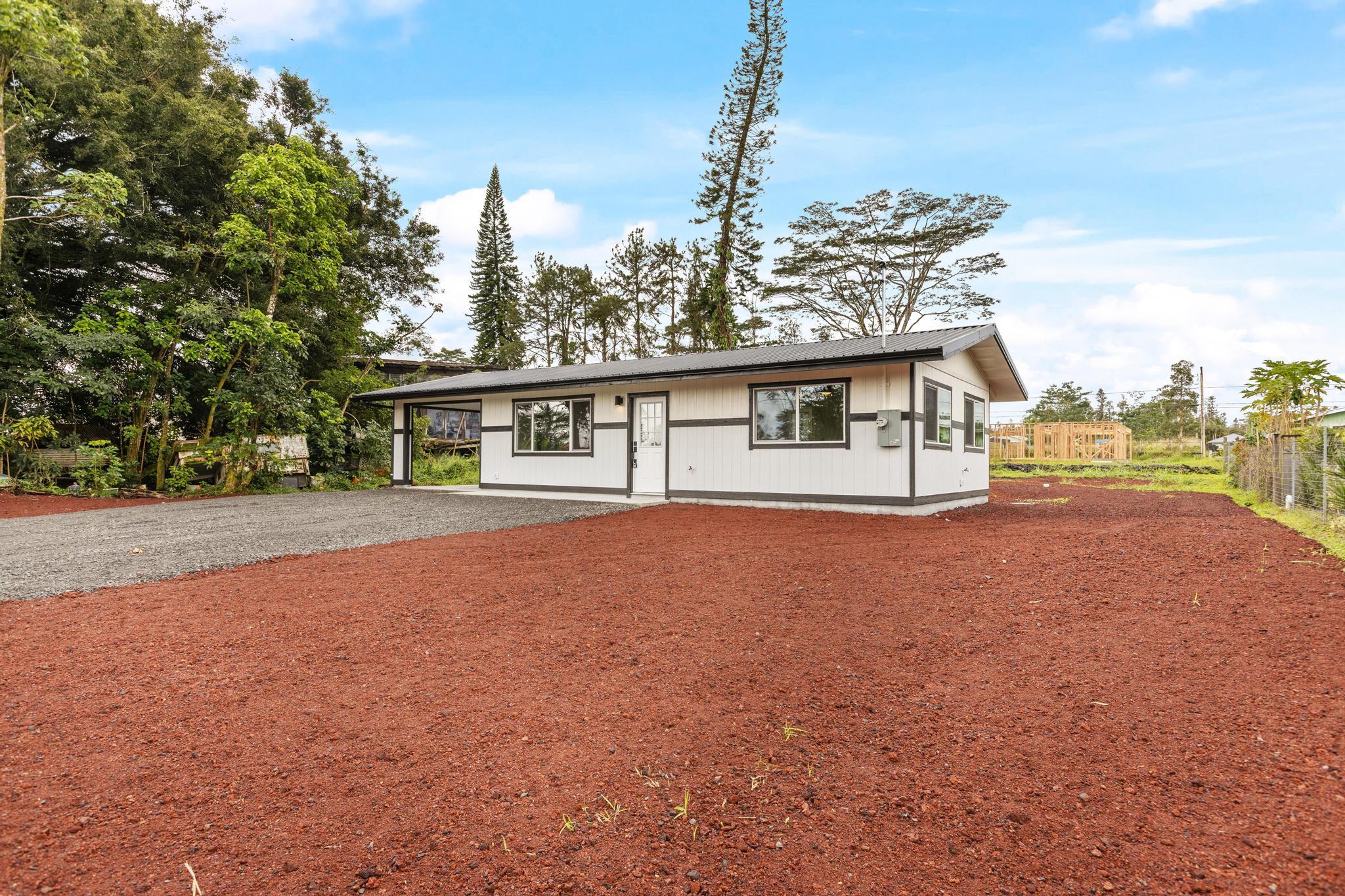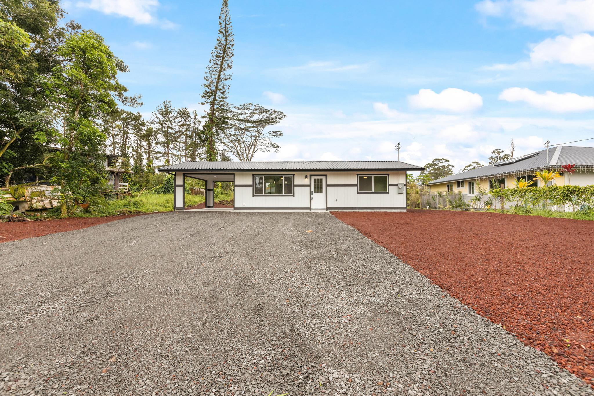 Brand-new construction in Ainaloa on paved Gardenia Dr. This thoughtfully designed 2-bedroom, 1-bath home offers 700 sq ft of bright, modern living space with a clean open-concept layout and quality finishes throughout. The interior features luxury vinyl plank flooring, recessed lighting, modern pendant fixtures, and ceiling fans that give the home a crisp, airy feel. The kitchen is both stylish and functional with a center island, white shaker-style cabinetry, solid-surface countertops, stainless steel appliances, floating wood shelves, and a window above the sink that brings in natural light. The living area flows comfortably off the kitchen, creating an efficient space for everyday living. Both bedrooms are filled with light, and includes mirrored closet doors for an added sense of space. The bathroom features a functional vanity, modern lighting, and a tub/shower combo with tile throughout. Outside, the home offers strong curb appeal with a fresh cinder ground cover, a gravel driveway, and a covered 1-car carport that also works well as a shaded entry or outdoor sitting area. The lot provides a clean slate for future landscaping, gardening, or additional outdoor improvements. This is a great opportunity to own a newly built home in Ainaloa with attractive finishes, a functional layout, and convenient access to Pahoa, shopping, dining, and everyday amenities. Information herein deemed reliable but not guaranteed. Buyer and Buyers Agent to do their own due diligence of all pertinent facts.