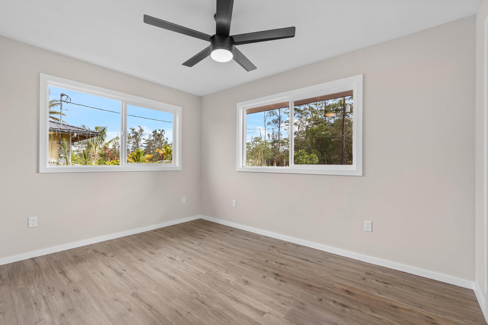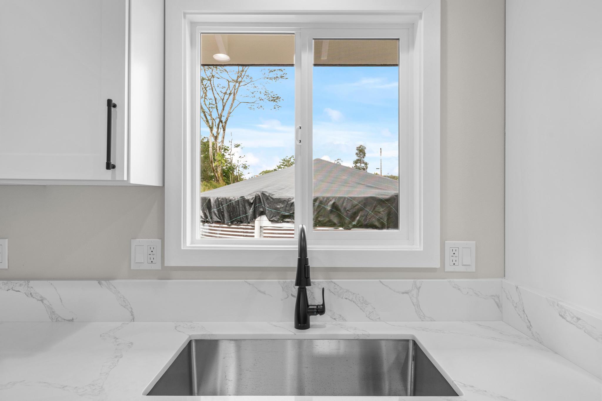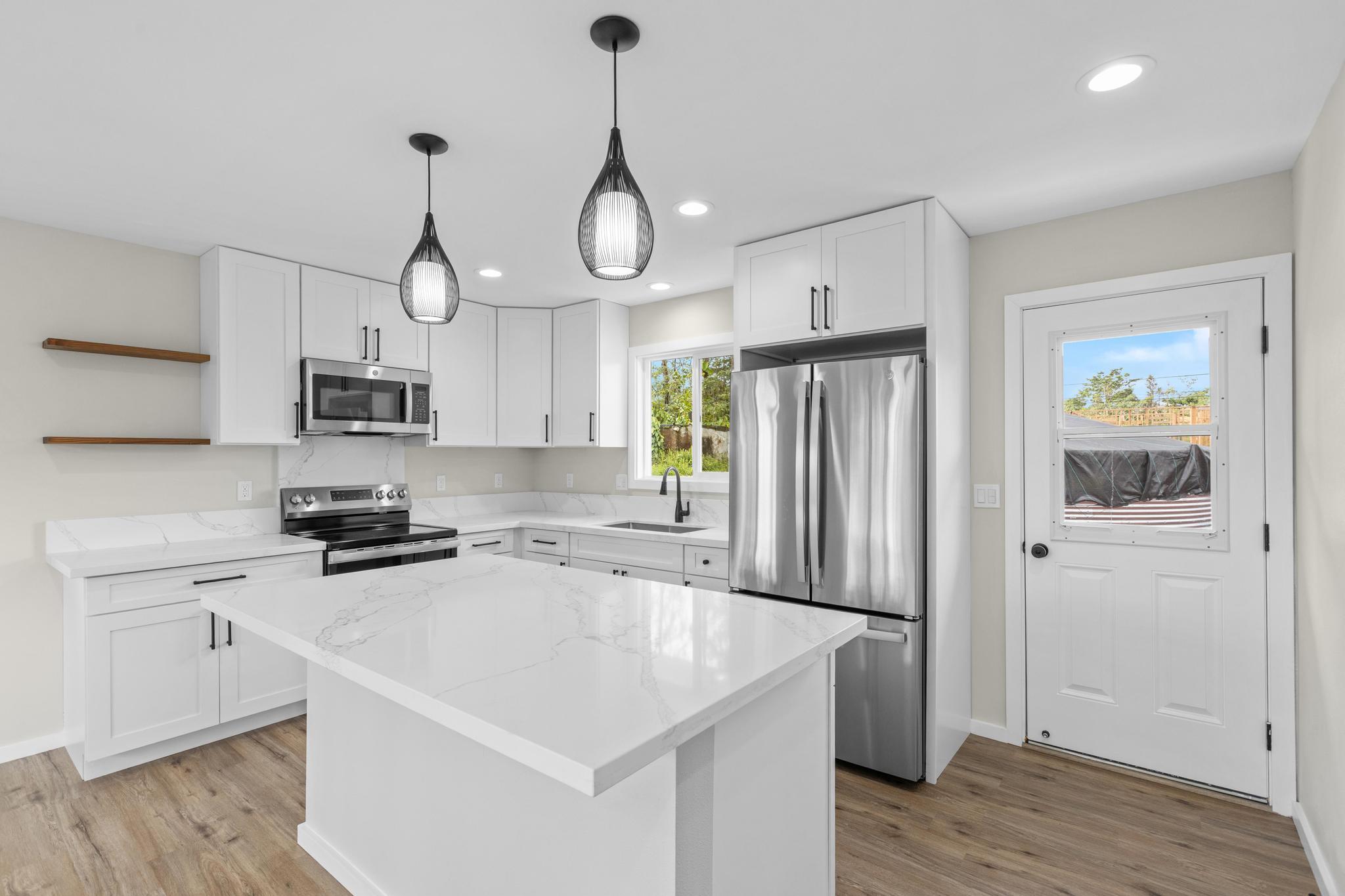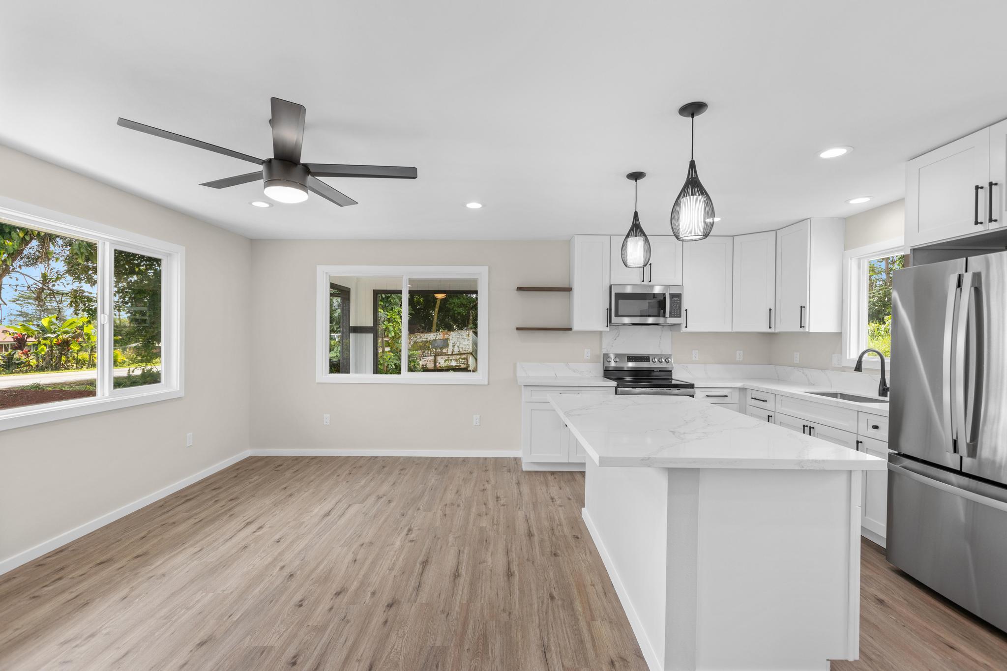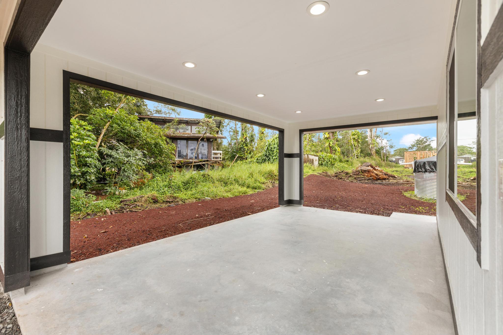 Brand-new construction in Ainaloa on paved Gardenia Dr. This thoughtfully designed 2-bedroom, 1-bath home offers 700 sq ft of bright, modern living space with a clean open-concept layout and quality finishes throughout. The interior features luxury vinyl plank flooring, recessed lighting, modern pendant fixtures, and ceiling fans that give the home a crisp, airy feel. The kitchen is both stylish and functional with a center island, white shaker-style cabinetry, solid-surface countertops, stainless steel appliances, floating wood shelves, and a window above the sink that brings in natural light. The living area flows comfortably off the kitchen, creating an efficient space for everyday living. Both bedrooms are filled with light, and includes mirrored closet doors for an added sense of space. The bathroom features a functional vanity, modern lighting, and a tub/shower combo with tile throughout. Outside, the home offers strong curb appeal with a fresh cinder ground cover, a gravel driveway, and a covered 1-car carport that also works well as a shaded entry or outdoor sitting area. The lot provides a clean slate for future landscaping, gardening, or additional outdoor improvements. This is a great opportunity to own a newly built home in Ainaloa with attractive finishes, a functional layout, and convenient access to Pahoa, shopping, dining, and everyday amenities. Information herein deemed reliable but not guaranteed. Buyer and Buyers Agent to do their own due diligence of all pertinent facts.