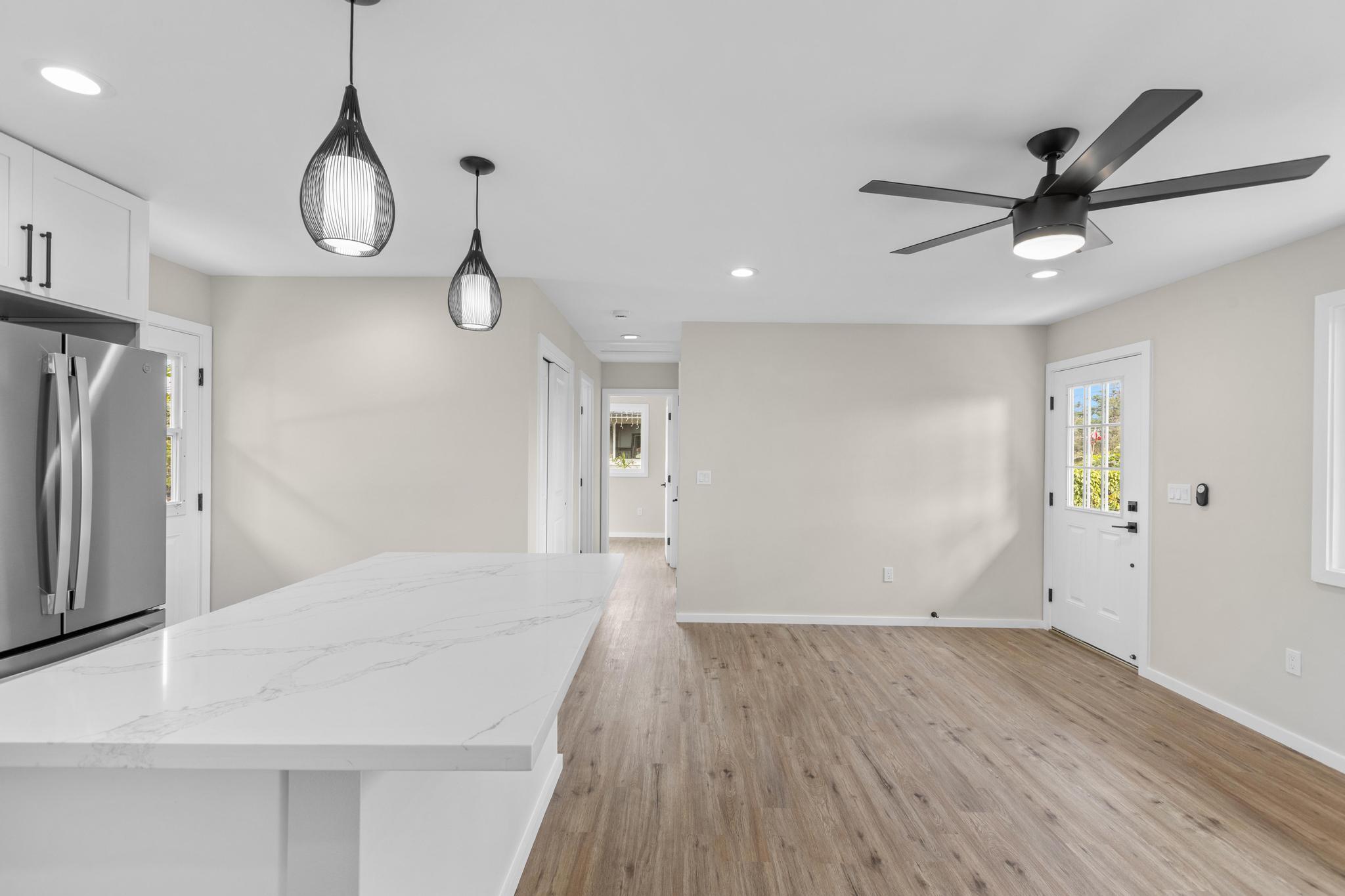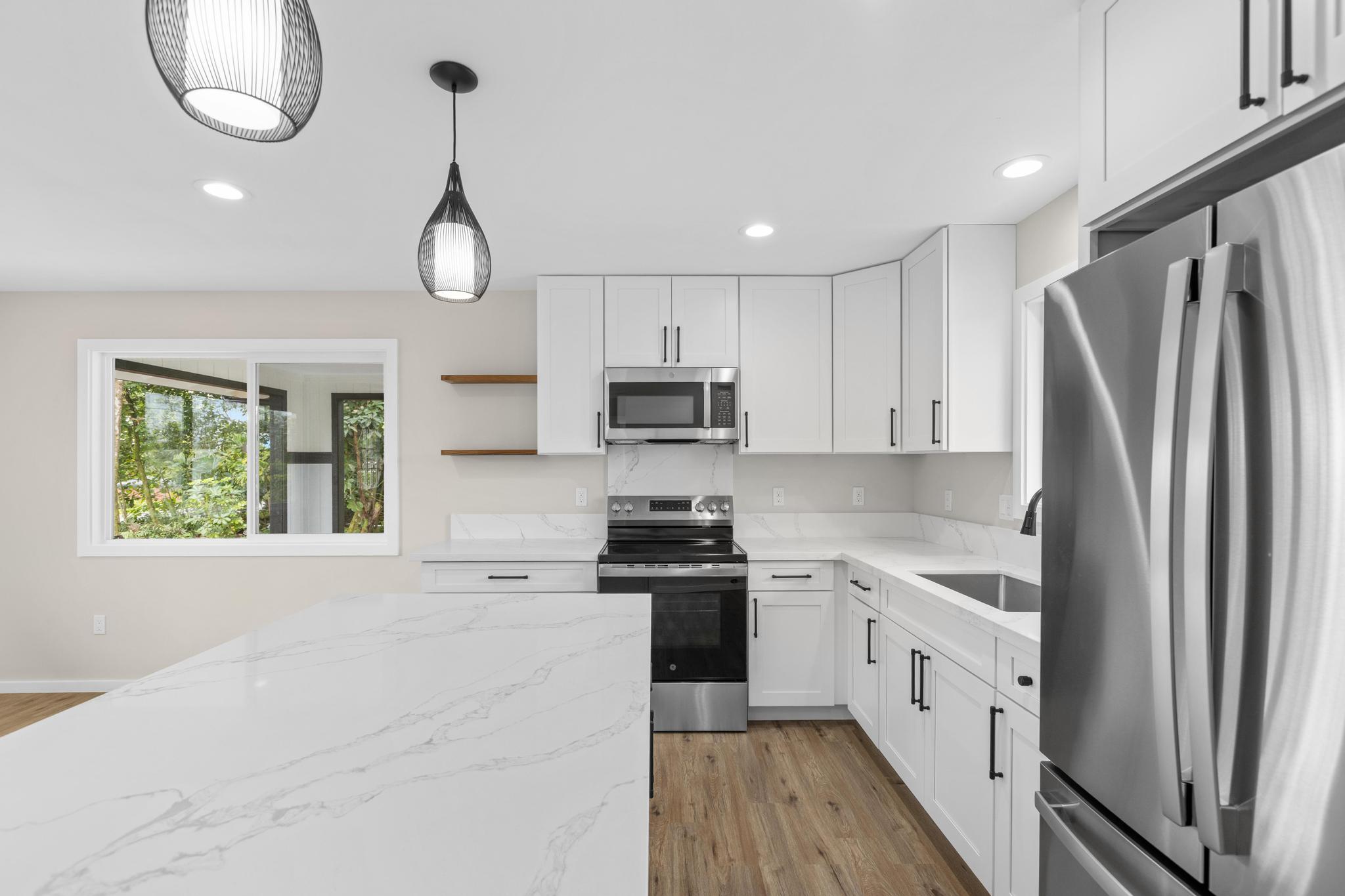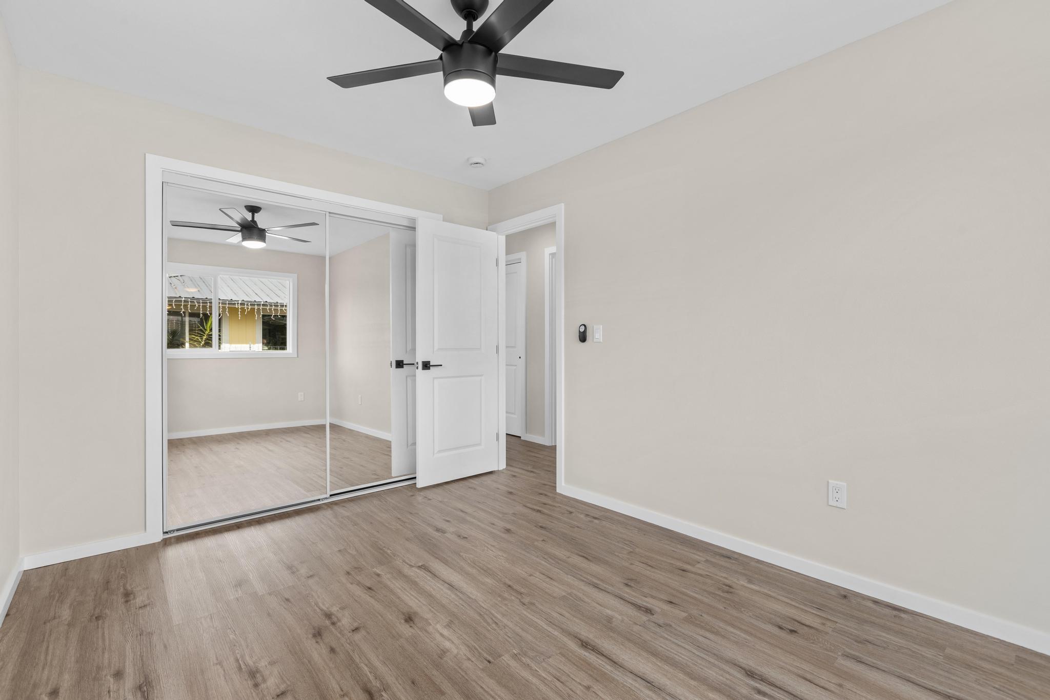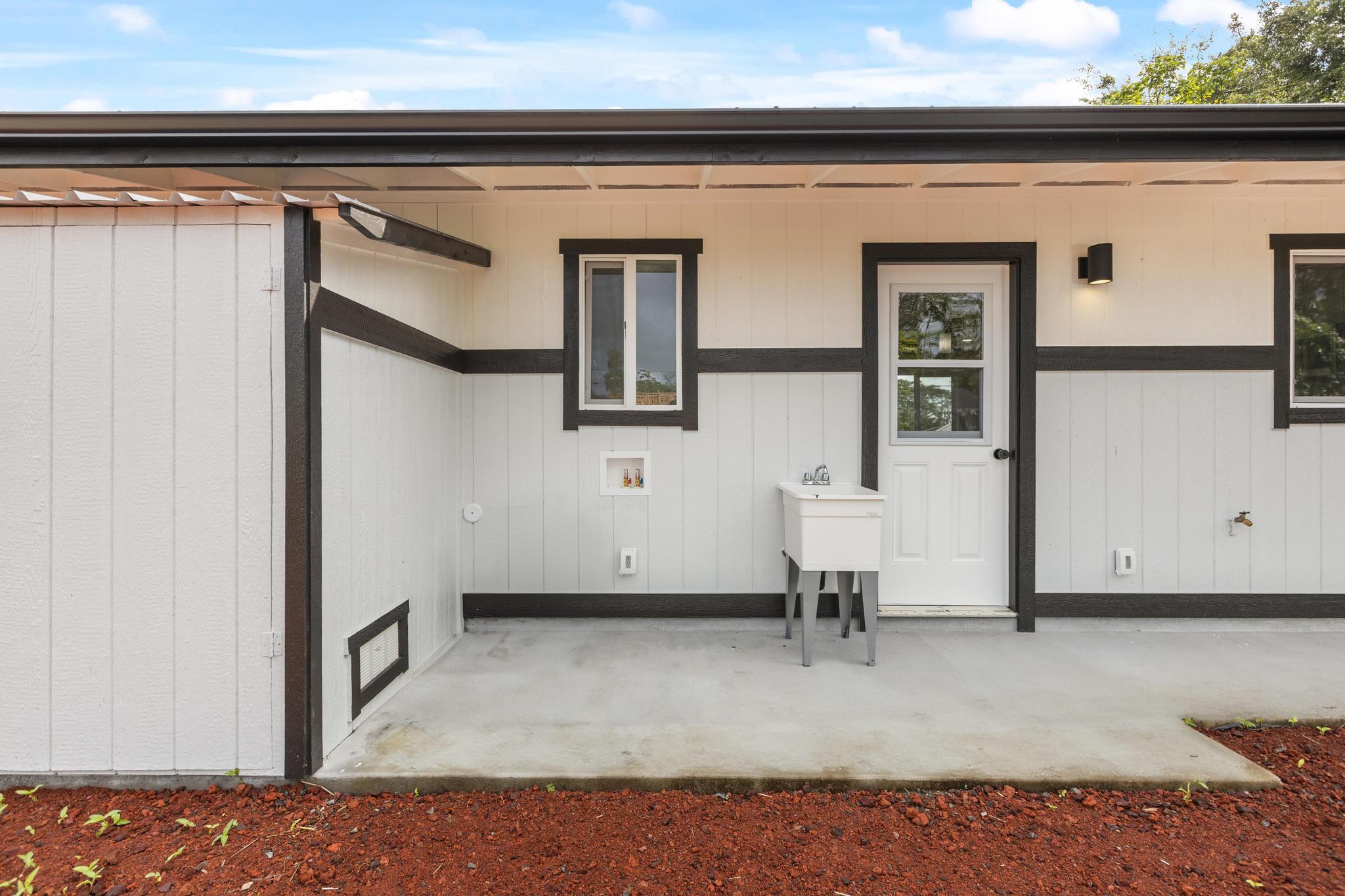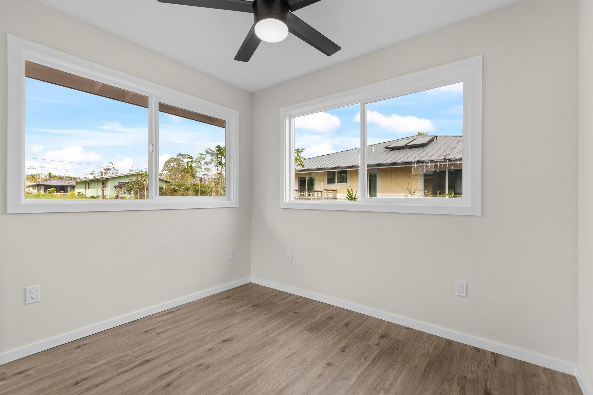 Brand-new construction in Ainaloa on paved Gardenia Dr. This thoughtfully designed 2-bedroom, 1-bath home offers 700 sq ft of bright, modern living space with a clean open-concept layout and quality finishes throughout. The interior features luxury vinyl plank flooring, recessed lighting, modern pendant fixtures, and ceiling fans that give the home a crisp, airy feel. The kitchen is both stylish and functional with a center island, white shaker-style cabinetry, solid-surface countertops, stainless steel appliances, floating wood shelves, and a window above the sink that brings in natural light. The living area flows comfortably off the kitchen, creating an efficient space for everyday living. Both bedrooms are filled with light, and includes mirrored closet doors for an added sense of space. The bathroom features a functional vanity, modern lighting, and a tub/shower combo with tile throughout. Outside, the home offers strong curb appeal with a fresh cinder ground cover, a gravel driveway, and a covered 1-car carport that also works well as a shaded entry or outdoor sitting area. The lot provides a clean slate for future landscaping, gardening, or additional outdoor improvements. This is a great opportunity to own a newly built home in Ainaloa with attractive finishes, a functional layout, and convenient access to Pahoa, shopping, dining, and everyday amenities. Information herein deemed reliable but not guaranteed. Buyer and Buyers Agent to do their own due diligence of all pertinent facts.