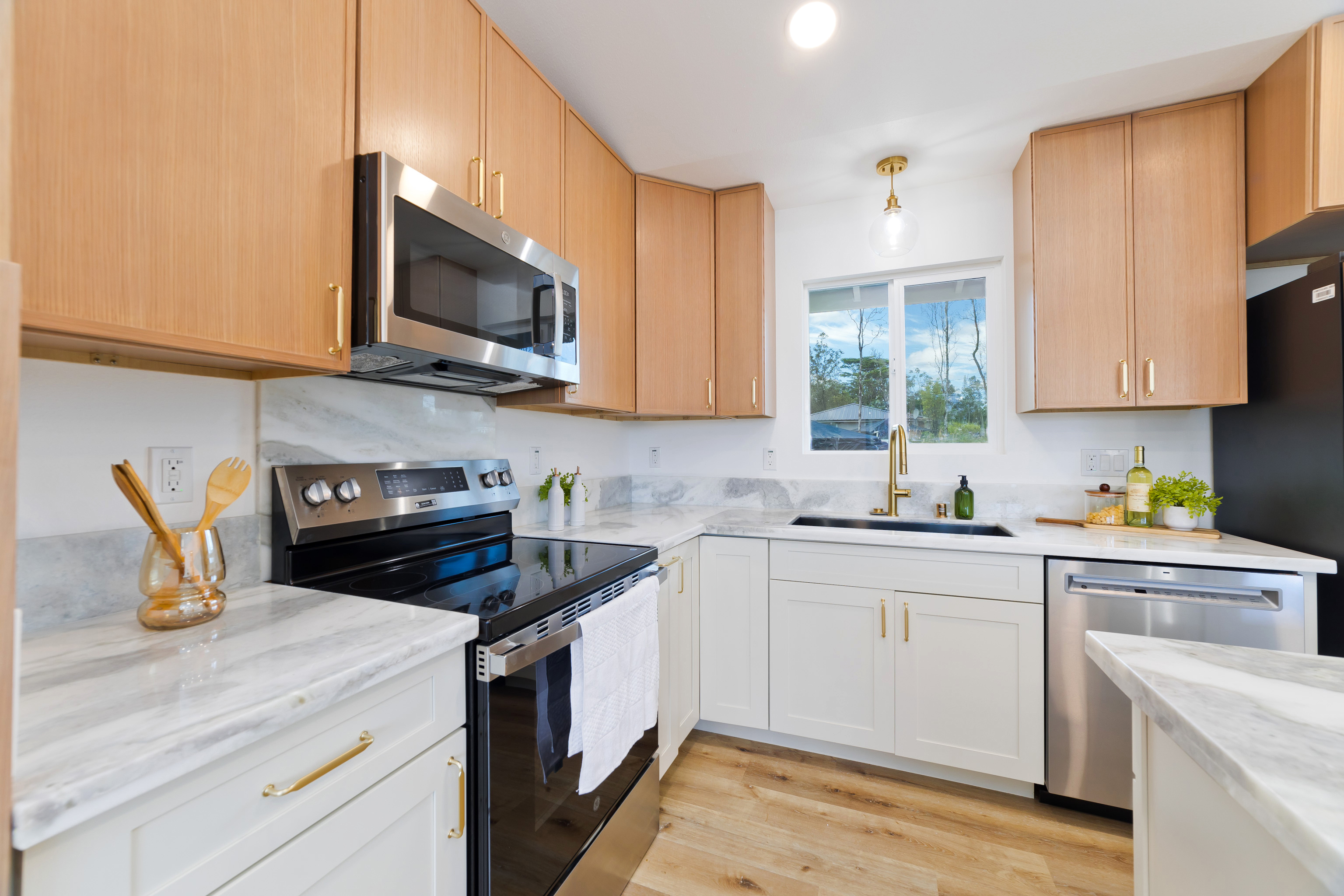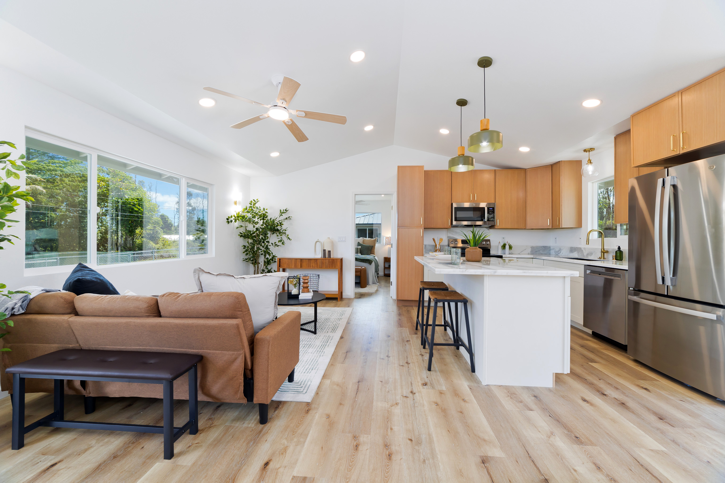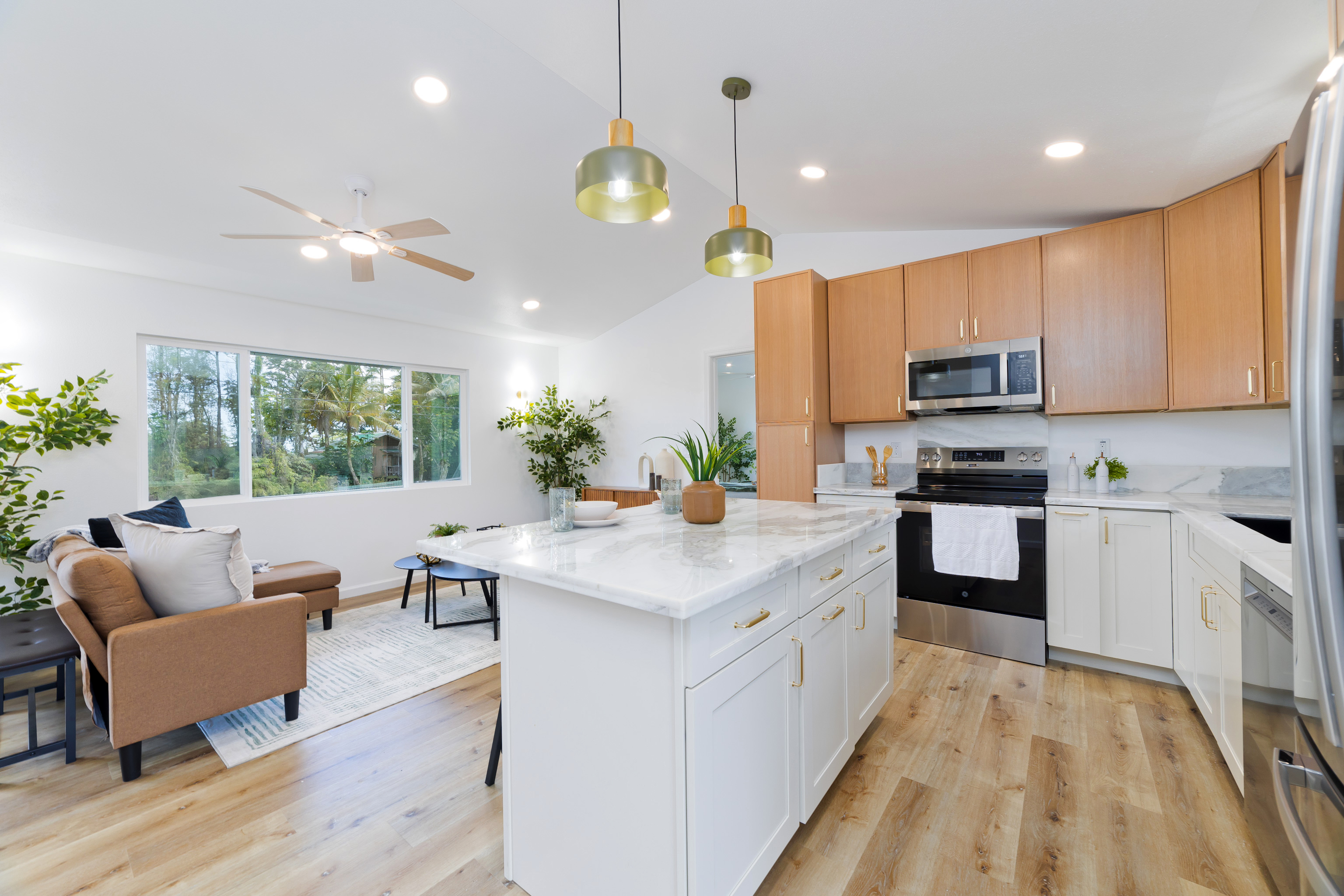Welcome to this beautifully constructed brand new 3 bedroom, 2 bathroom home in the growing Ainaloa subdivision. Priced to sell, this is the perfect starter home or investment opportunity for anyone looking to own a piece of paradise. As you step inside, you'll be greeted by an open-concept living space that flows seamlessly into the modern kitchen, featuring brand new stainless steel appliances, sleek cabinetry, and a spacious center island, ideal for both everyday living and entertaining.