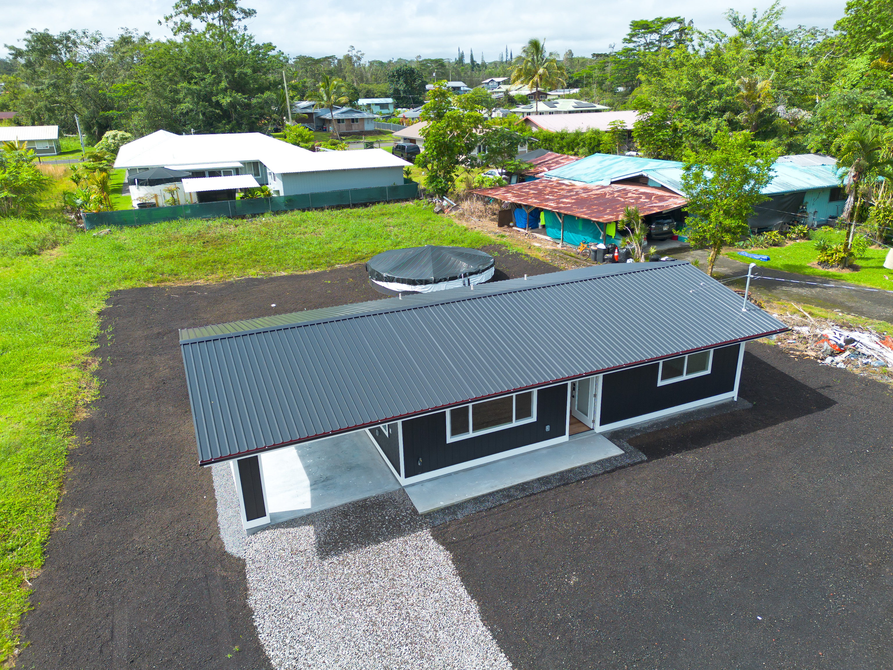 Introducing a stunning new construction in Ainaloa: a modern 2-bedroom, 1-bath home designed for island living. Enjoy fresh interiors, thoughtful design, and the best of Hawaii’s charm right at your doorstep .Located at the front of the subdivision, this beautiful new home offers easy access on a paved road. It features a convenient gravel driveway and a carport. With a cohesive modern design, the stylish interior seamlessly matches the exterior. The kitchen boasts brand-new appliances and a central island, perfect for cooking and gathering. The bathroom is upgraded with a modern LED mirror for added elegance. Each bedroom includes mirrored closets and ceiling fans for comfort, and a hallway closet provides extra storage space. Washer and dryer hookups are also included. This home is ideally situated just 13 minutes from Pahoa town and 16 minutes from Keaau.