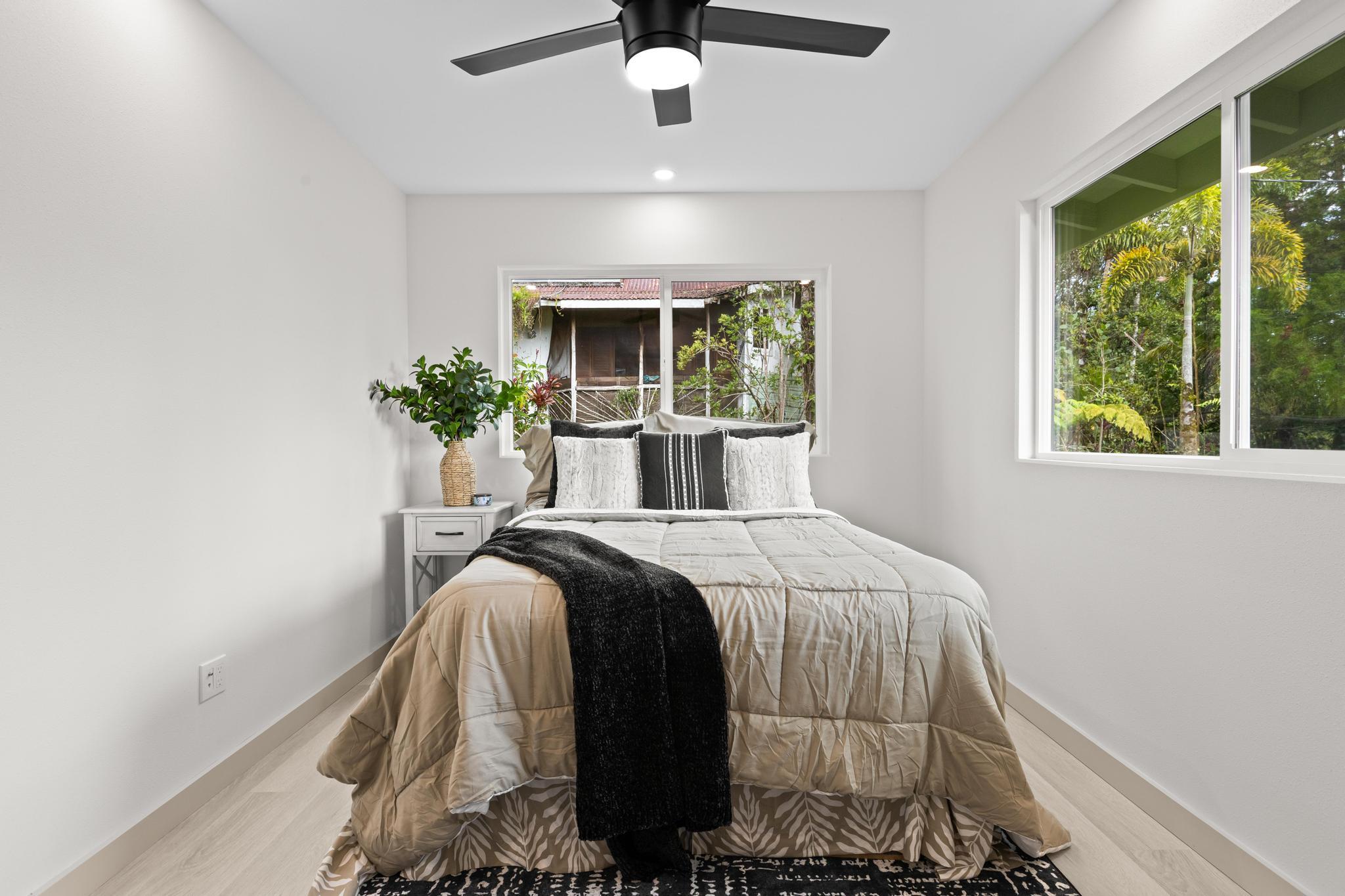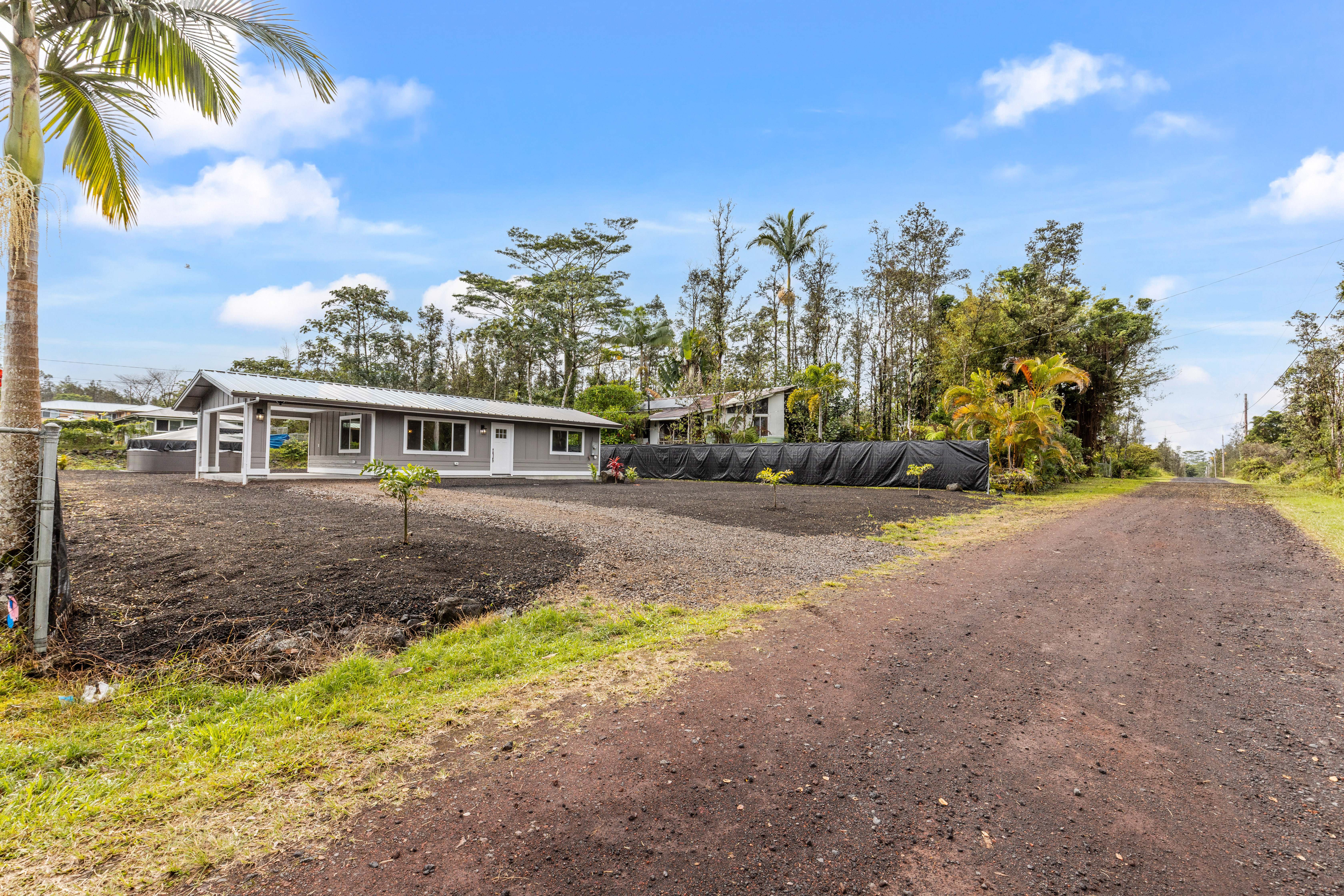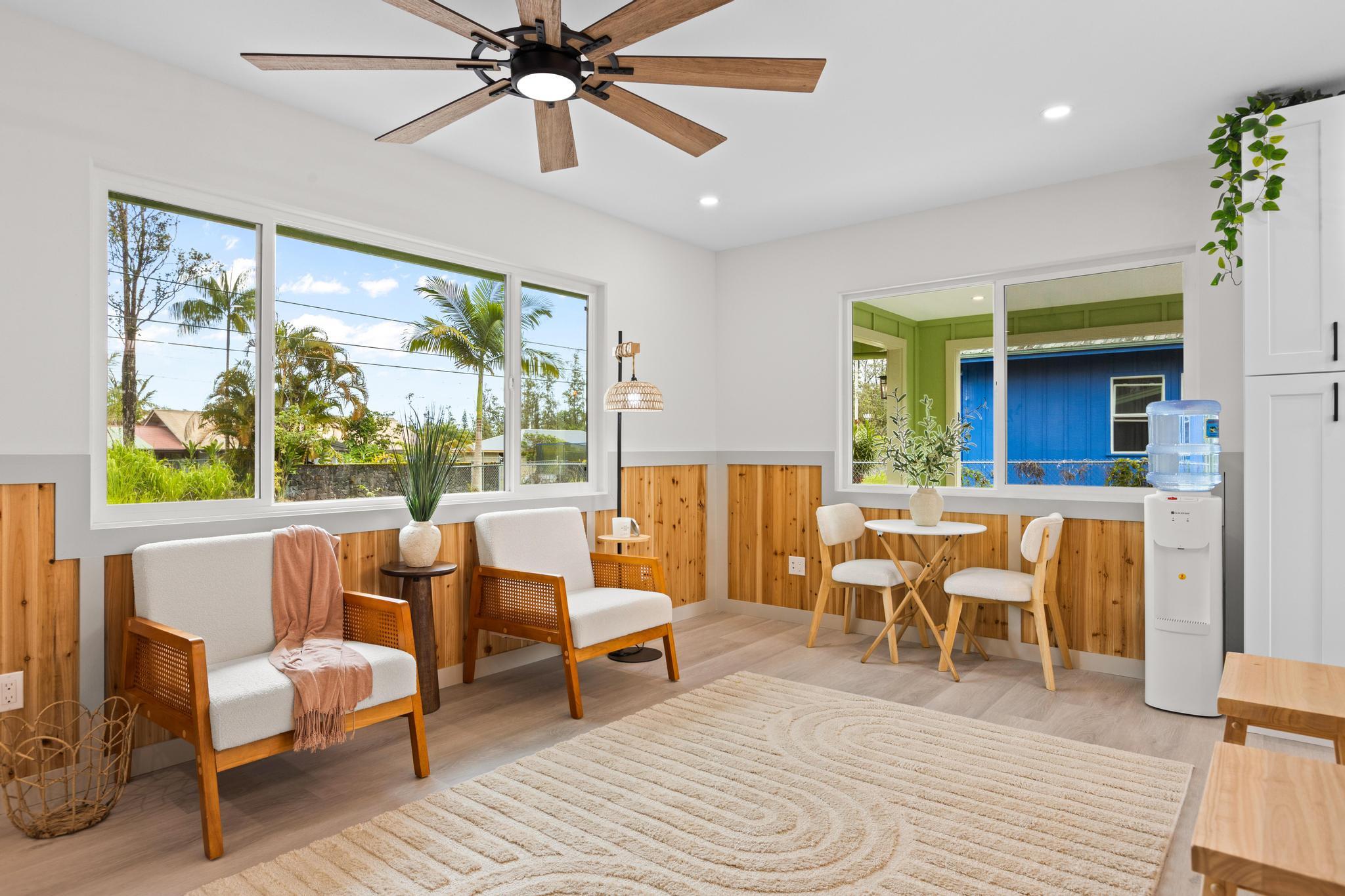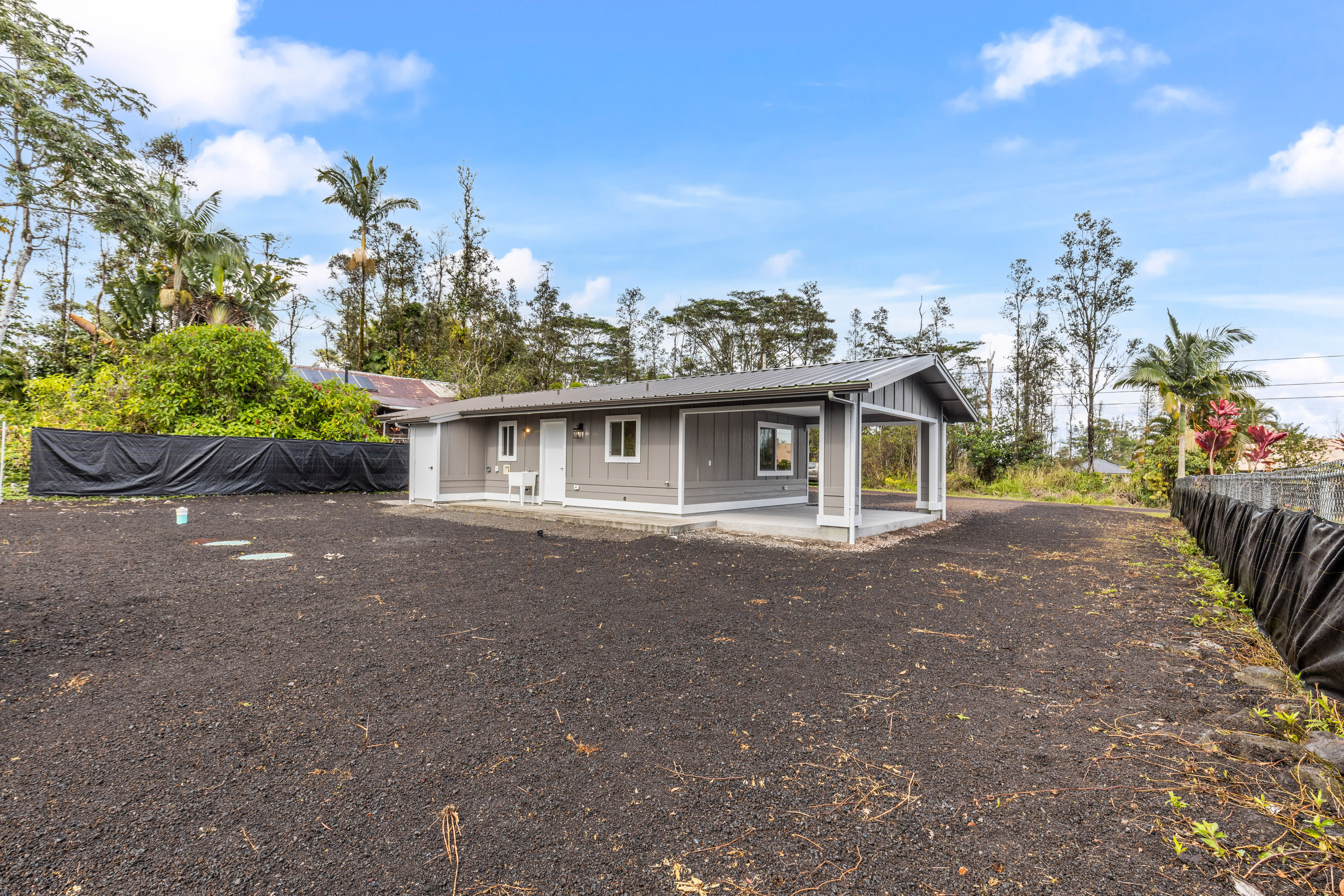 Don't miss this beautifully built 2-bedroom, 1-bath home, perfect as a starter or investment property–offered at an affordable price point in one of Puna's growing communities. Inside, you'll find quality finishes throughout, including luxury vinyl flooring, a fully tiled bathroom, and custom built-in closets for smart storage. The living area and hallway feature elegant natural wood tone paneling, adding warmth and island charm to the space. The kitchen is equipped with modern conveniences, and the home includes a refillable pure water dispenser that offers both ice-cold and hot water on demand–an added bonus for daily comfort. Step outside to enjoy a beautifully landscaped yard featuring tropical palms and native Hawaiian plants that create a serene, welcoming outdoor retreat. A brand-new 6-foot fence has just been installed along the right side and enhanced with privacy mesh for added seclusion and comfort. The home has also been refreshed with a new coat of exterior paint, boosting its curb appeal and making a great first impression from the moment you arrive. To top it off, this home comes with a 1-year contractor warranty, giving you peace of mind as you settle into your new home.