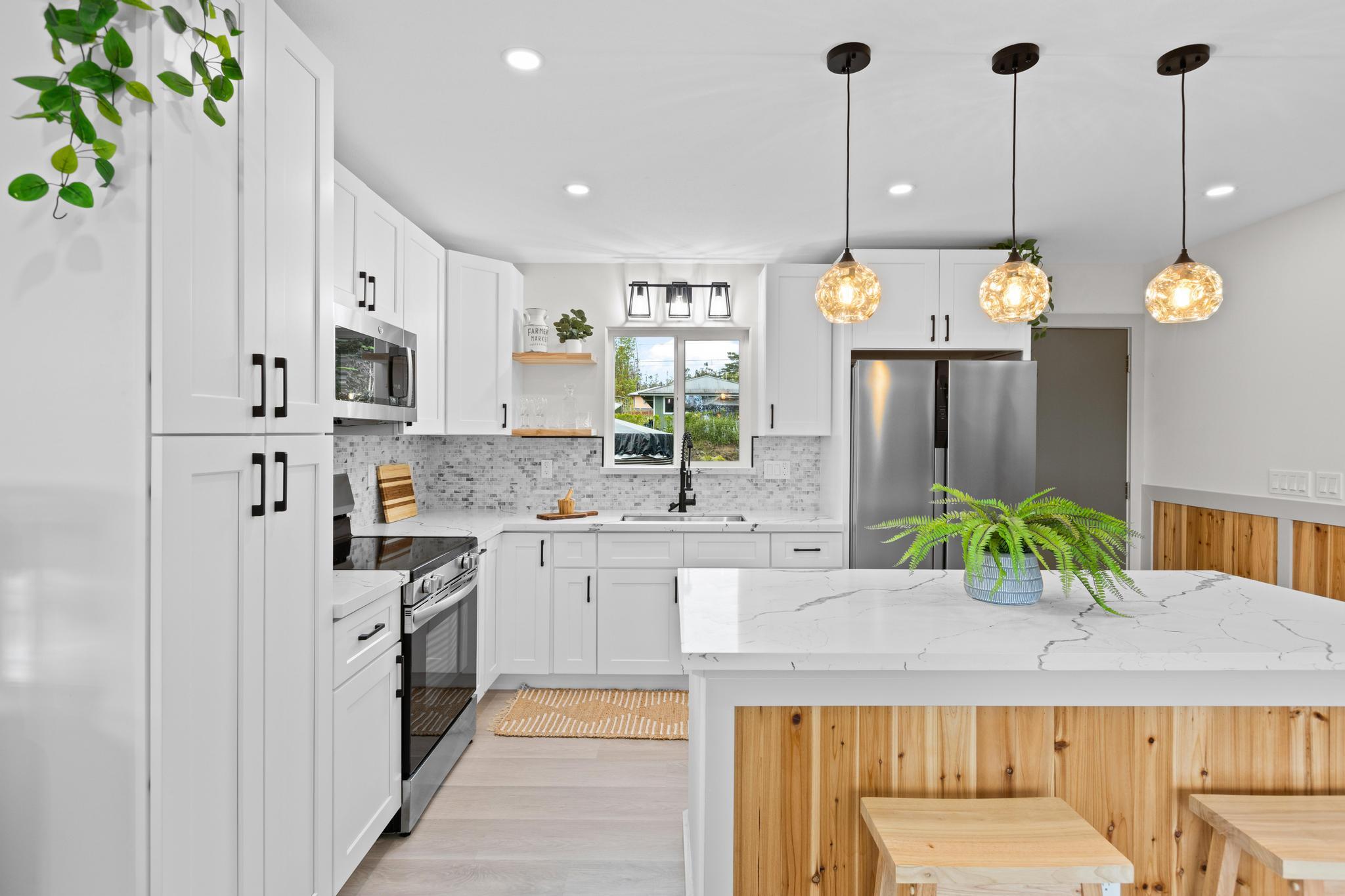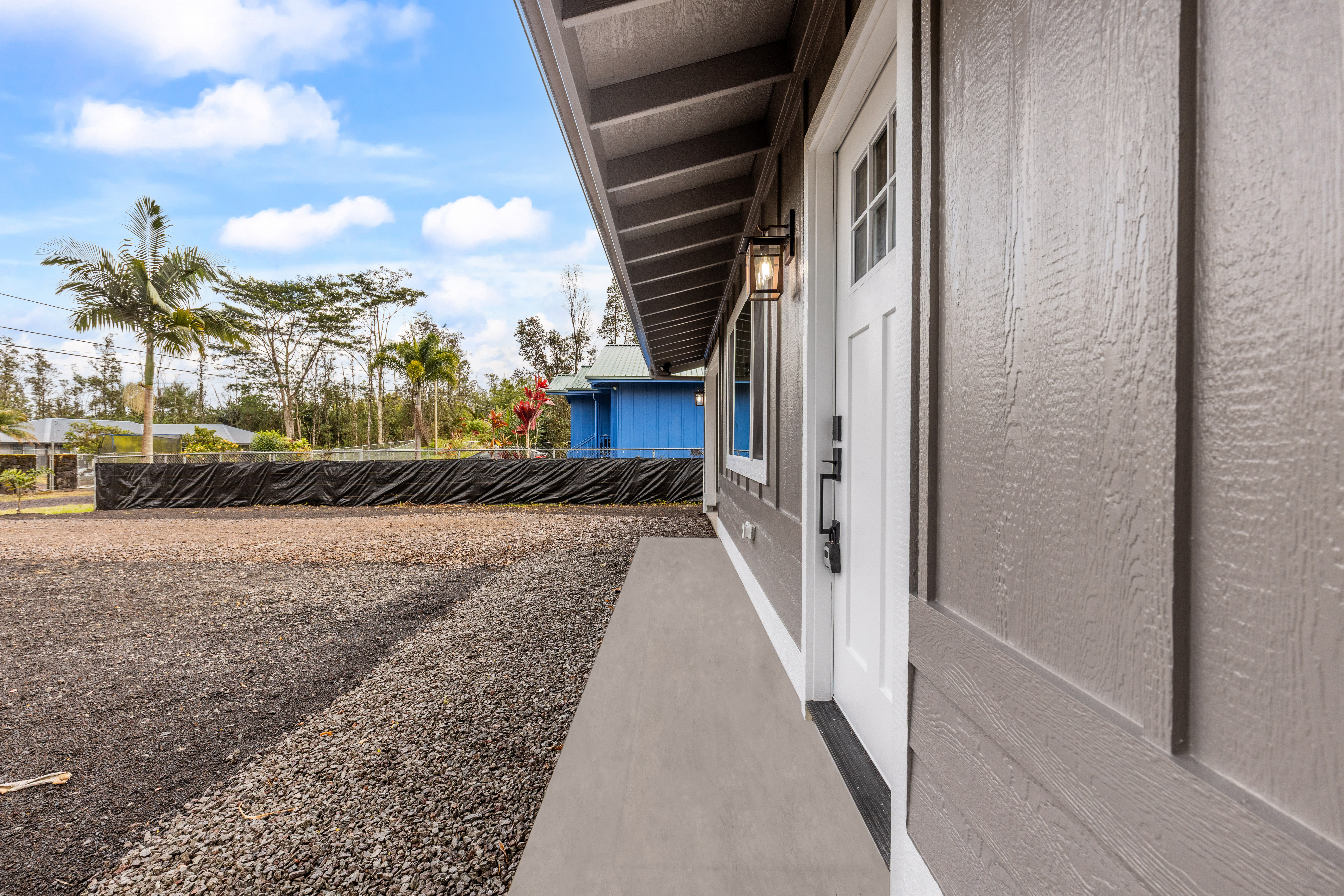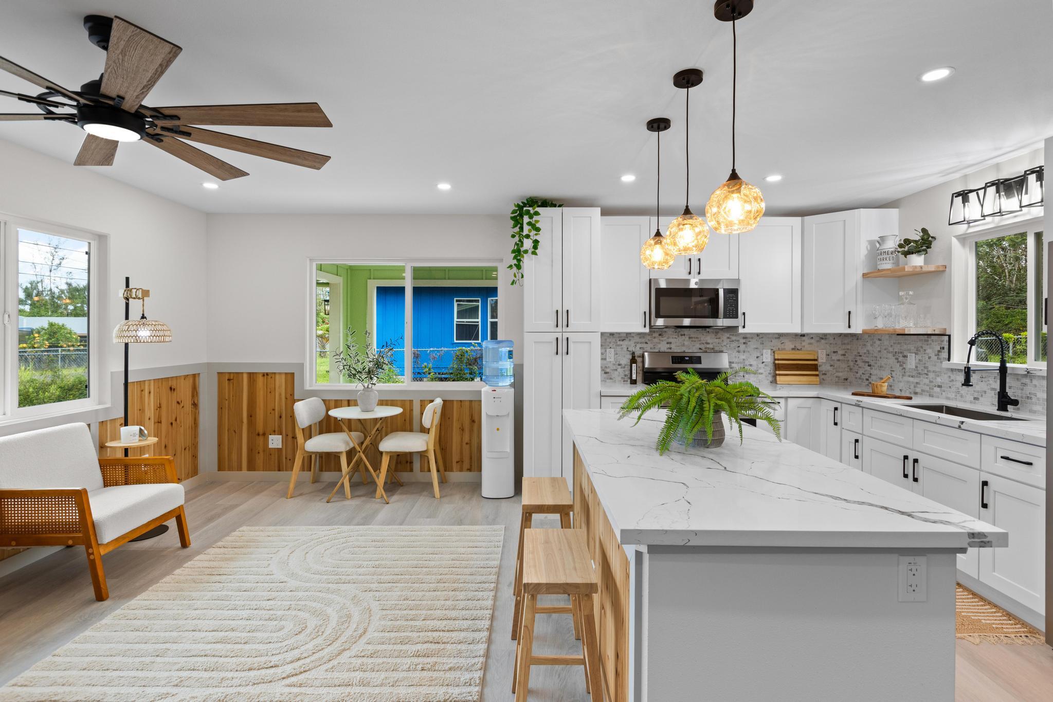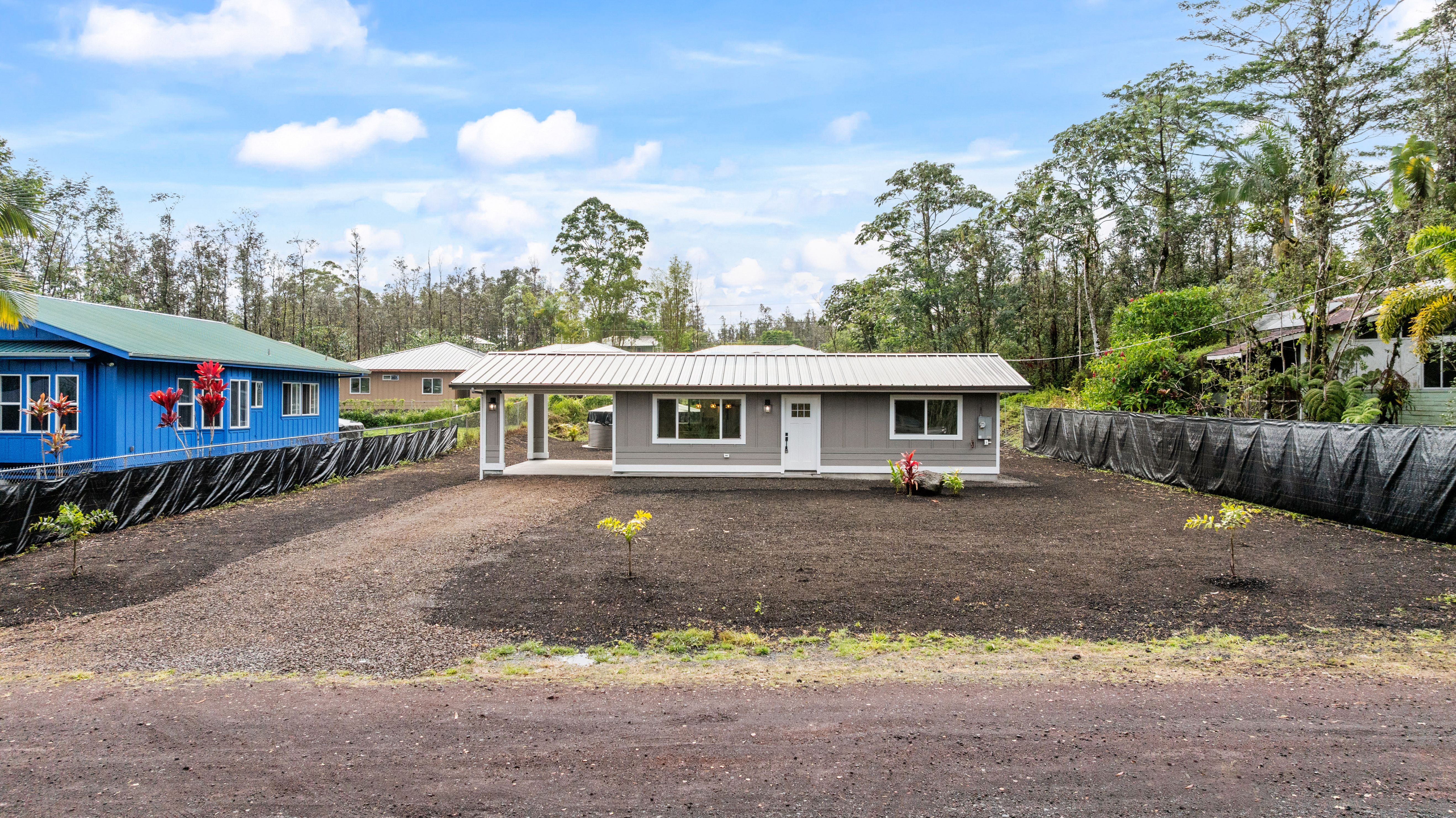 Don't miss this beautifully built 2-bedroom, 1-bath home, perfect as a starter or investment property–offered at an affordable price point in one of Puna's growing communities. Inside, you'll find quality finishes throughout, including luxury vinyl flooring, a fully tiled bathroom, and custom built-in closets for smart storage. The living area and hallway feature elegant natural wood tone paneling, adding warmth and island charm to the space. The kitchen is equipped with modern conveniences, and the home includes a refillable pure water dispenser that offers both ice-cold and hot water on demand–an added bonus for daily comfort. Step outside to enjoy a beautifully landscaped yard featuring tropical palms and native Hawaiian plants that create a serene, welcoming outdoor retreat. A brand-new 6-foot fence has just been installed along the right side and enhanced with privacy mesh for added seclusion and comfort. The home has also been refreshed with a new coat of exterior paint, boosting its curb appeal and making a great first impression from the moment you arrive. To top it off, this home comes with a 1-year contractor warranty, giving you peace of mind as you settle into your new home.
