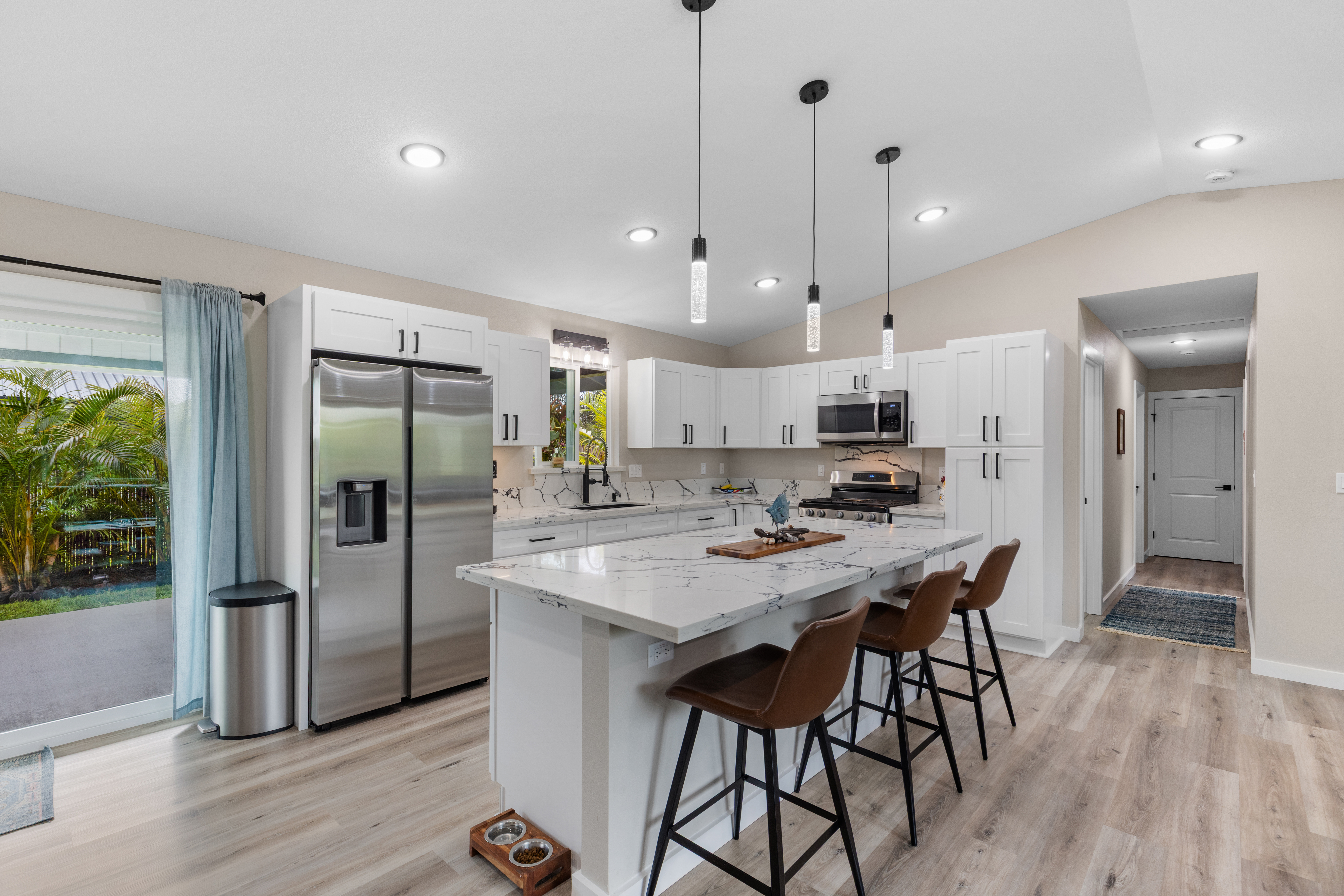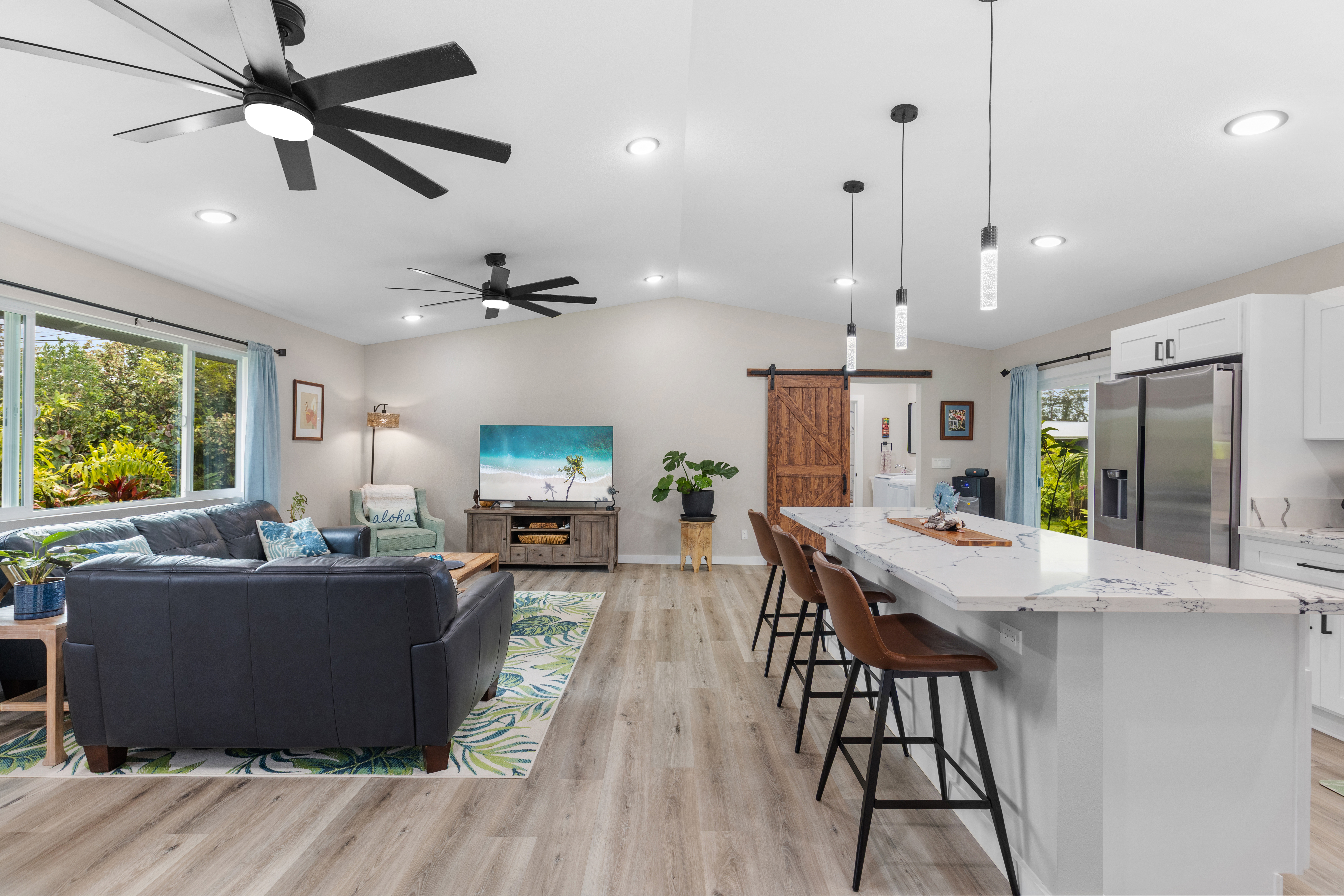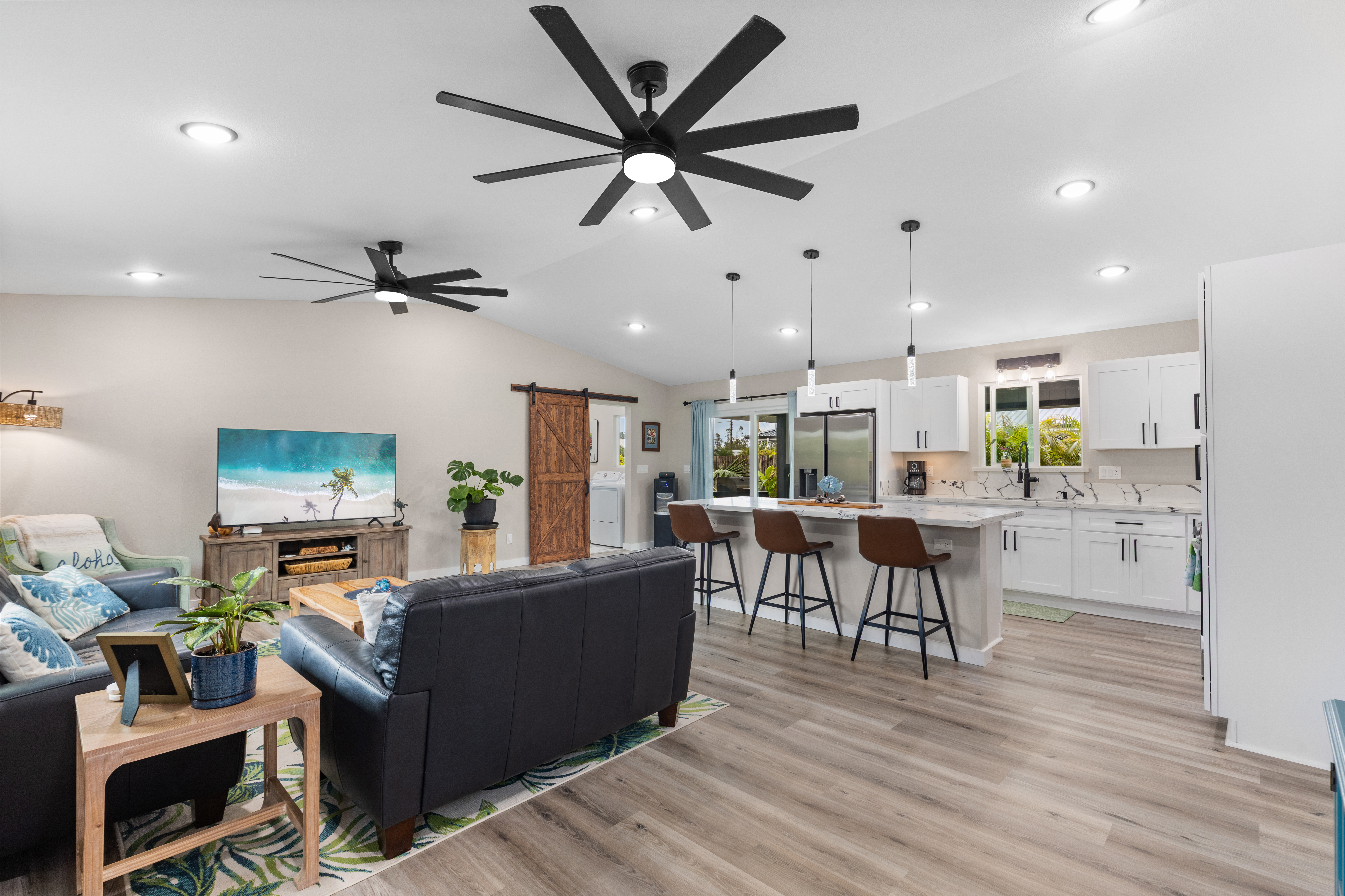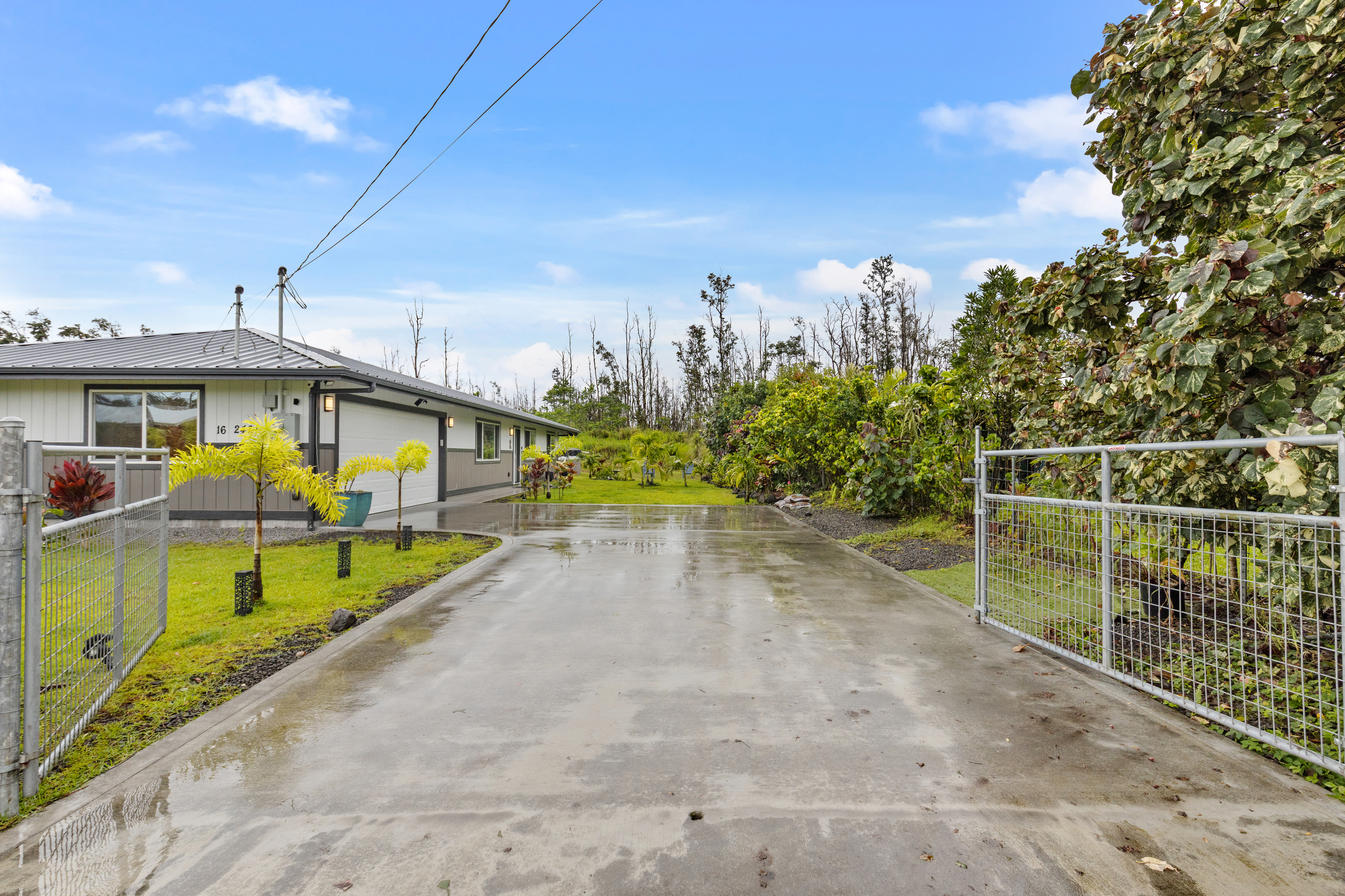 Like-new–but better–home on paved Ainaloa Drive in the desirable Ainaloa subdivision 3 bedroom / 3 full bath home, with a thoughtfully designed layout — ideal for first-time buyers or growing families Modern finishes throughout including sleek flooring and a clean, contemporary aesthetic Well-appointed kitchen featuring: Quartz countertops New cabinetry + pantry Center island for prep and gathering Stylish, modern lighting Functional floor plan with all bedrooms conveniently situated on one side Primary suite retreat with: Private bath Tiled walk-in shower with niche Decorative flooring details Guest bath with tiled tub/shower combo and updated finishes Ample hallway storage for added convenience Extra features: Indoor laundry room with utility sink Additional bath with walk-in shower Sliding barn door accent Spacious 2-car enclosed garage with extra storage Fully fenced & gated property with concrete driveway Save time and money–no need to install fencing or invest in landscaping Move right in and enjoy a finished, low-maintenance outdoor space Rare setting backing open land No rear neighbors Added privacy and a more expansive, peaceful feel A turn-key opportunity combining modern comfort, upgrades, and long-term value