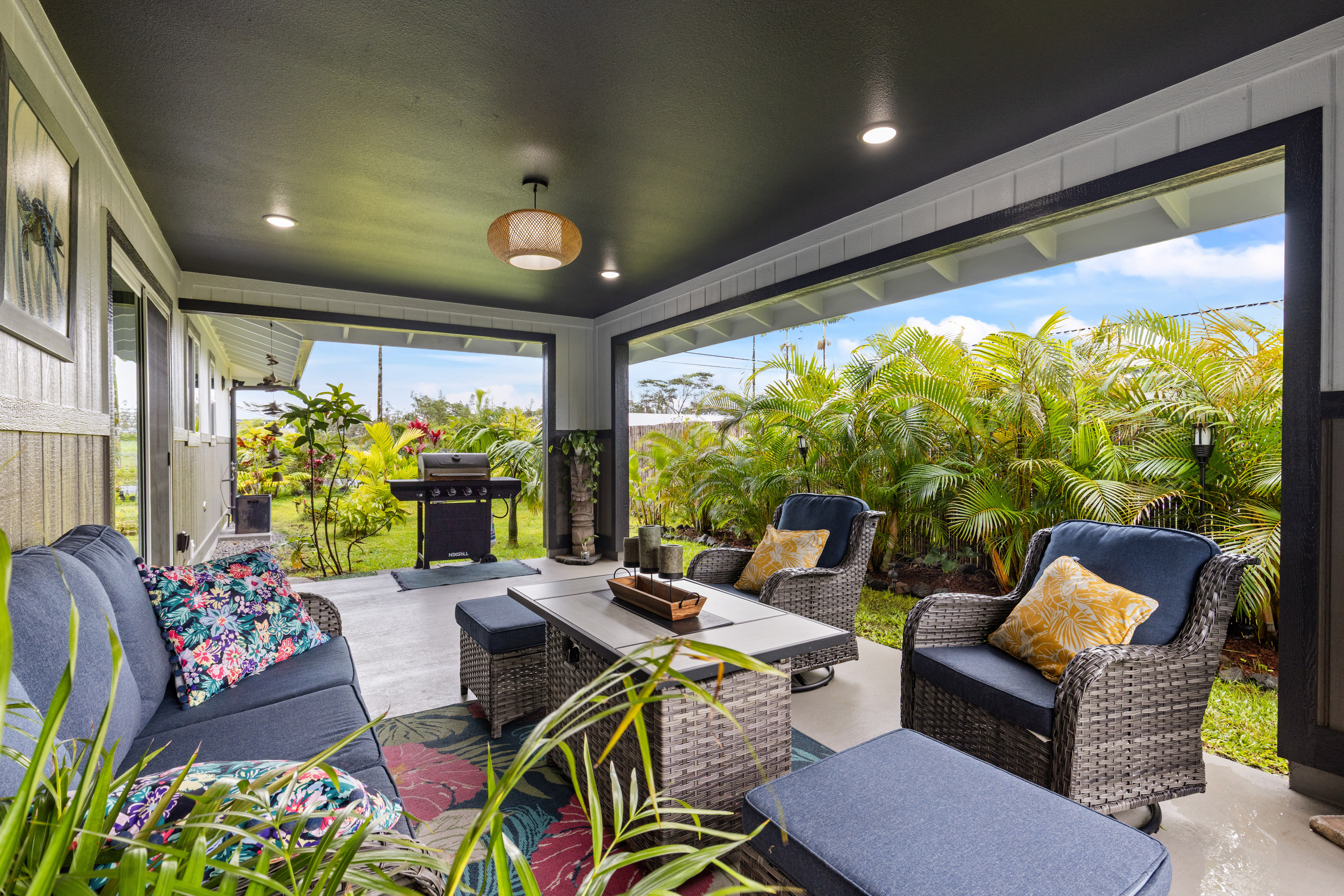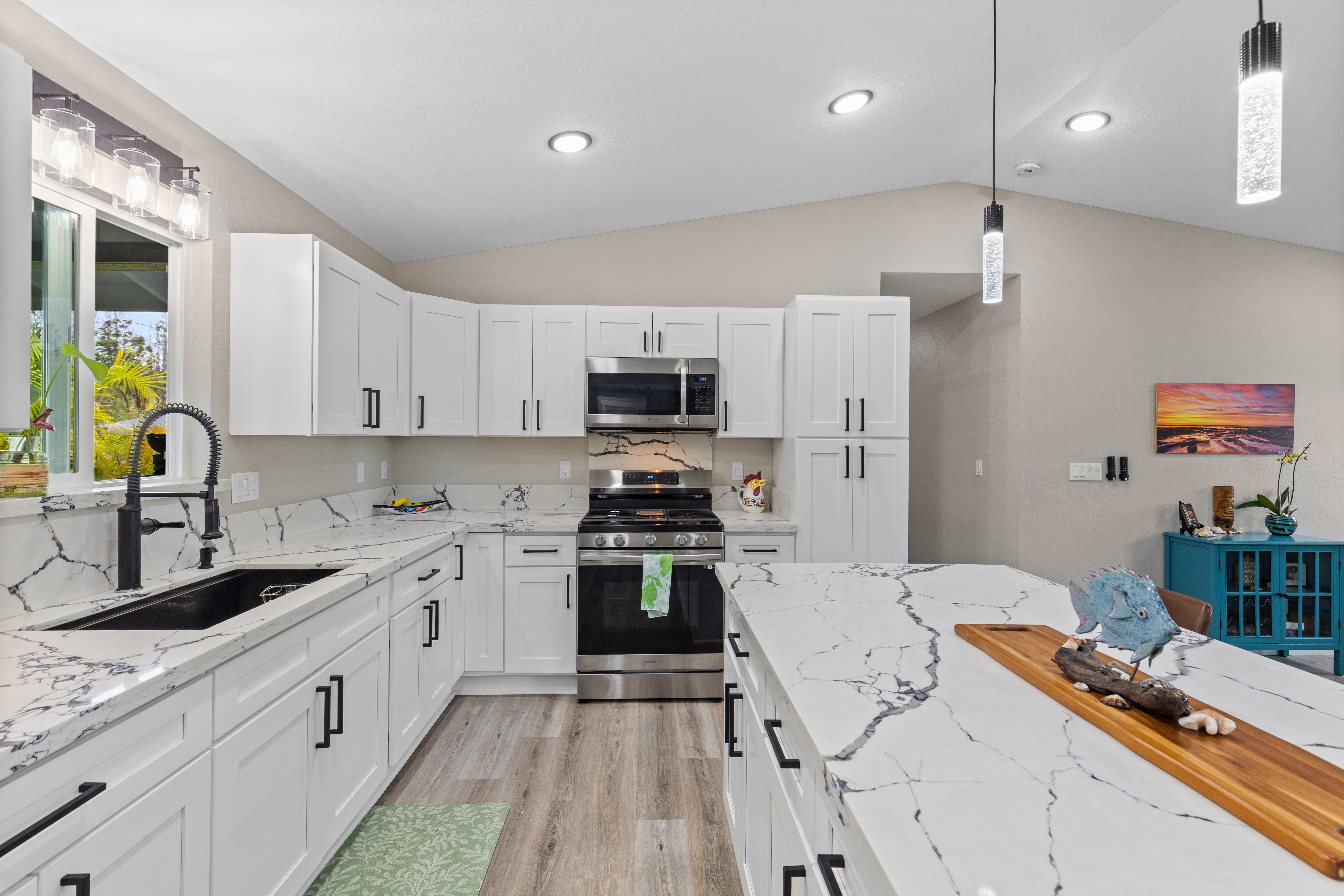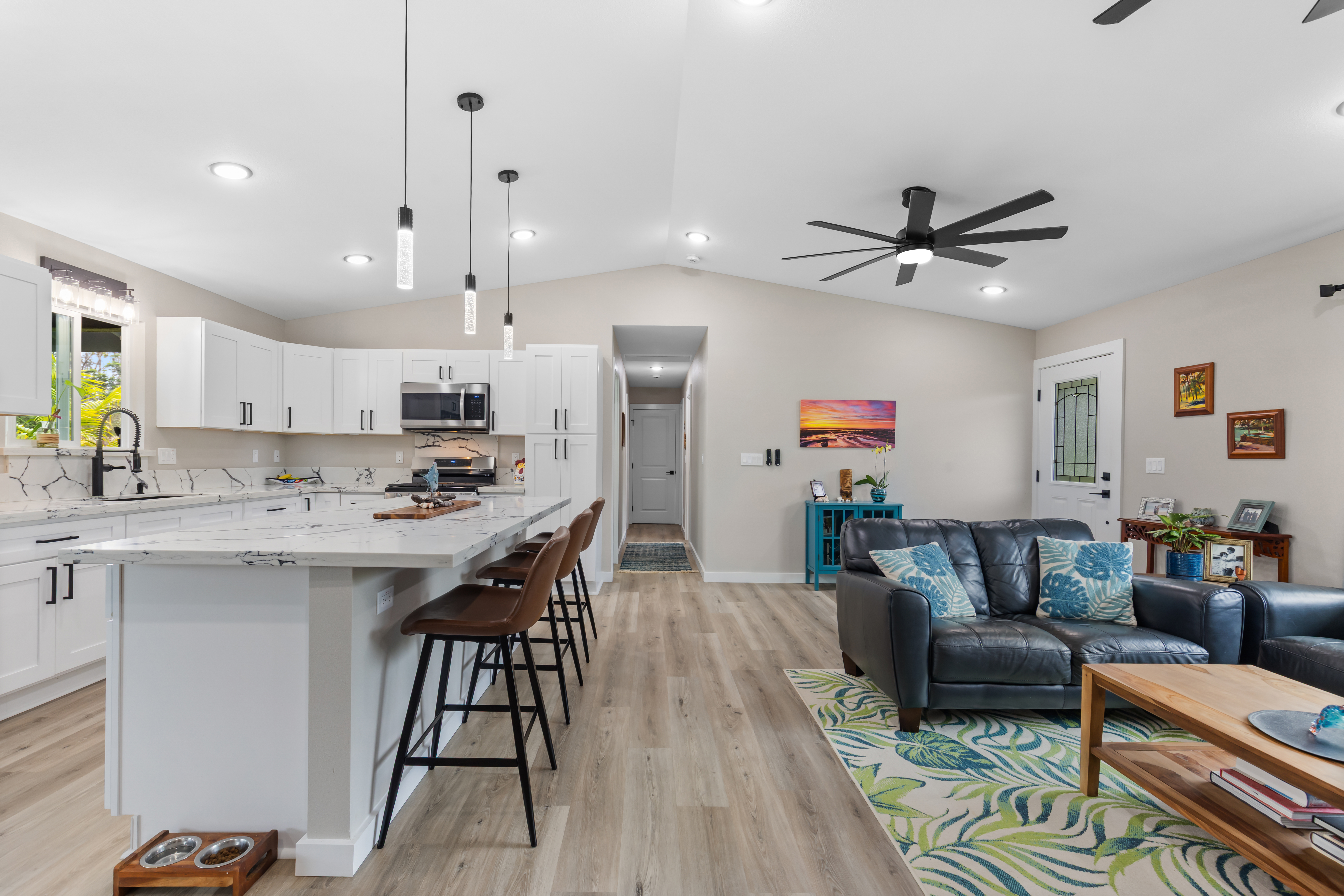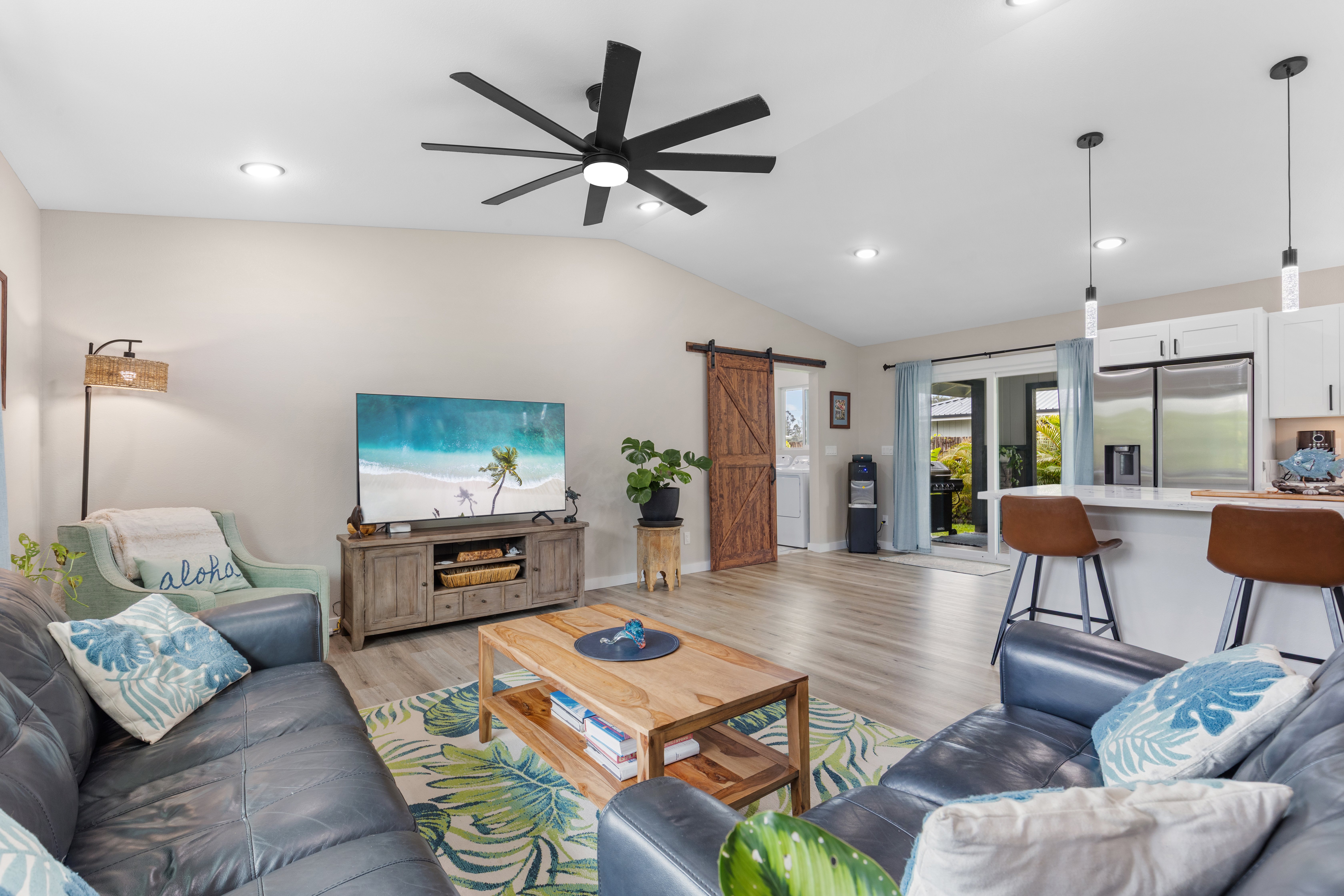 Like-new–but better–home on paved Ainaloa Drive in the desirable Ainaloa subdivision 3 bedroom / 3 full bath home, with a thoughtfully designed layout — ideal for first-time buyers or growing families Modern finishes throughout including sleek flooring and a clean, contemporary aesthetic Well-appointed kitchen featuring: Quartz countertops New cabinetry + pantry Center island for prep and gathering Stylish, modern lighting Functional floor plan with all bedrooms conveniently situated on one side Primary suite retreat with: Private bath Tiled walk-in shower with niche Decorative flooring details Guest bath with tiled tub/shower combo and updated finishes Ample hallway storage for added convenience Extra features: Indoor laundry room with utility sink Additional bath with walk-in shower Sliding barn door accent Spacious 2-car enclosed garage with extra storage Fully fenced & gated property with concrete driveway Save time and money–no need to install fencing or invest in landscaping Move right in and enjoy a finished, low-maintenance outdoor space Rare setting backing open land No rear neighbors Added privacy and a more expansive, peaceful feel A turn-key opportunity combining modern comfort, upgrades, and long-term value