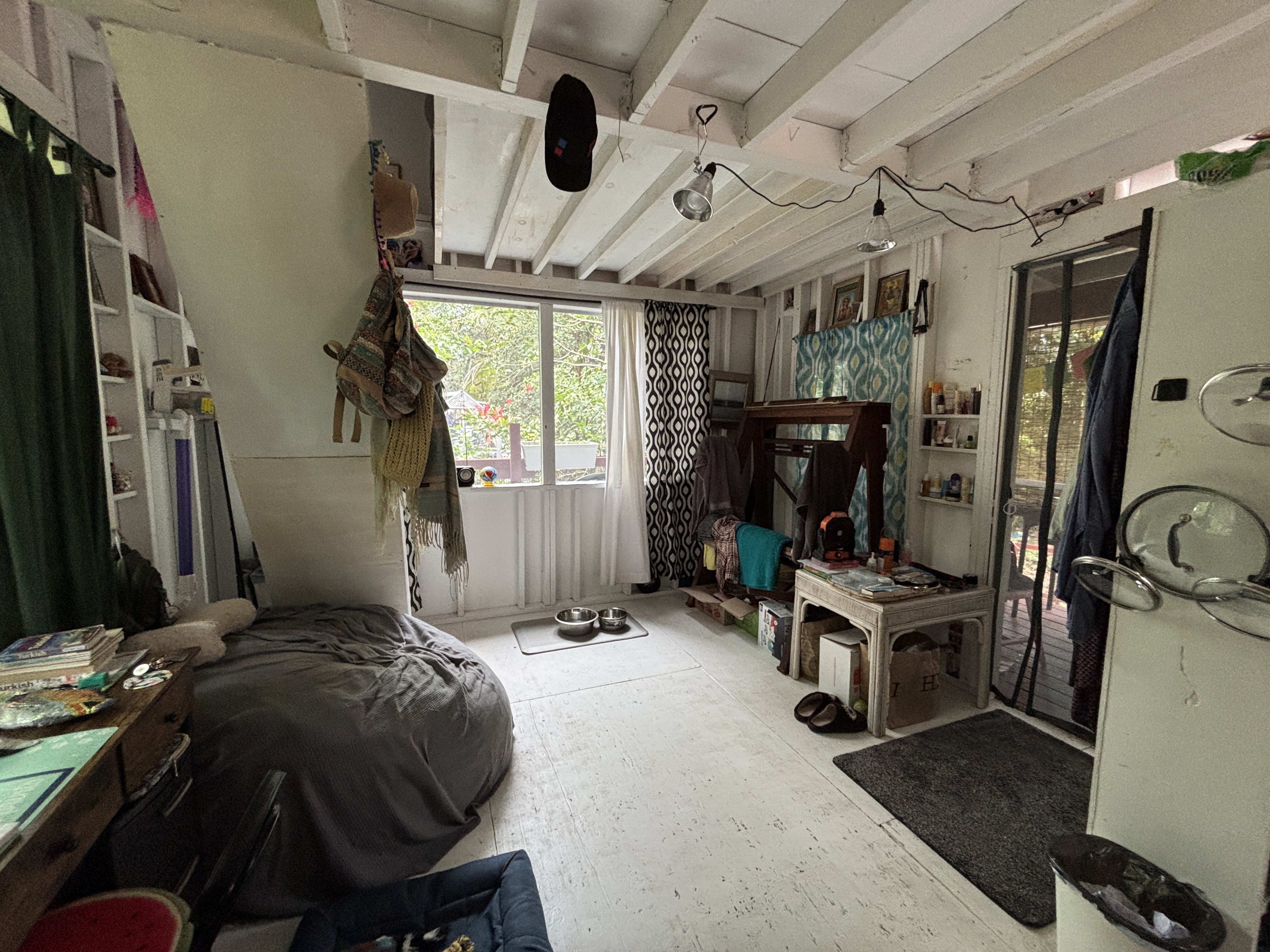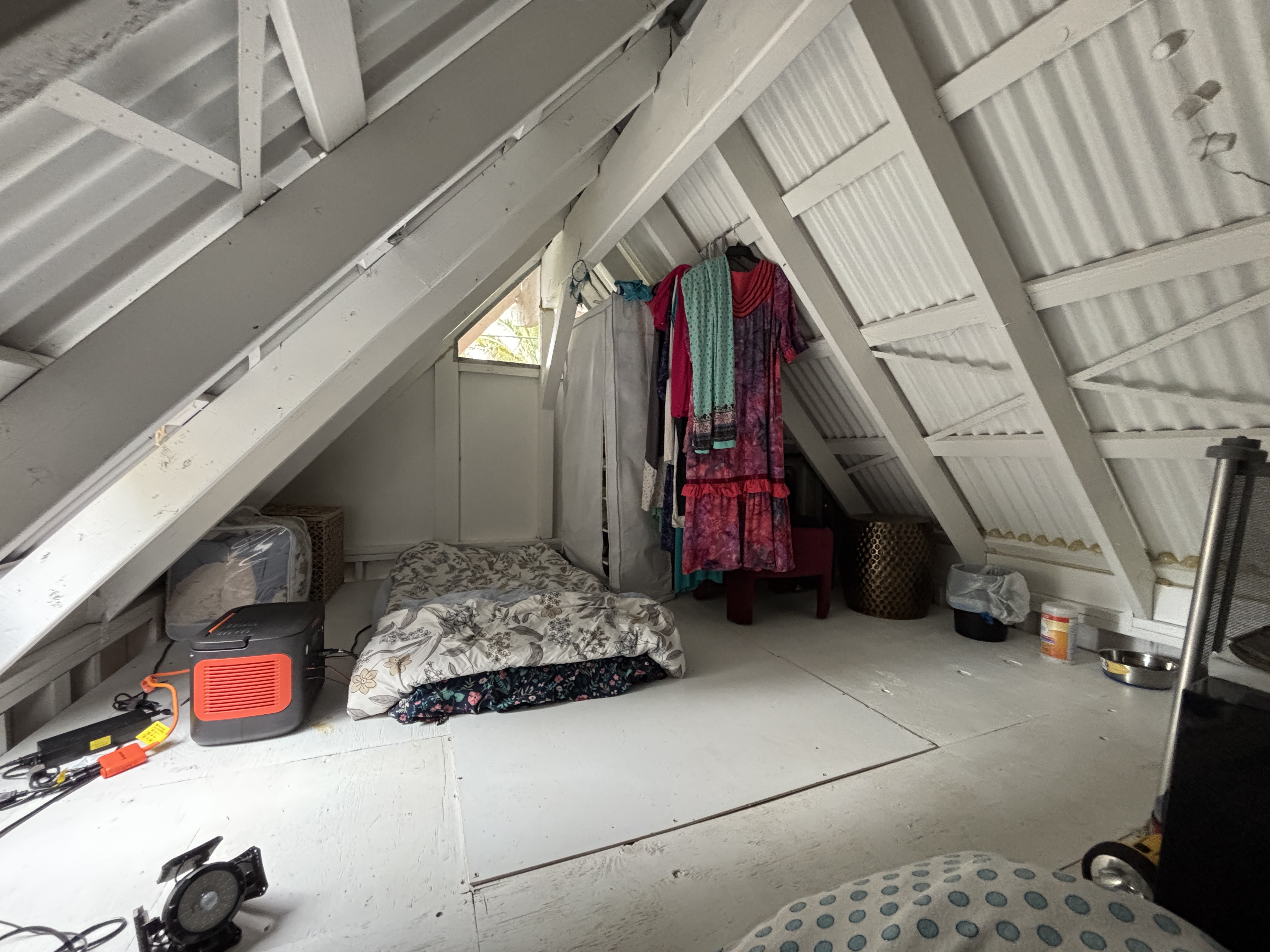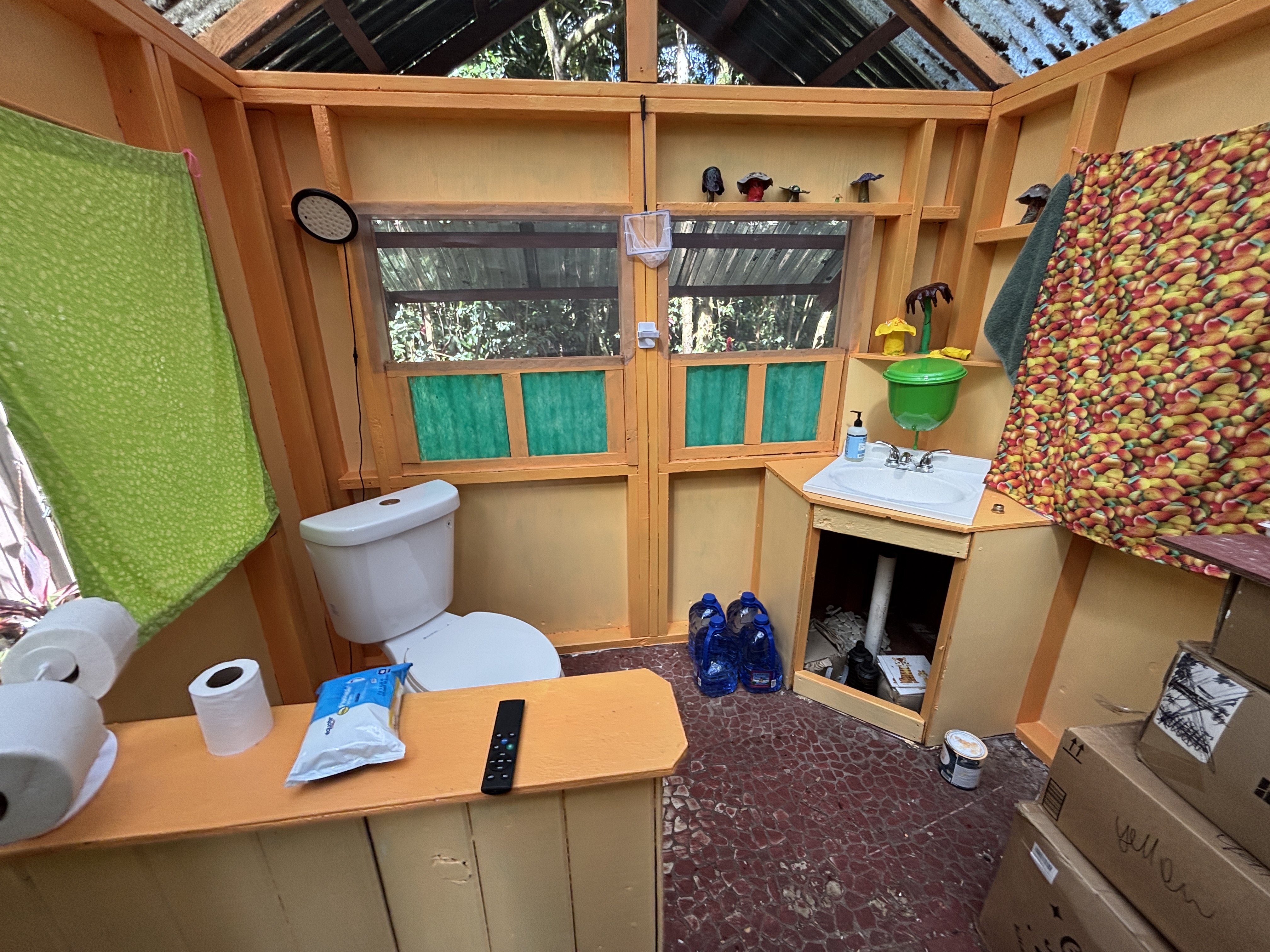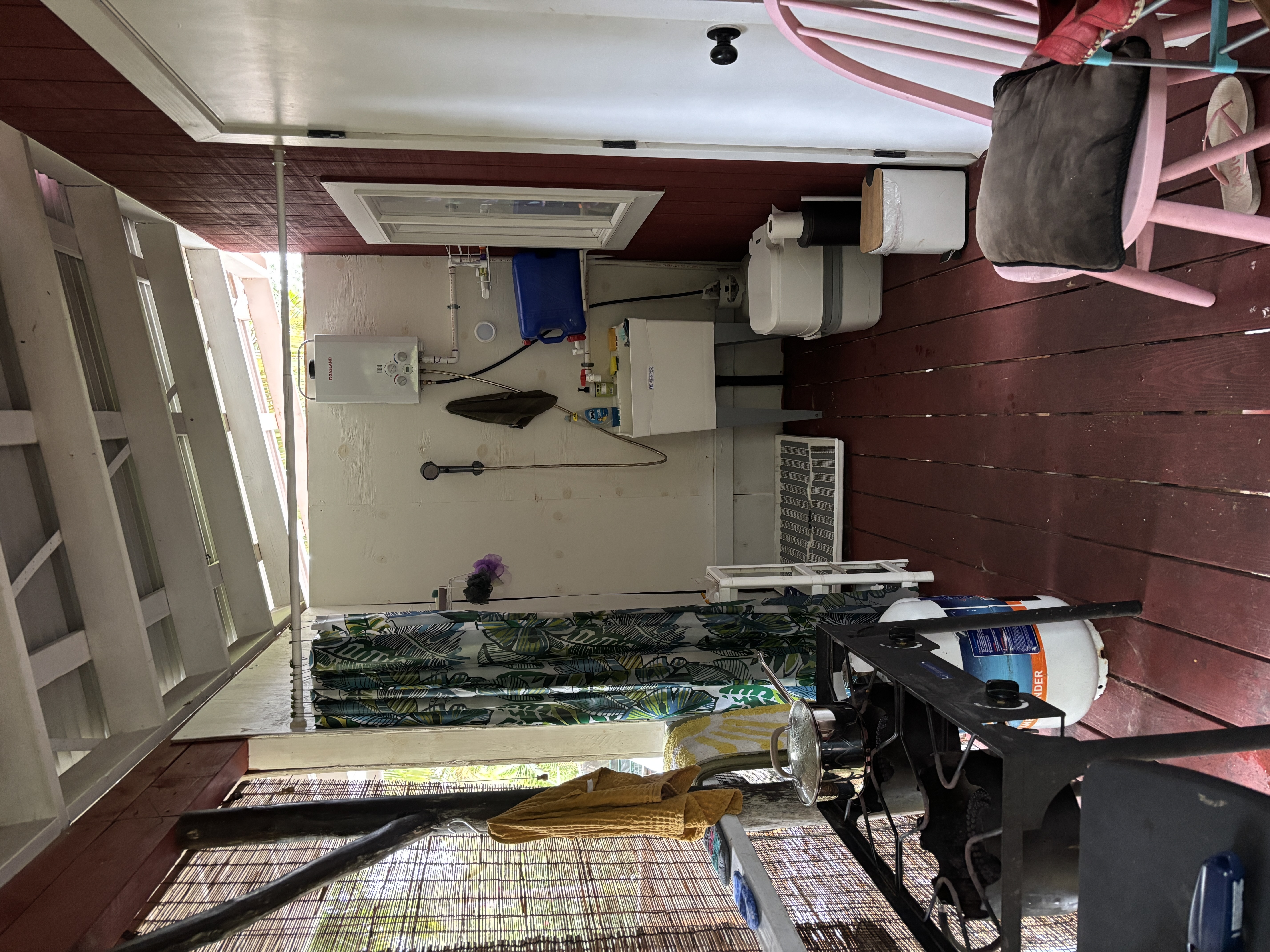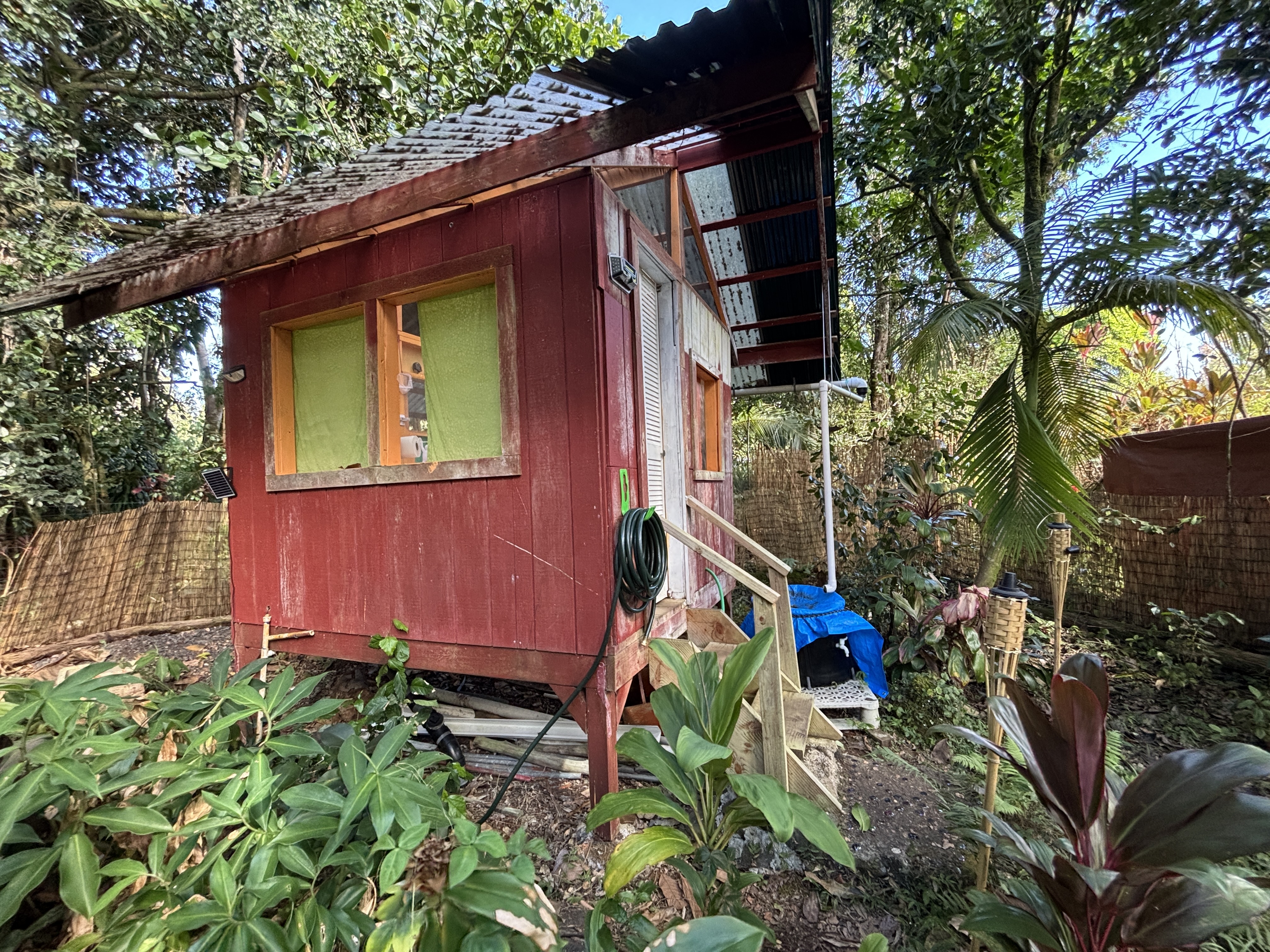 The cabin sits on post and pier with no indoor plumbing. Two poly water tanks supply water. The front lanai features outdoor propane burners, an on-demand water heater for the shower, and a composting toilet. Inside, the first floor offers spacious living with screened windows, while the second floor provides a cozy sleeping area with solar system access–perfect for star gazing.