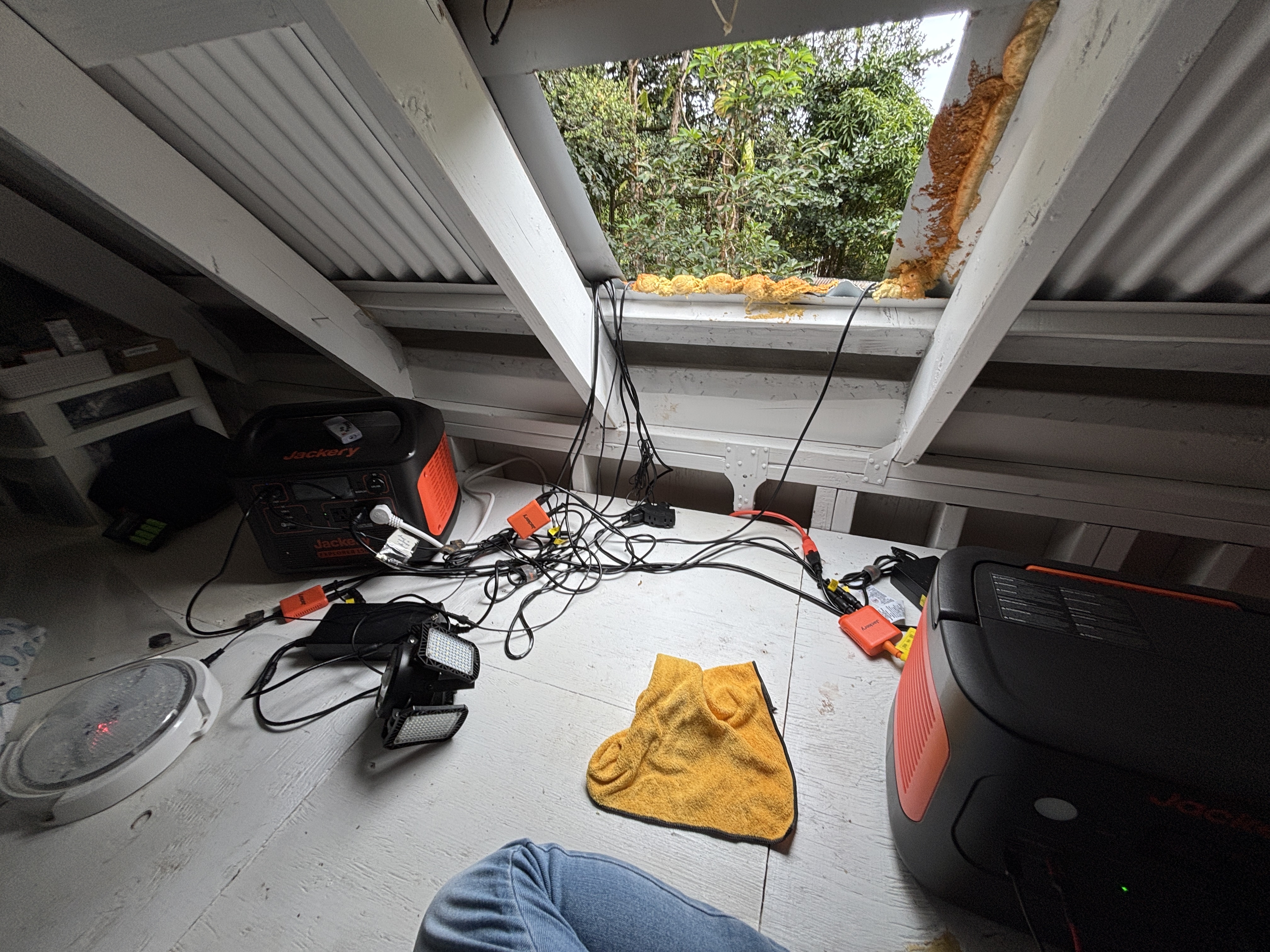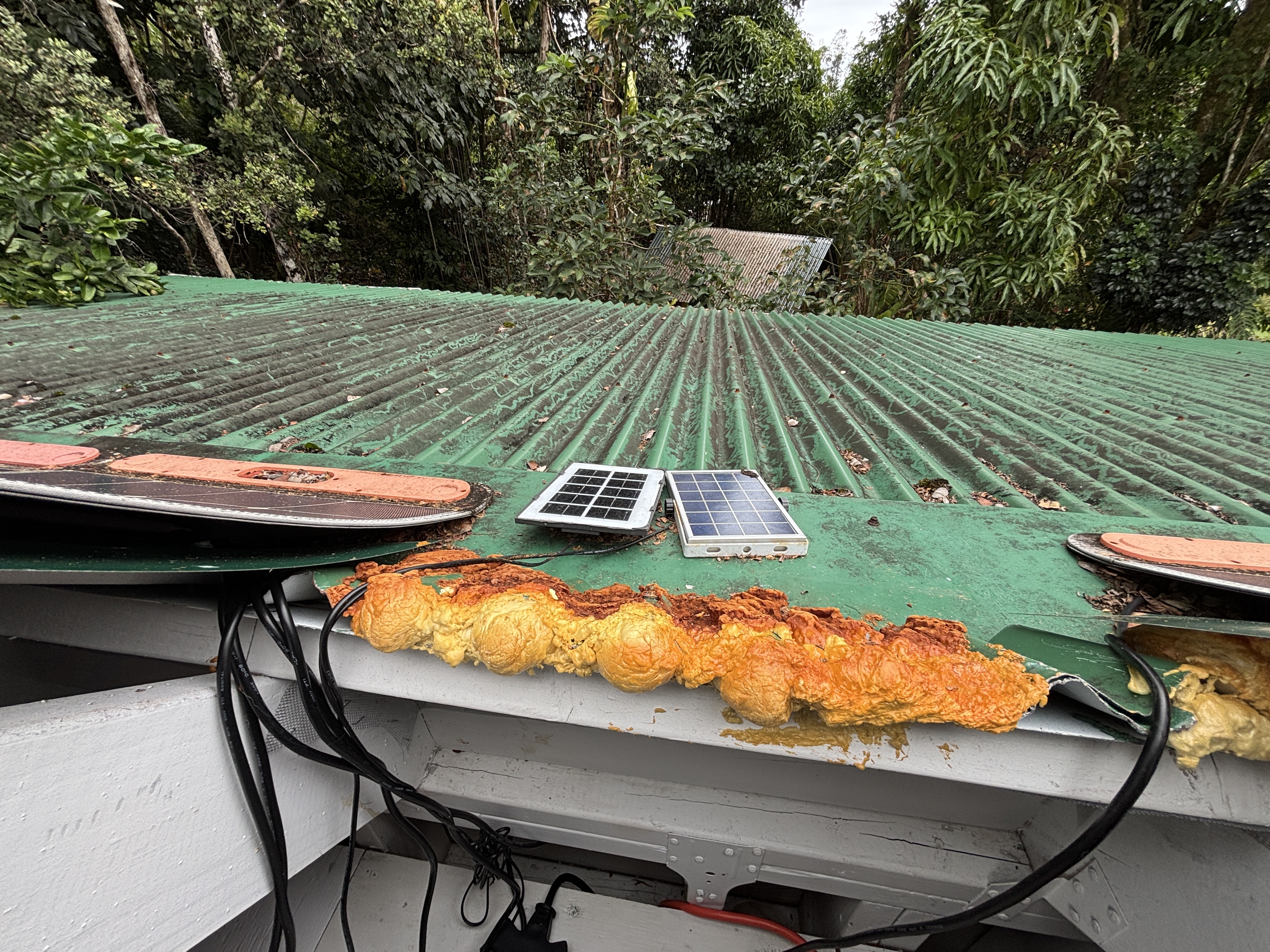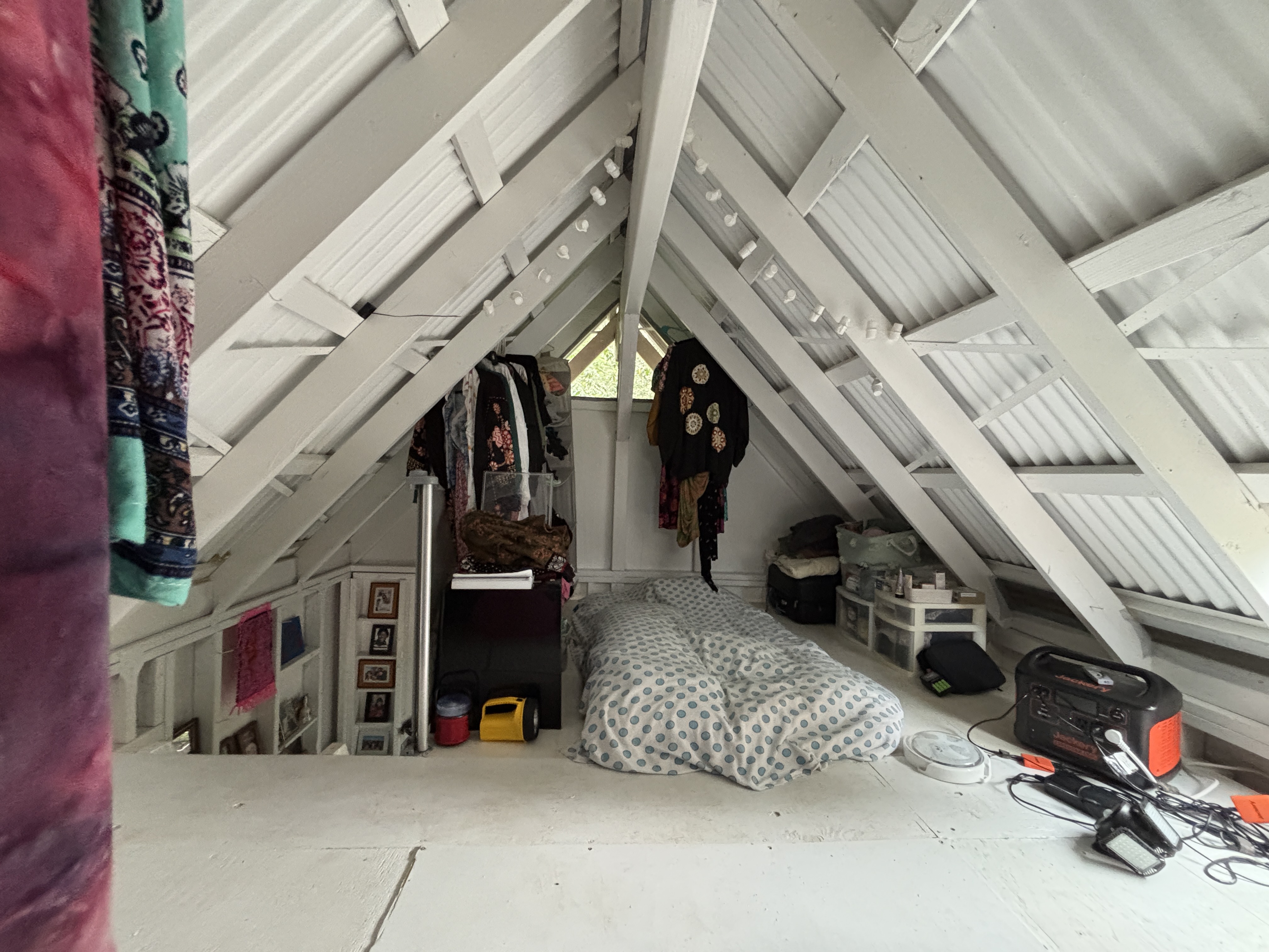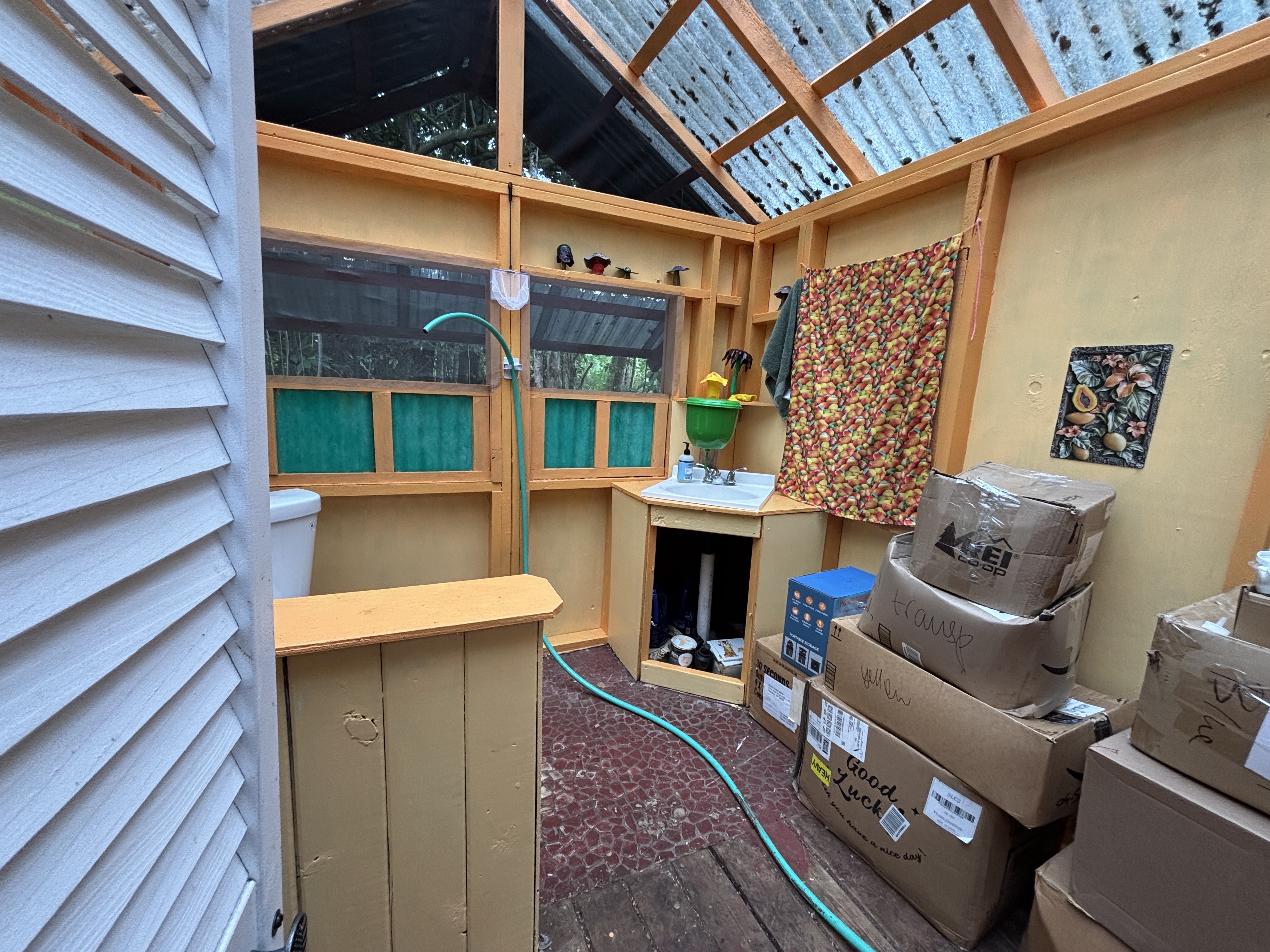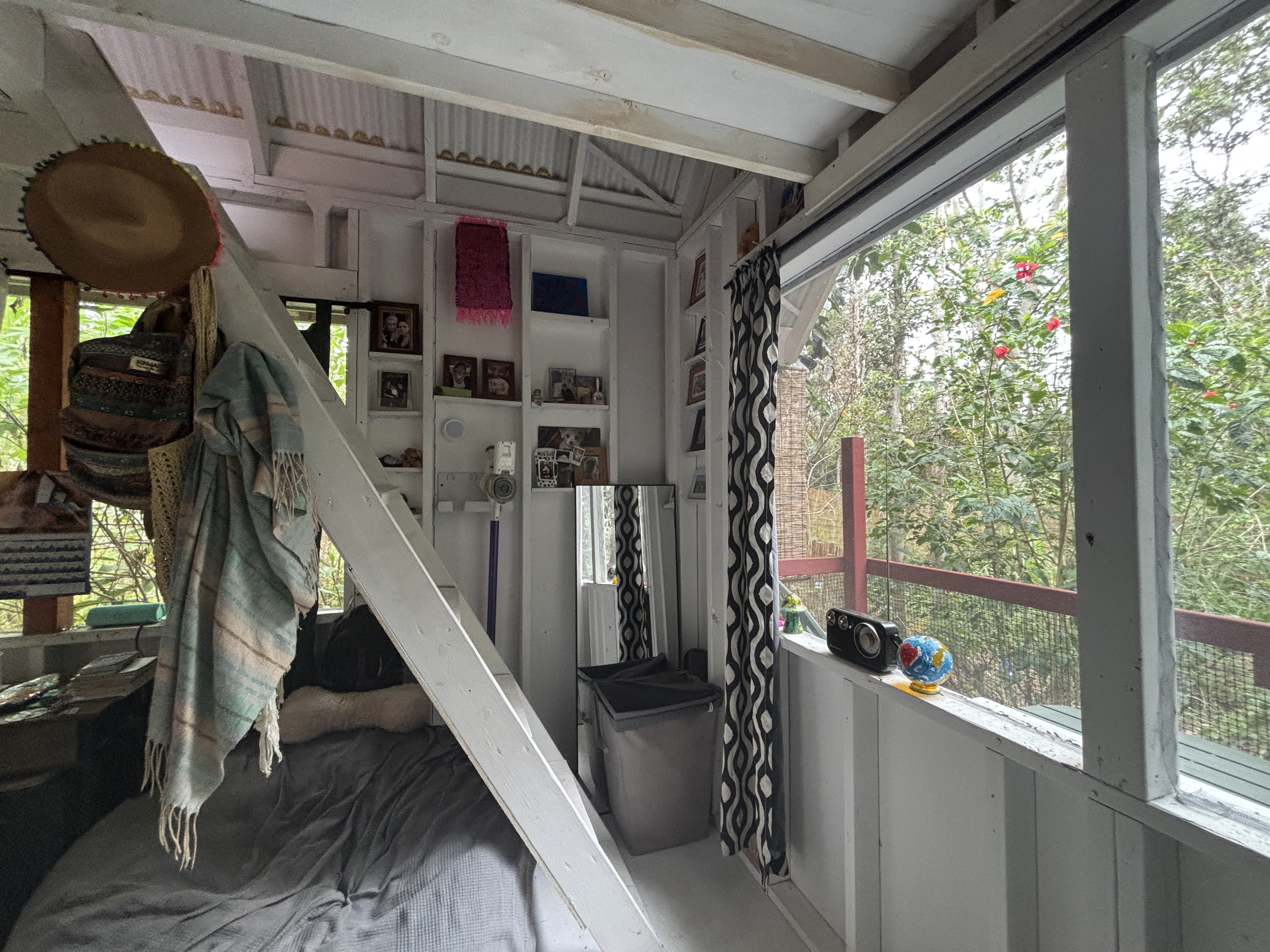 The cabin sits on post and pier with no indoor plumbing. Two poly water tanks supply water. The front lanai features outdoor propane burners, an on-demand water heater for the shower, and a composting toilet. Inside, the first floor offers spacious living with screened windows, while the second floor provides a cozy sleeping area with solar system access–perfect for star gazing.