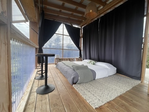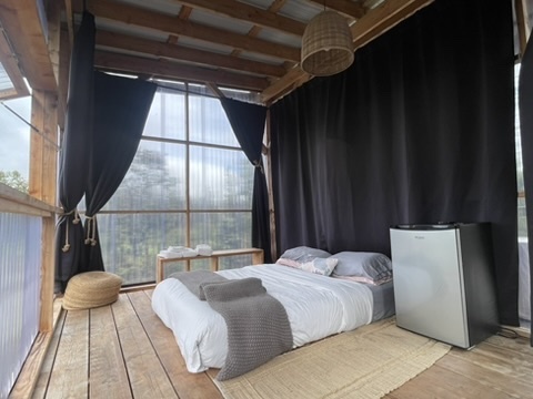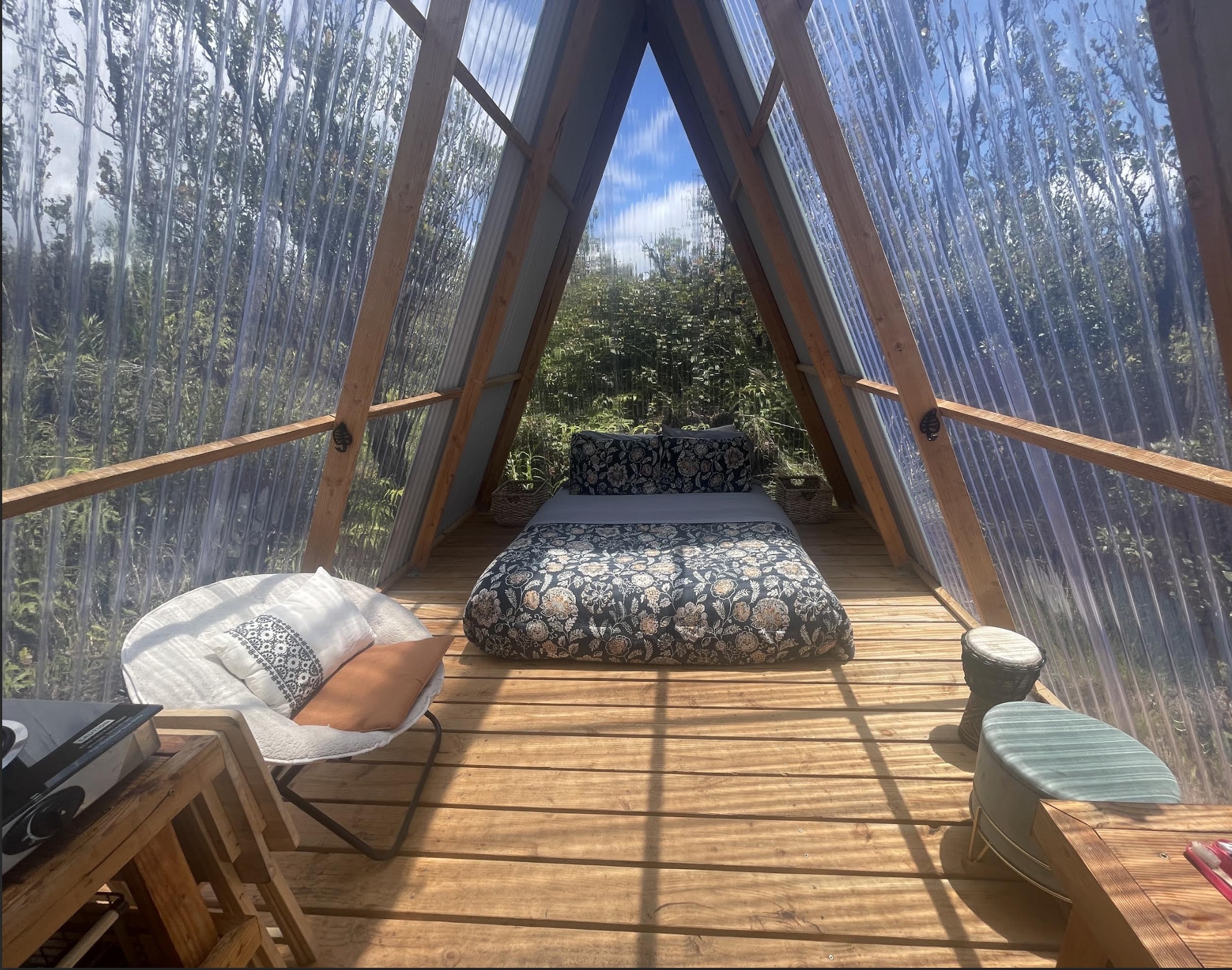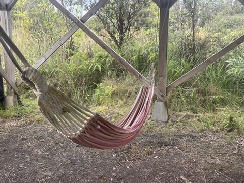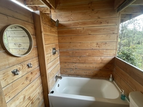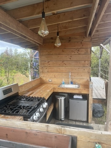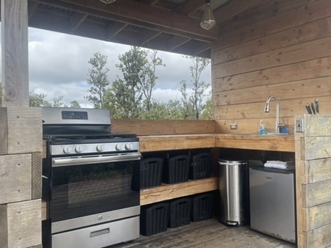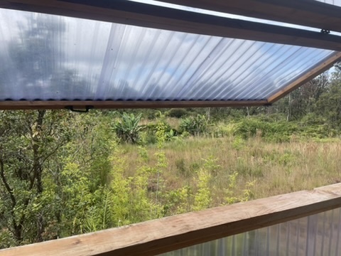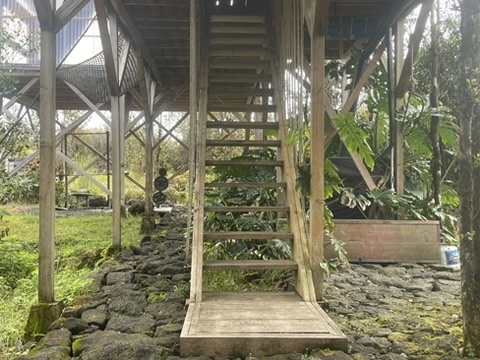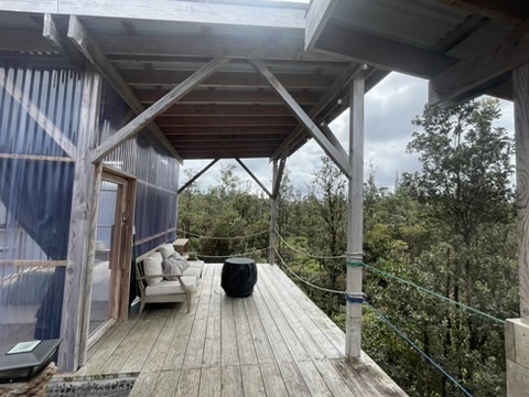 Tropical Treehouse Retreat in the Rainforest. 2 Bedroom 1 Bathroom home is elevated off the ground into the Ohia trees. Very private location with no visible neighbors. Bathroom features a spa like indoor/outdoor tub. Chef's kitchen in the trees! Bedrooms are located at opposite ends of the structure giving privacy. Access the treehouse through a winding landscaped path through the rain forest. Two Covered lanais on the upper level and covered lower level add outdoor living space. From the treehouse follow another winding trail to the separate studio cabin, nestled in it's own private grove of Ohia. Enjoy the bird's song and exceptional star viewing. Completely off grid and self- sufficient with solar power 3x400w panels + 3 LiFePo4 Batteries, rain water catchment, and flushing vermi-composting toilet, a zero maintenance system. Property was mindfully cleared preserving the natural rainforest and many edible plantings interspersed including Avocado, Ulu (breadfruit), Citrus, Bananas and more. Two full acres off a paved road, 30 minutes to hiking and adventuring at Hawaii Volcano National Park and 35 minutes to beaches, shopping and dining in Hilo. The nearby town of Mountain View offers several dining options as well.