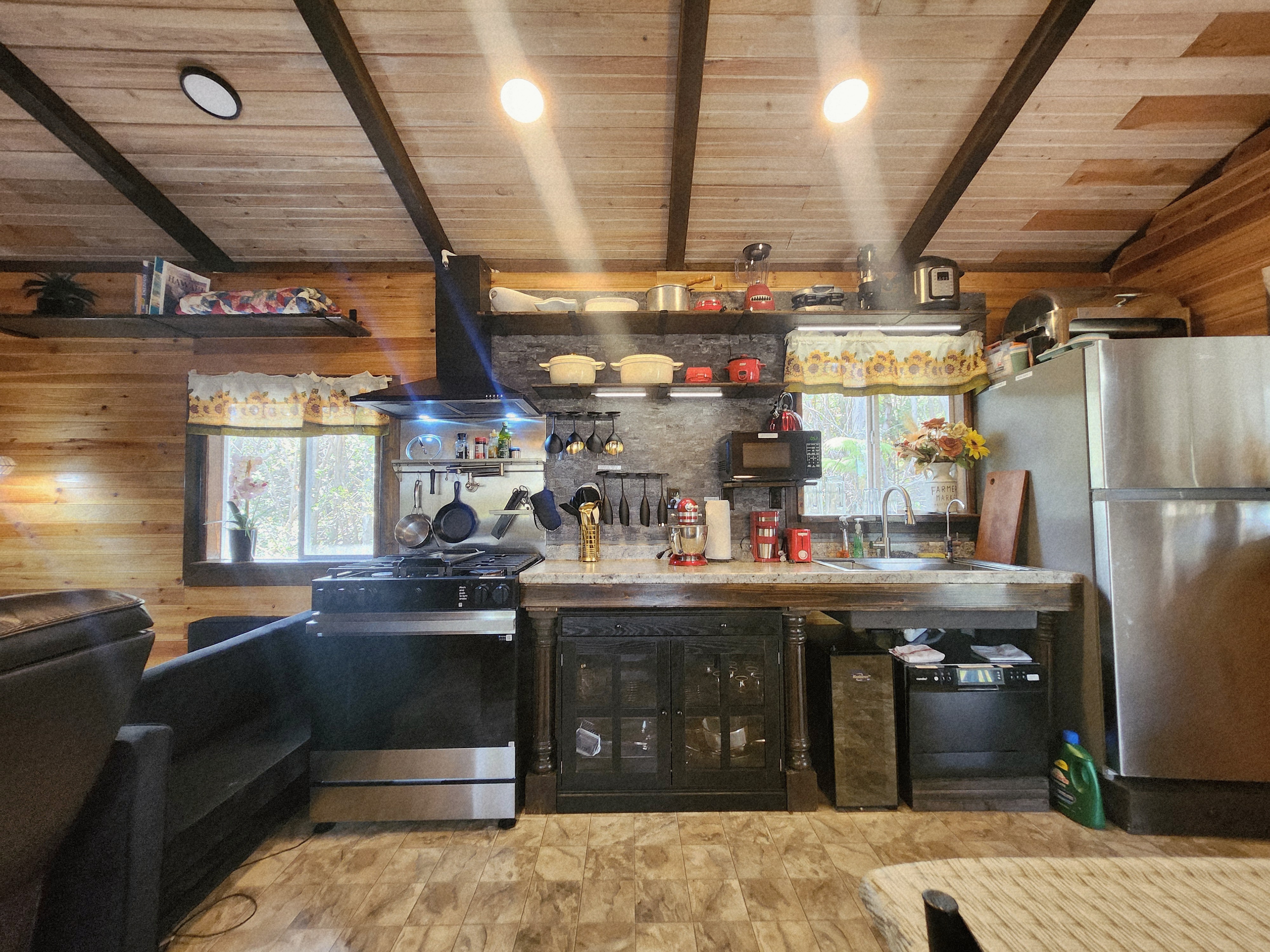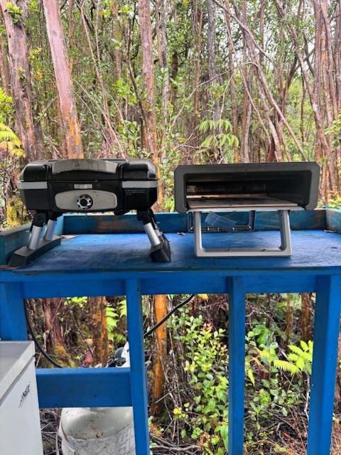 Welcome to your luxury off-grid retreat!!! This upgraded cabin offers a peaceful escape surrounded by lush forest, complete with the modern comforts and systems you need to live independently. Set on a 12,000 square foot lot, the property includes a thoughtfully designed 500 square foot cabin with vaulted ceilings, offering a rare combination of self-sufficiency, safety, and comfort, built for uninterrupted living–rain or shine!! The subdivision features a well-maintained road and newer homes nearby, creating a peaceful setting where lush greenery, cool temperatures, and quiet living come together. Energy & Infrastructure ~ 12 solar panels (550W each) paired with an industrial-grade inverter 11kW lithium battery system - (Fully steel-encased for enhanced fire safety) ~10,000 cycles / 27-year expected life, only ~1.5 years old 500-volt high-voltage charging system Proven reliability–no power loss even during extended storms Starlink installed (fiber also available) for consistent internet during outages Utilities & Systems ~ Propane fireplace on thermostat (primary heat source, auto-cycling) Automatic fire-suppression systems over: Fireplace, Stove, Water Heater Cesspool 3,000-gallon bladder water tank Outdoor freezer on the lanai Interior Features ~ Full-size refrigerator with ice maker Full-size propane stove Dishwasher Shower plus clawfoot bathtub Warm cedar interior walls throughout Personal Property ~ Furnishings included Exclusions: reclining chair, wine cooler, and select cooking items (mixer, pans, knives) Ideal for ~ Buyers seeking off-grid reliability Full-time residence or retreat Low-dependency living