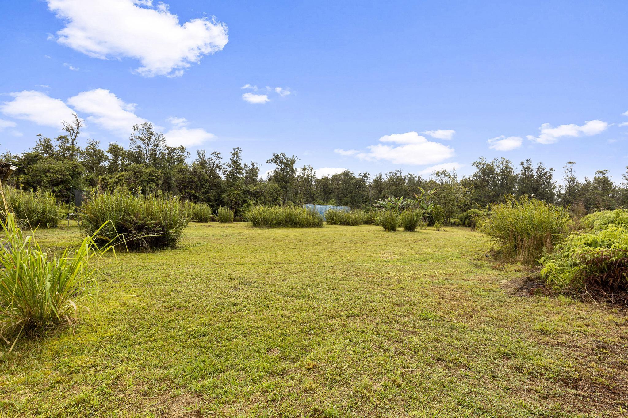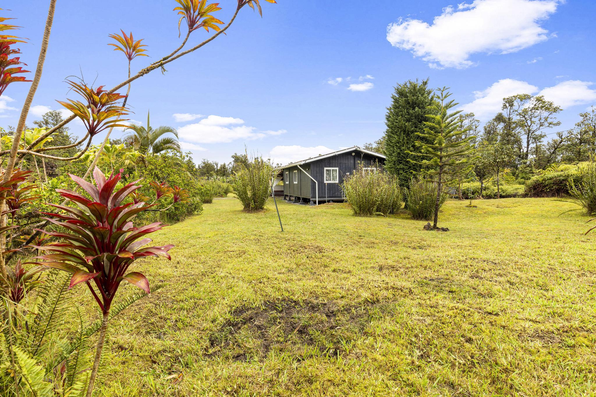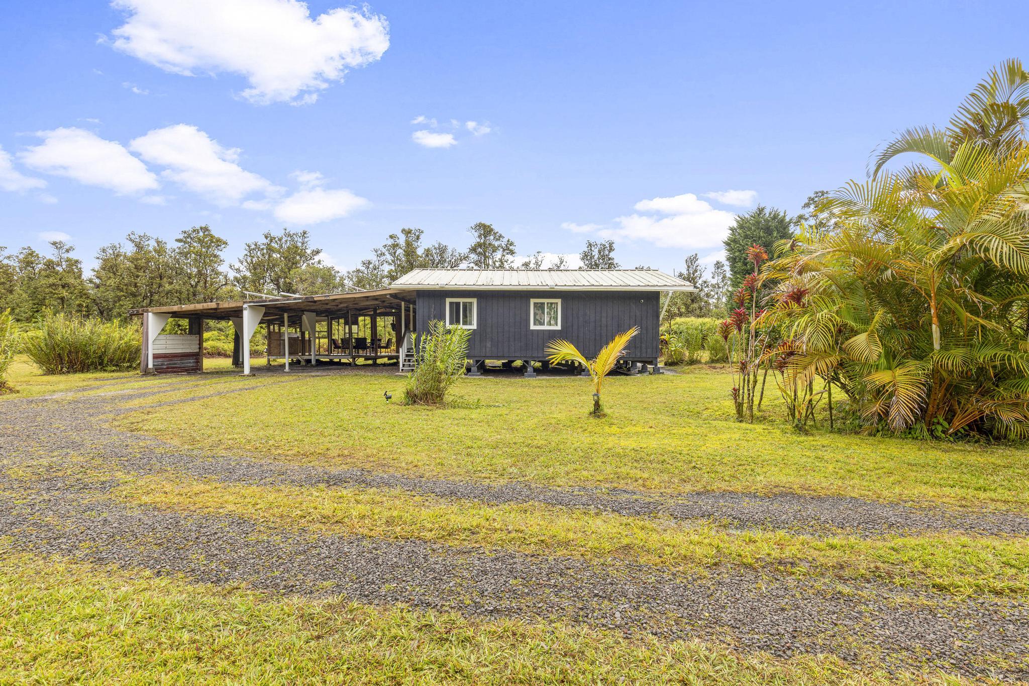 Once a blank canvas, this 2 bedroom, 1 bath off-grid home in Eden Roc Estates has been carefully reimagined into a welcoming retreat. Built for comfort and sustainability, the property features solar PV panels, a generator, and a newly installed catchment tank. Outdoor living is easy with an additional 450 sq ft of open lanai space and a 650+ sq ft covered carport, while a 40 foot storage container ensures plenty of room for organization. The property also comes with 2 brand new PV panels, ready for future connection, and the lush acre is home to an array of fruiting plants, including bananas, mangoes, avocado, lilikoi, and more. Sold as-is, this property is ready for you to make it your own!