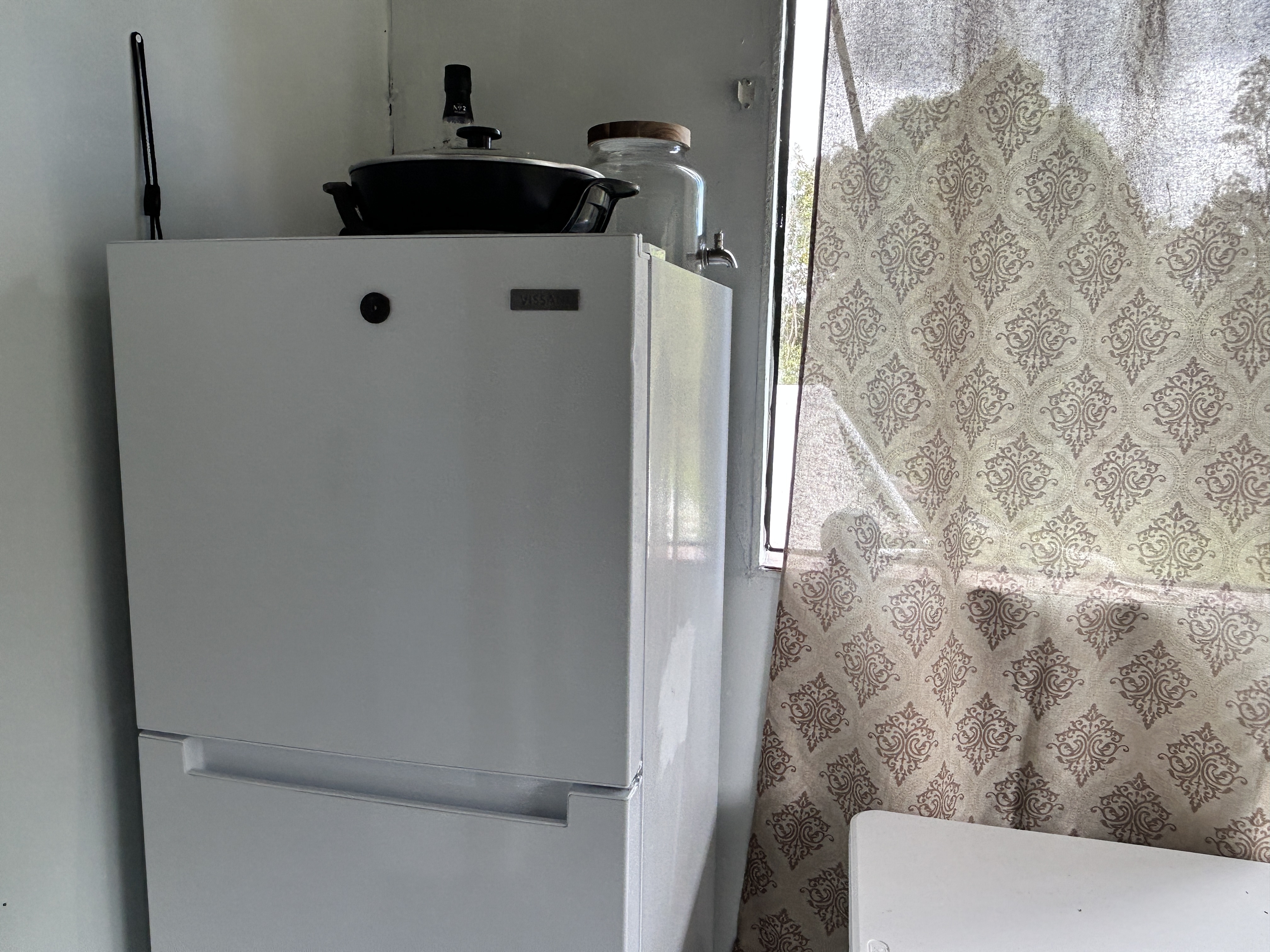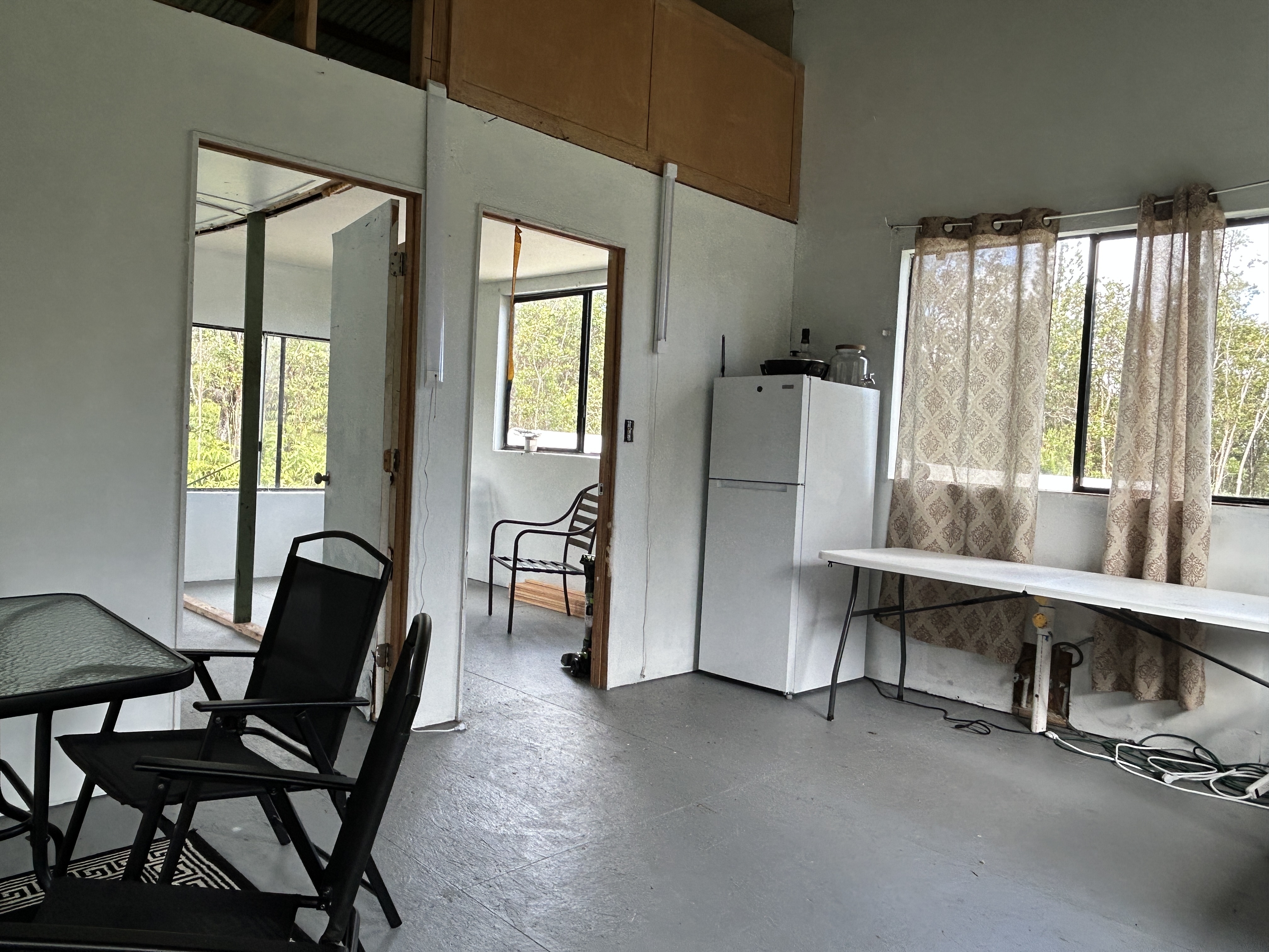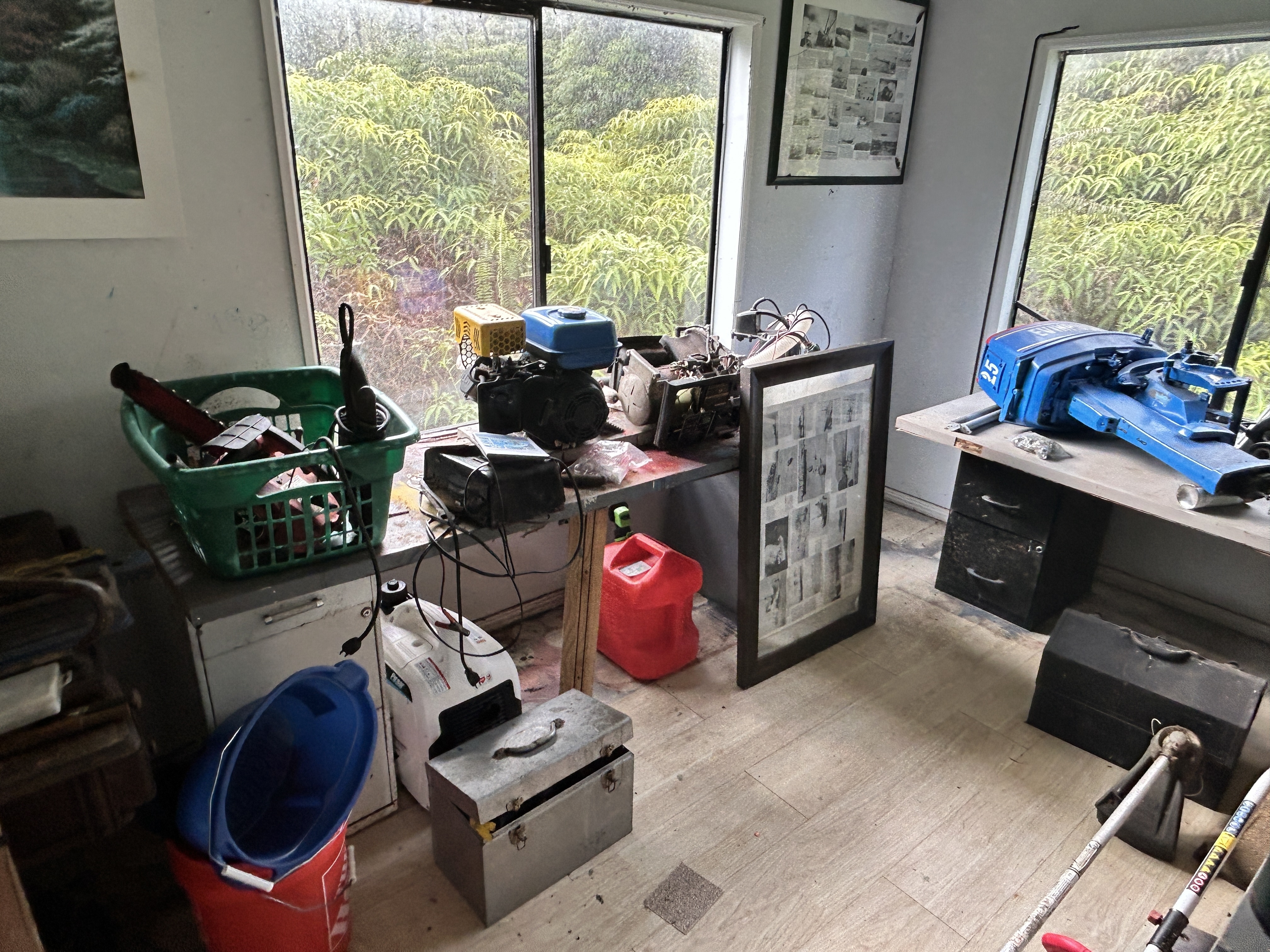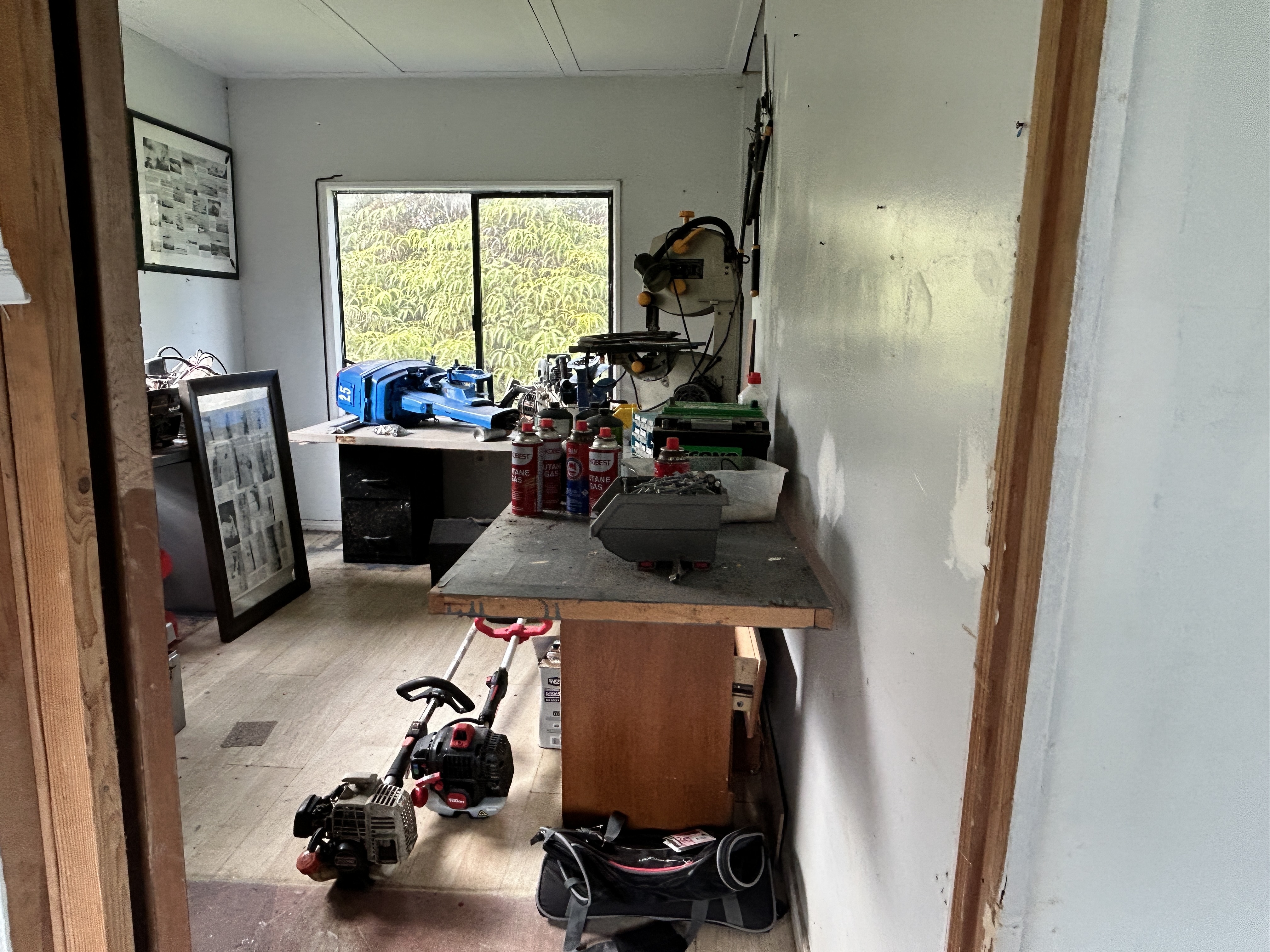 The structure itself offers a flexible layout ready for your personal touch. There’s space for a kitchenette, living room, small dining area, and a bedroom that can easily be divided into two. Included with the sale are the kitchen, small refrigerator, tables and chairs, and a large truck bed toolbox. Another bedroom was previously used as a workshop and still contains many tools and equipment, also included in the sale.