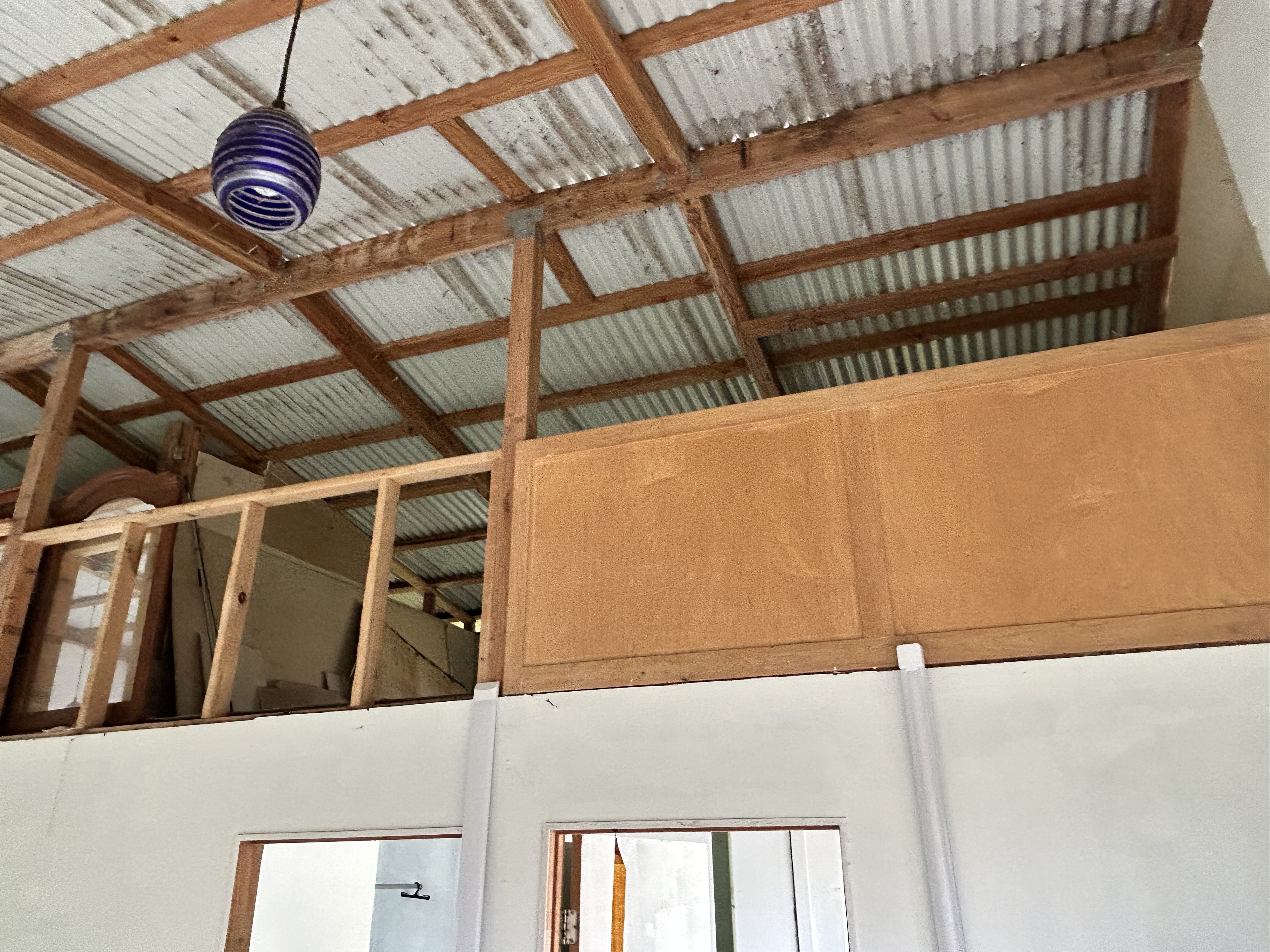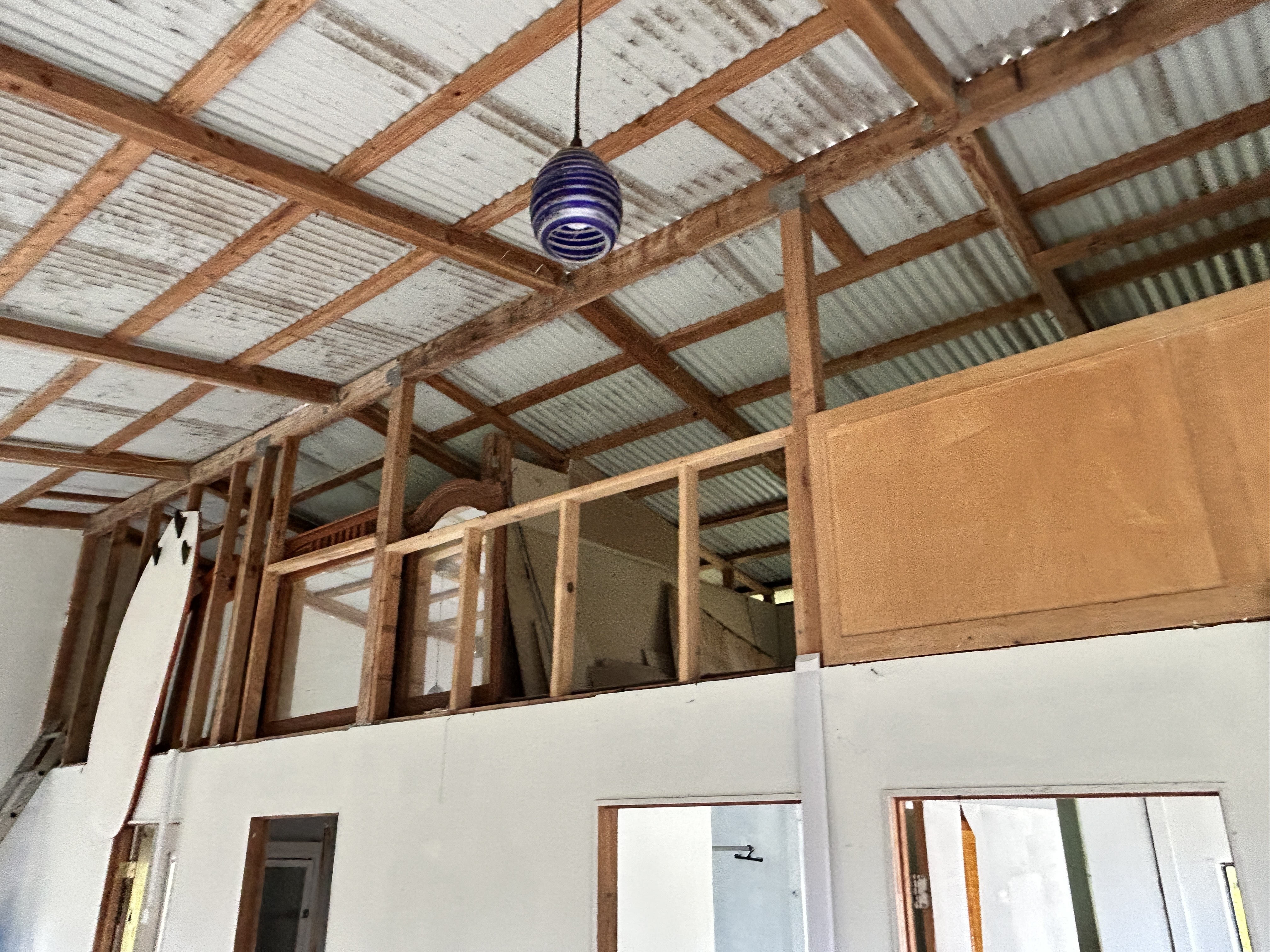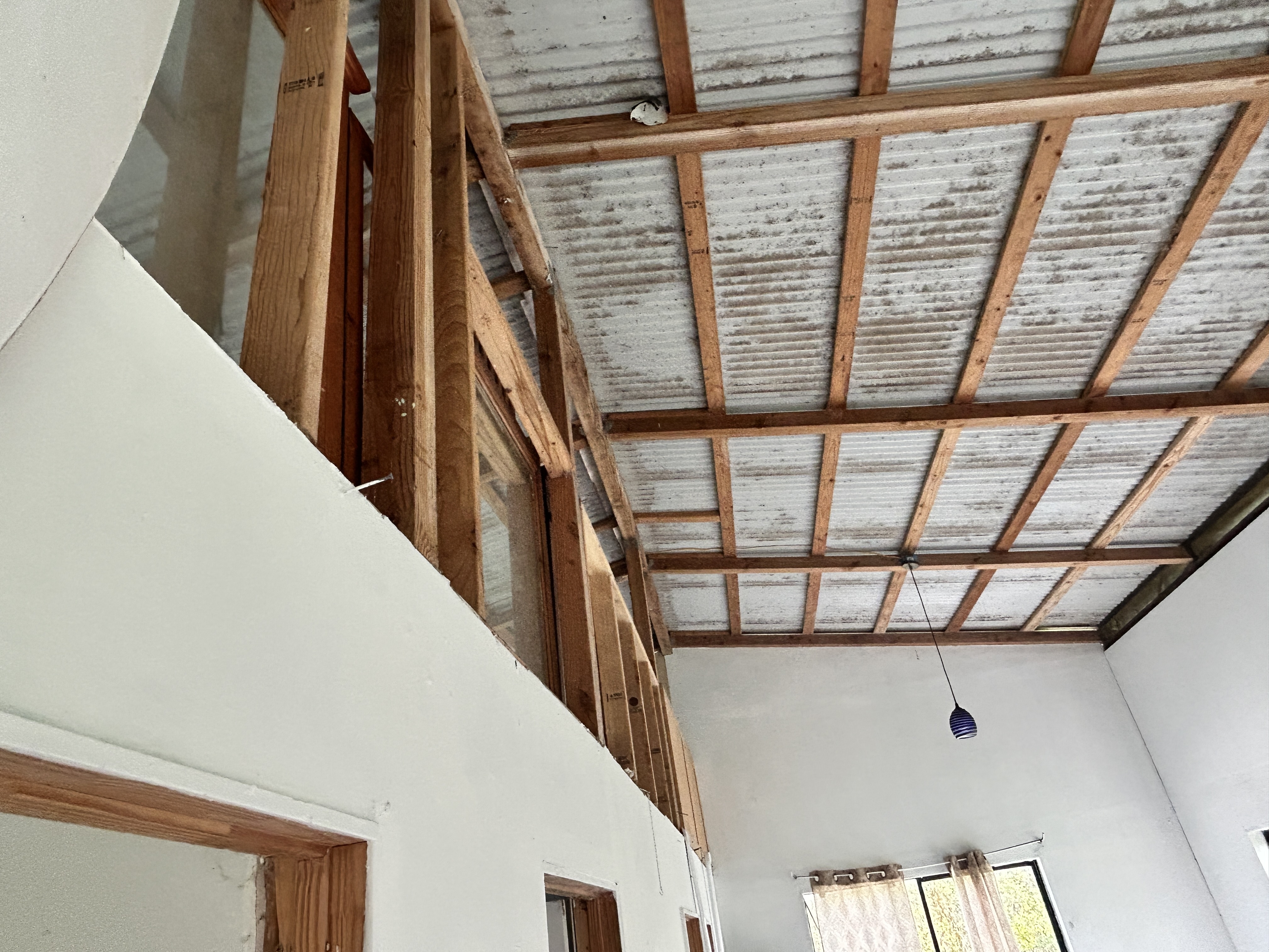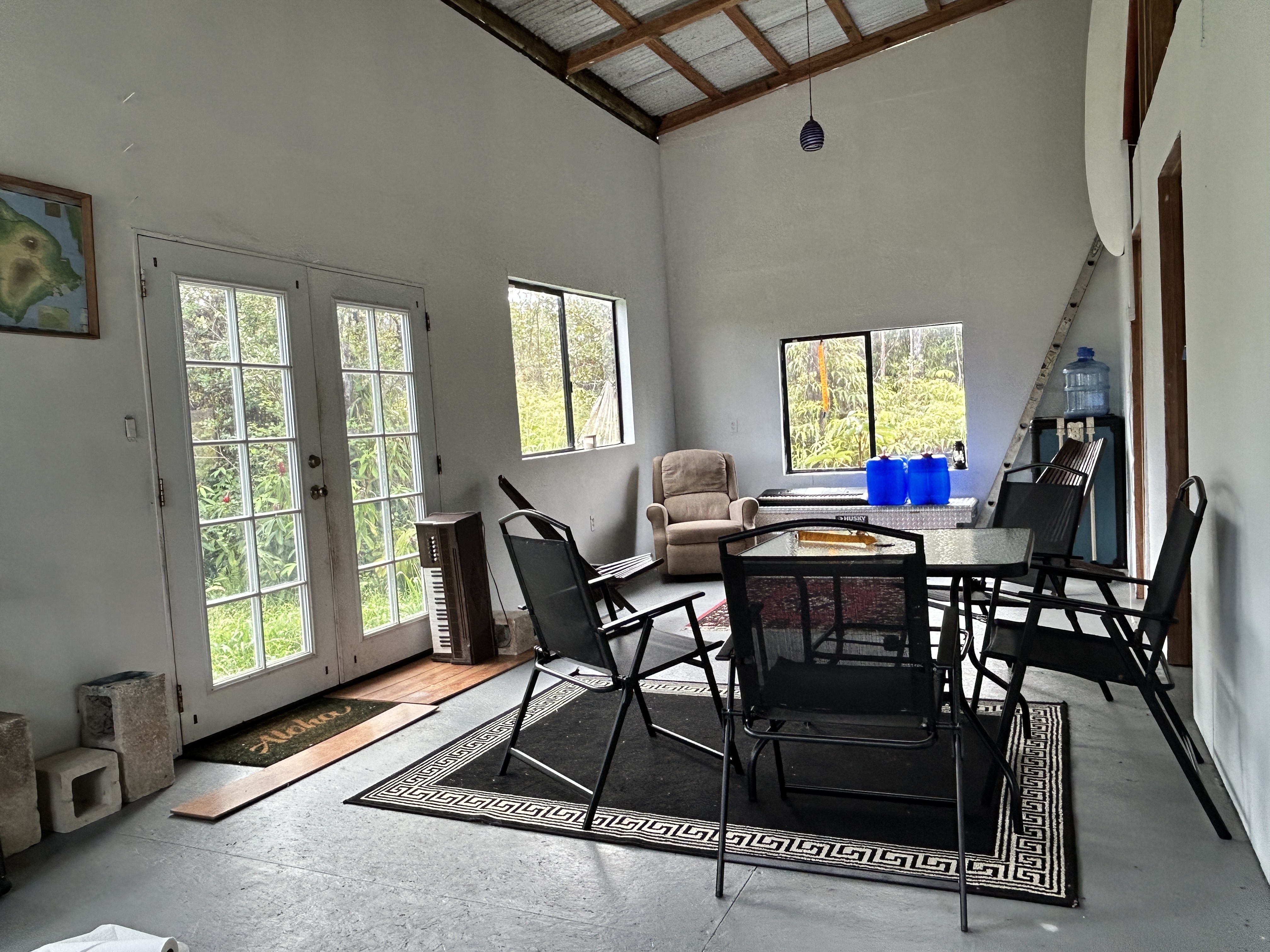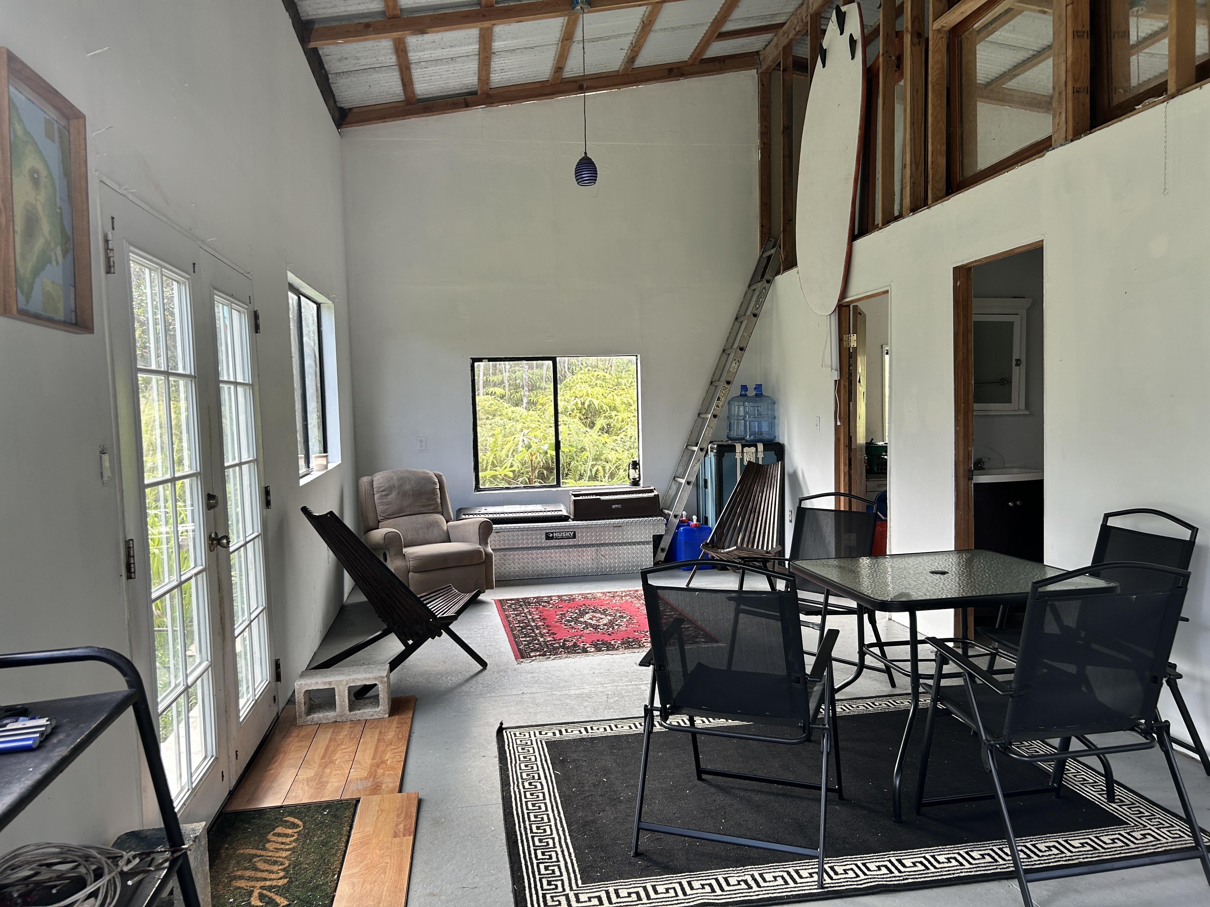 Inside, the structure has wiring, outlets, light switches, and a bathroom with shower, toilet, and sink. Super tall ceilings keep the interior cool, provide extra storage, and offer the potential to convert the upper area into additional living space.