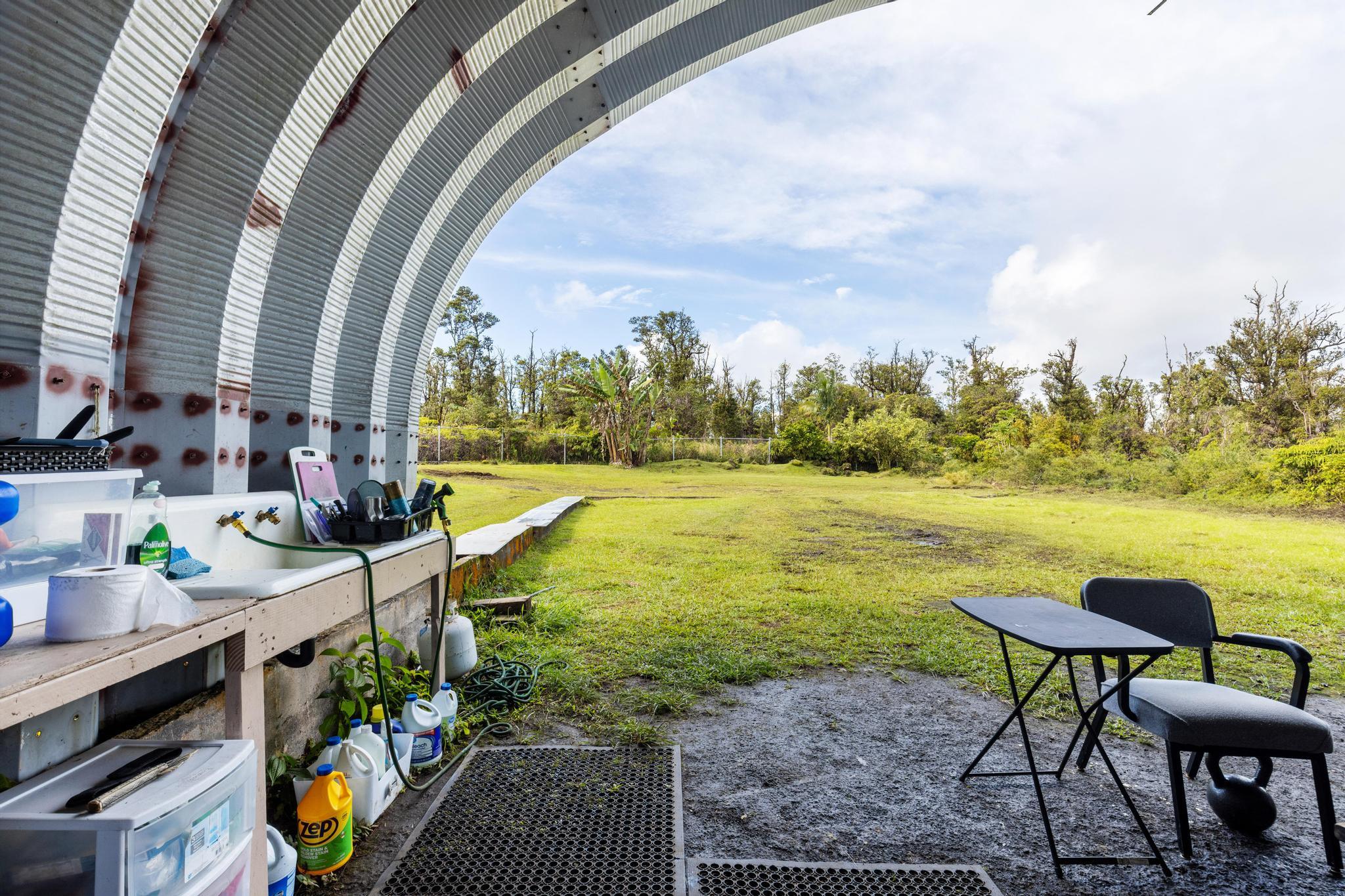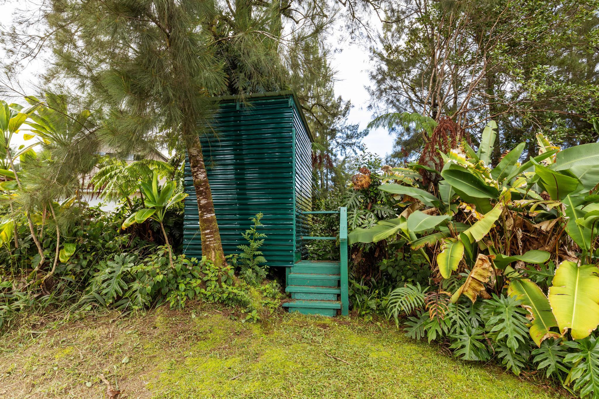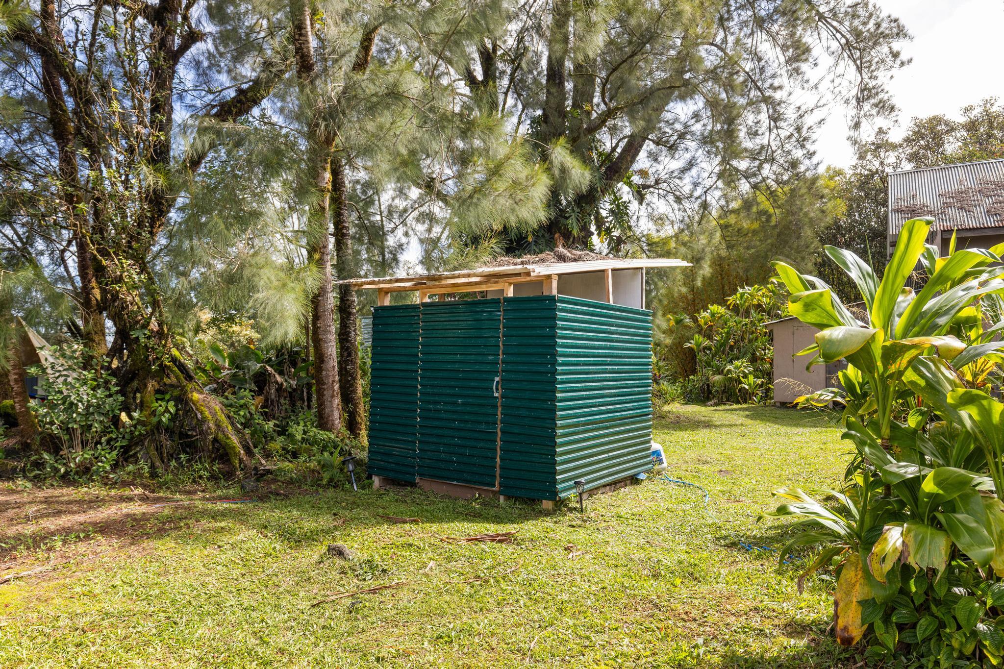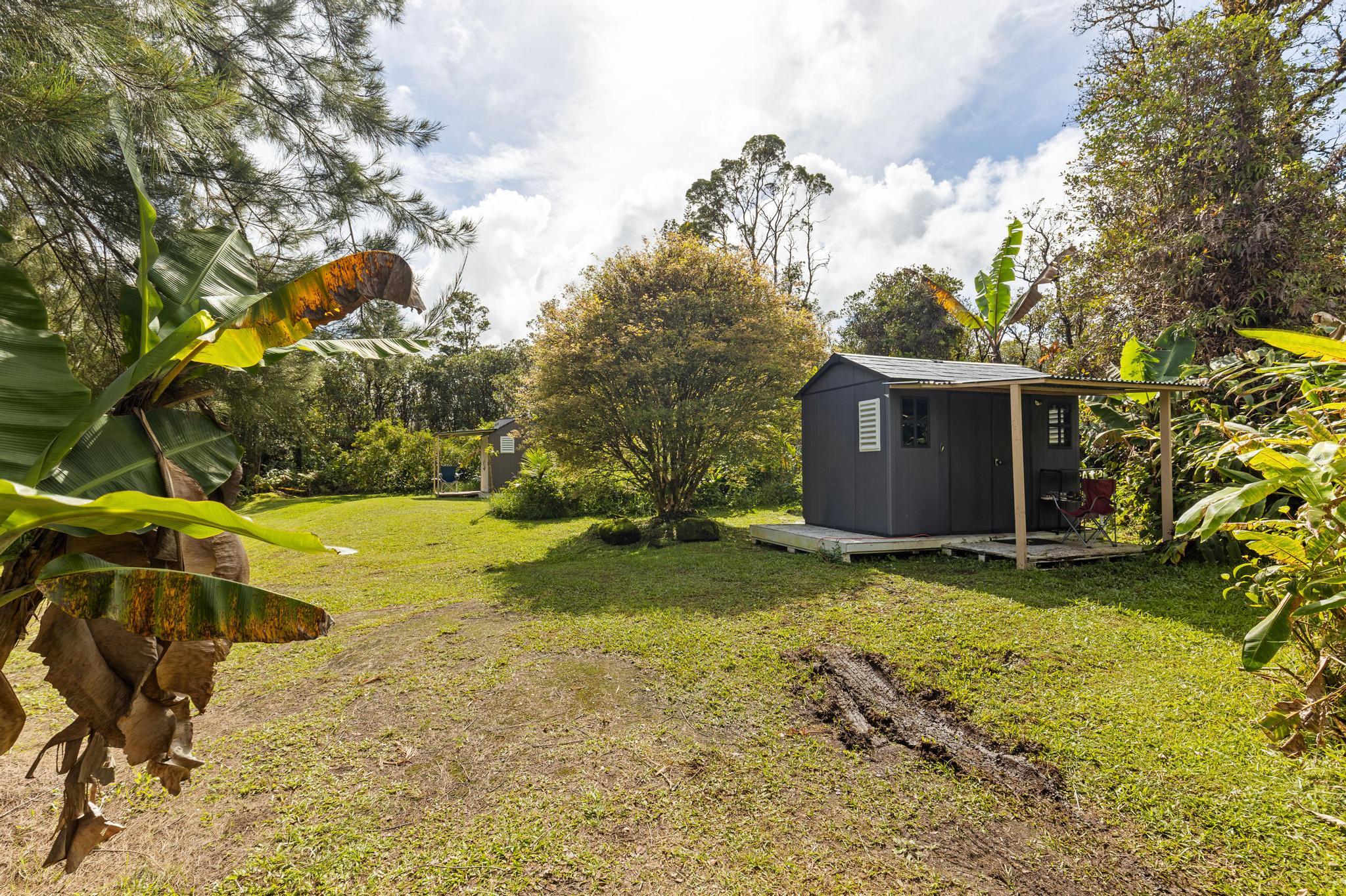 This East Hawai‘i property offers privacy, space, and a self-sufficient layout on an approximately square-shaped 2-acre parcel formed by consolidating two one-acre lots. The land is fenced with 2 Gates and features mature fruit trees, tropical plantings, and natural greenery. A natural tree buffer provides separation from the road. Underground power is in place and connects to an approximately 60-foot Quonset workshop. High-speed fiber internet is available. The main cabin includes two approx 500-gallon poly water catchment tanks, a full bathroom, propane on-demand hot water with a backup heater, one bedroom on the main level, and a loft-style bedroom upstairs. Three additional cabin sheds and 3 outdoor common bathroom setups are located on the property, along with an additional larger water catchment tank. An outdoor kitchenette is positioned in the Quonset hut as a shared common area for the cabin sheds. The landscaping includes a wide variety of producing fruit trees and ornamentals, such as bananas, star apple, ice cream bean, allspice, mountain apple, avocados, jaboticaba, tangerines, Tahitian lime, Meyer lemon, oranges, guava, coffee, Surinam cherry, Brazilian cherry, palms, anthuriums, torch ginger, heliconia, and more. This property offers a private setting with multiple structures, mature plantings, and the convenience of available high-speed internet. 11-1860 Mahina St, Mountain View HI 96771 ~ MLS 725924