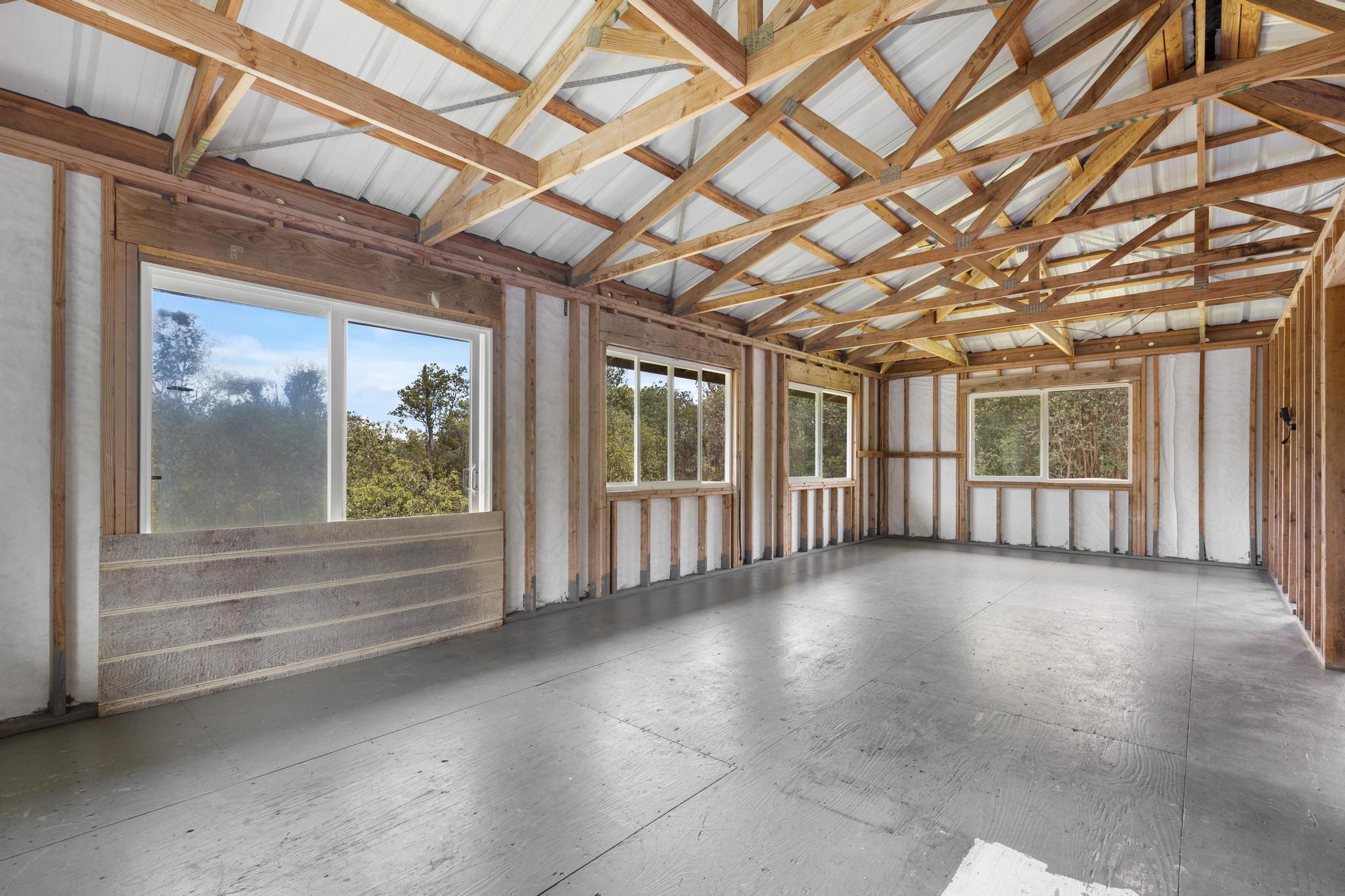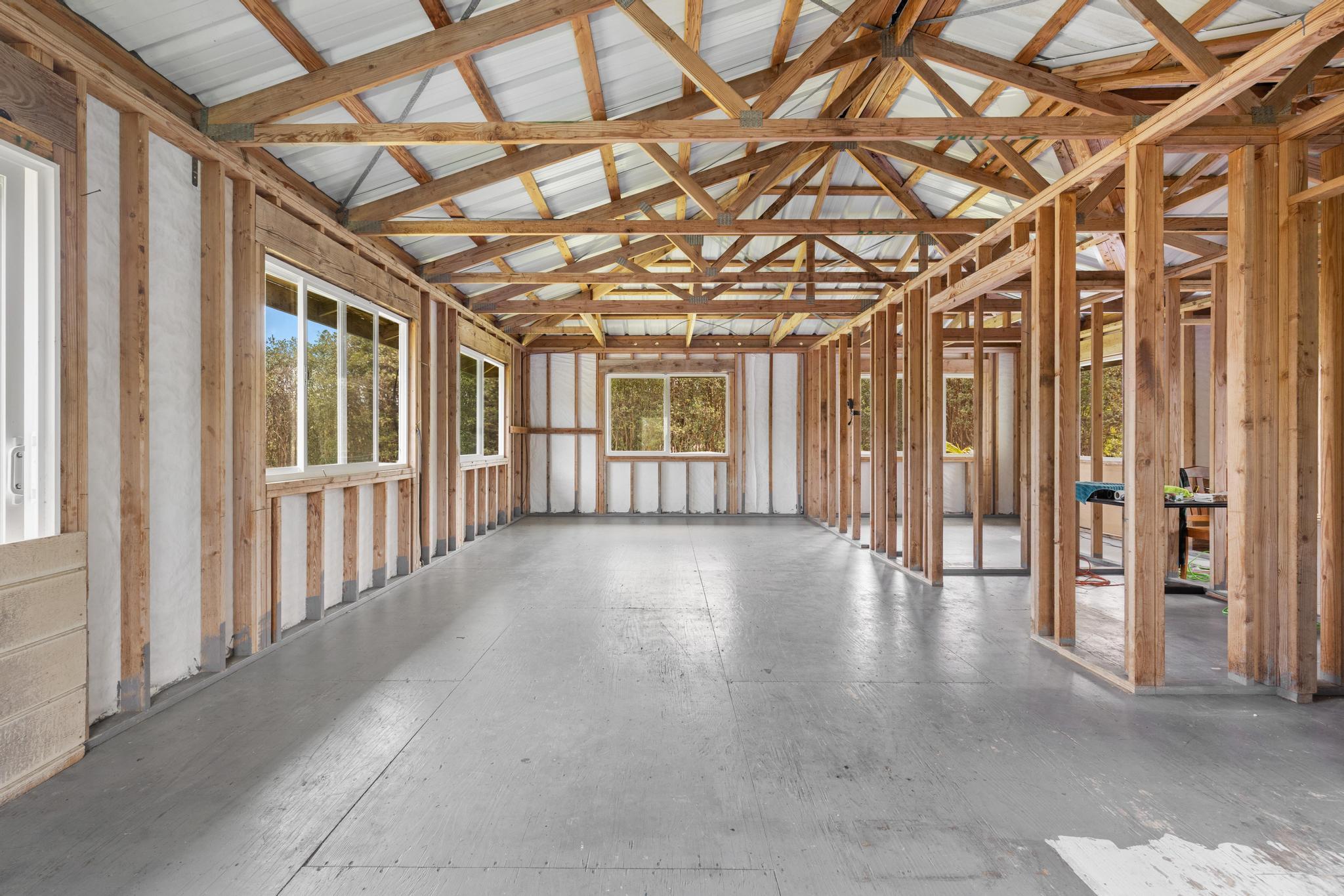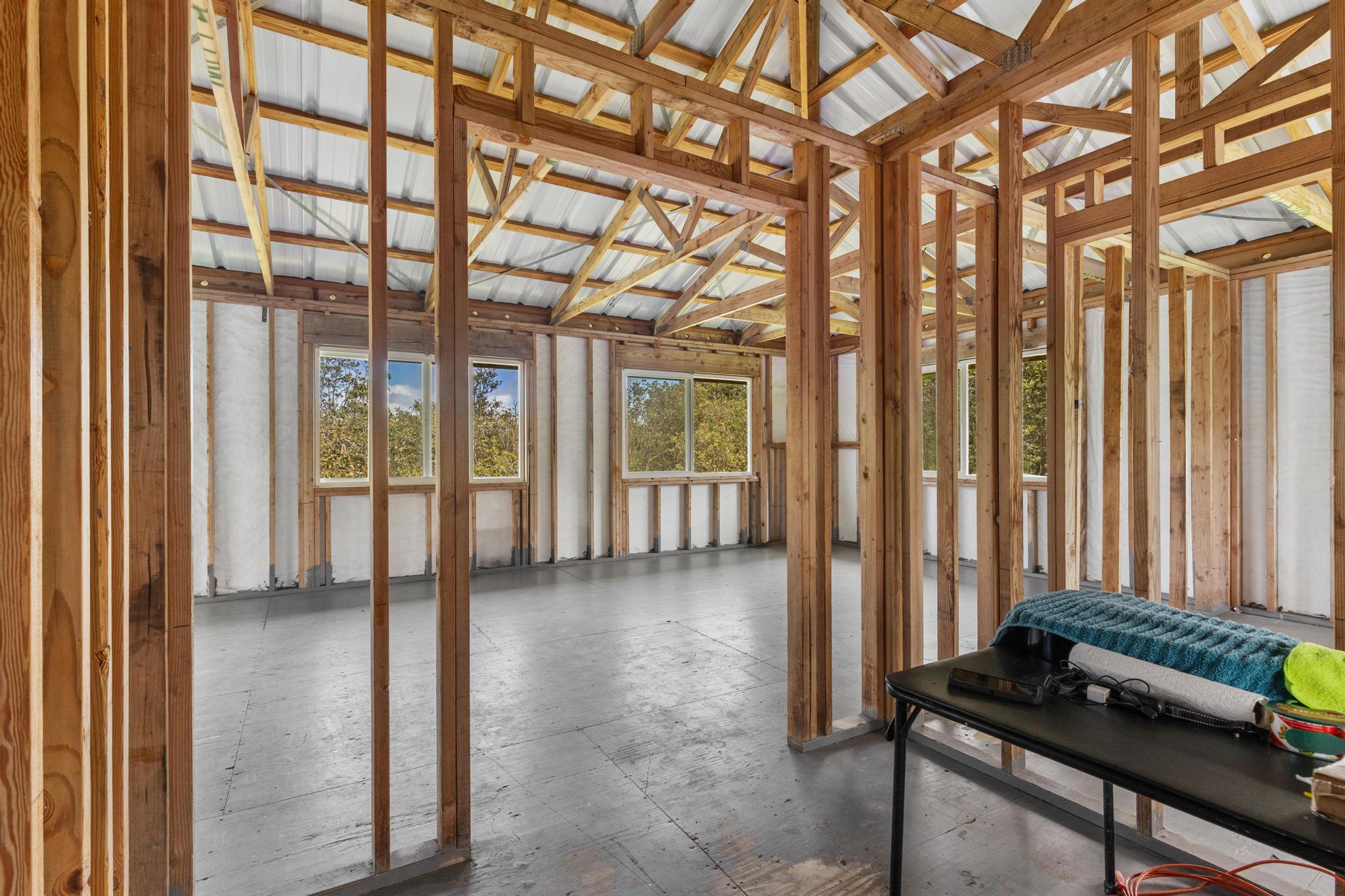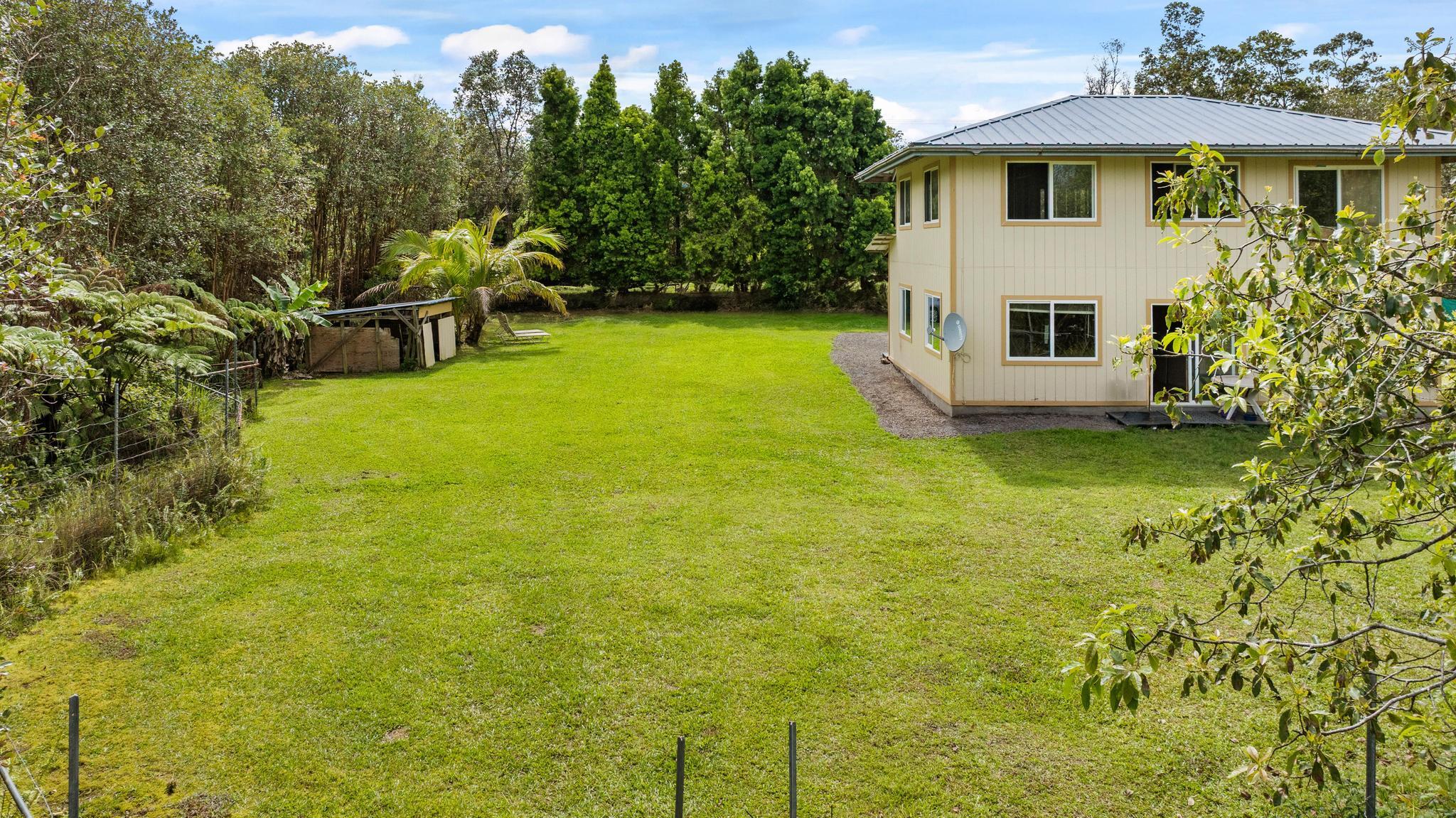 Opportunity awaits with this diamond in the rough located on paved Ohia Avenue in the Eden Roc Estates subdivision. The property features a cleared and fully fenced grassy yard with a front gate, creating a private and pet friendly space perfect for enjoying the outdoors. Construction was previously started with permits that expired in 2022. Existing plans are available and the new owner will need to obtain updated permits through the County to continue the project. The home is connected to HELCO electric, through the interiors electrical wiring has not yet been installed. The lower level includes a functioning bathroom laundry area and kitchen area, with drain lines already installed in the concrete floor. This level offers an additional 832 square feet of unfinished living space ready for customization. The second floor is currently framed with open studs, offering a blank canvas to finish the space as designed or modify the layout to suit your vision. Two sliding doors open from the large upstairs room, planned for access to a future wrap around lanai. With its fenced yard, spacious layout potential and available plans for completion, this property presents a unique opportunity to finish and personalize a home in a peaceful setting. Plans for the completed project will be provided to the new owner.