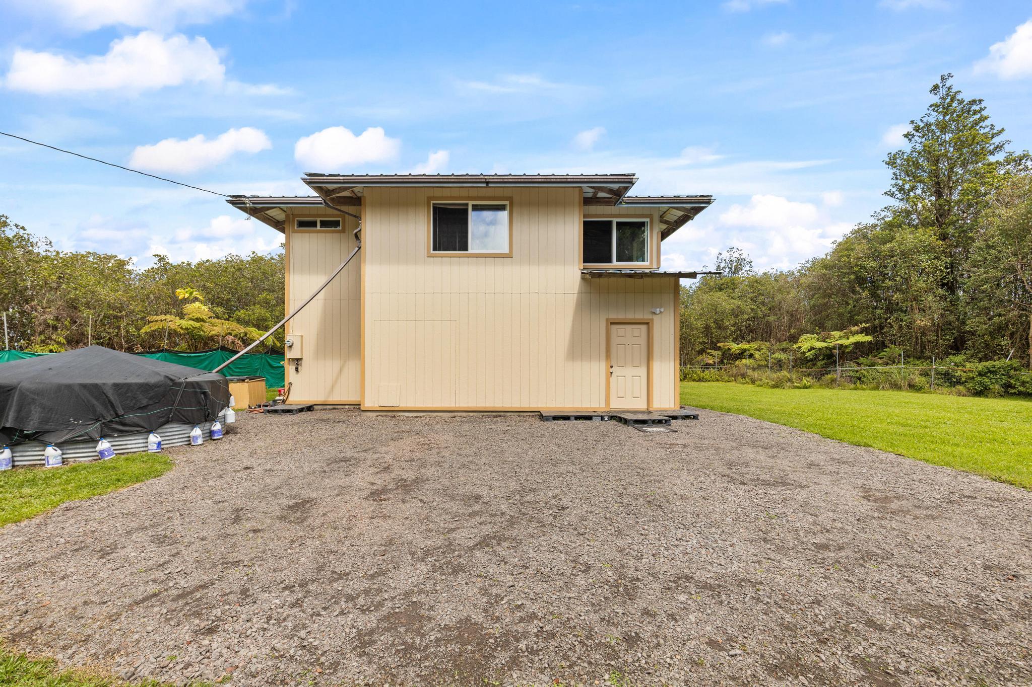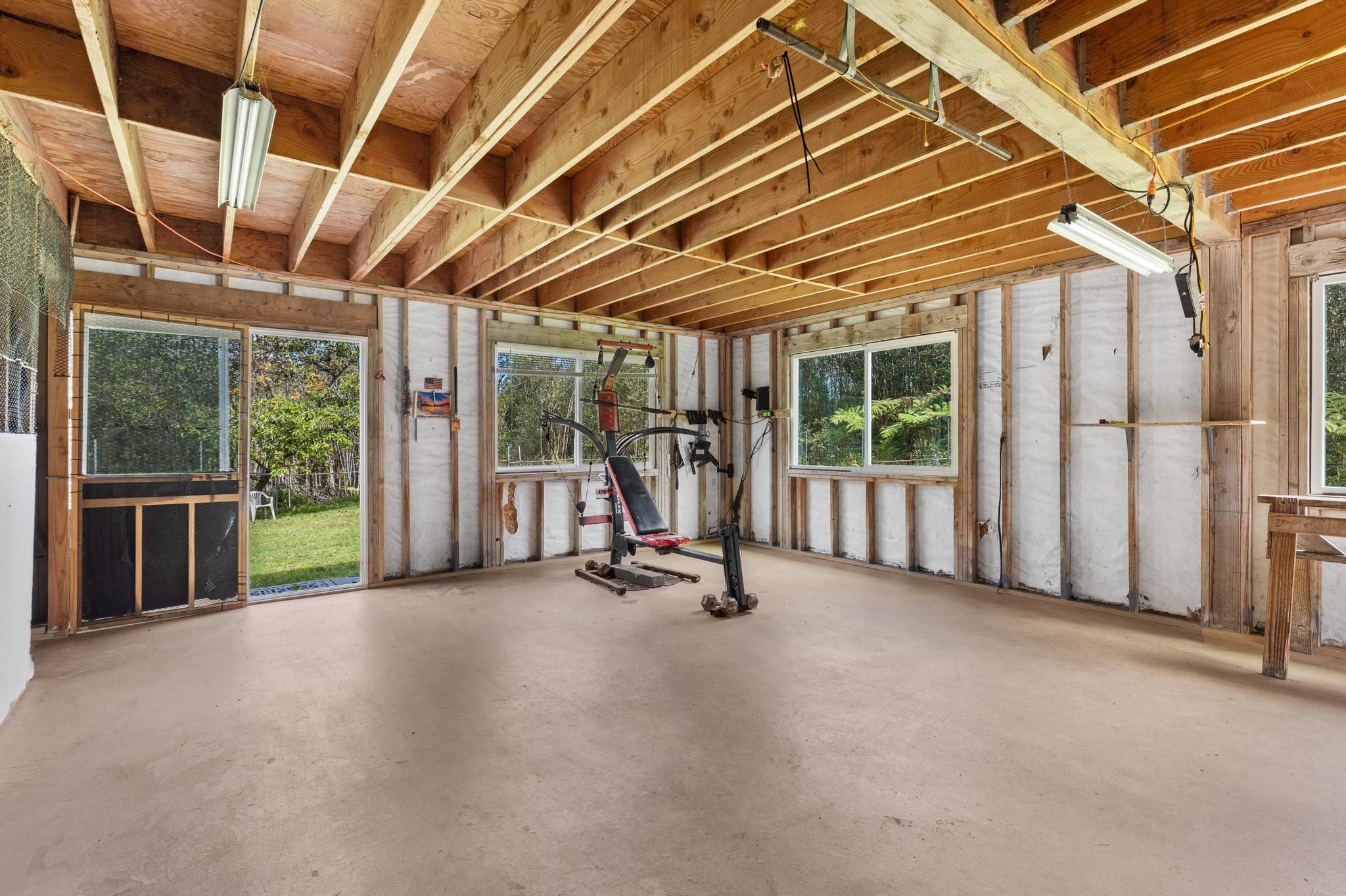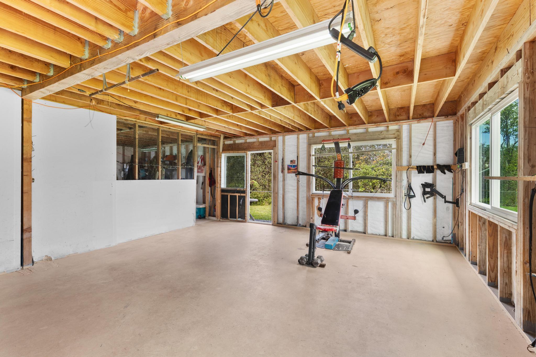 Opportunity awaits with this diamond in the rough located on paved Ohia Avenue in the Eden Roc Estates subdivision. The property features a cleared and fully fenced grassy yard with a front gate, creating a private and pet friendly space perfect for enjoying the outdoors. Construction was previously started with permits that expired in 2022. Existing plans are available and the new owner will need to obtain updated permits through the County to continue the project. The home is connected to HELCO electric, through the interiors electrical wiring has not yet been installed. The lower level includes a functioning bathroom laundry area and kitchen area, with drain lines already installed in the concrete floor. This level offers an additional 832 square feet of unfinished living space ready for customization. The second floor is currently framed with open studs, offering a blank canvas to finish the space as designed or modify the layout to suit your vision. Two sliding doors open from the large upstairs room, planned for access to a future wrap around lanai. With its fenced yard, spacious layout potential and available plans for completion, this property presents a unique opportunity to finish and personalize a home in a peaceful setting. Plans for the completed project will be provided to the new owner.