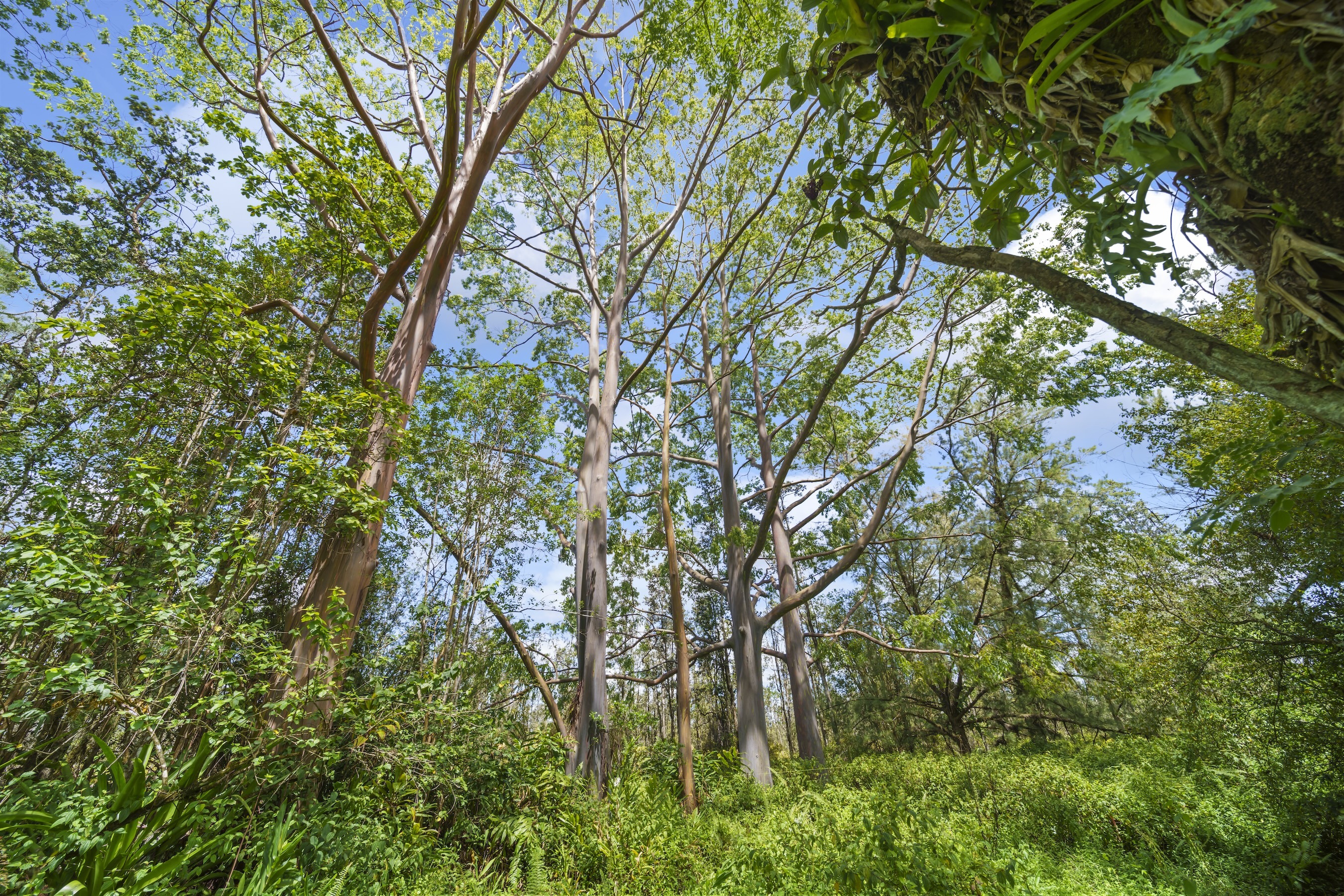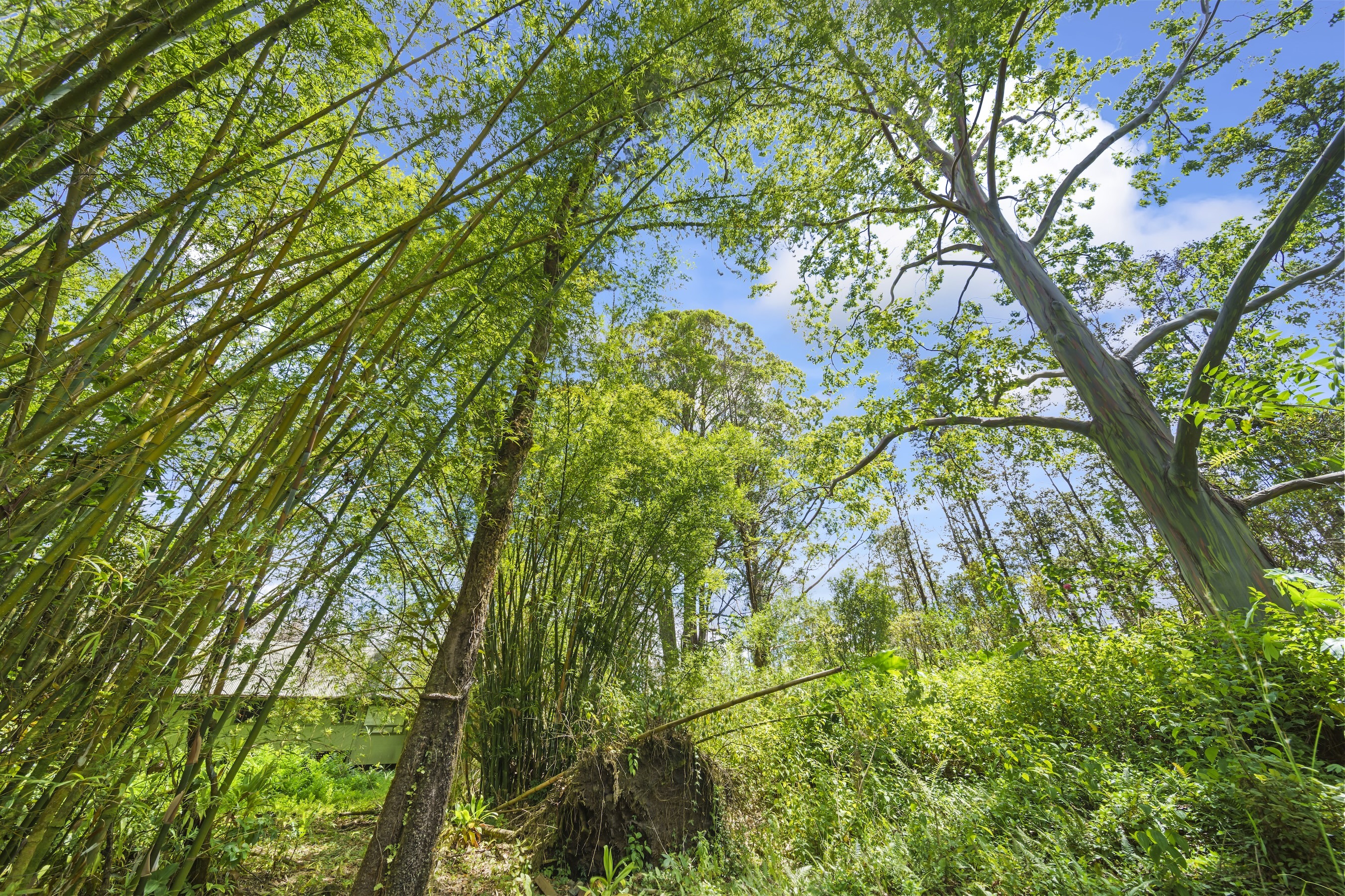 Towering rainbow eucalyptus, bamboo, and other mature trees are sprinkled throughout the land, enhancing the sense of seclusion and natural beauty.