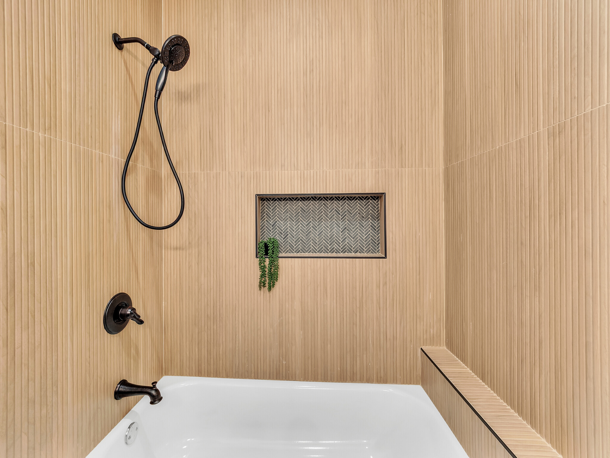 Beautiful entertainment built in, showcases the electric fireplace, space for wall mounted TV and hardwood shelving.