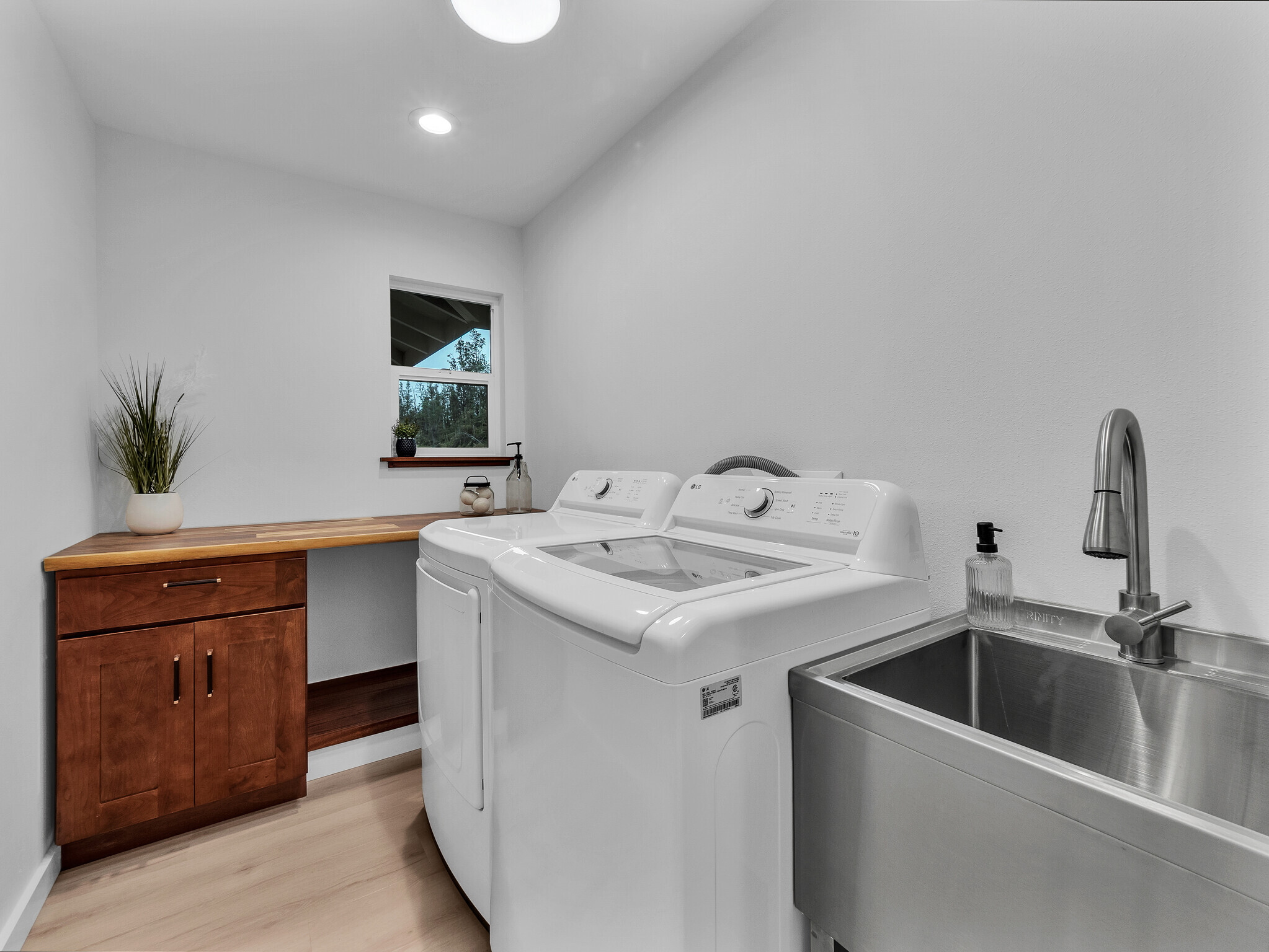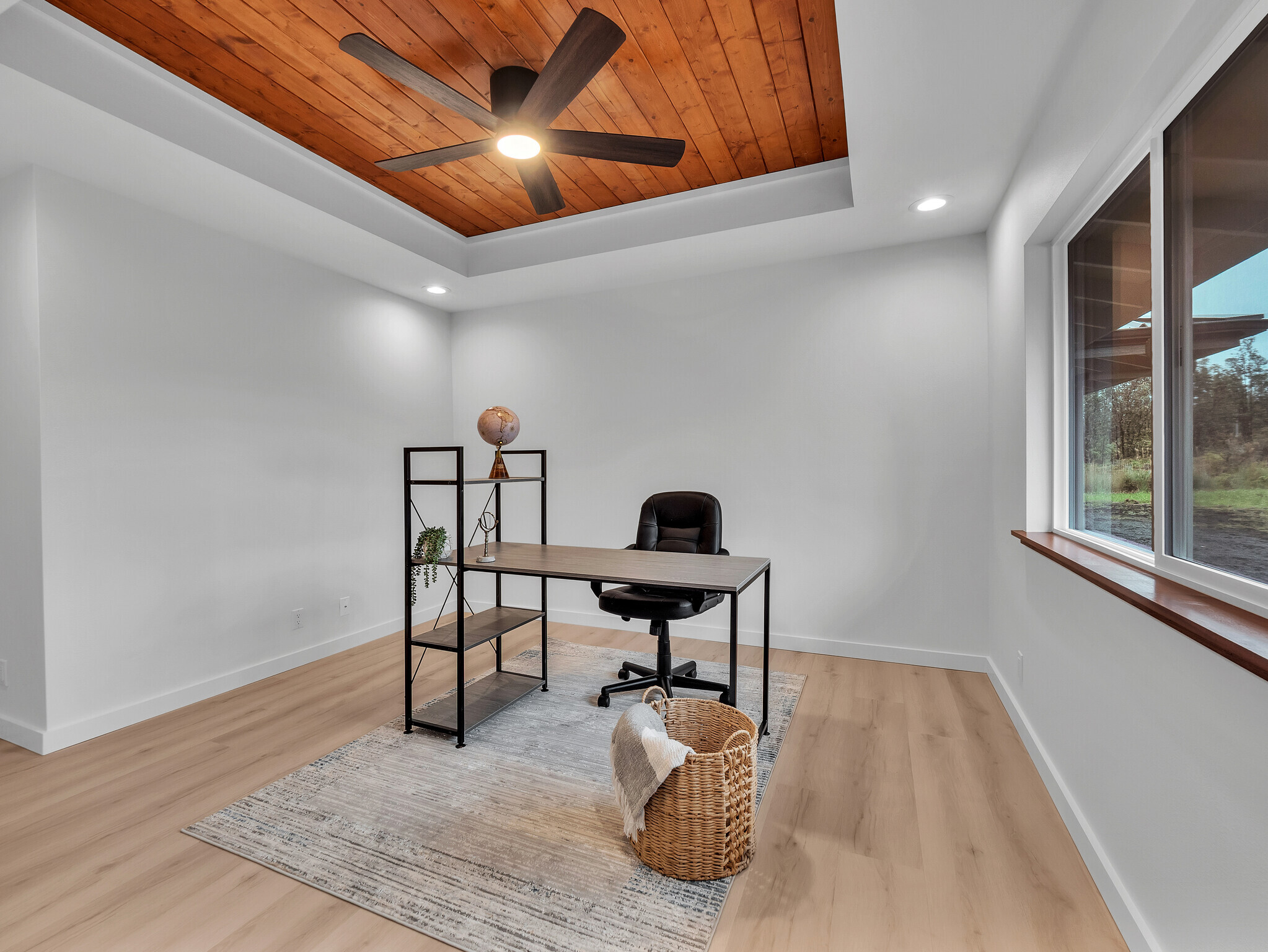 All rooms feature beautiful tongue and groove tray ceilings. The two other bedrooms offer possibilities for family rooms or an in-house office. In the hallway find a spacious pantry with a barn door, or use it for other storage. Indoor laundry room for convenience fully equipped with a folding table and sink. The two car garage offers ample covered parking or storage with an enclosed machine room.