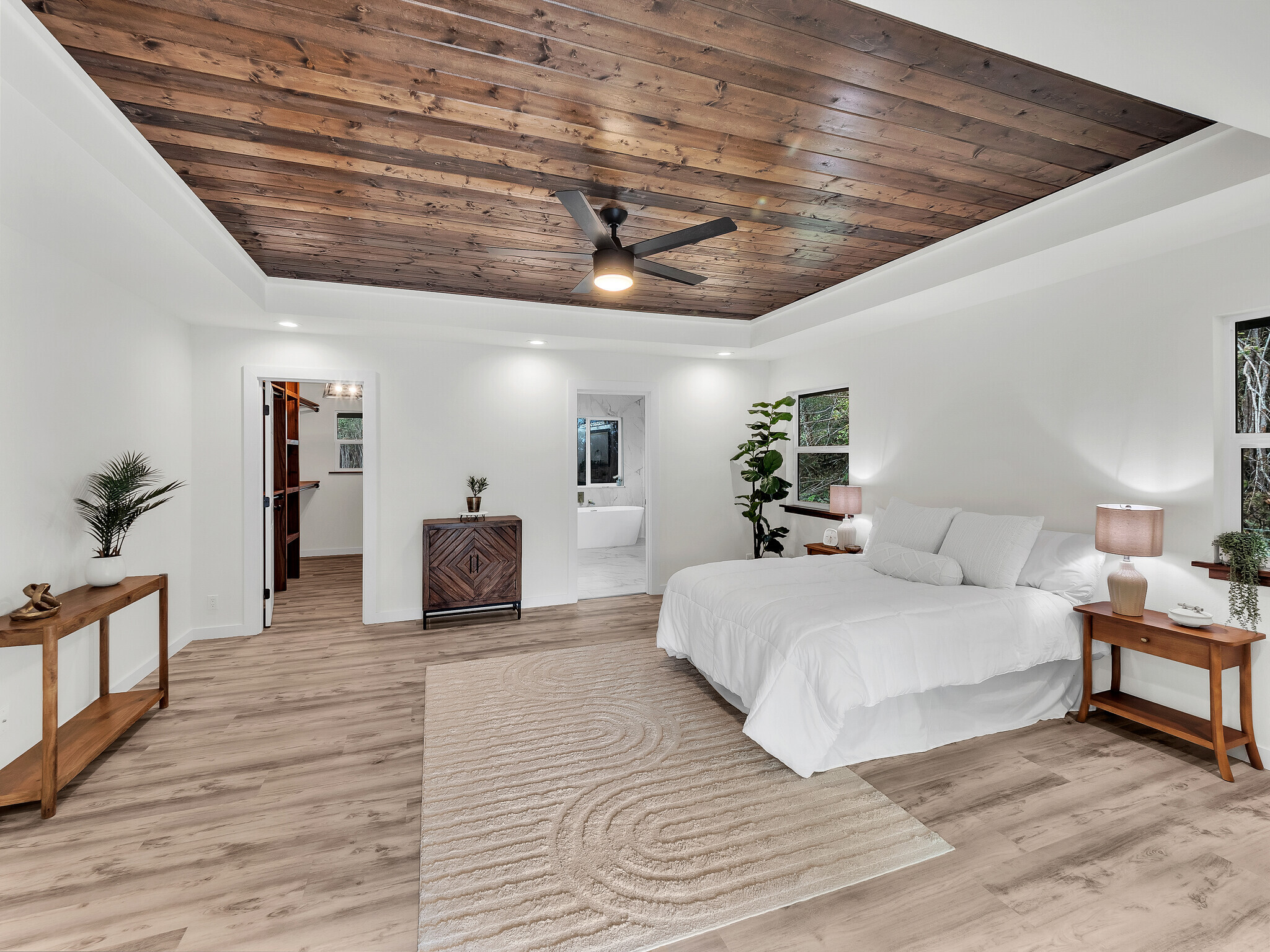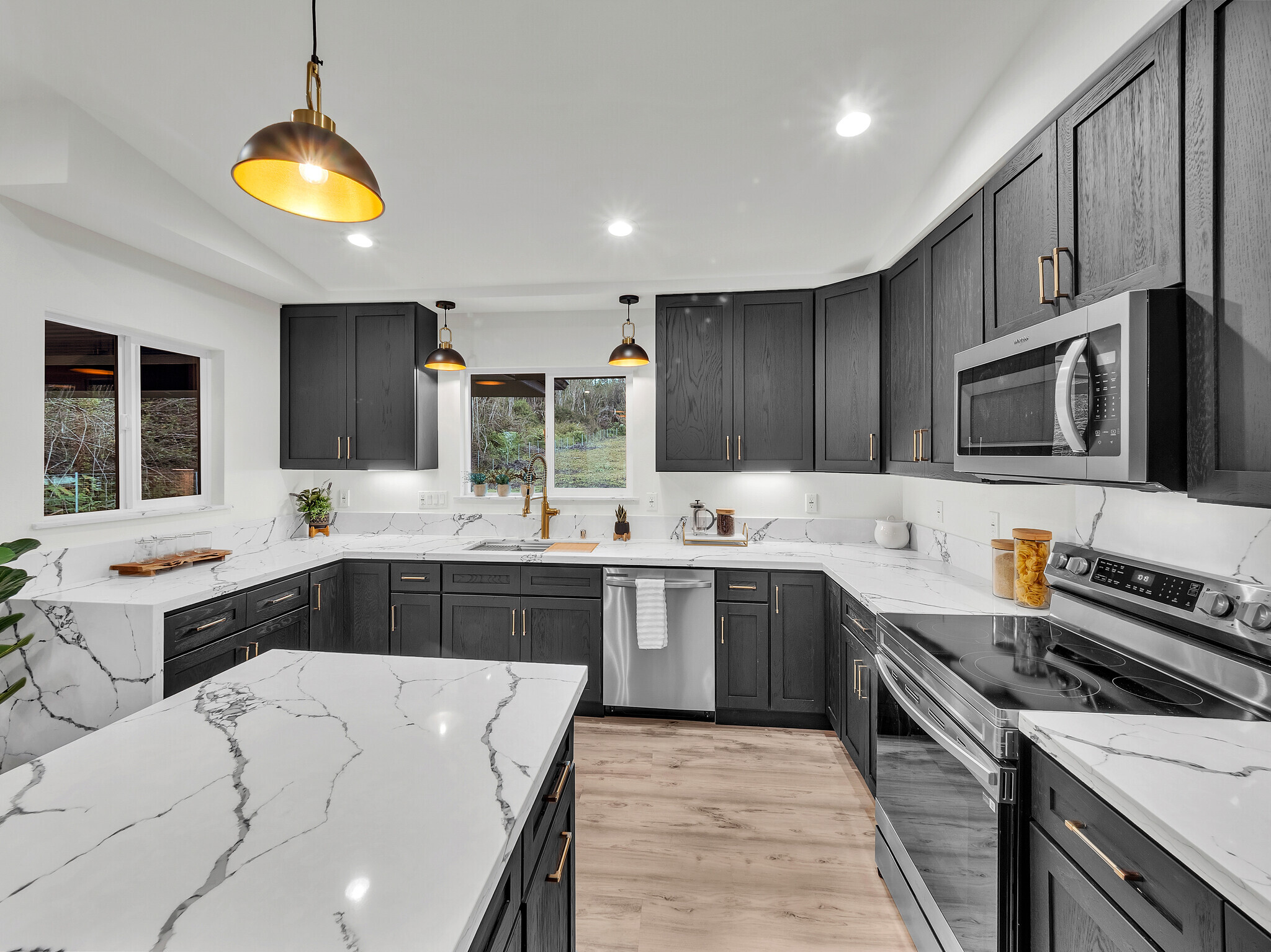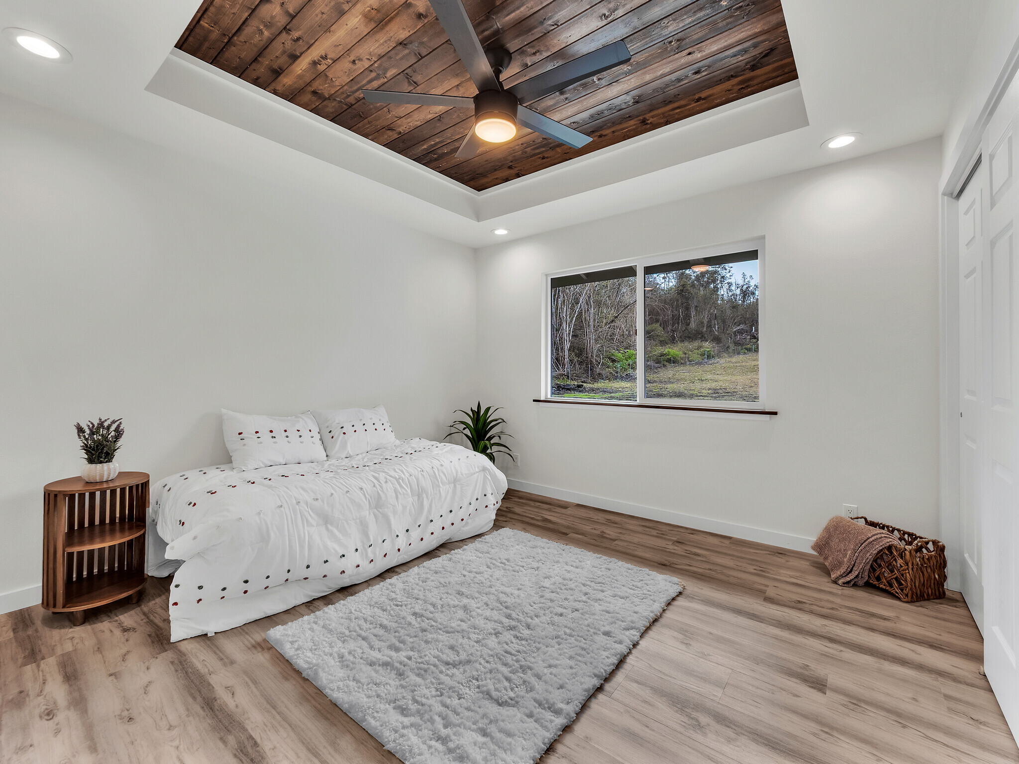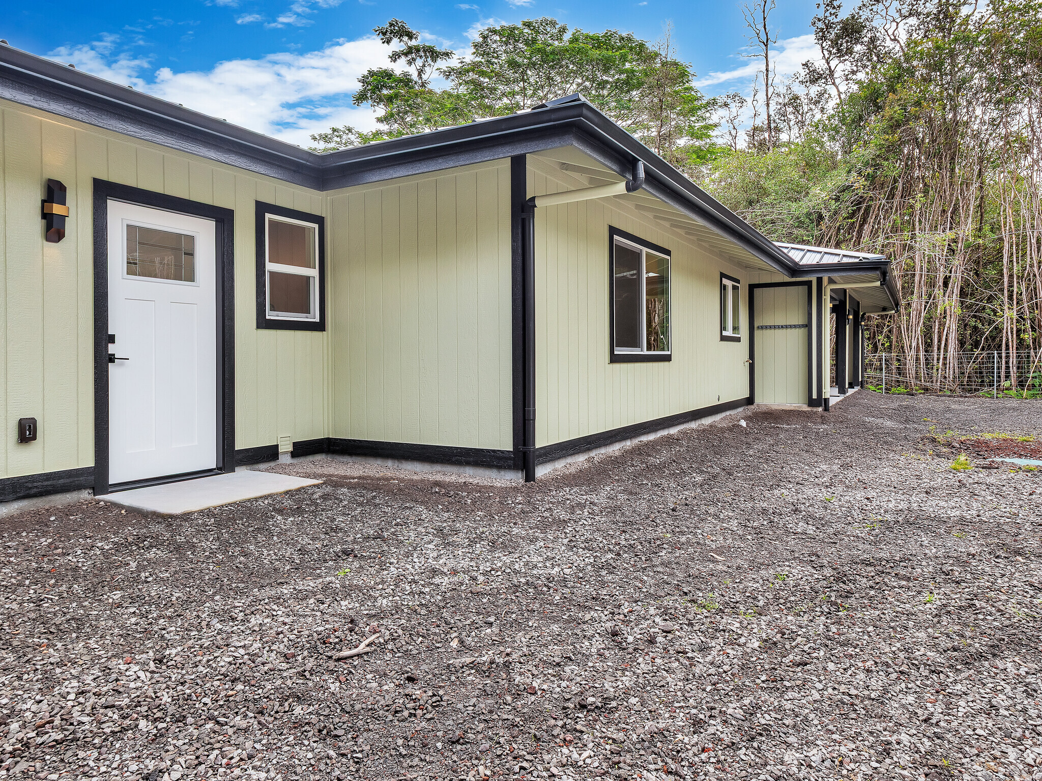 Welcome to your brand new home in Hawaiian Acres Subdivision, located right off desired paved Moho Rd. Enter through the custom gate into your 3 acre property with over 2 acres fenced. Beautiful built in shelves, with floor to ceiling tiled entertainment center with TV mount & electric fireplace. The kitchen comes fully equipped with brand new appliances, a beautiful waterfall granite counter & 9ft island. The spacious primary bedroom has its own custom outfitted closed and ensuite bathroom. Offering both a soaker tub & a separate shower, this bathroom will have you feeling like you left the spa. The primary bedroom also has private access to the outdoor back lanai. All rooms feature stained tongue and groove tray ceilings. The two other bedrooms offer possibilities for family rooms or an in-house office. In the hallway find a spacious pantry with a barn door, or use it for other storage. Indoor laundry room for convenience fully equipped with a folding counter, sink & storage cabinets. The two car garage offers ample covered parking or storage with enclosed machine room. This location in Hawaiian Acres takes you conveniently via the back road to Pahoa or to the main highway, making it a good central location. Assessed tax value reflects land. Tax record will be updated for land and new construction.