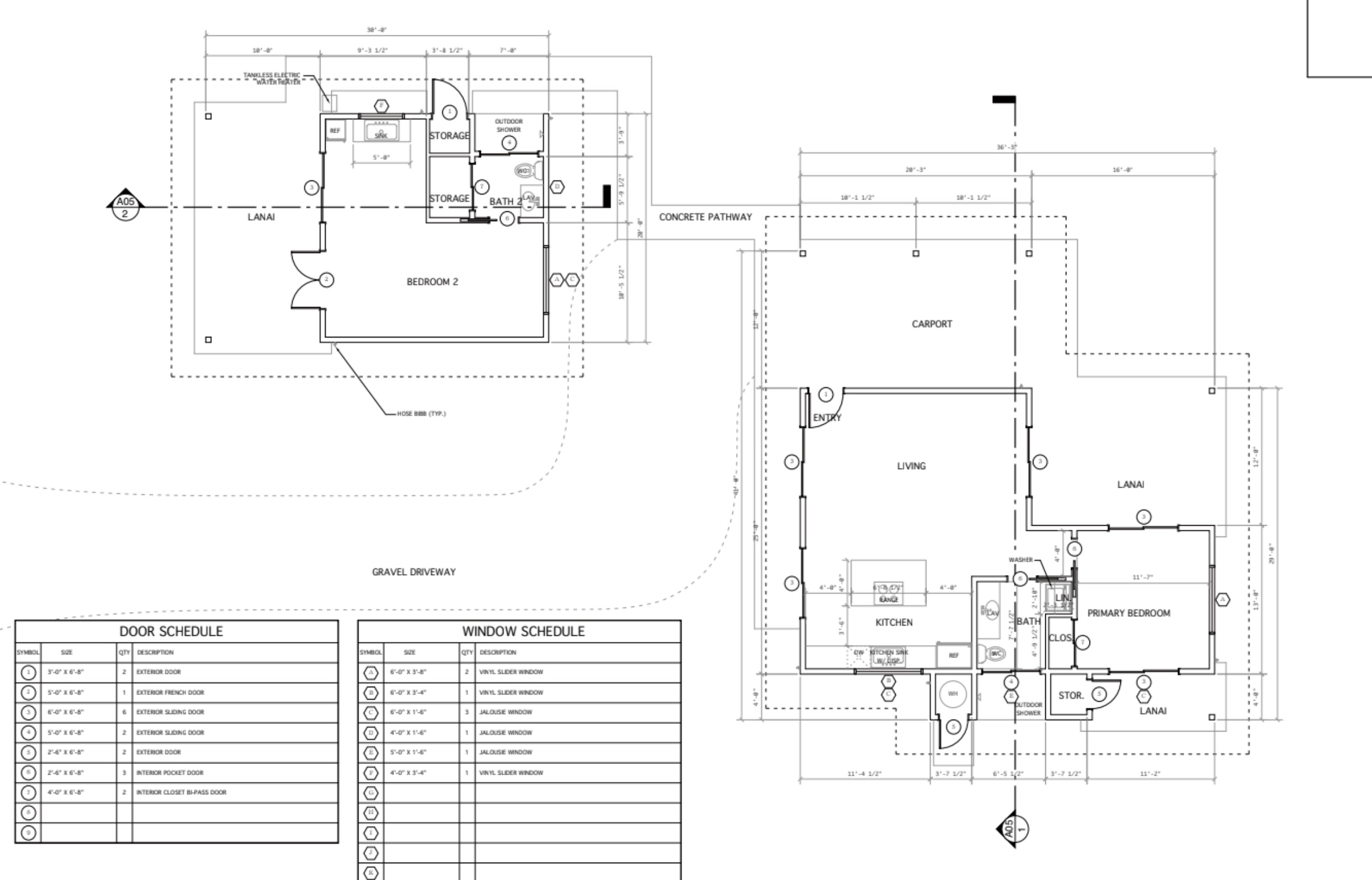 Price includes house plans for: New 1 bedroom, 1 bathroom single family dwelling with detached 1 bedroom 1 bathroom on concrete slab foundation with solar panel on roof, county water, and septic system. Entry into living/kitchen (refrigerator, sink with disposal, dishwasher, island with range), bathroom (lavatory, water closet, outdoor shower, washer), bedroom with lanai and storage. Exterior closet with water heater enclosed. Detached bedroom (refrigerator, sink), bathroom (lavatory, water closet, outdoor shower). Exterior storage. Tankless water heater exterior of bedroom #2. Stamped by Architect