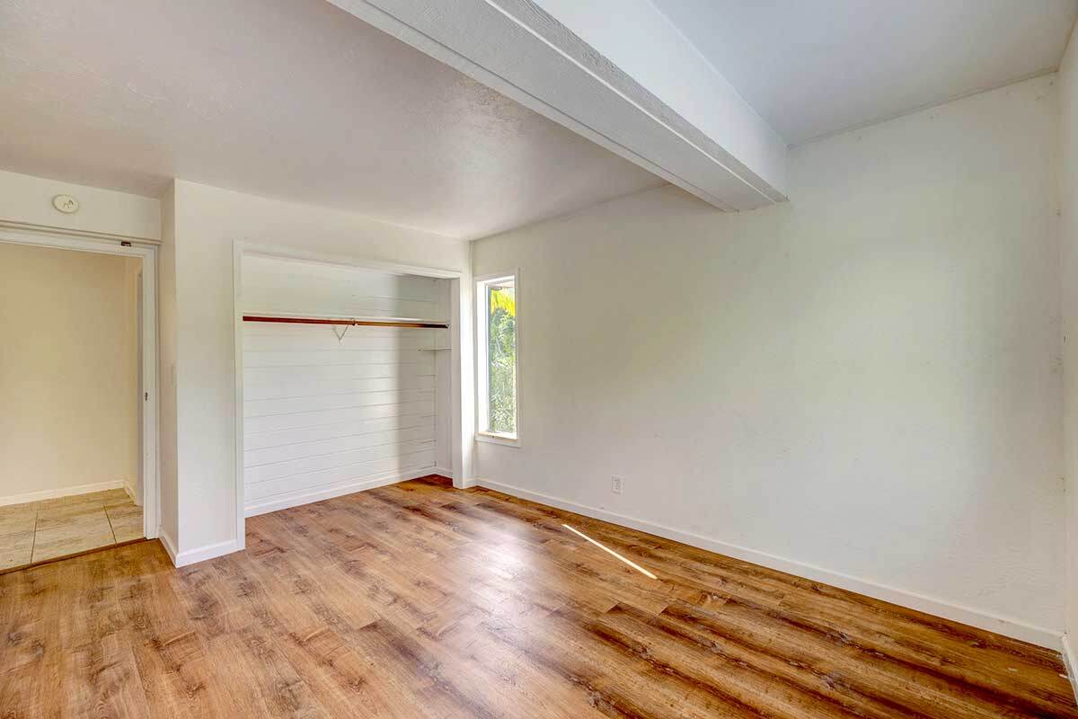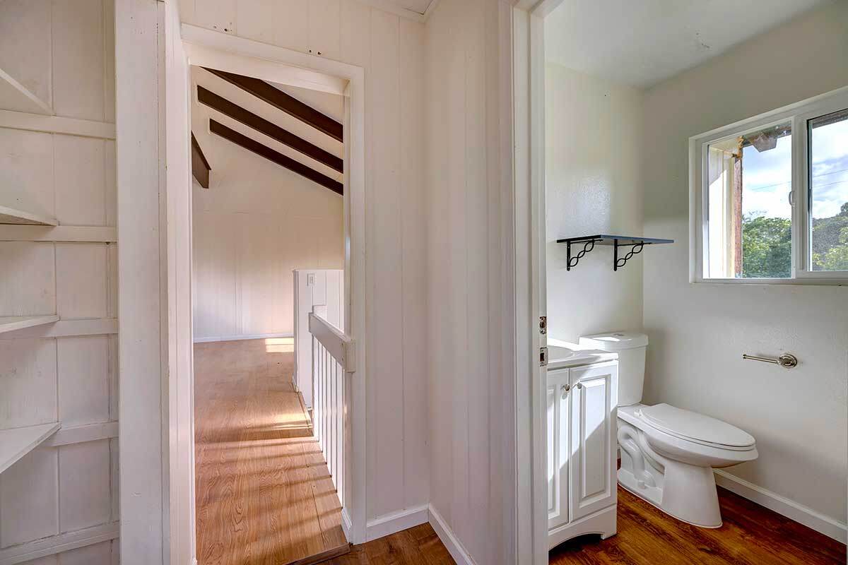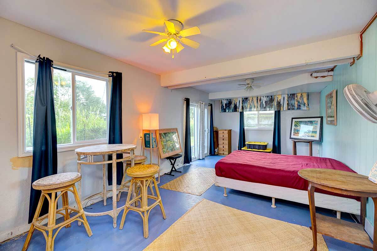 Top Floor: A bright and airy open-concept space with high ceilings and a loft-style feel. Enjoy a full kitchen, spacious living area, half bath, and an expansive lanai that stretches the length of the house–perfect for morning coffee or relaxing among the treetops.