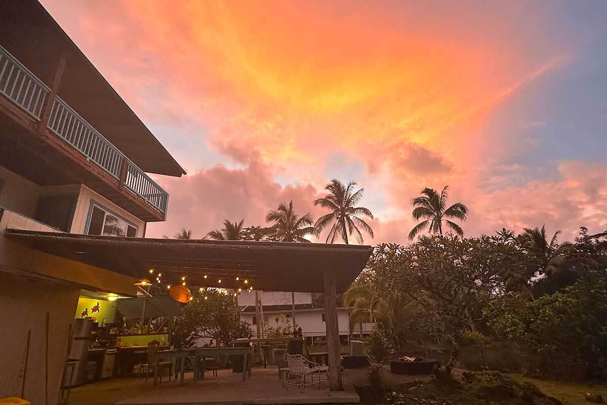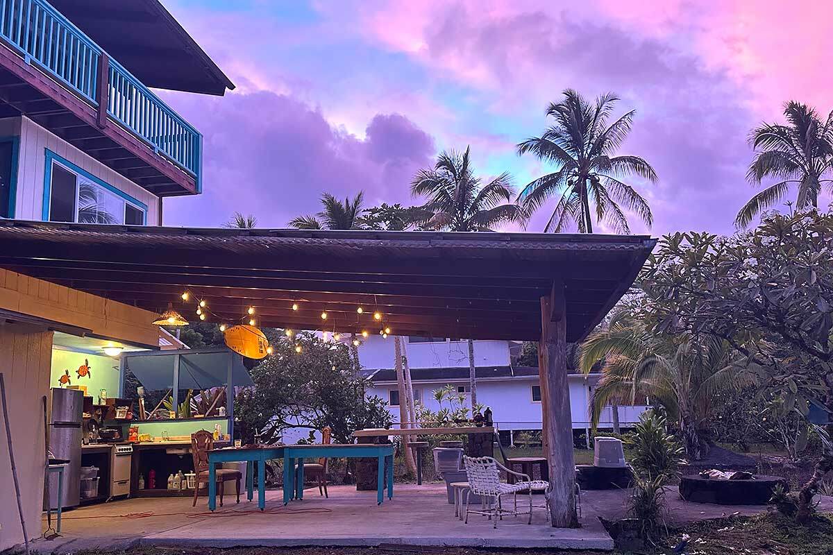 Ground Level: A separate cozy studio suite with its own bathroom, plus a large covered out-door kitchen lanai area (that you will love) with a fire pit–great for gathering with friends and ‘ohana. You will be treated to amazing sunrise and sunset colors while relaxing on the lanai!