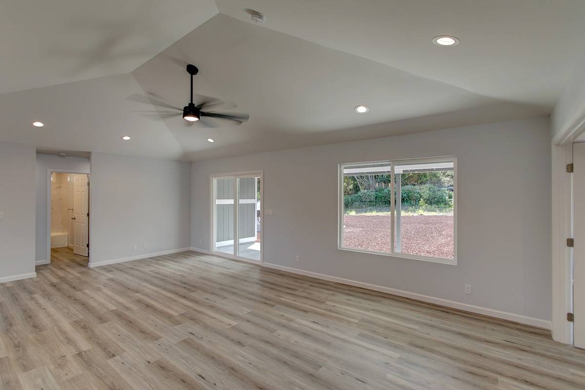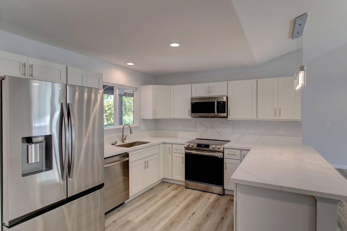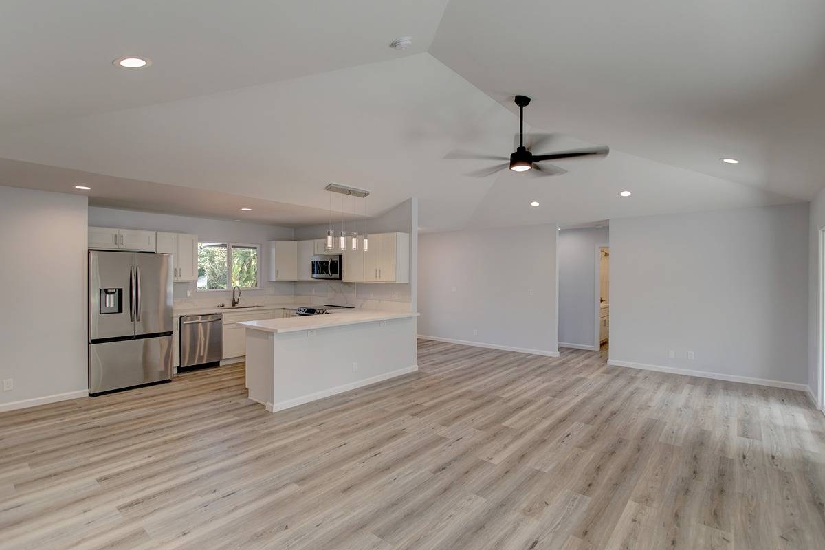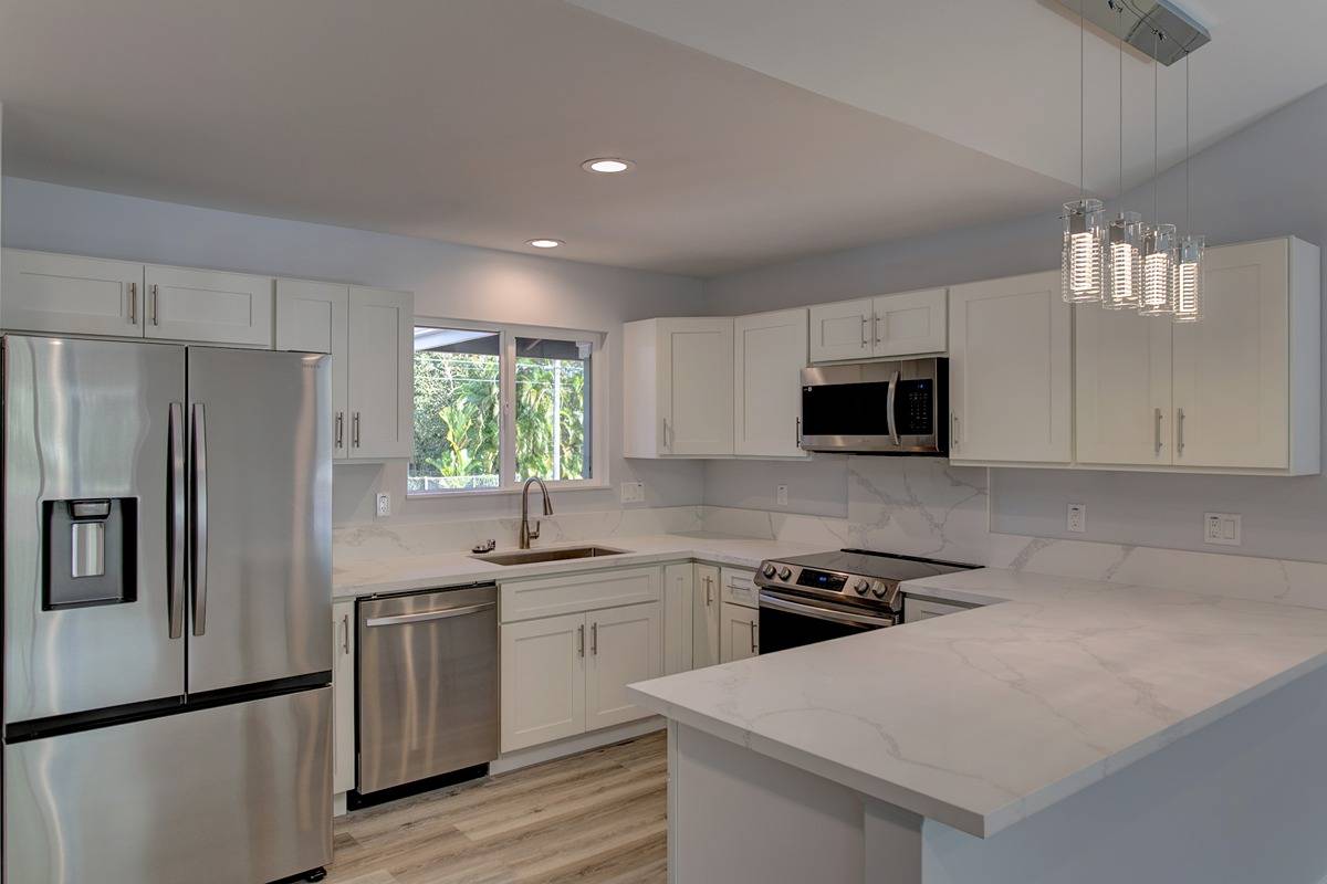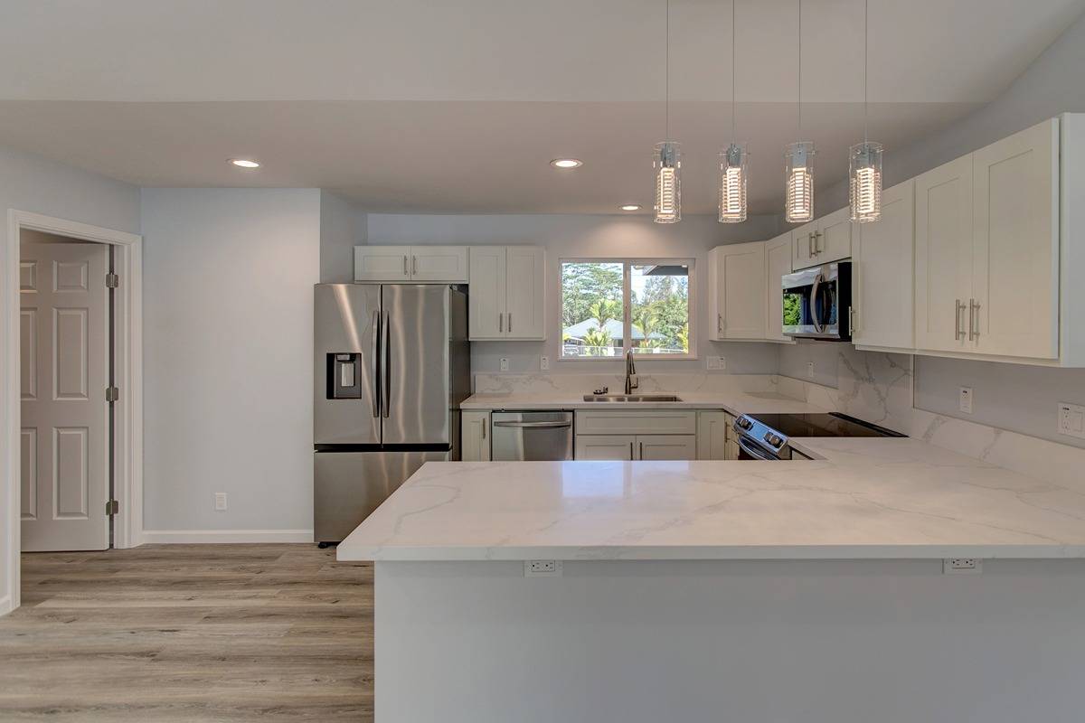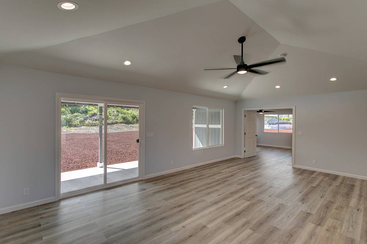 Open concept living area, vaulted ceilings, family room that seamlessly connects to the kitchen and dining areas. Custom counters, stainless steel appliances, soft close cabinets, and modern hardware and lighting. Access your large patio lanai area through the sliding doors from the living room into your acre of land that is ready for your green thumb or landscaping vision.