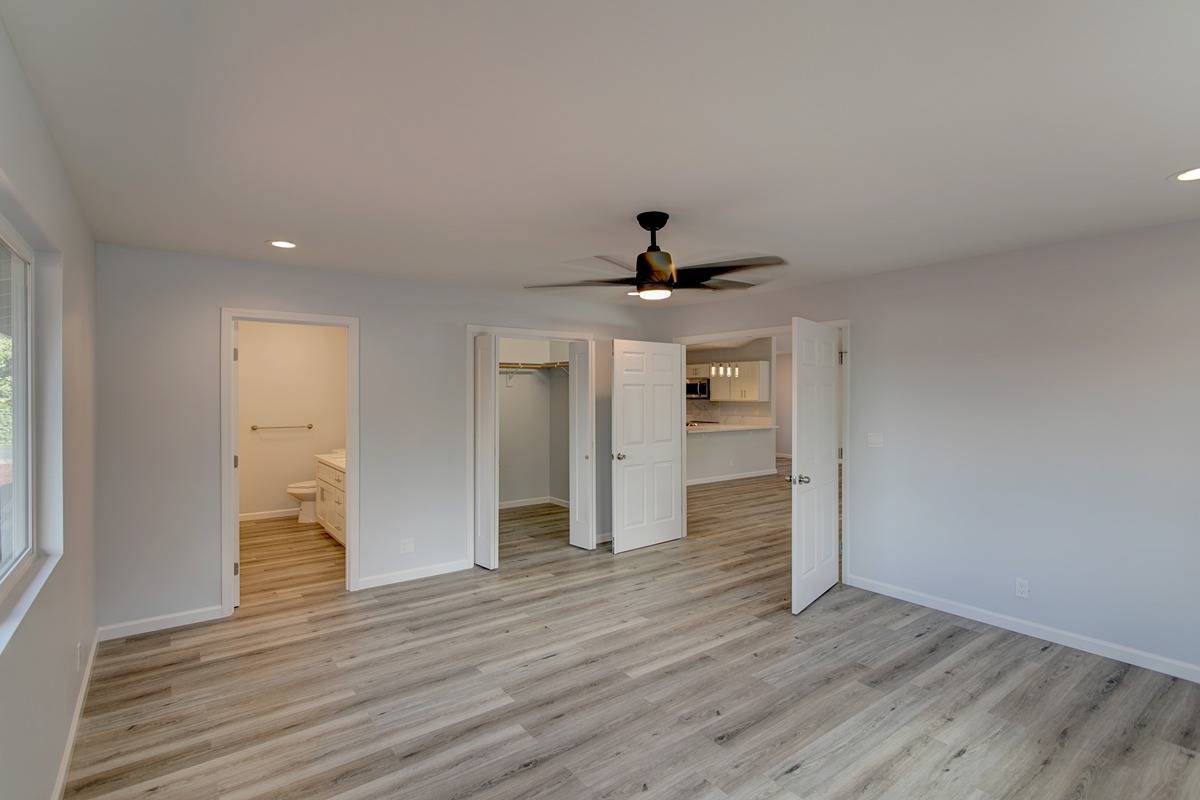 Double door entry, into the large primary bedroom complete with a large walk in closet and en-suite bathroom with dual sinks, solid surface counters, walk in shower, cabinetry and modern fixtures as well.
