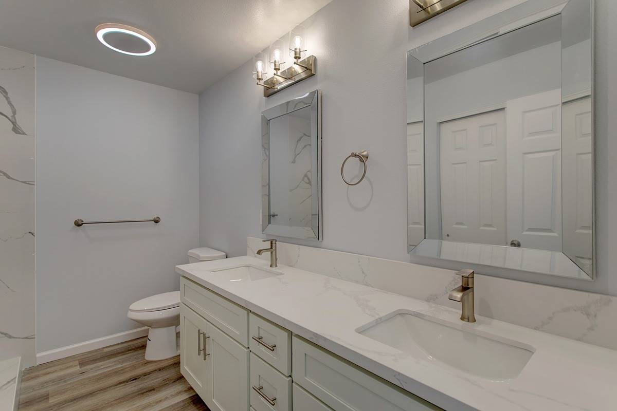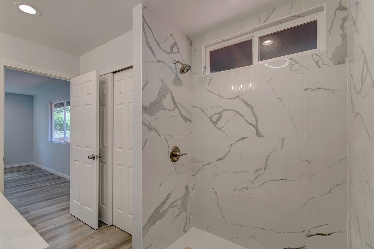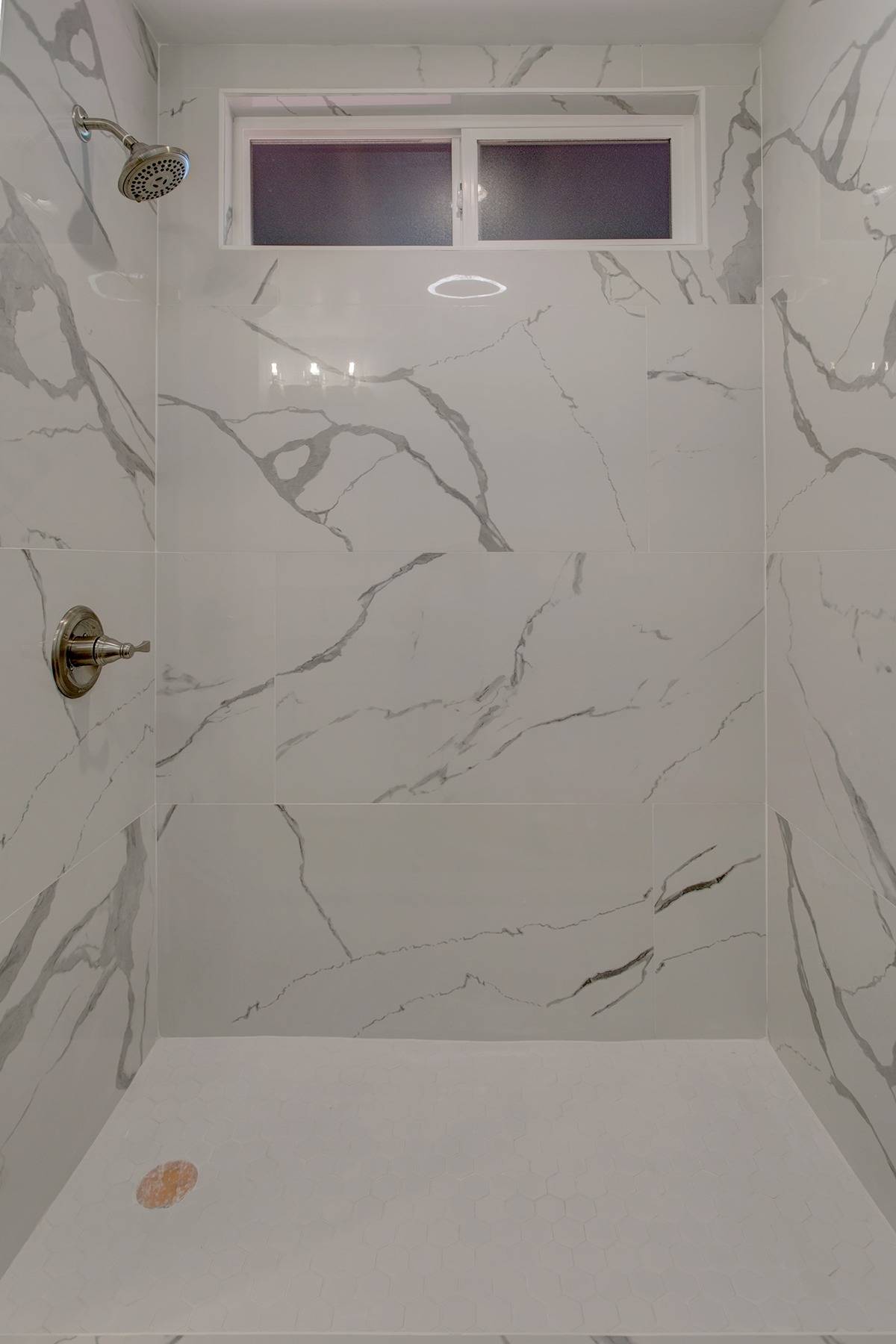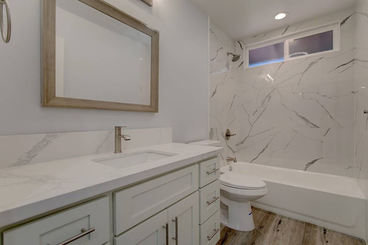 The Guest bath is conveniently located between the other 2 bedrooms across the living area for a nice privacy separation for everyone. Beautiful floors and tile work complete the spacious bathrooms.
