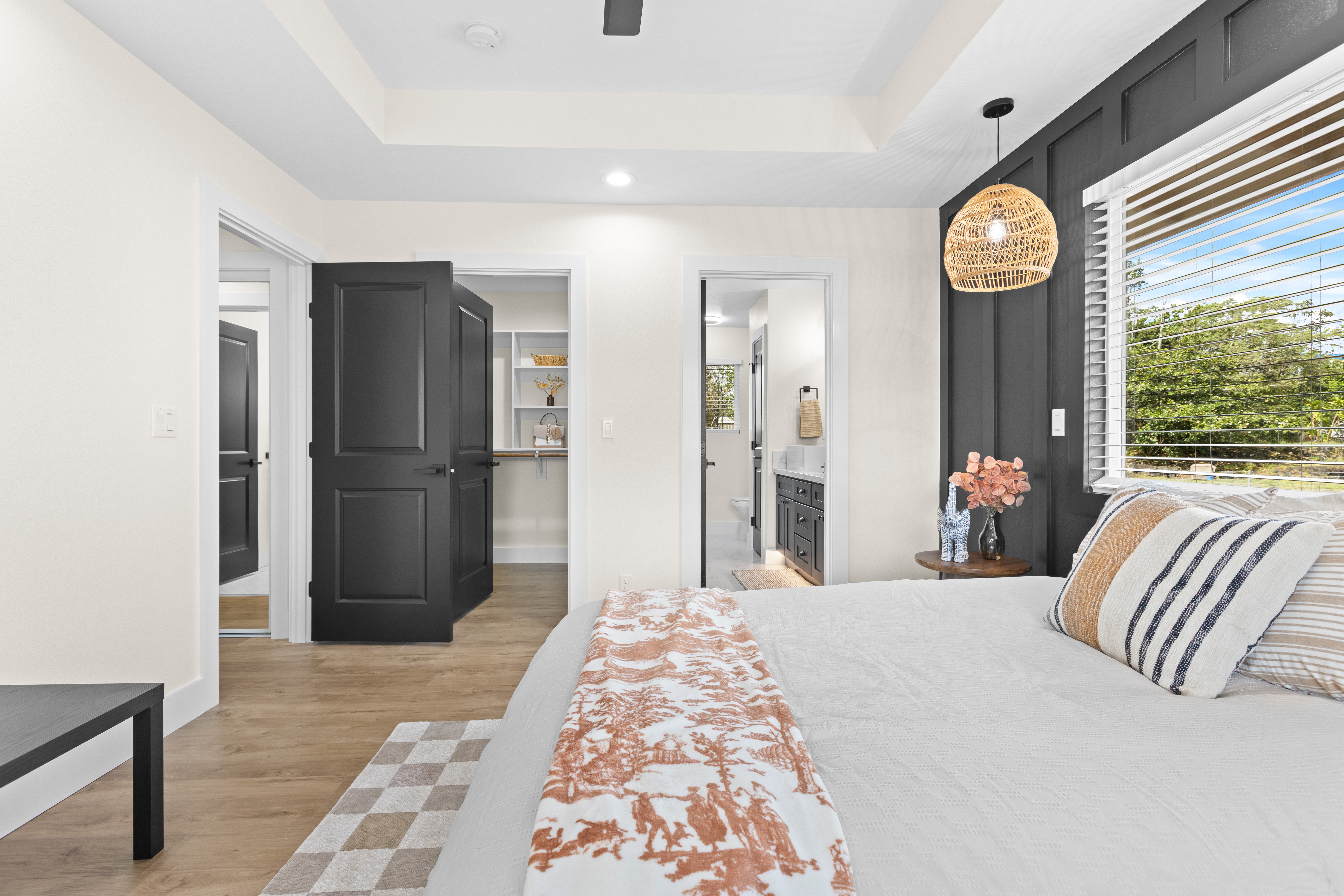 *Main Bedroom Features Hanging Rattan Ceiling Lights to Frame Sides of the Bed & Black Accent Design Wall