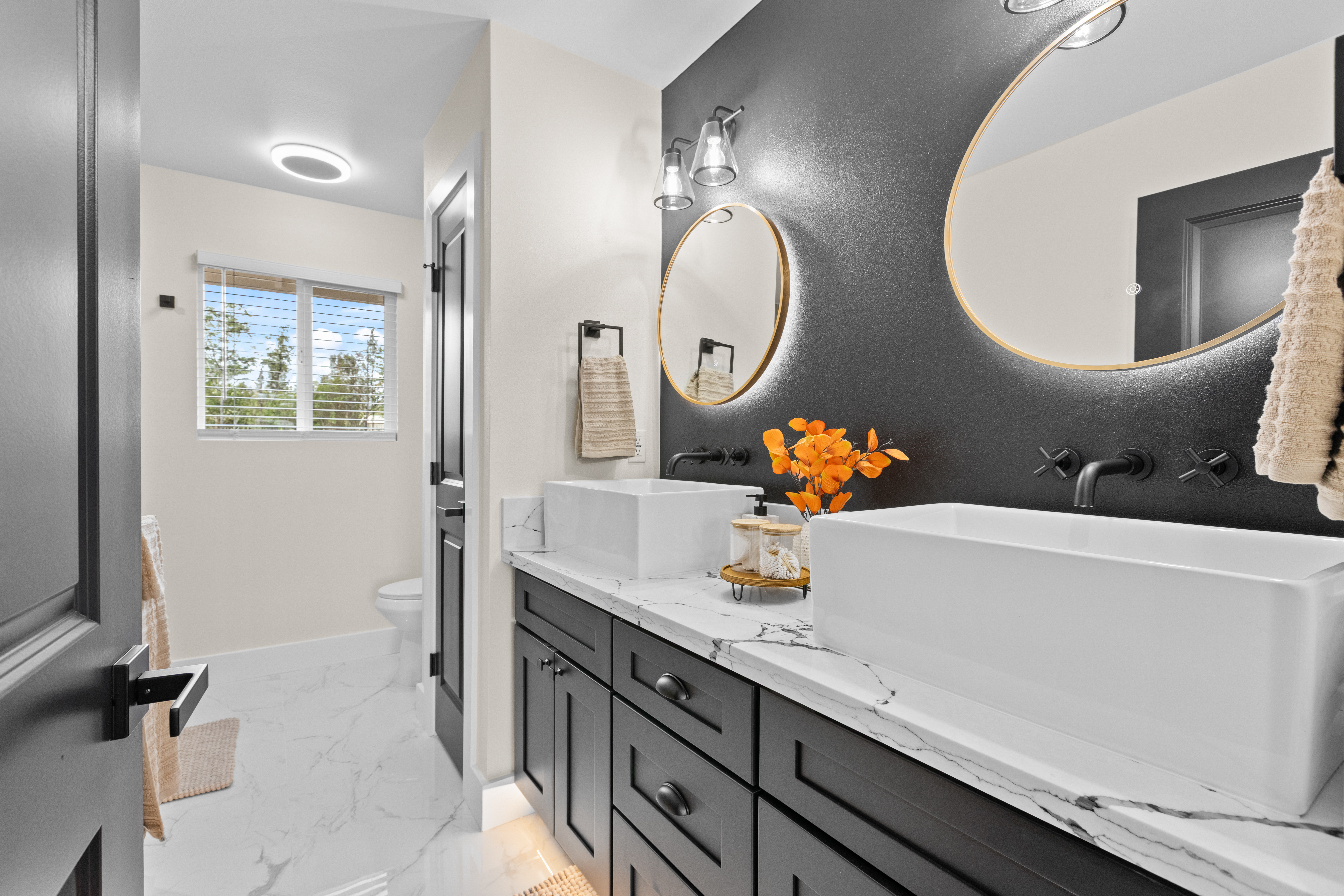 *Main Bathroom provides an En-suite Feel with Dual Vanity Vessel Sinks, Linen Closet and a Walk-in Shower