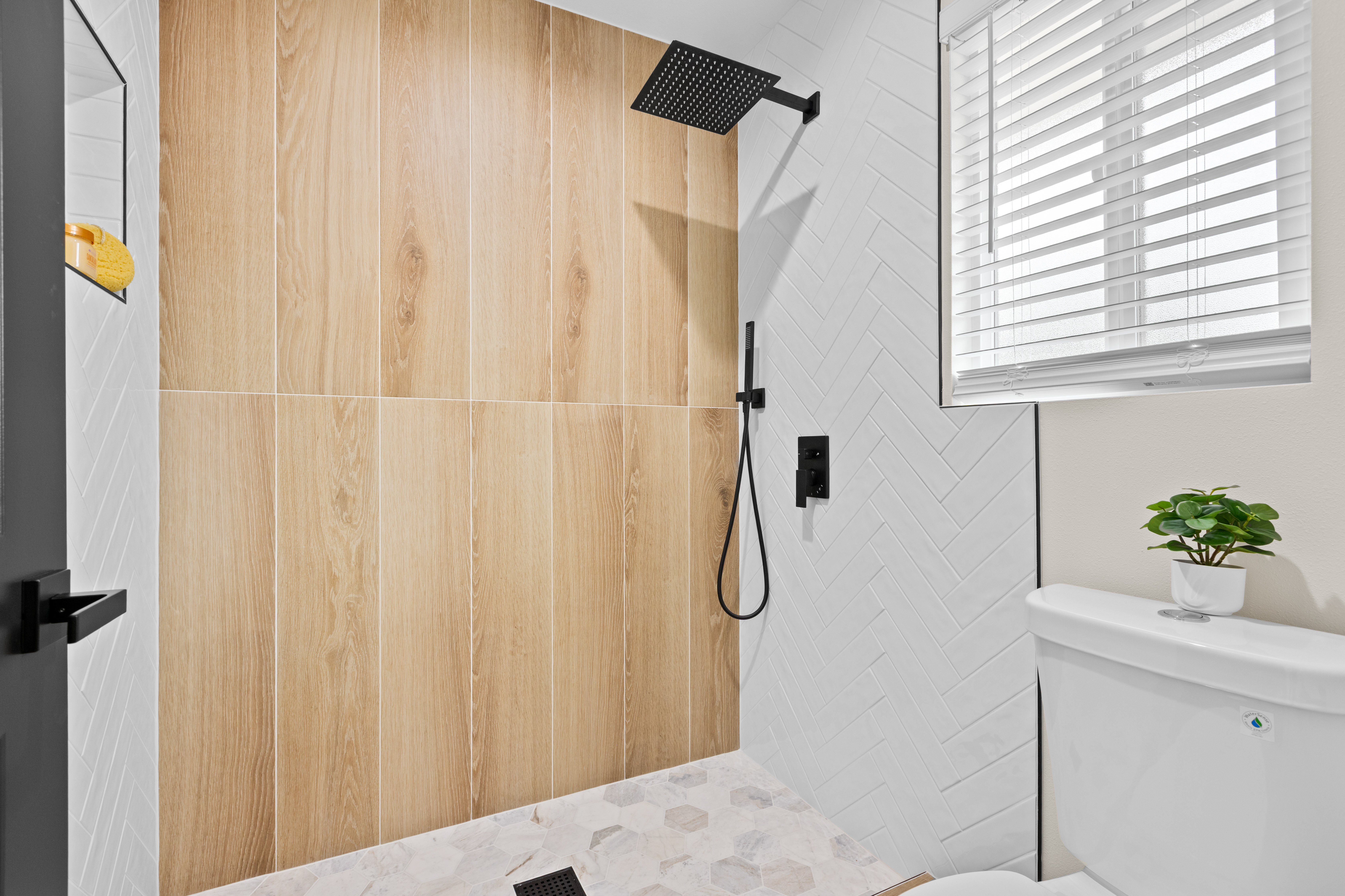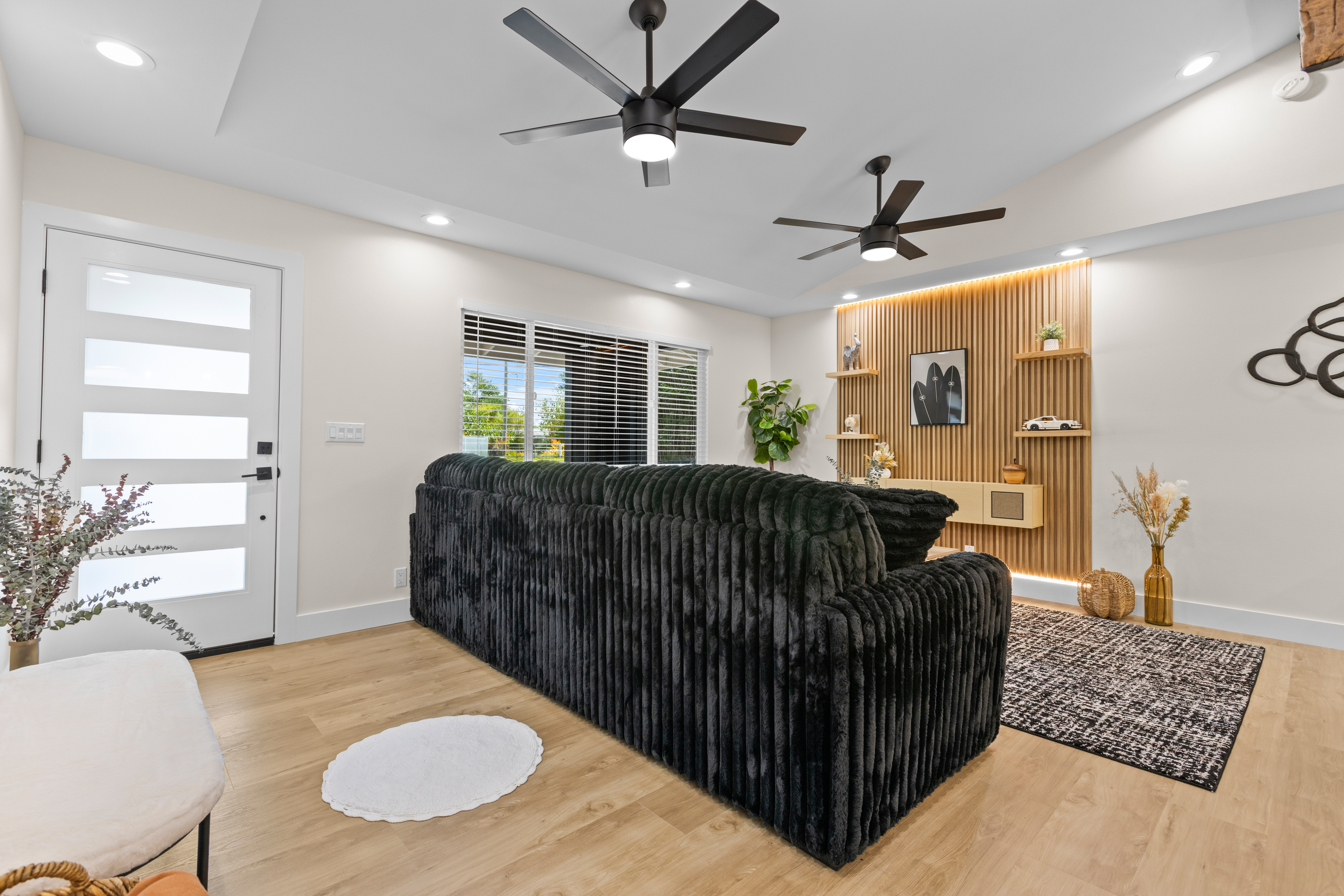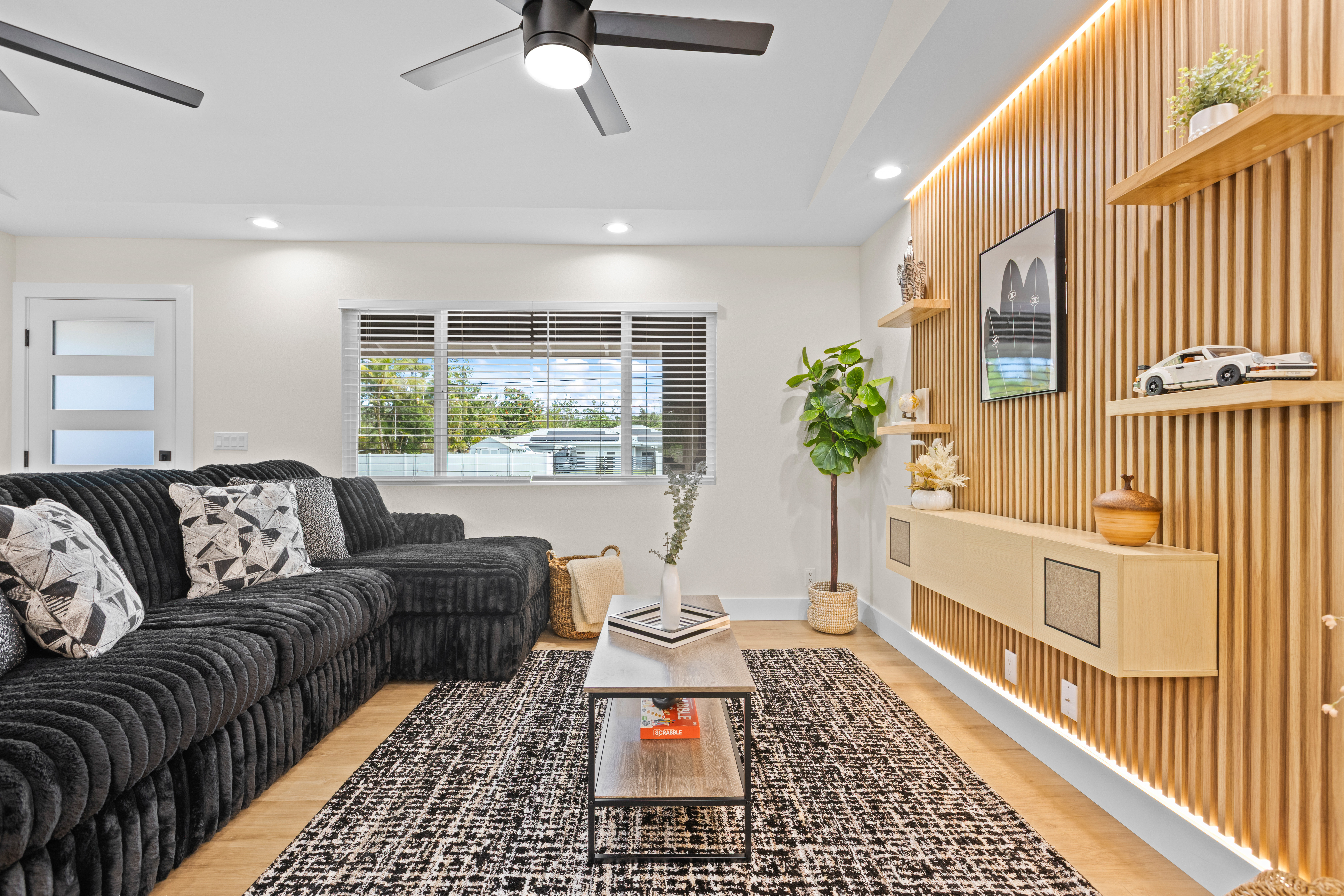 *Wood Slat Entertainment Wall and Wood Floating Shelves in Living Area