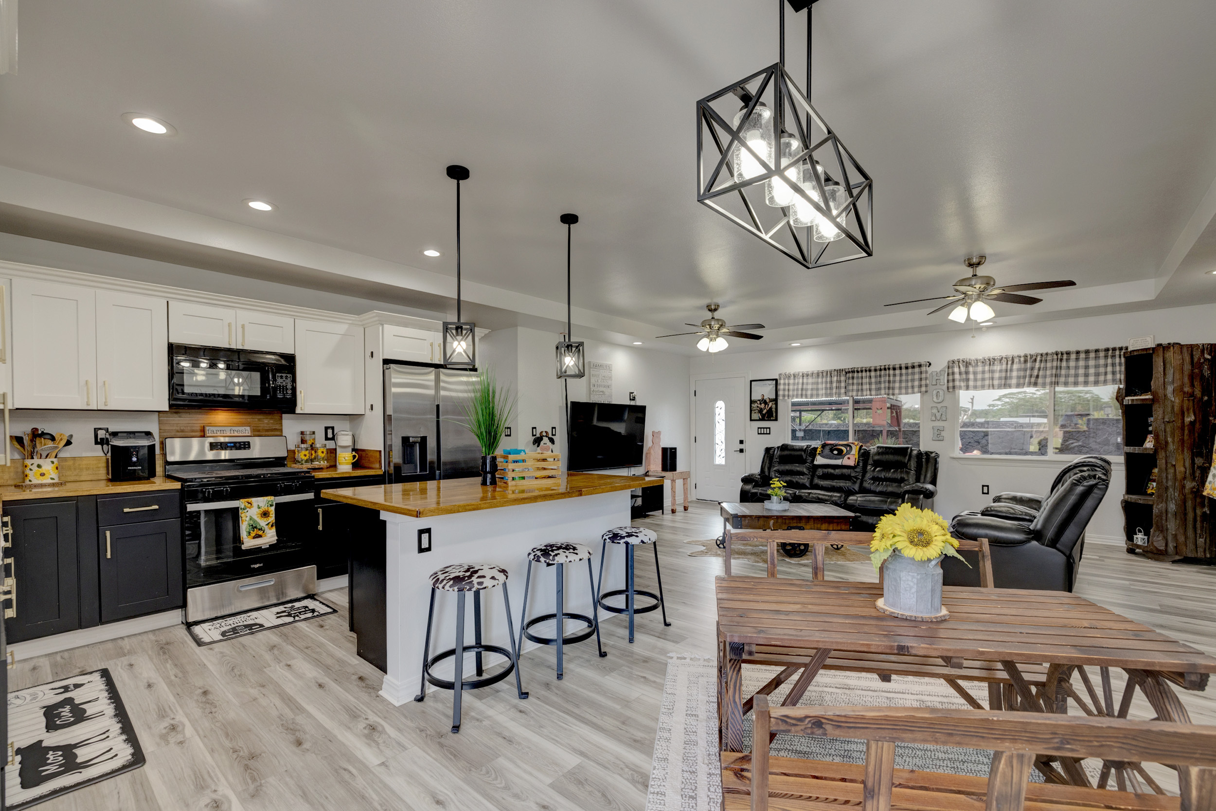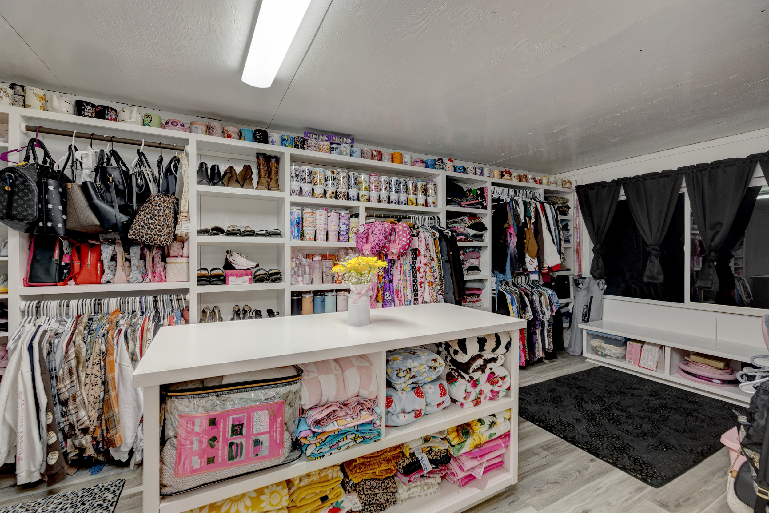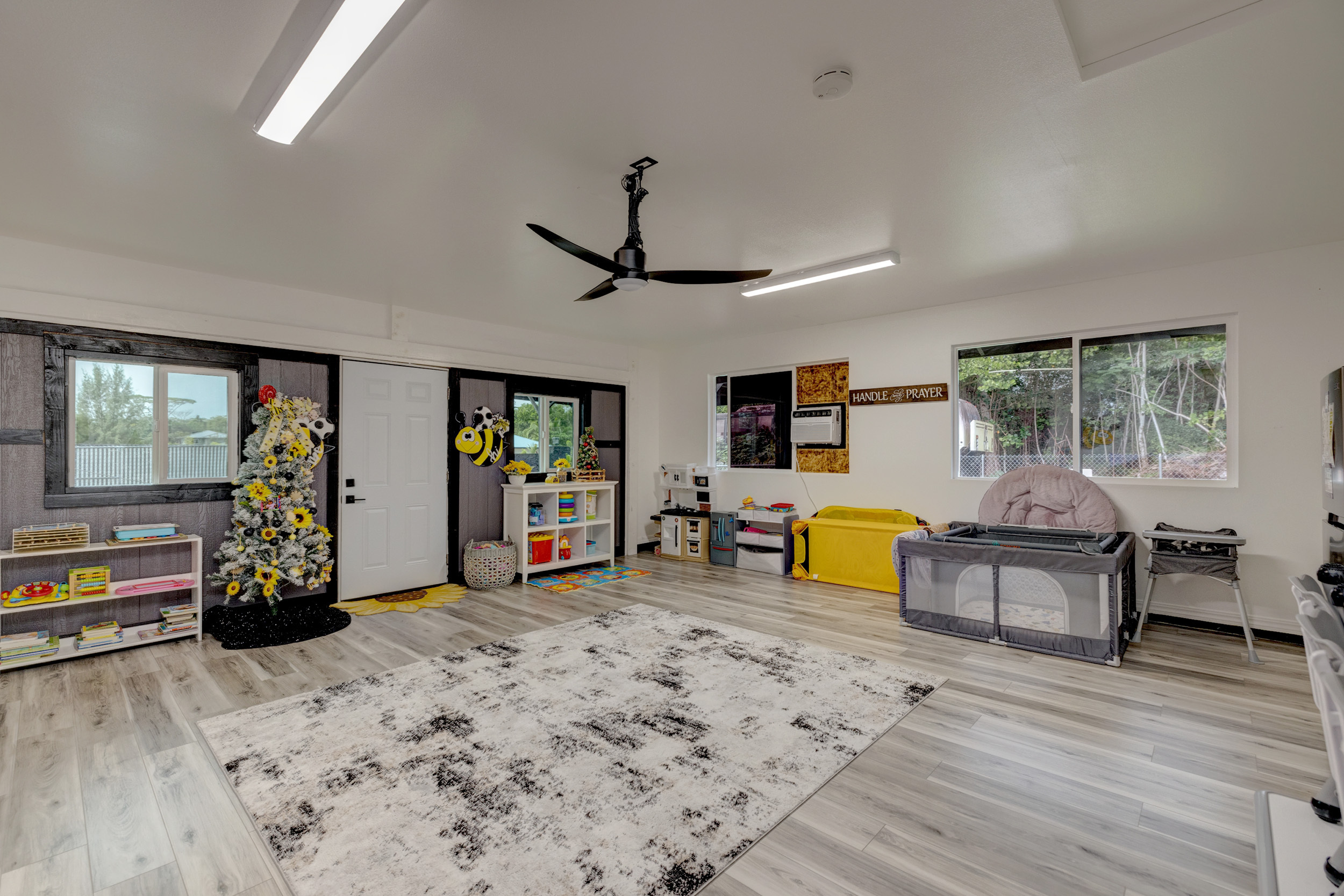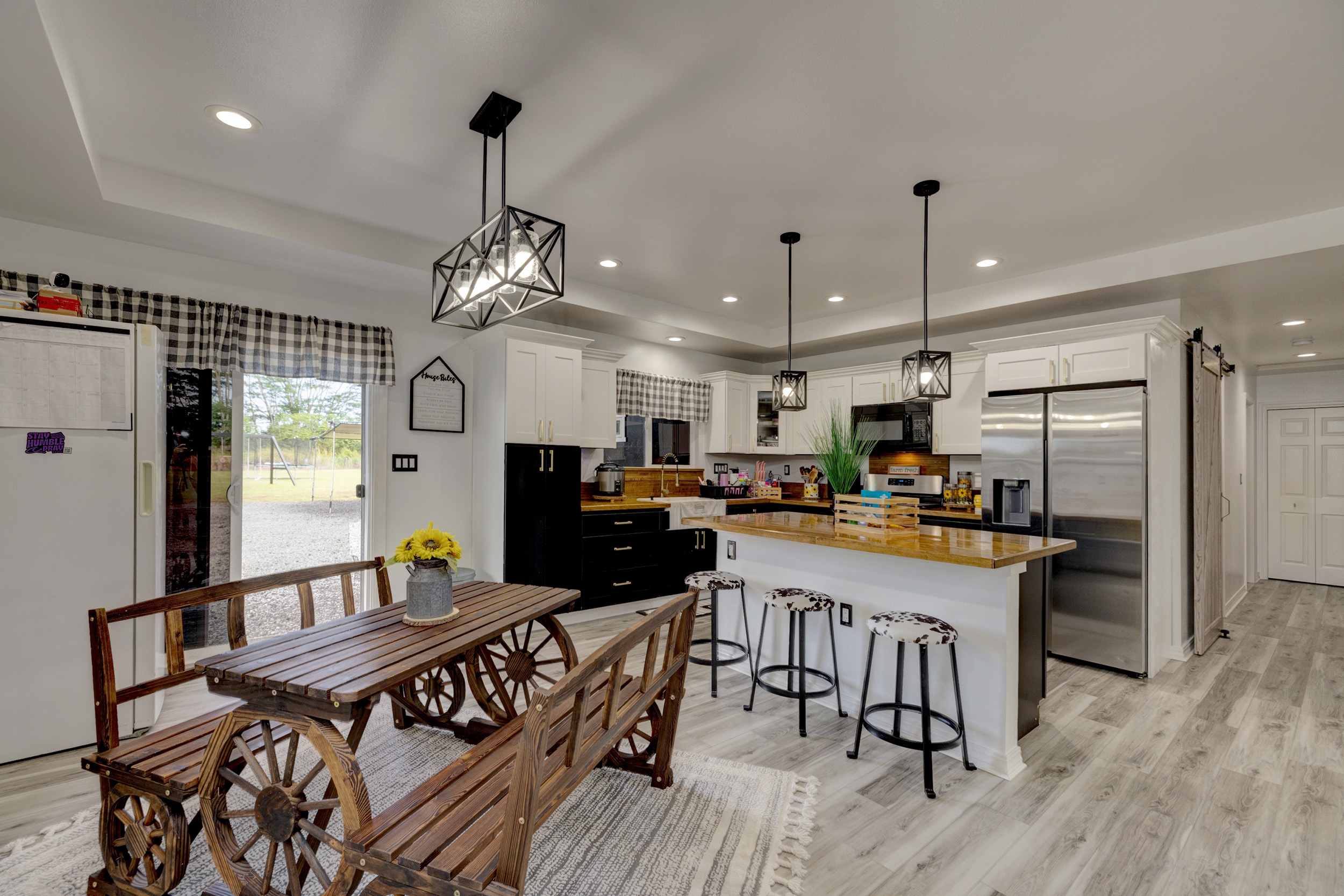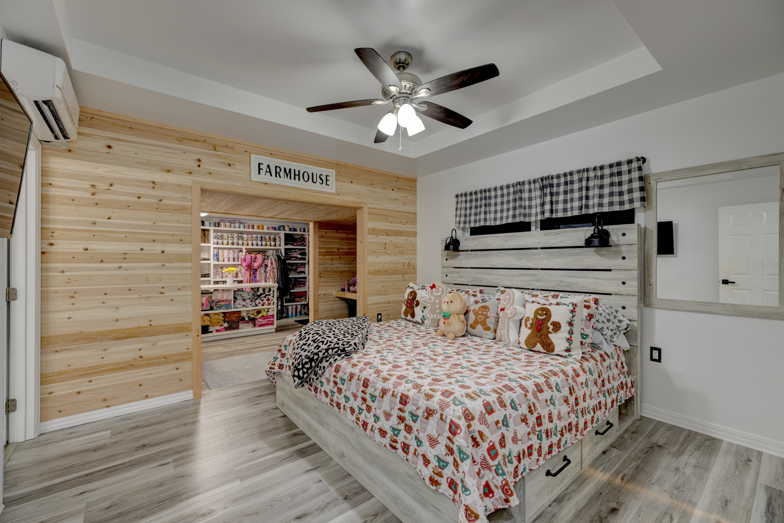 This fully fenced property offers privacy and functionality, featuring an attractive rock wall frontage and two automatic entry gates. Parking is plentiful with a two-car carport at the front and a double garage/workshop at the rear, complete with both front and rear garage doors. Attached to the garage is a private guest studio with its own bathroom. The origional garage has been thoughtfully converted into additional living space, currently used as a daycare. This area includes a separately fenced play yard, making it ideal for childcare, home business use, or flexible living needs. Adjacent is a dedicated laundry room with a private bathroom featuring a spacious walk-in shower. The home is equipped with central air conditioning, 20 solar panels, two Tesla batteries, and a UV water filtration system for efficiency and peace of mind. Inside, new laminate flooring runs throughout. The kitchen is a standout with maple hardwood countertops, a farmhouse sink, stainless steel appliances, a two-tone cabinet design with crown molding, a center island, and an elegant tray ceiling. Down the hallway are two bedrooms, a full bathroom, and the primary suite. The primary retreat includes its own bathroom with a walk-in shower, separate AC, an office nook, a his-and-hers walk-in closet, and an additional expansive 250-square-foot custom walk-in closet with private access directly from the garage. The backyard is designed for easy maintenance, offering a simple-to-mow lawn, a 144-square-foot children’s playhouse, and a covered shed ideal for tools and lawn equipment.