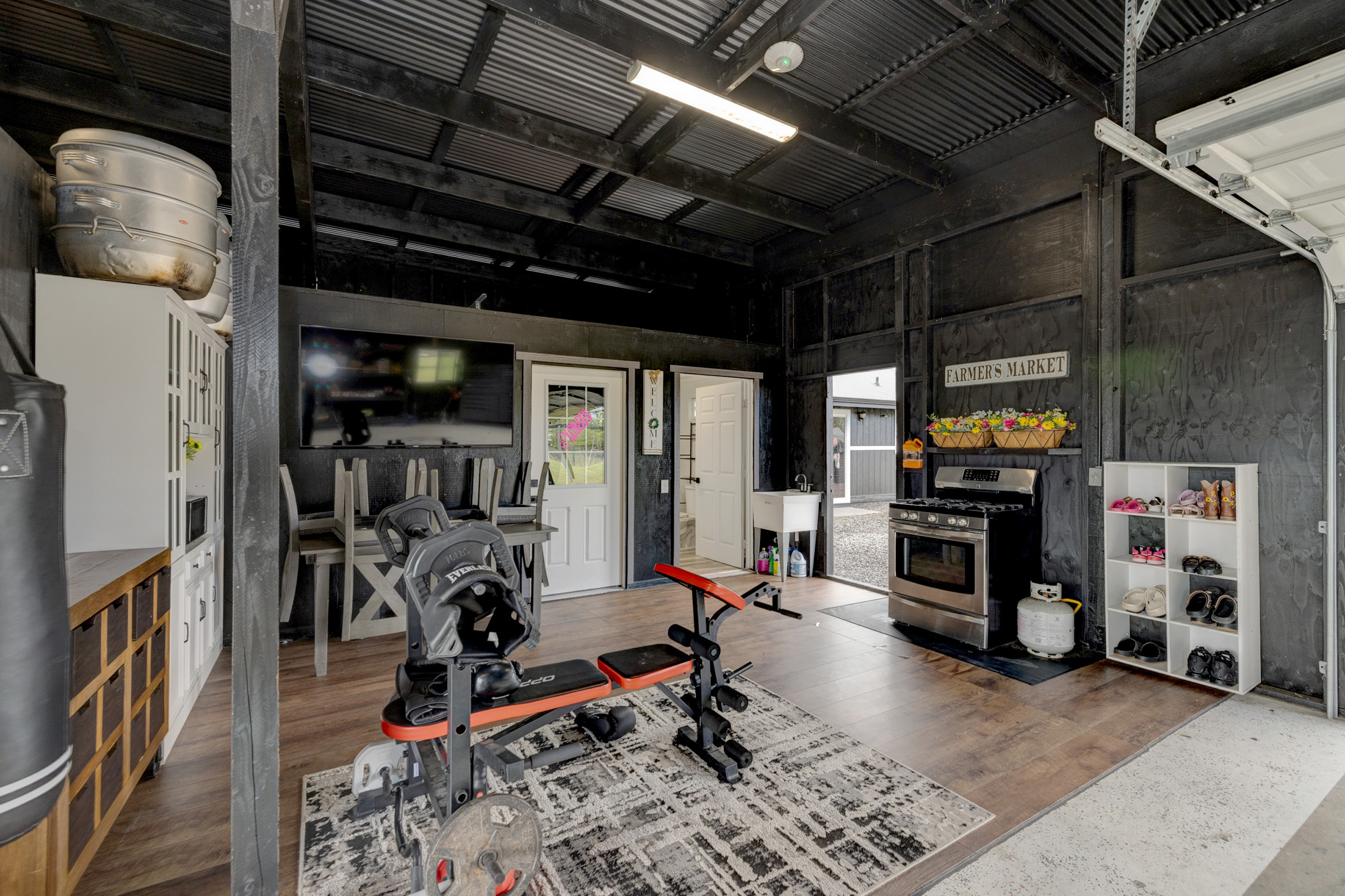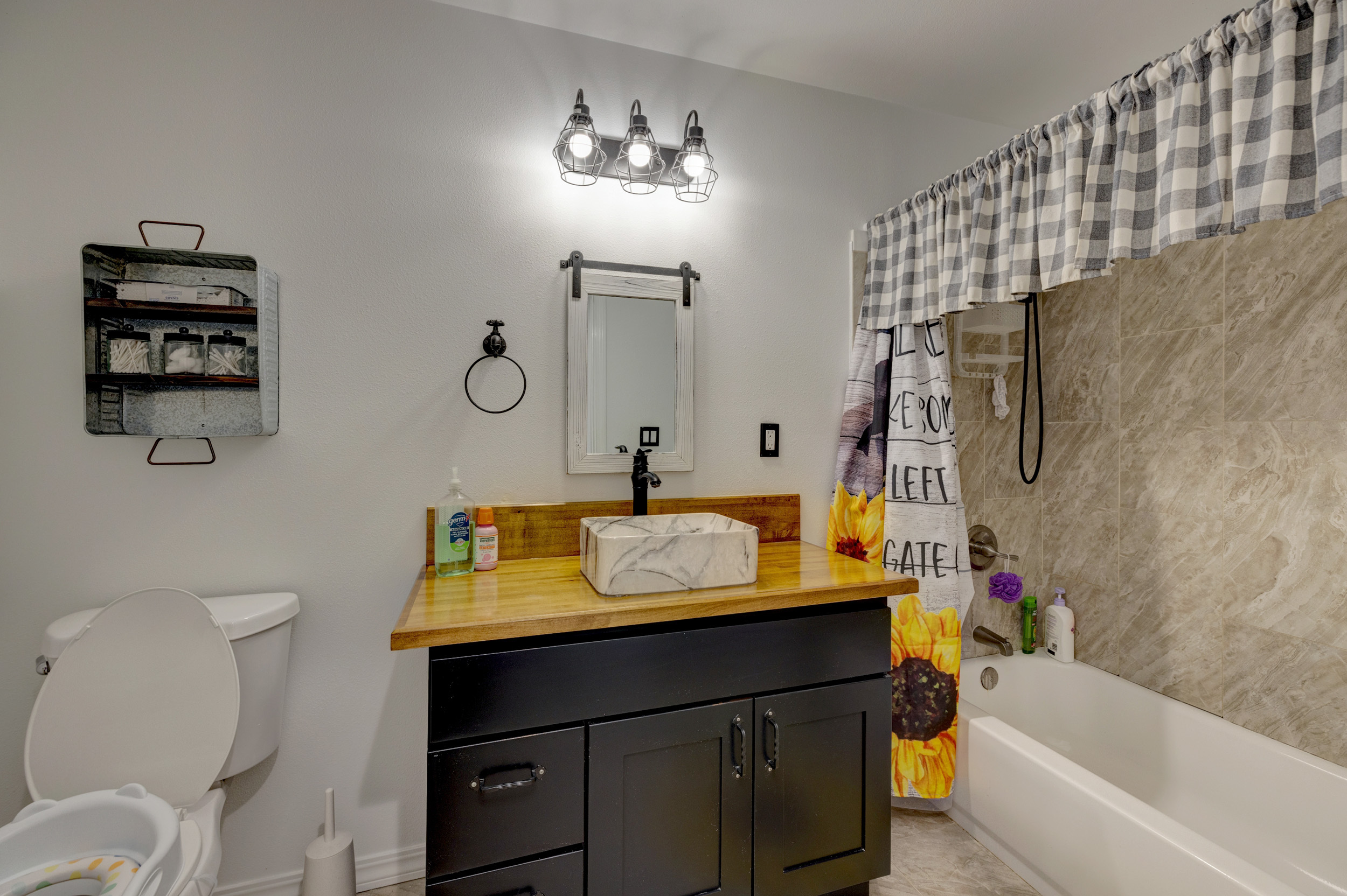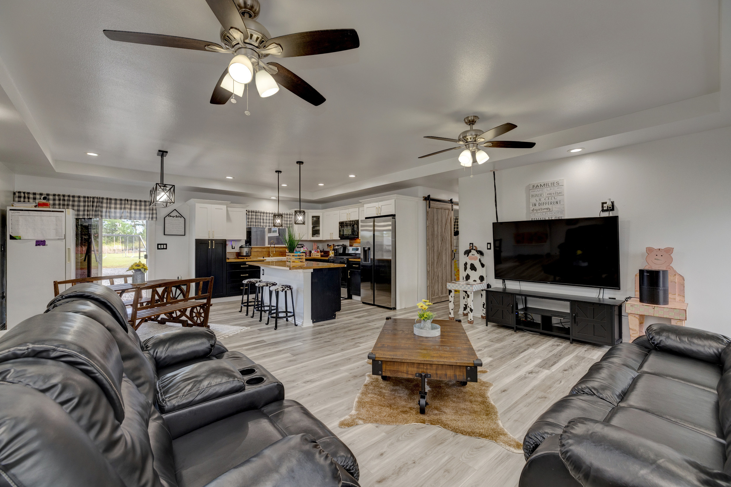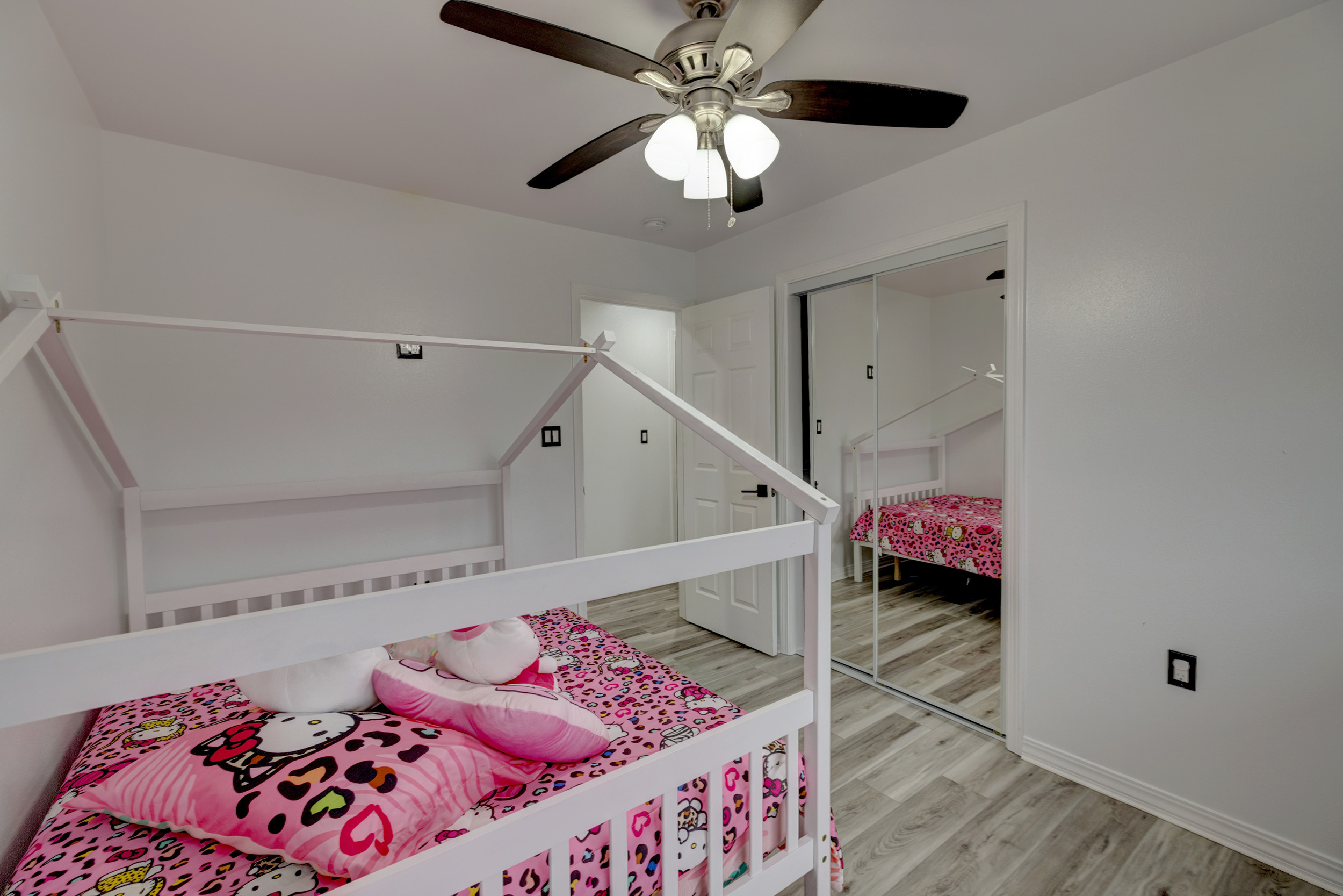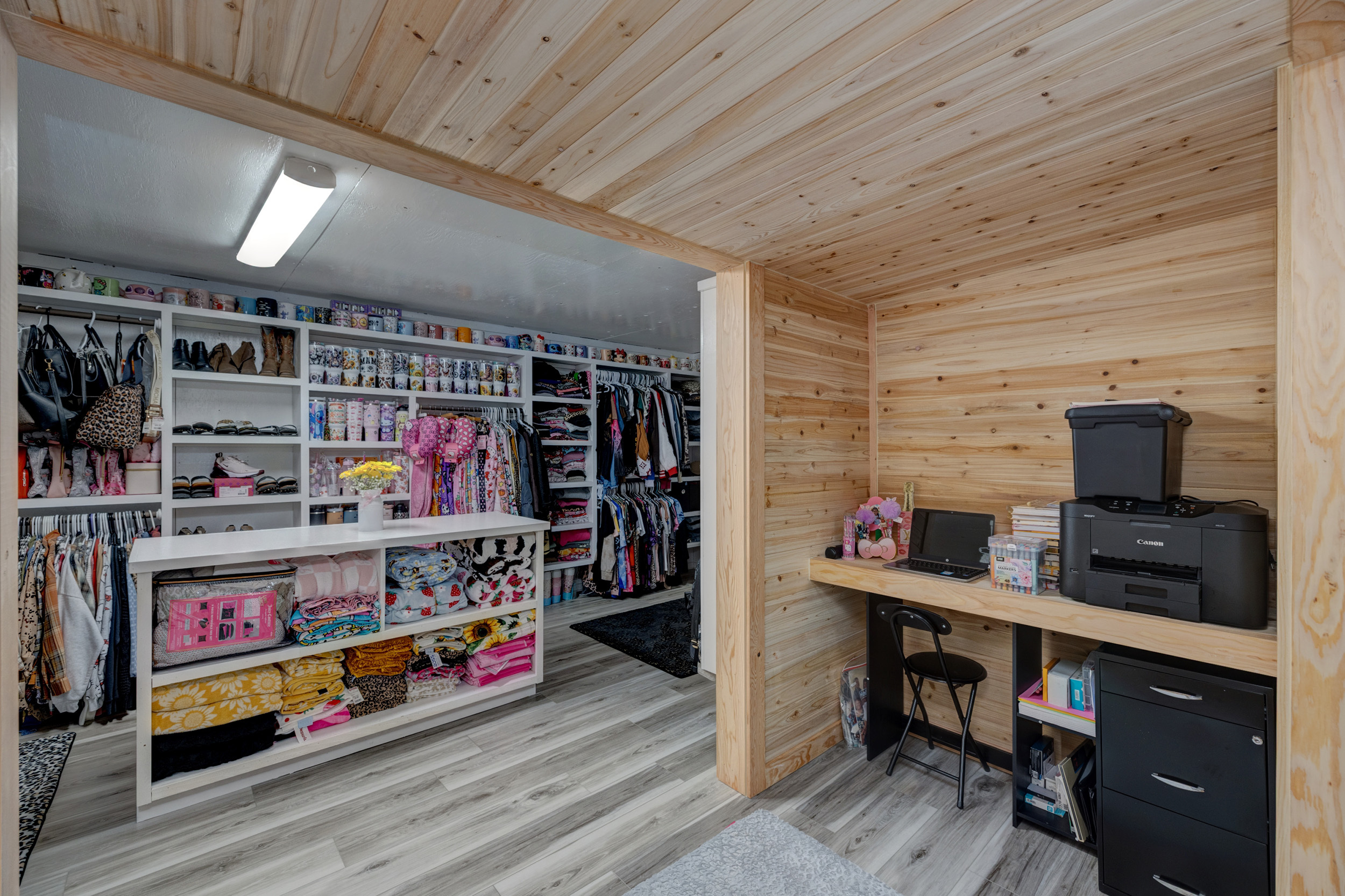 This fully fenced property offers privacy and functionality, featuring an attractive rock wall frontage and two automatic entry gates. Parking is plentiful with a two-car carport at the front and a double garage/workshop at the rear, complete with both front and rear garage doors. Attached to the garage is a private guest studio with its own bathroom. The origional garage has been thoughtfully converted into additional living space, currently used as a daycare. This area includes a separately fenced play yard, making it ideal for childcare, home business use, or flexible living needs. Adjacent is a dedicated laundry room with a private bathroom featuring a spacious walk-in shower. The home is equipped with central air conditioning, 20 solar panels, two Tesla batteries, and a UV water filtration system for efficiency and peace of mind. Inside, new laminate flooring runs throughout. The kitchen is a standout with maple hardwood countertops, a farmhouse sink, stainless steel appliances, a two-tone cabinet design with crown molding, a center island, and an elegant tray ceiling. Down the hallway are two bedrooms, a full bathroom, and the primary suite. The primary retreat includes its own bathroom with a walk-in shower, separate AC, an office nook, a his-and-hers walk-in closet, and an additional expansive 250-square-foot custom walk-in closet with private access directly from the garage. The backyard is designed for easy maintenance, offering a simple-to-mow lawn, a 144-square-foot children’s playhouse, and a covered shed ideal for tools and lawn equipment.
