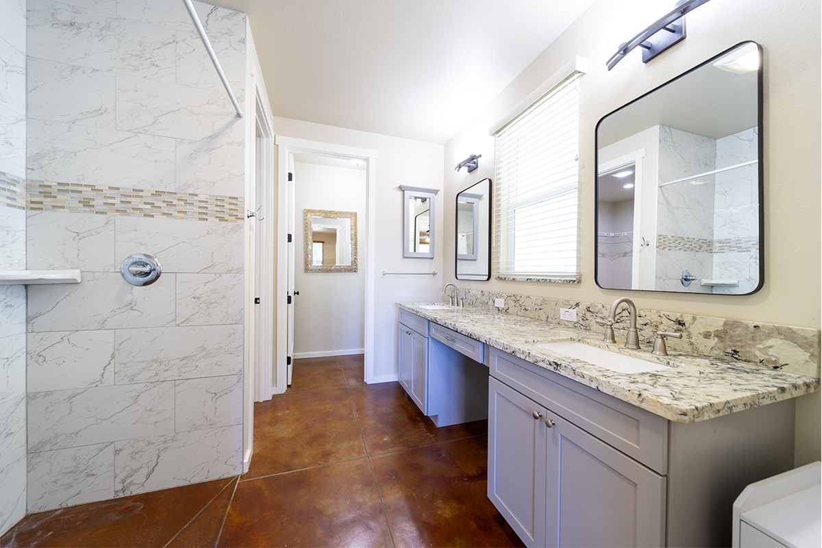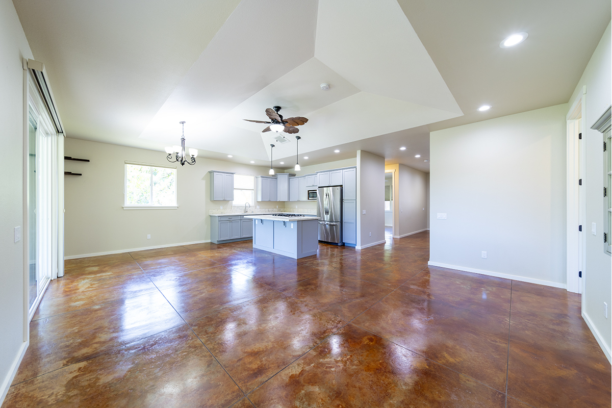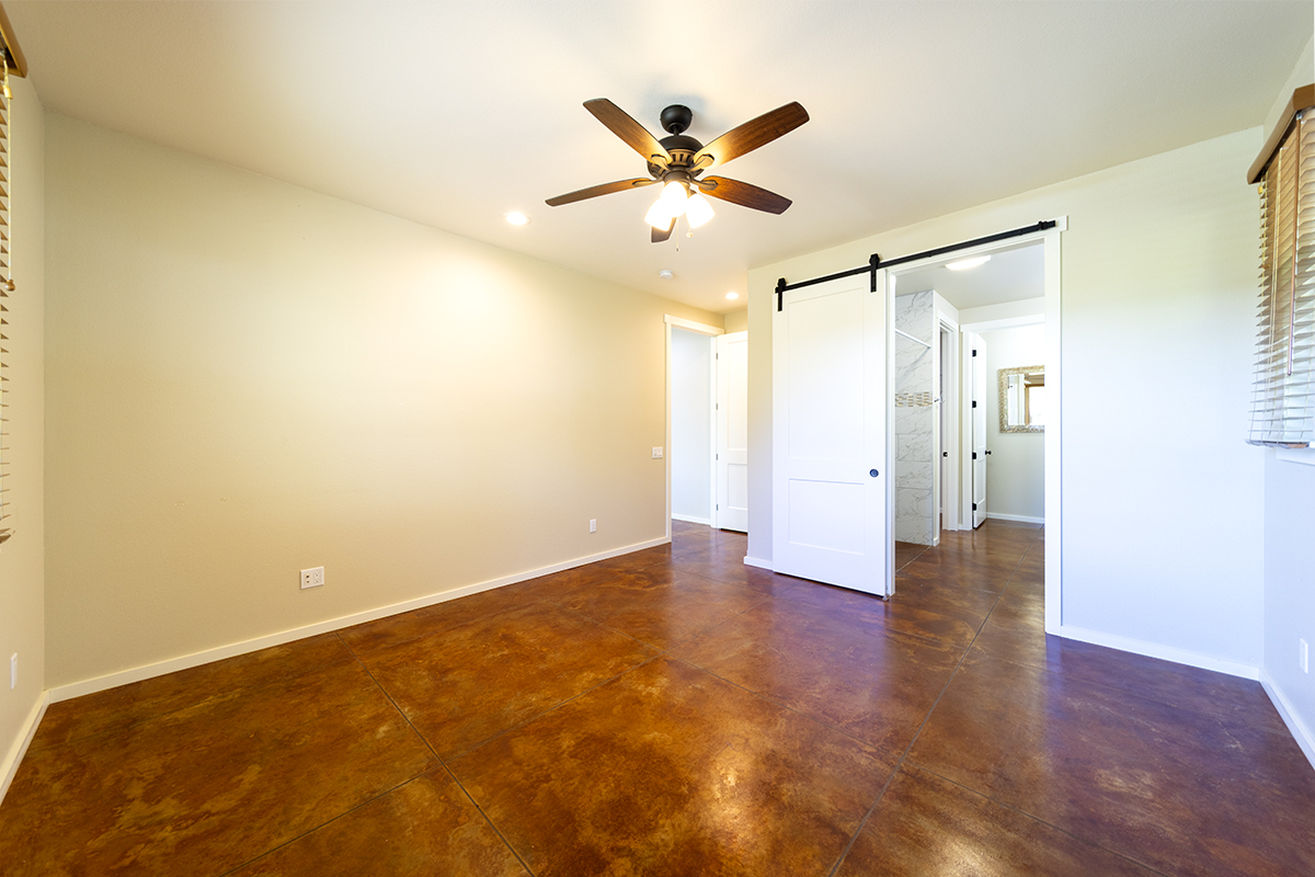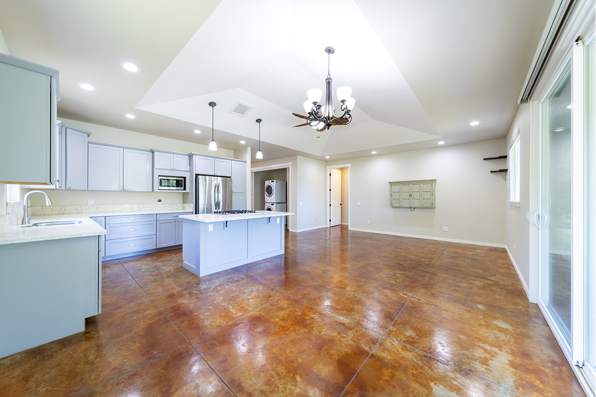 Inside, you’ll find stained and sealed concrete floors throughout, 9’ walls, 8’ doors, and wide hallways designed with comfort and accessibility in mind. The main bedroom suite includes a large walk-in closet and a spa-inspired bath with a curbless shower. The kitchen is well equipped with soft-close wood cabinetry, quartz countertops, and an LP gas range. Bathrooms feature granite counters, and the home comes complete with a washer, dryer, and an on-demand tankless water heater.