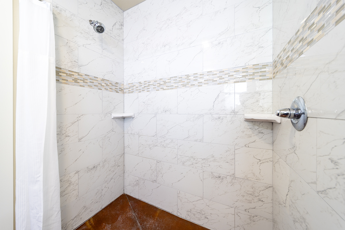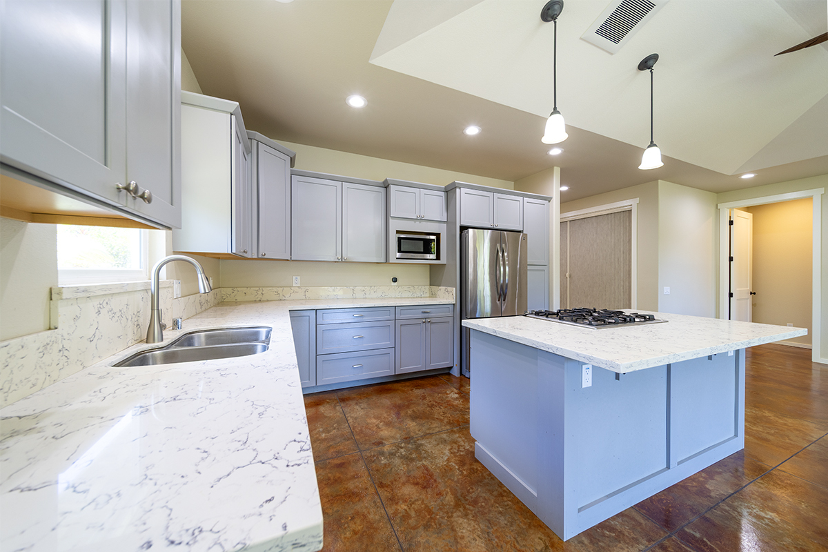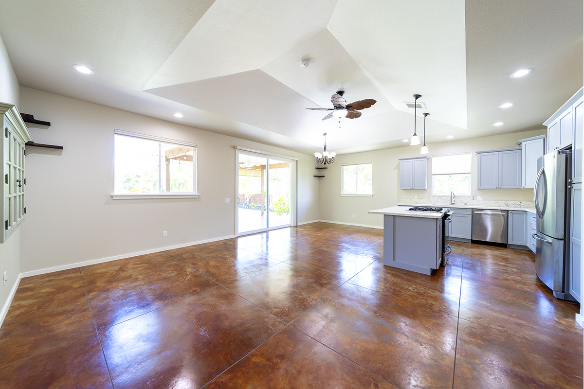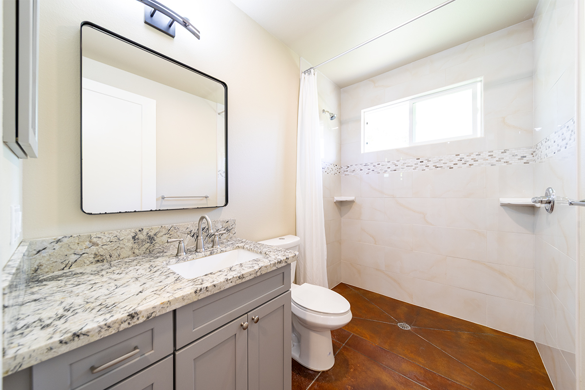 Inside, you’ll find stained and sealed concrete floors throughout, 9’ walls, 8’ doors, and wide hallways designed with comfort and accessibility in mind. The main bedroom suite includes a large walk-in closet and a spa-inspired bath with a curbless shower. The kitchen is well equipped with soft-close wood cabinetry, quartz countertops, and an LP gas range. Bathrooms feature granite counters, and the home comes complete with a washer, dryer, and an on-demand tankless water heater.