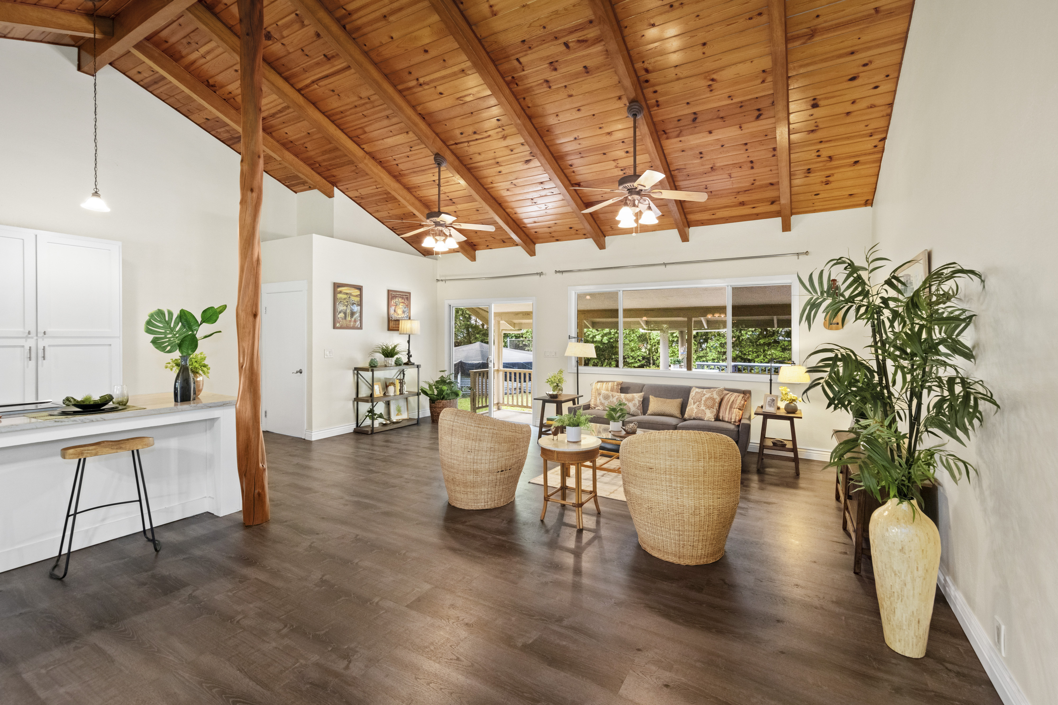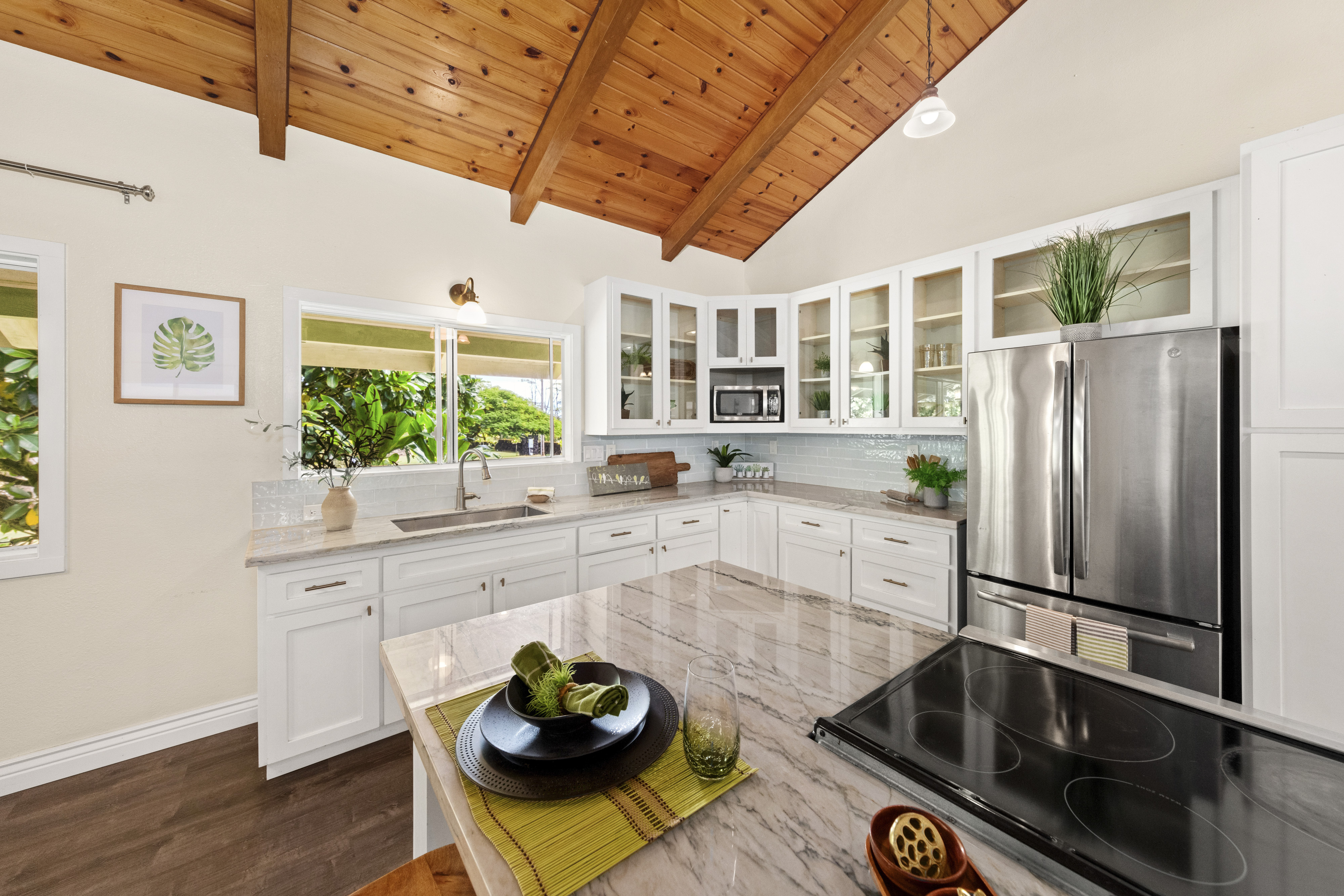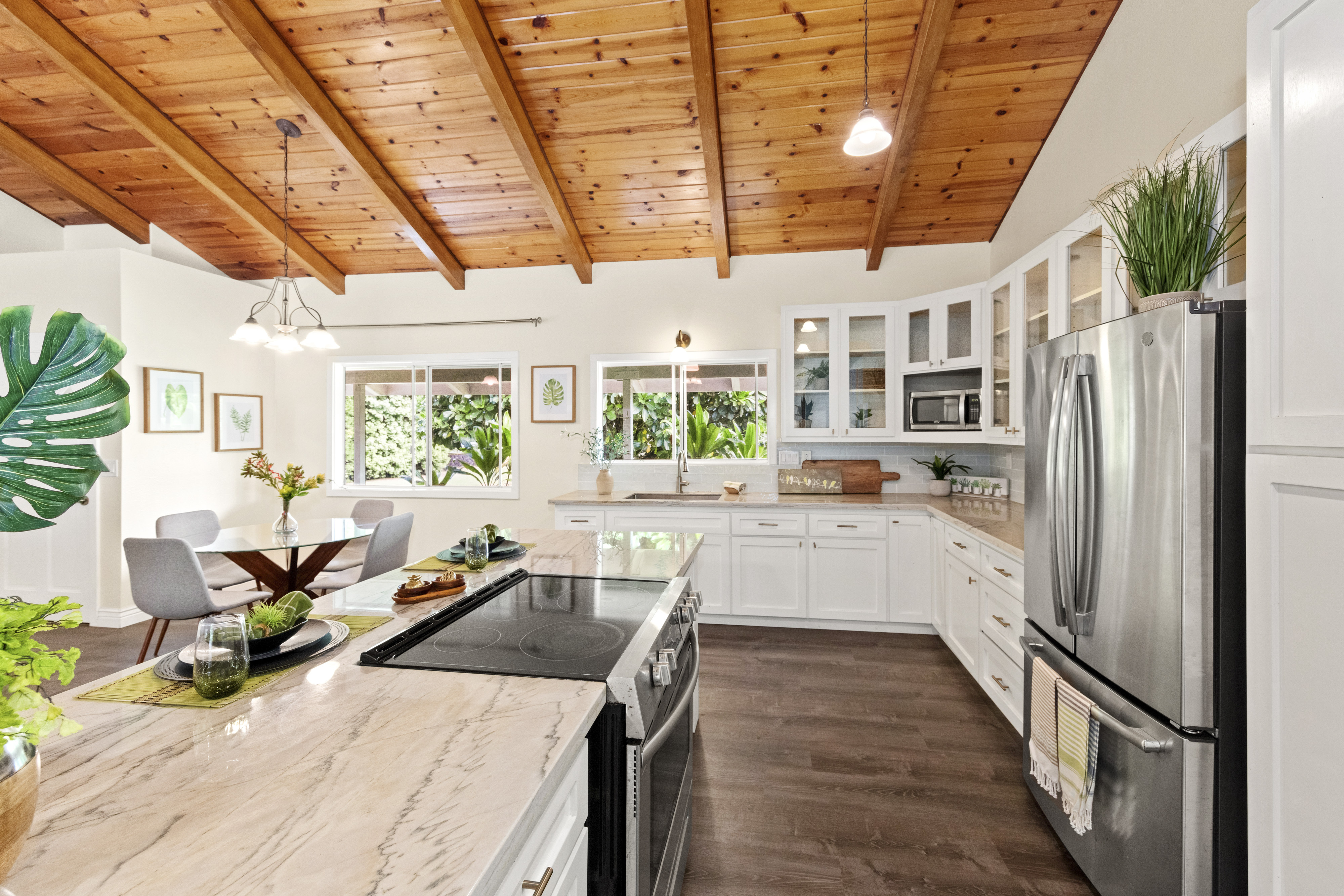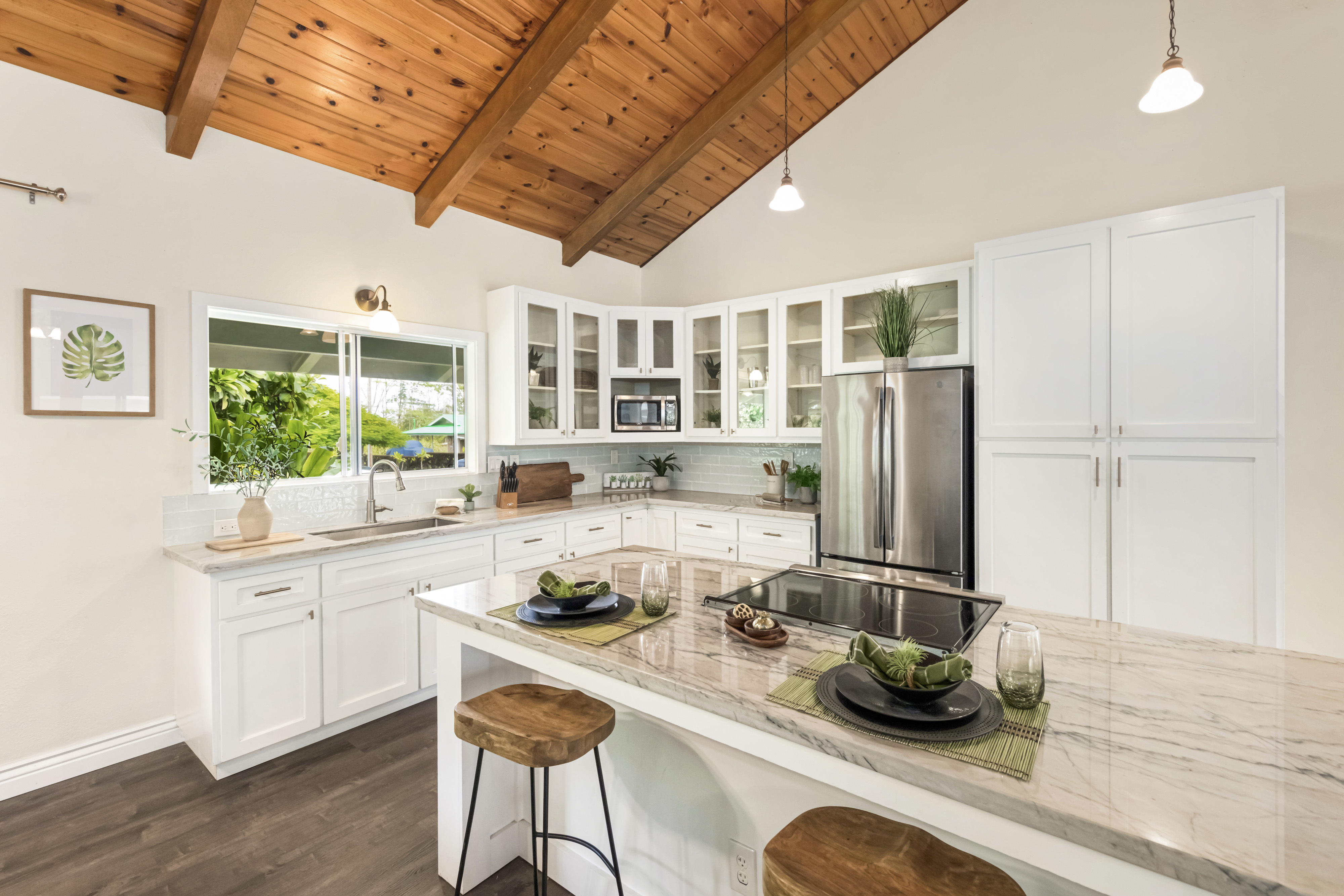 Step inside to an airy floor plan with vaulted pine ceilings that enhance the sense of spaciousness and charm. The remodeled kitchen is a chef’s delight, featuring a new center island topped with quartzite, upgraded countertops, and refurbished, freshly painted African mahogany cabinets with glass faces. The master suite is a tranquil retreat, with sliding glass doors to a private covered lanai and a spa-inspired bathroom with sleek tiled walls and glass block accents.