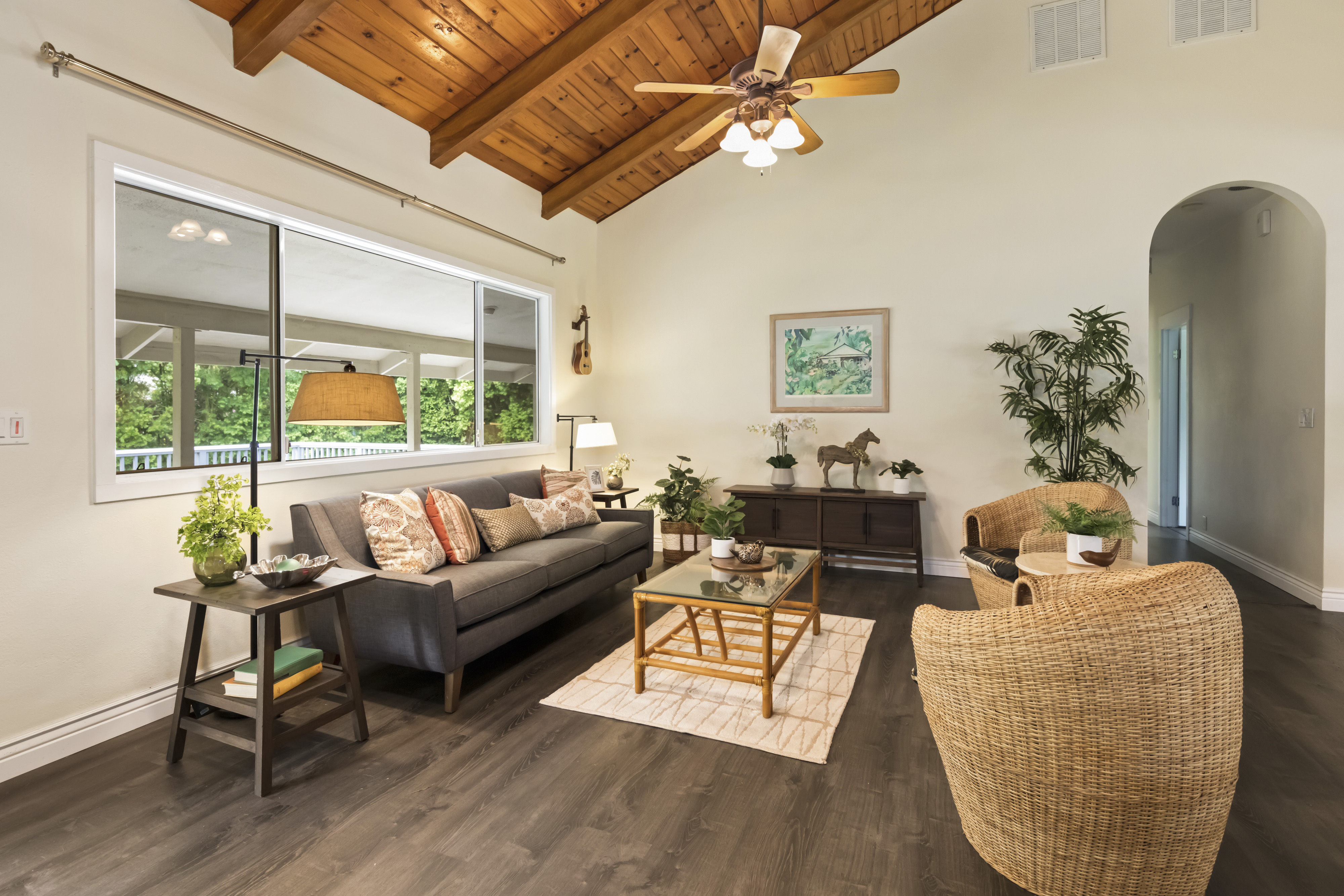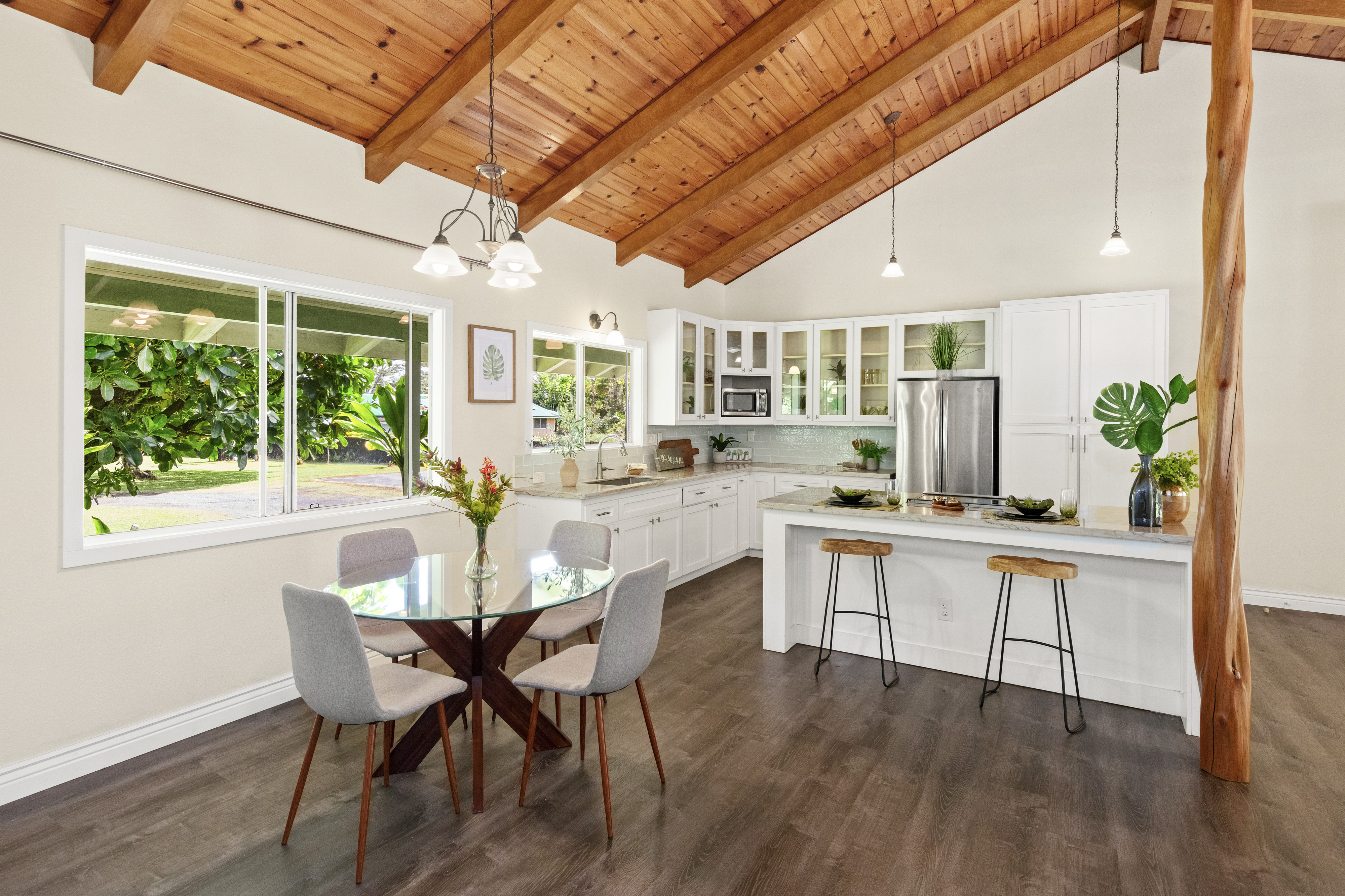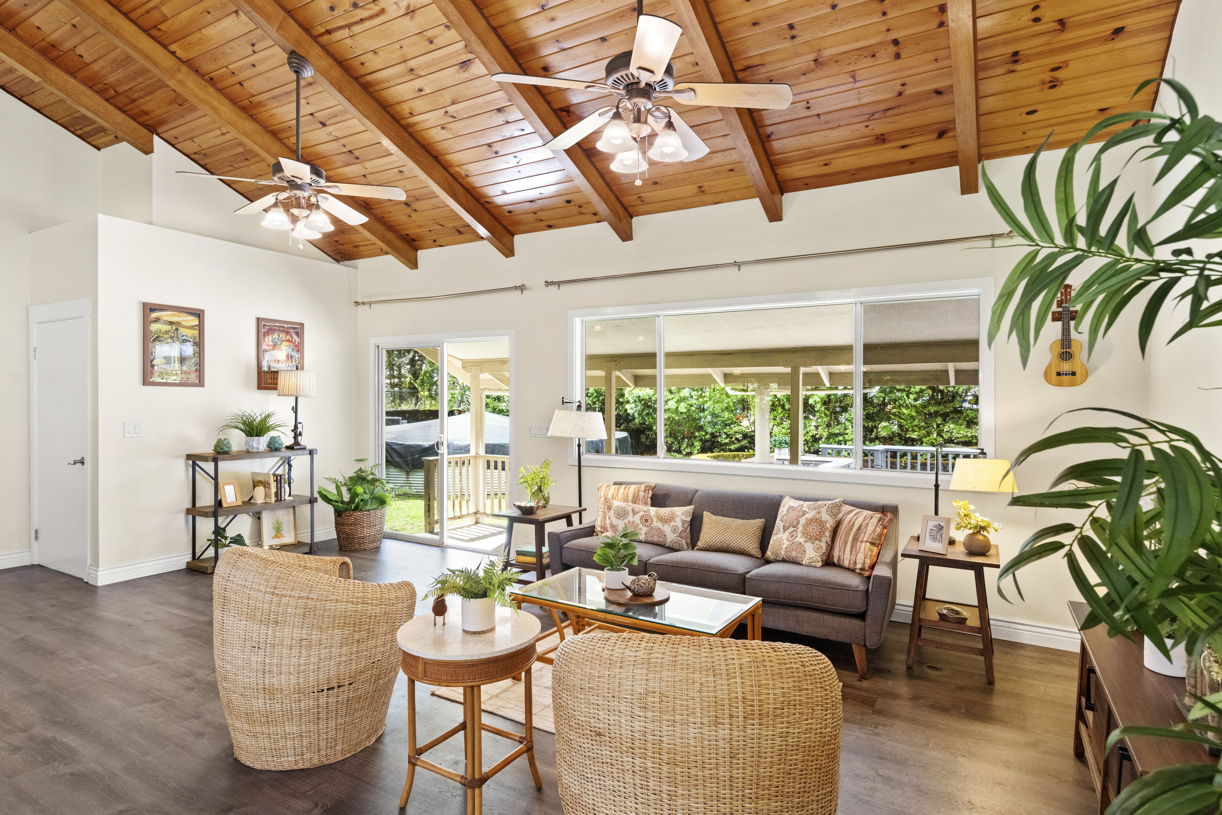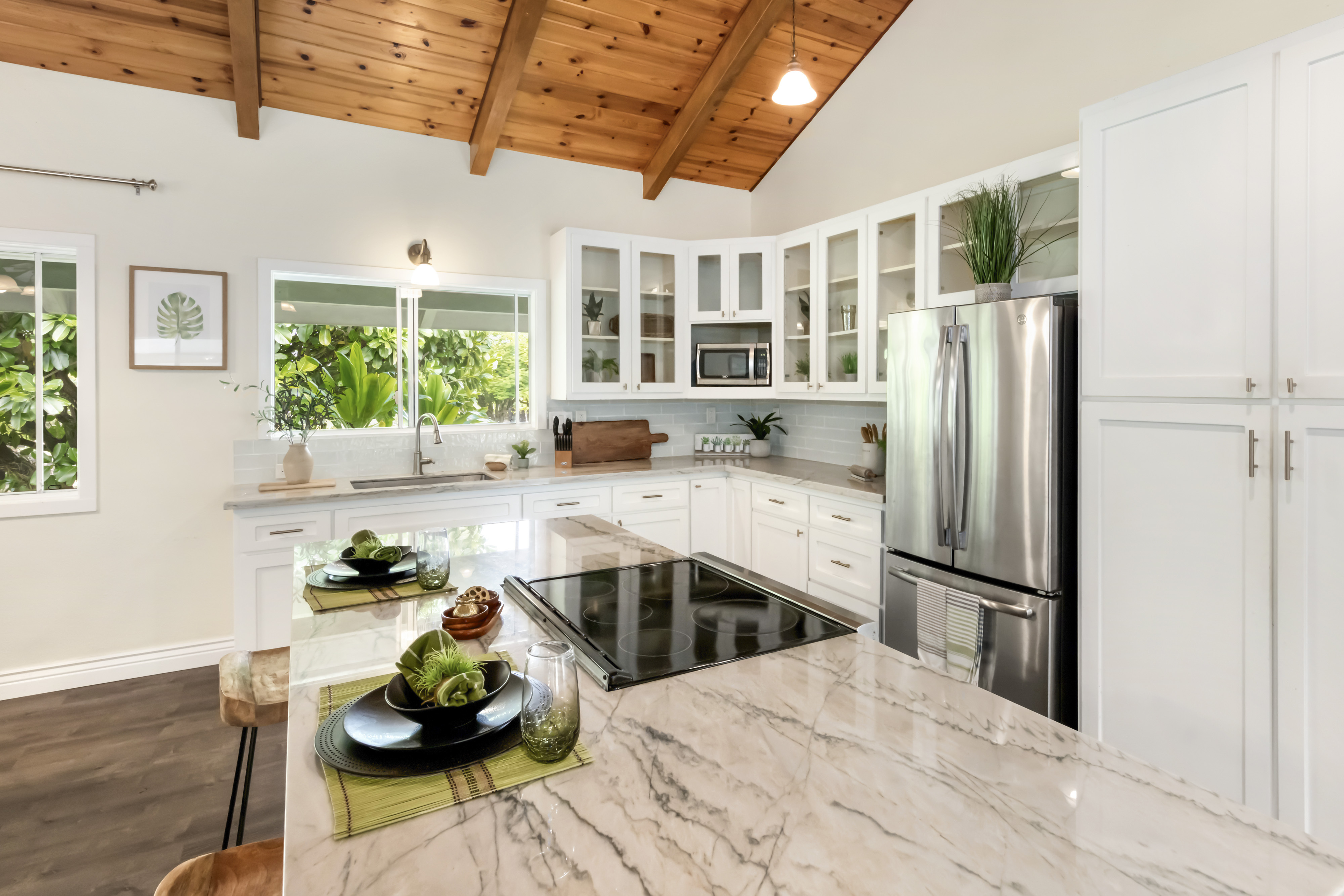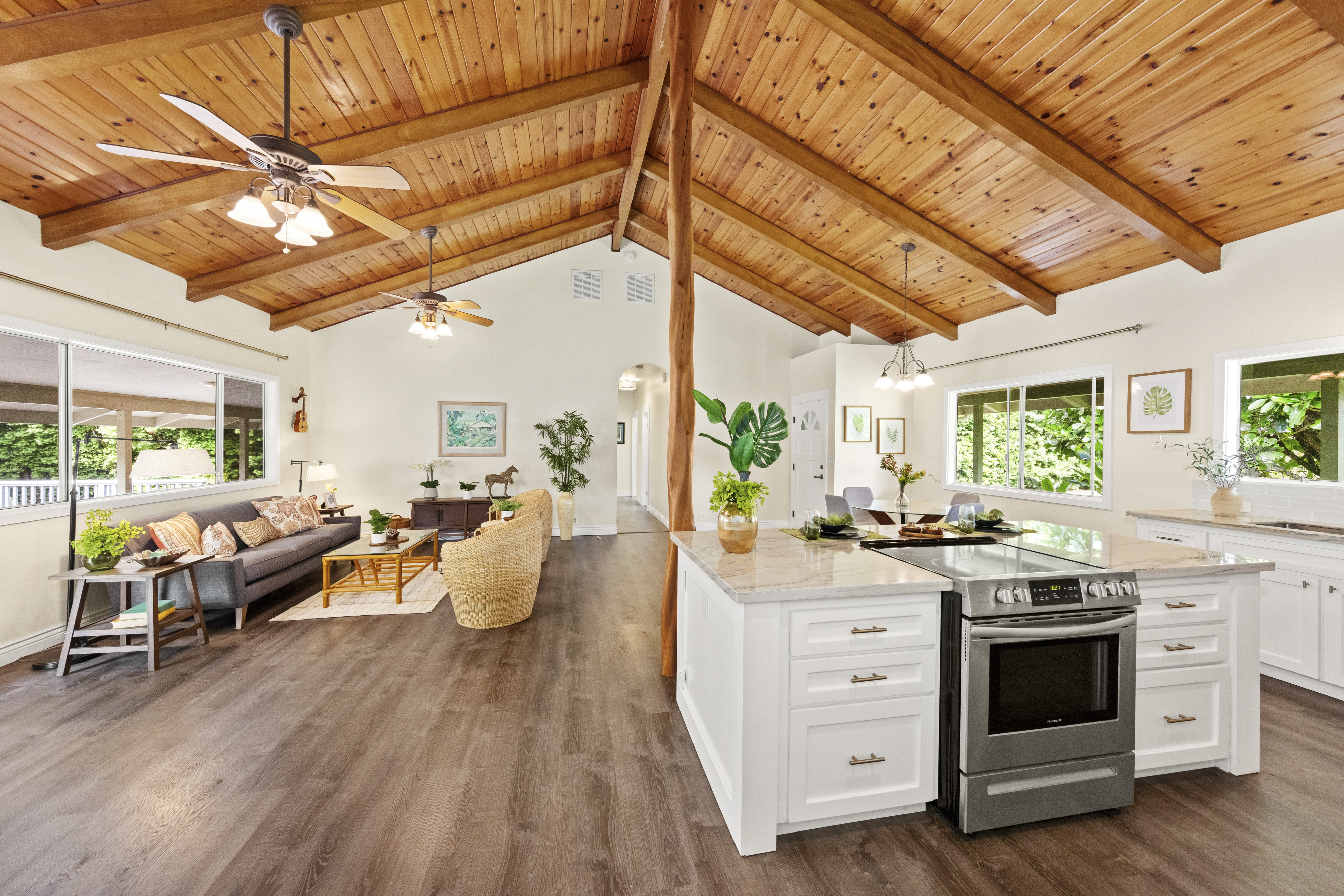 Step inside to an airy floor plan with vaulted pine ceilings that enhance the sense of spaciousness and charm. The remodeled kitchen is a chef’s delight, featuring a new center island topped with quartzite, upgraded countertops, and refurbished, freshly painted African mahogany cabinets with glass faces. The master suite is a tranquil retreat, with sliding glass doors to a private covered lanai and a spa-inspired bathroom with sleek tiled walls and glass block accents.