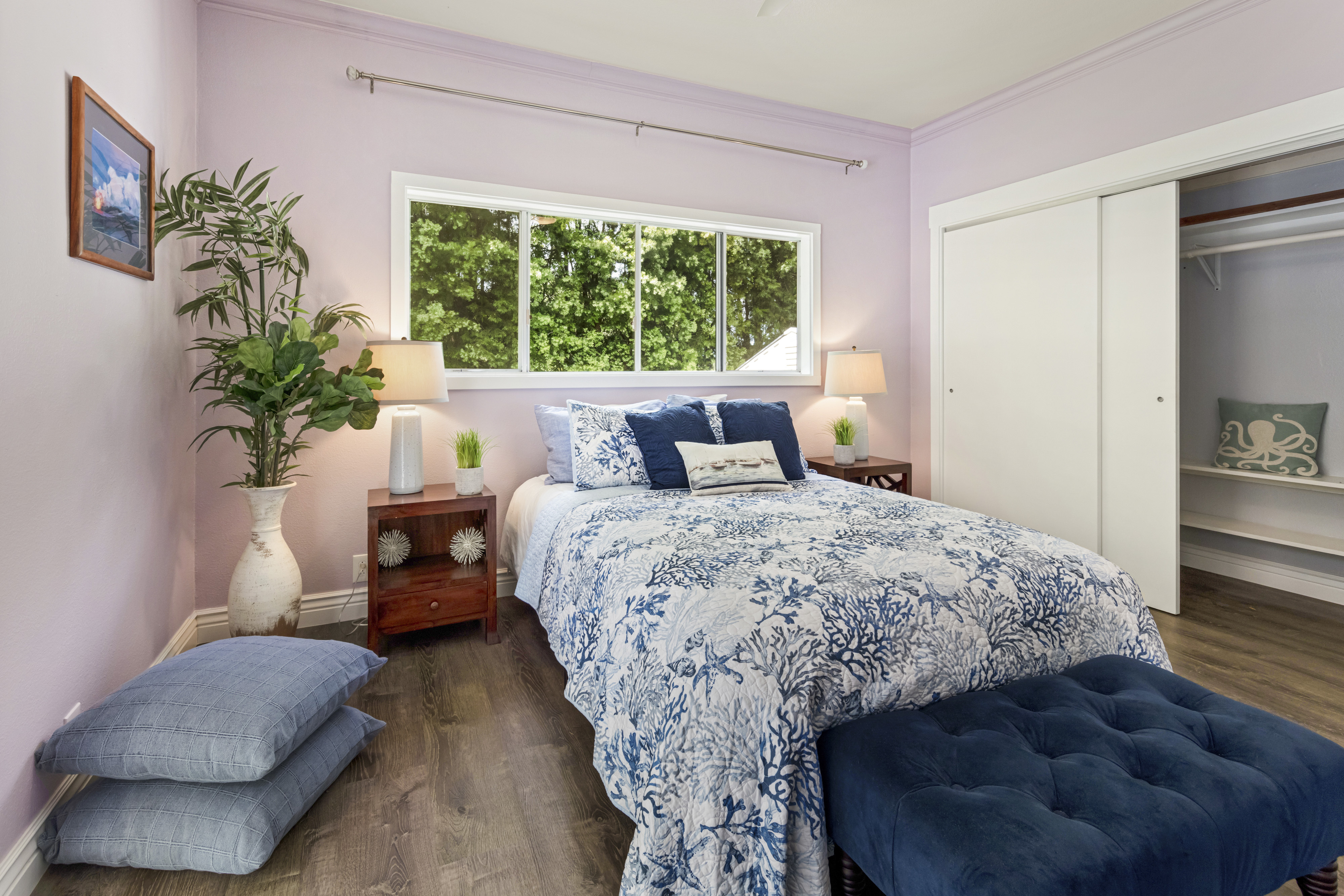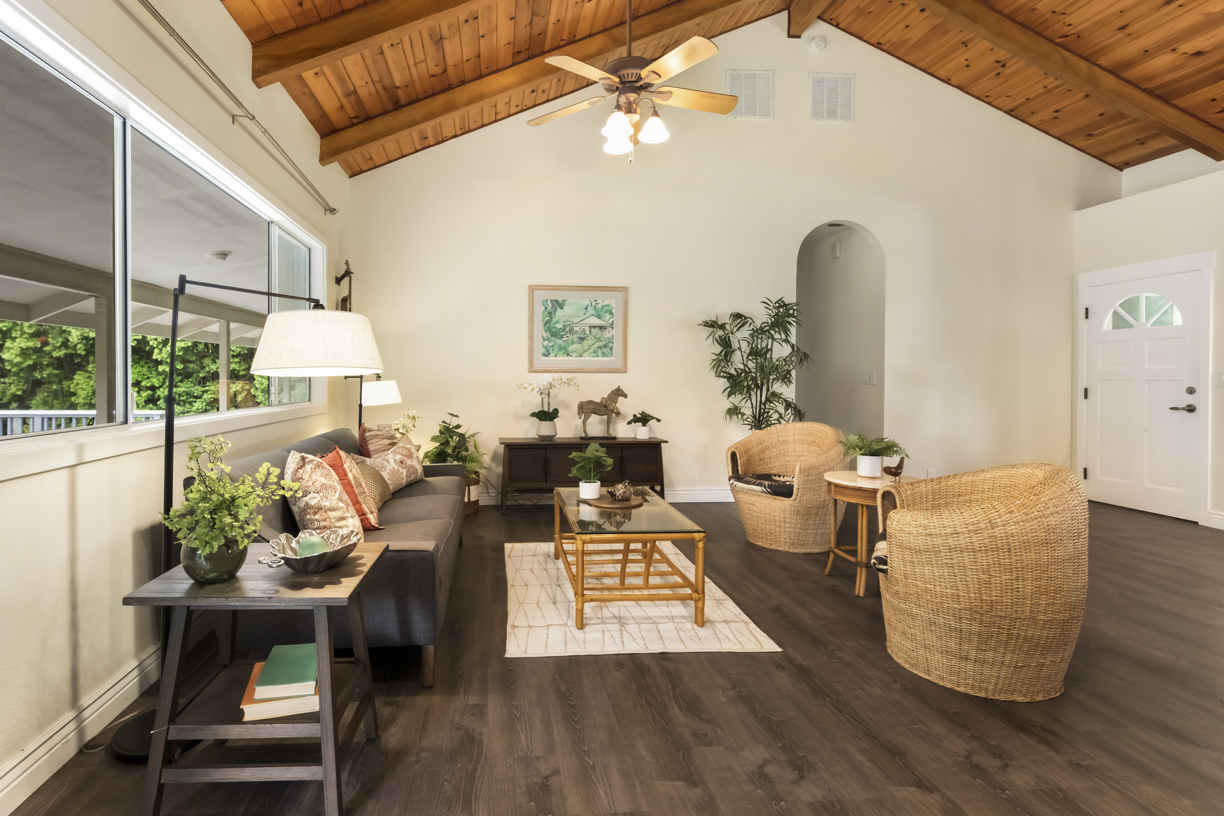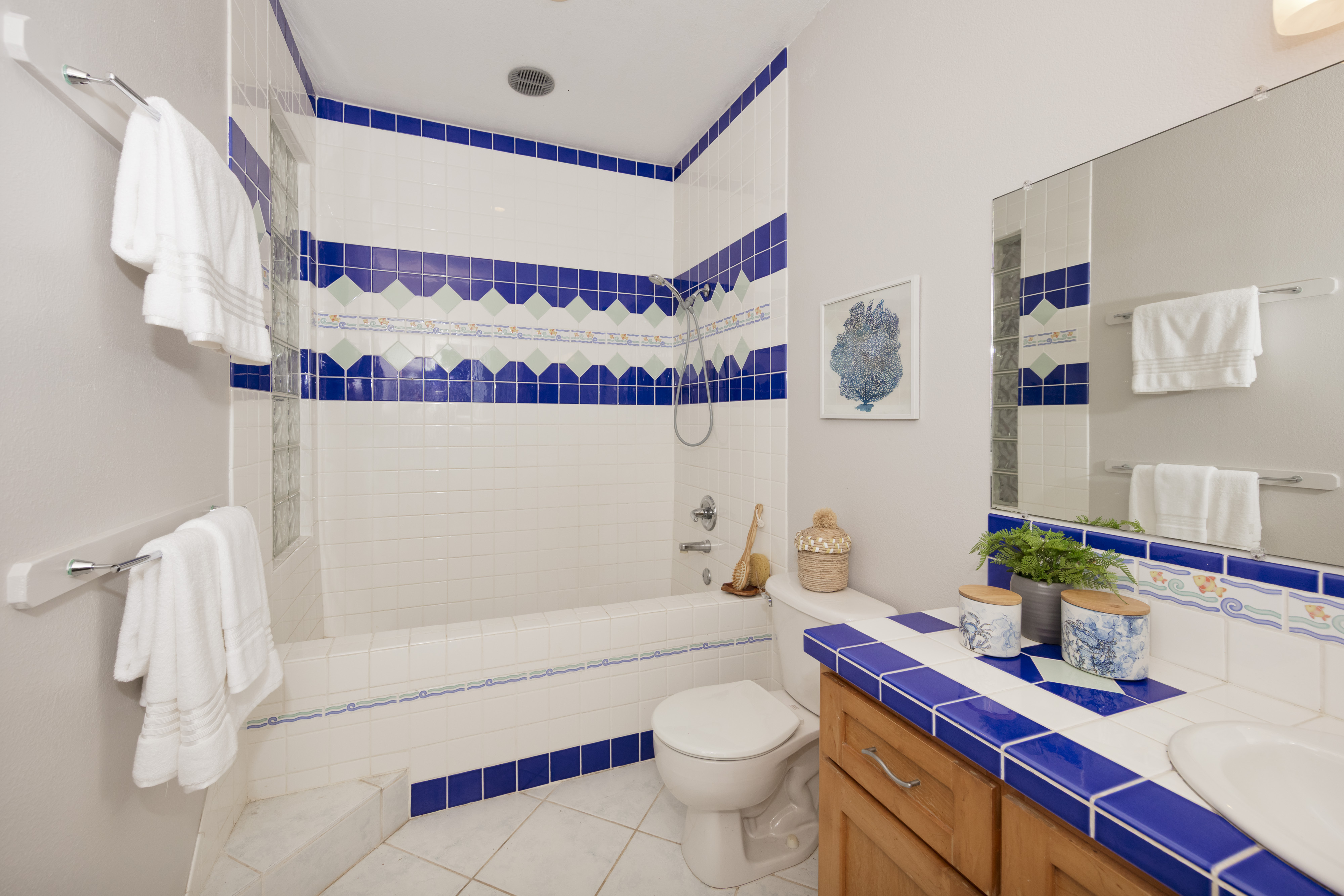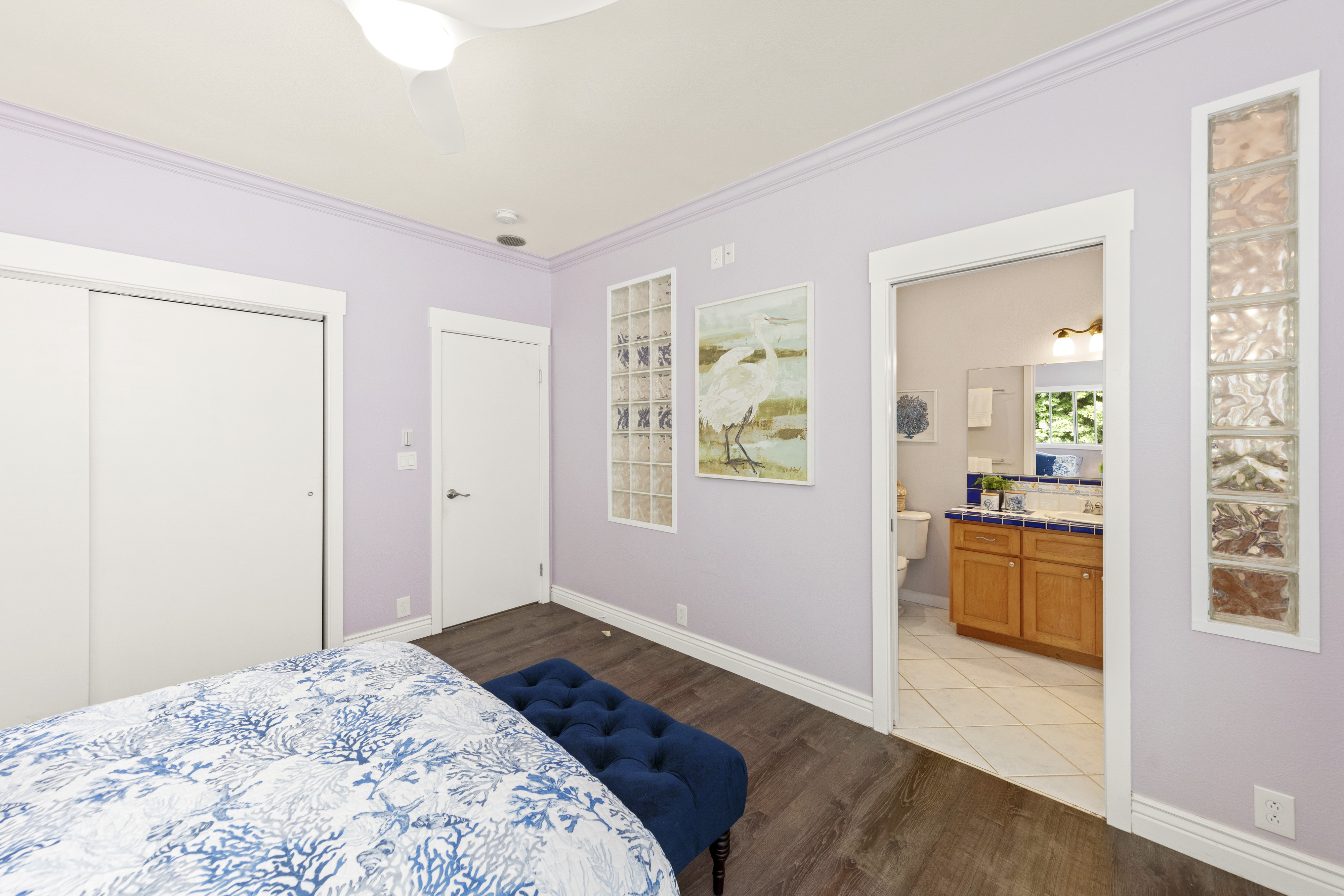 Step inside to an airy floor plan with vaulted pine ceilings that enhance the sense of spaciousness and charm. The remodeled kitchen is a chef’s delight, featuring a new center island topped with quartzite, upgraded countertops, and refurbished, freshly painted African mahogany cabinets with glass faces. The master suite is a tranquil retreat, with sliding glass doors to a private covered lanai and a spa-inspired bathroom with sleek tiled walls and glass block accents.